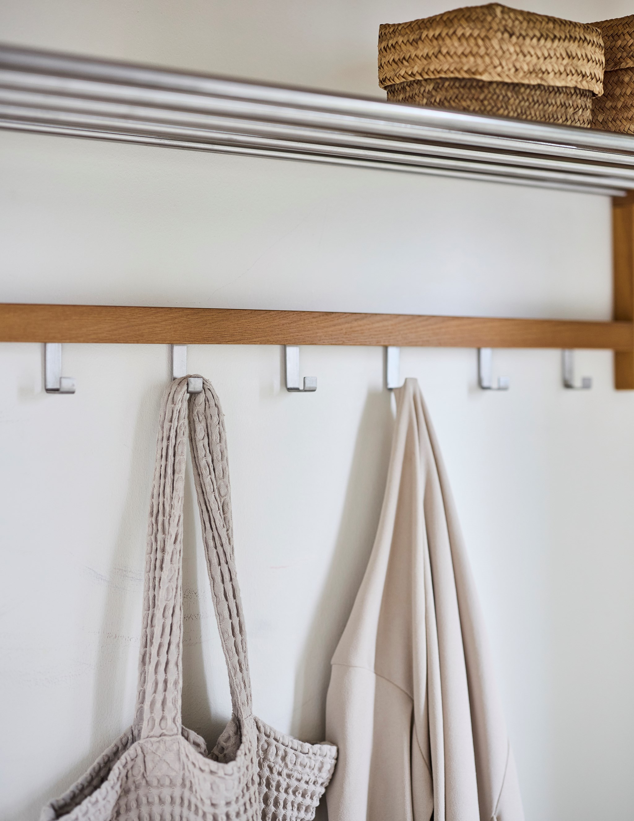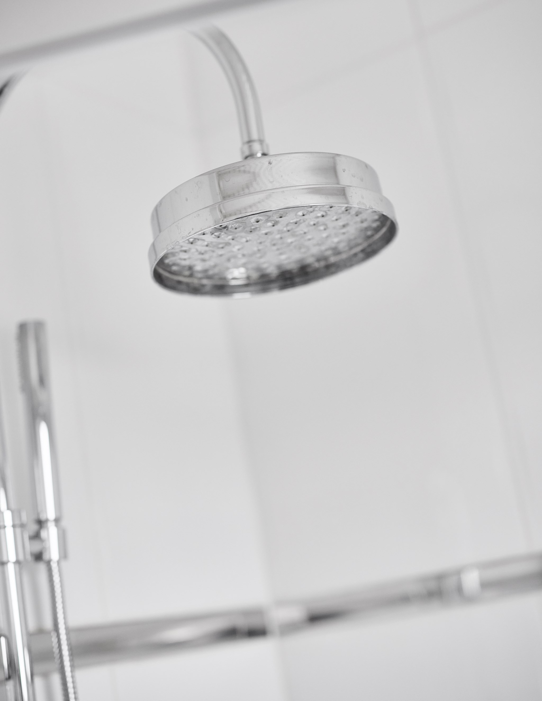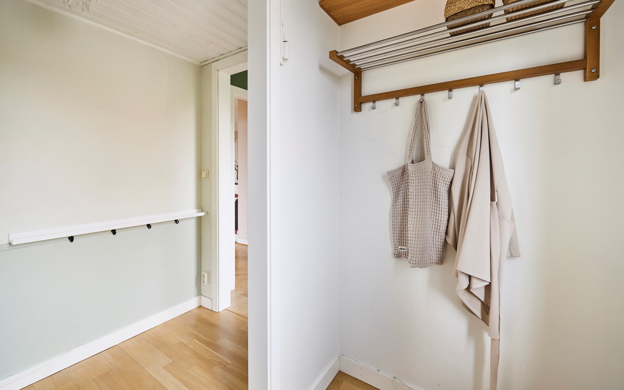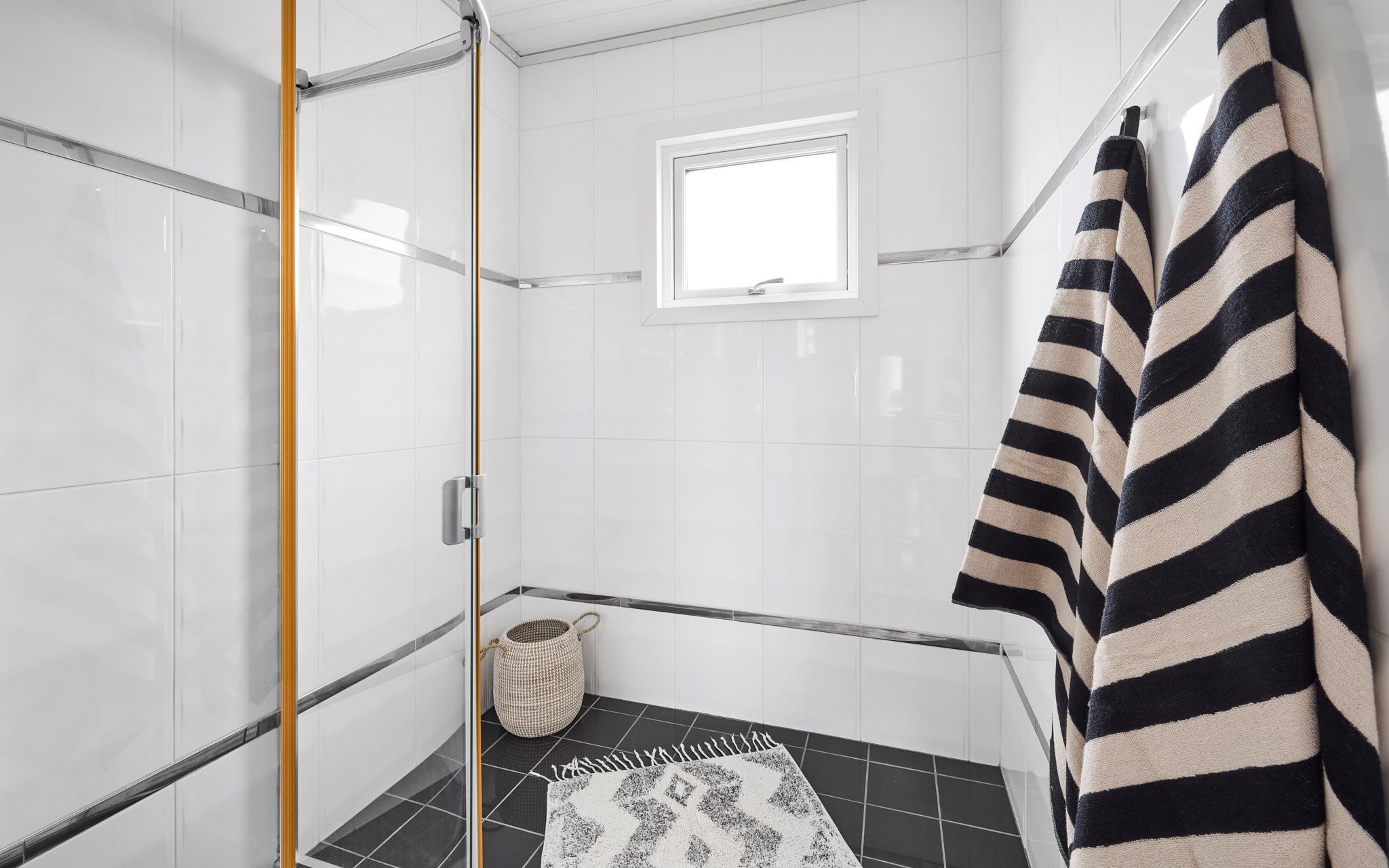 Praktiskt planerat med badrum och toalett i separata rum. Båda dess utrymmen fint och enhetligt renoverade med samma kakel och klinker – vitt och mörkgrått i tidlös kombo. Rummen ligger också vägg i vägg och har var sitt högt placerat fönster mot väster. Denna planlösning finns även i lägenheten i entréplanet, så det är en ursprunglig idé som byggmästaren eller arkitekten fullföljde snyggt.