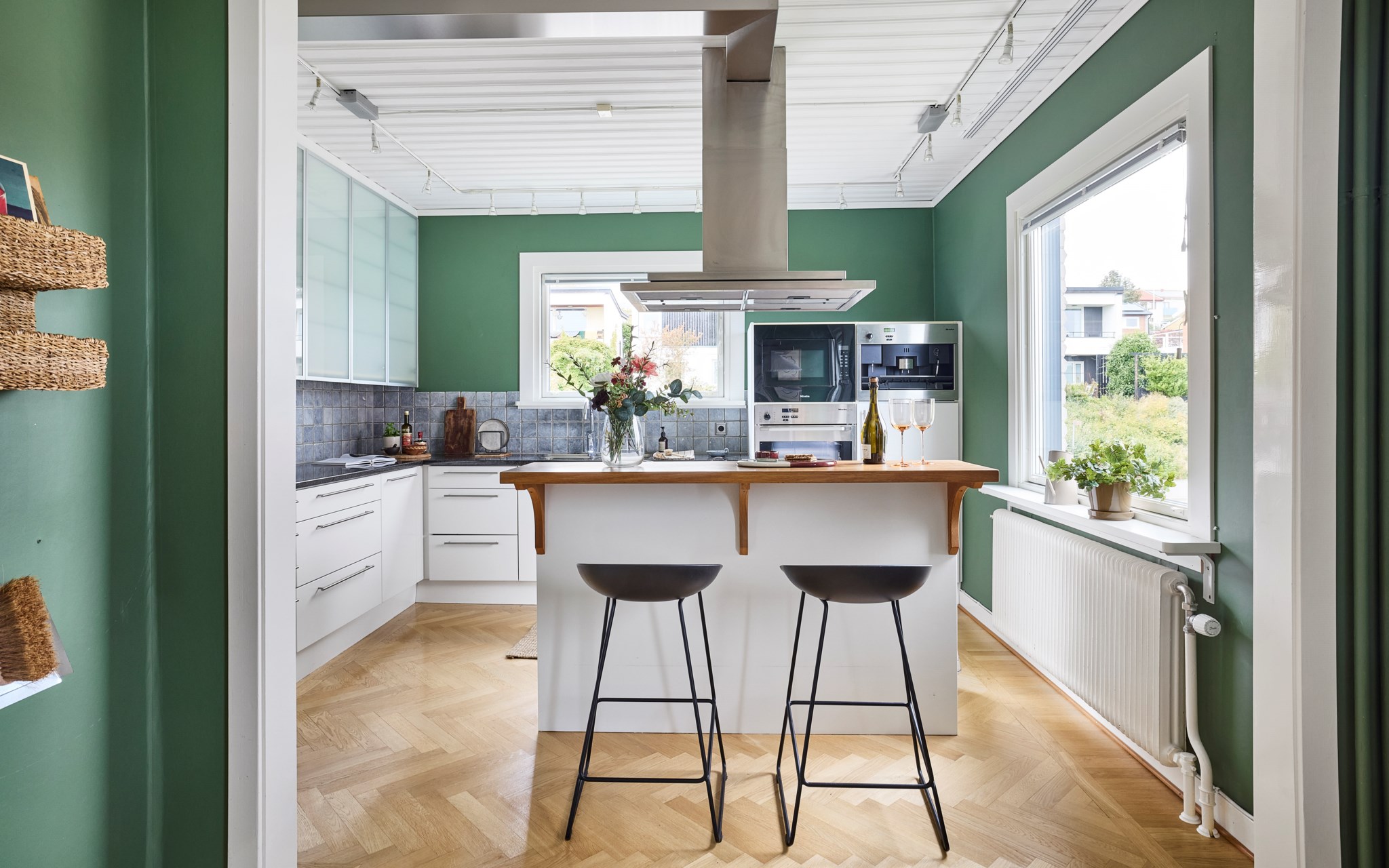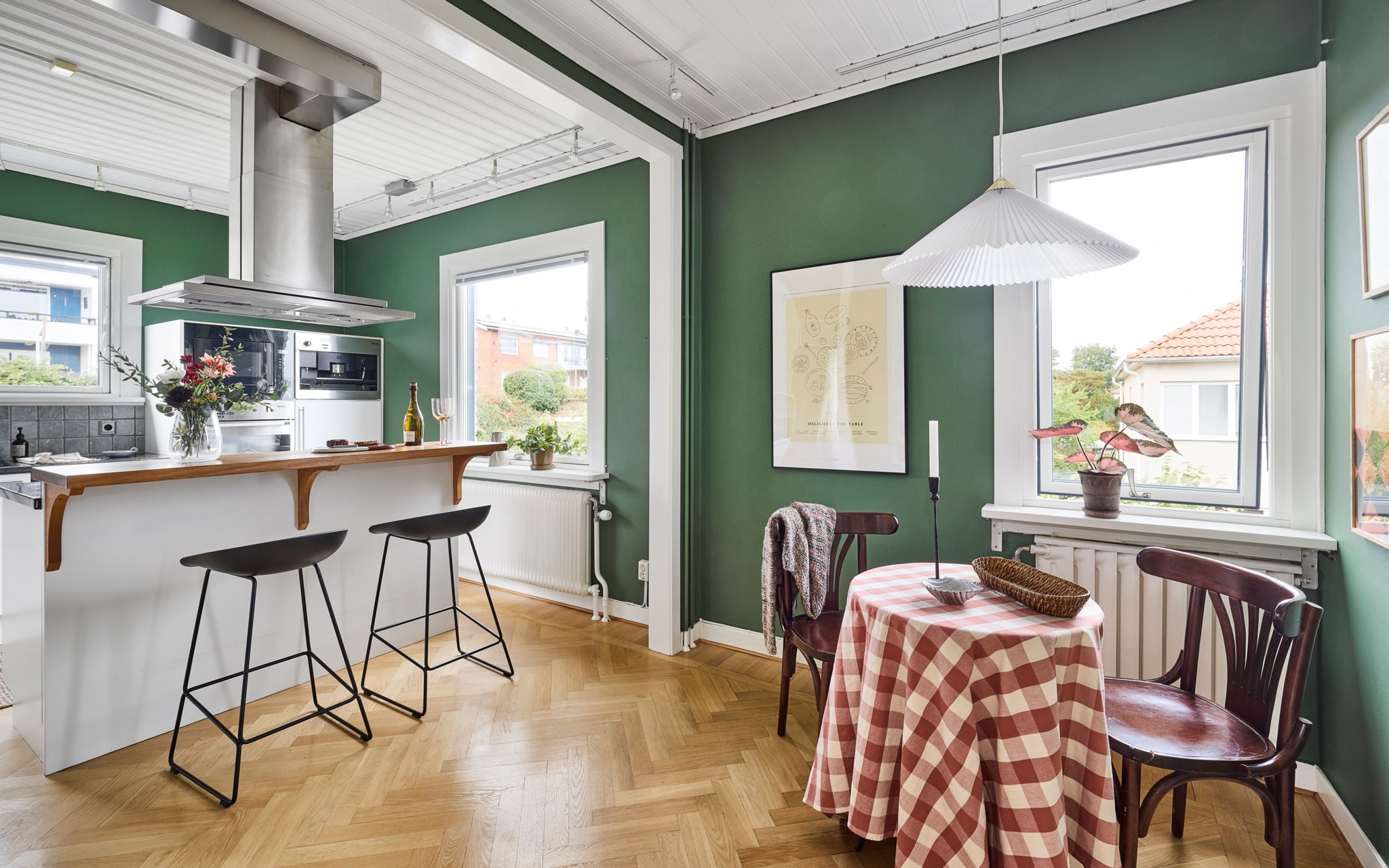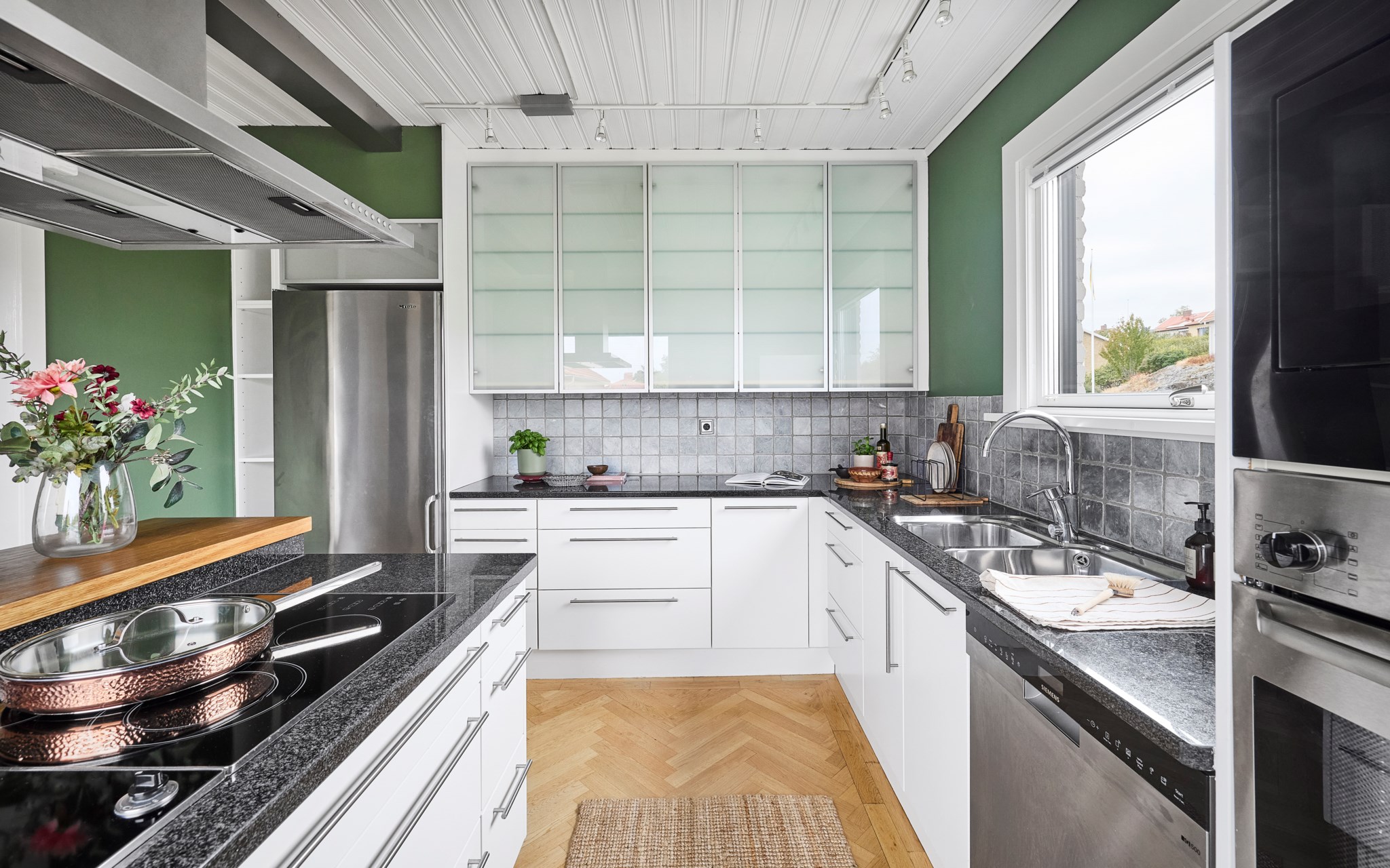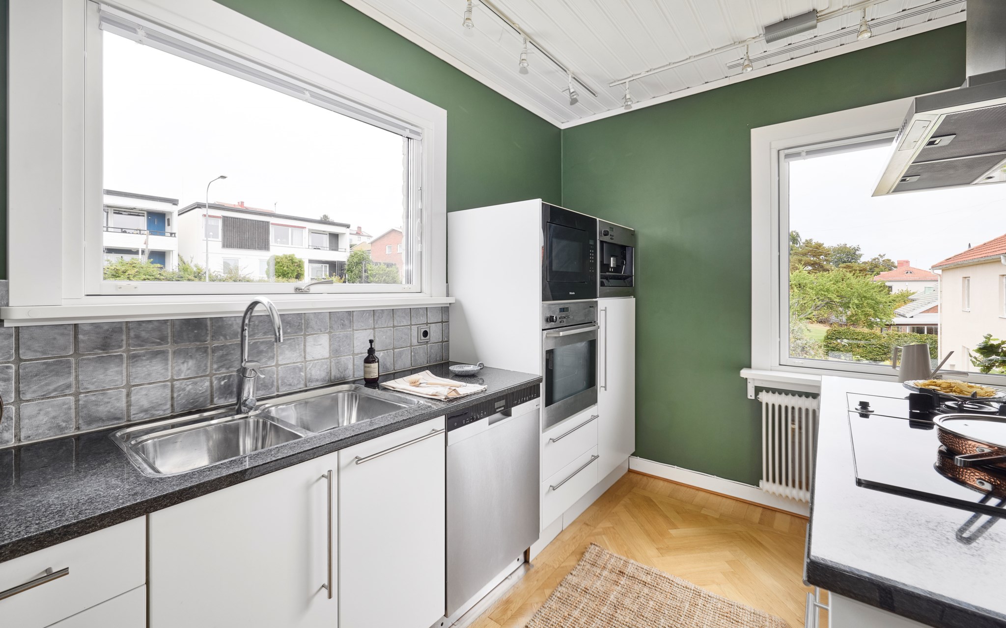 Renoverat med ambition, öppet och socialt, och även härifrån minst sagt skaplig utsikt, fast mer mot norr. Bänkskivor i grå granit runt om och på den sociala köksön mitt i rummet med spisen centrerad. Förutom induktionshällen även en gasplatta. Fiskbensparketten följer med in hit från hallen. Alla vitvaror från Miele, inklusive den inbyggda espressomaskinen. Plats för ett rätt stort matbord som du nog gärna sitter vid till vardags, men också lätt att tänka större och flytta ut i matsalen, eller på balkongen när vädret så tillåter.