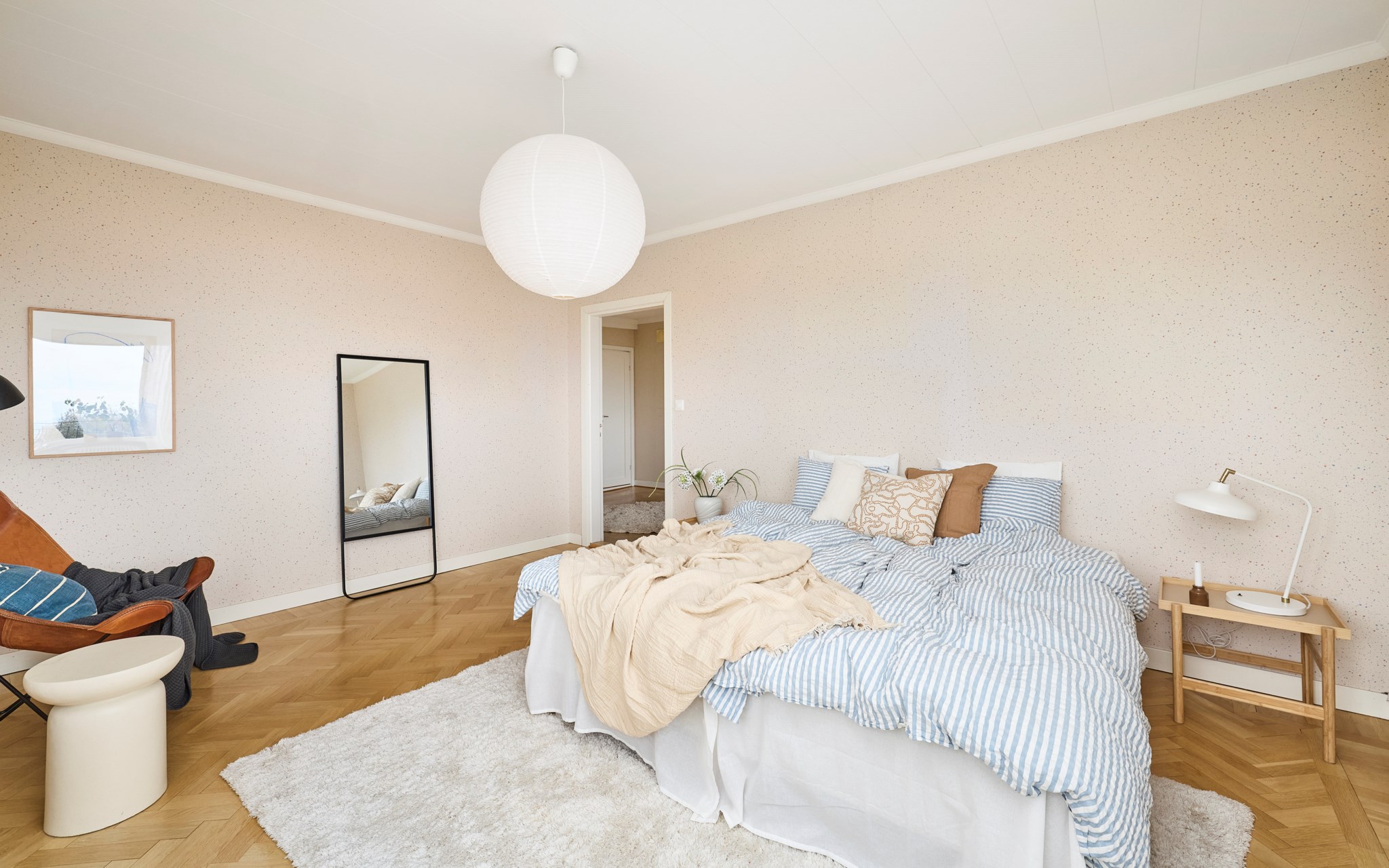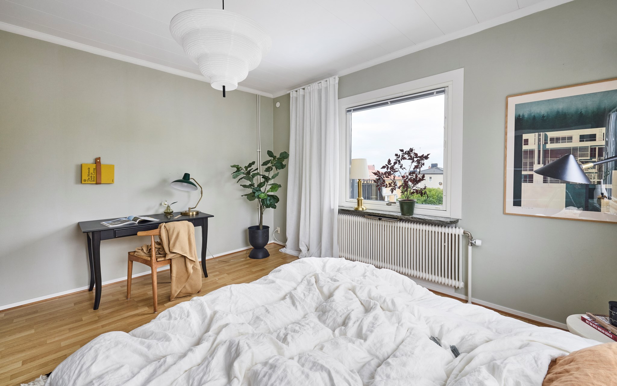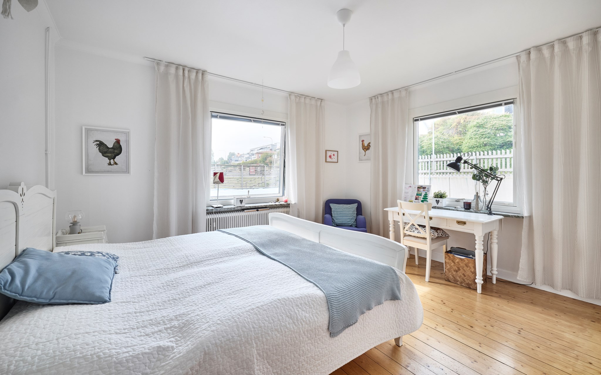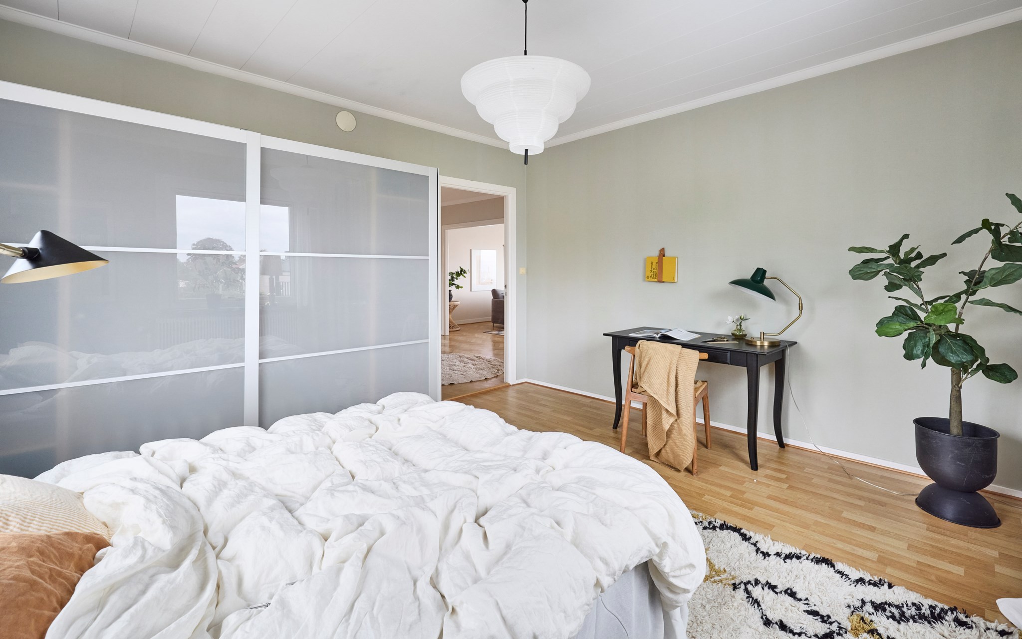 Ett stort sovrum som livet var planerat när huset byggdes. På golvet ligger laminat just nu, men frågan är vad som kan hittas inunder, kanske ett plankgolv? En stor skjutdörrsgarderob bör räcka rätt länge till förvaringen innan det blir fullt. Den står löst på golvet, men kommer att lämnas kvar av nuvarande ägare. Fönster både mot söder och väster. Med tanke på att vinden är inredd och renoverad så har du ytterligare sovrum tillgängliga en en trappa upp. Vill du göra matsalen till sängkammare vore det också möjligt.