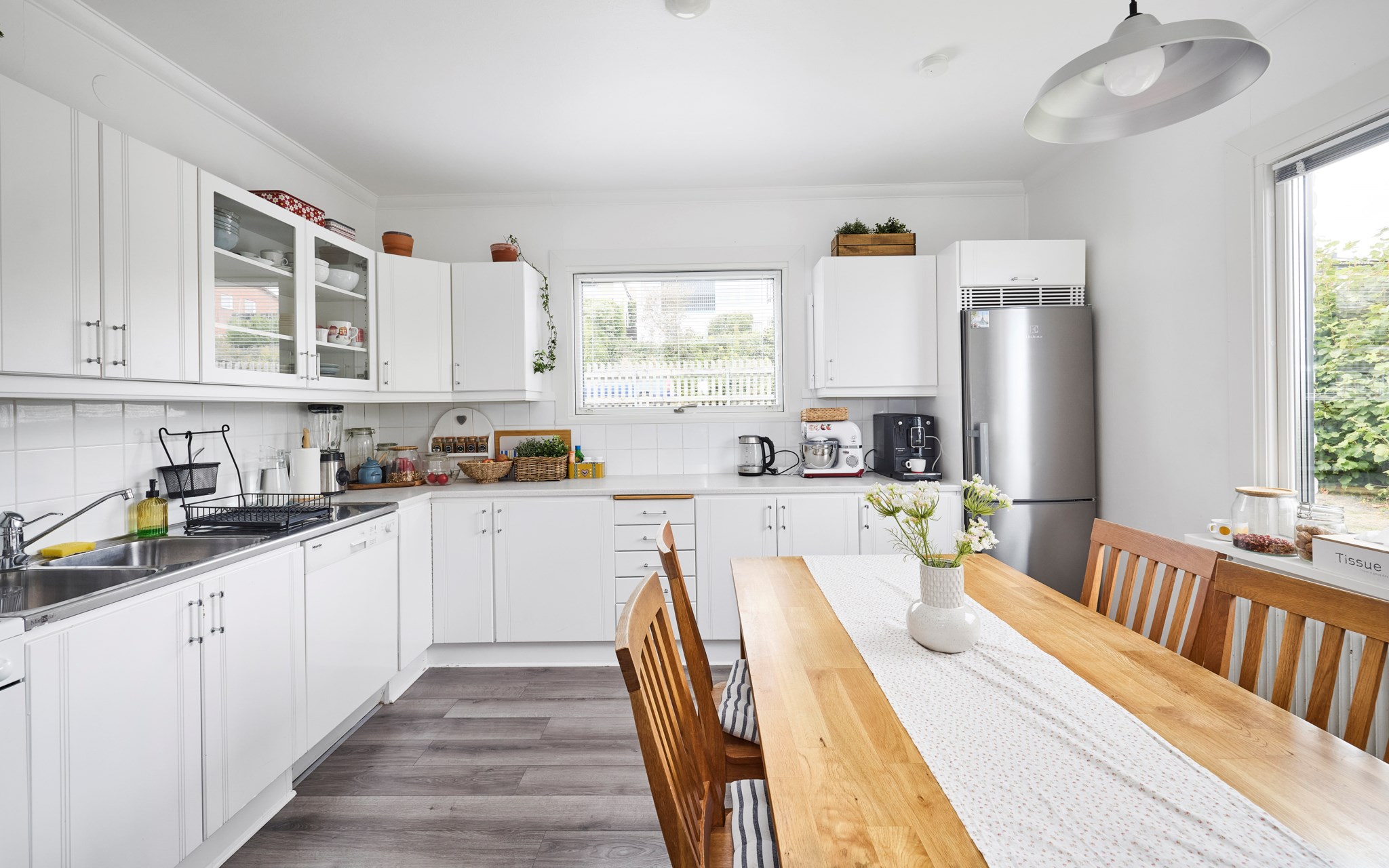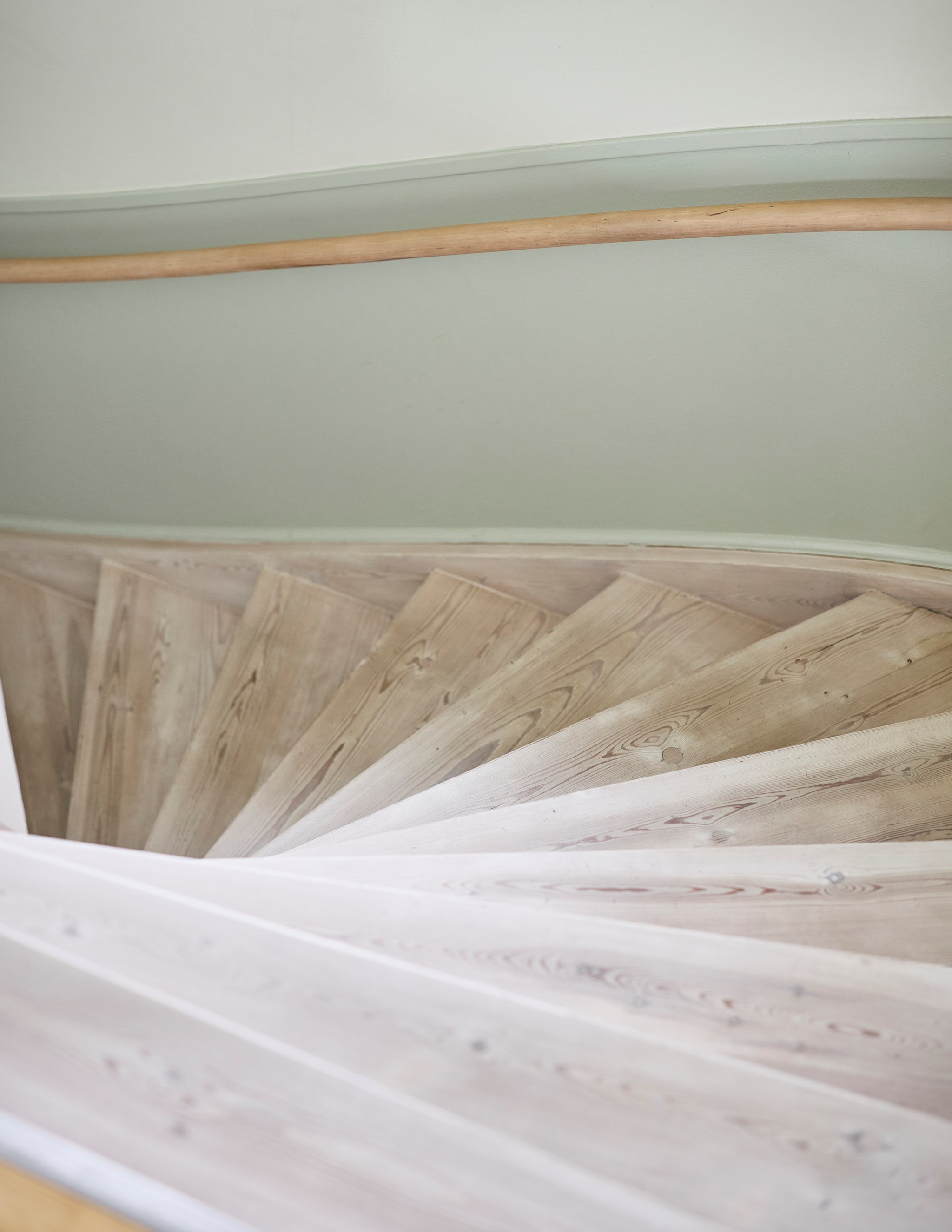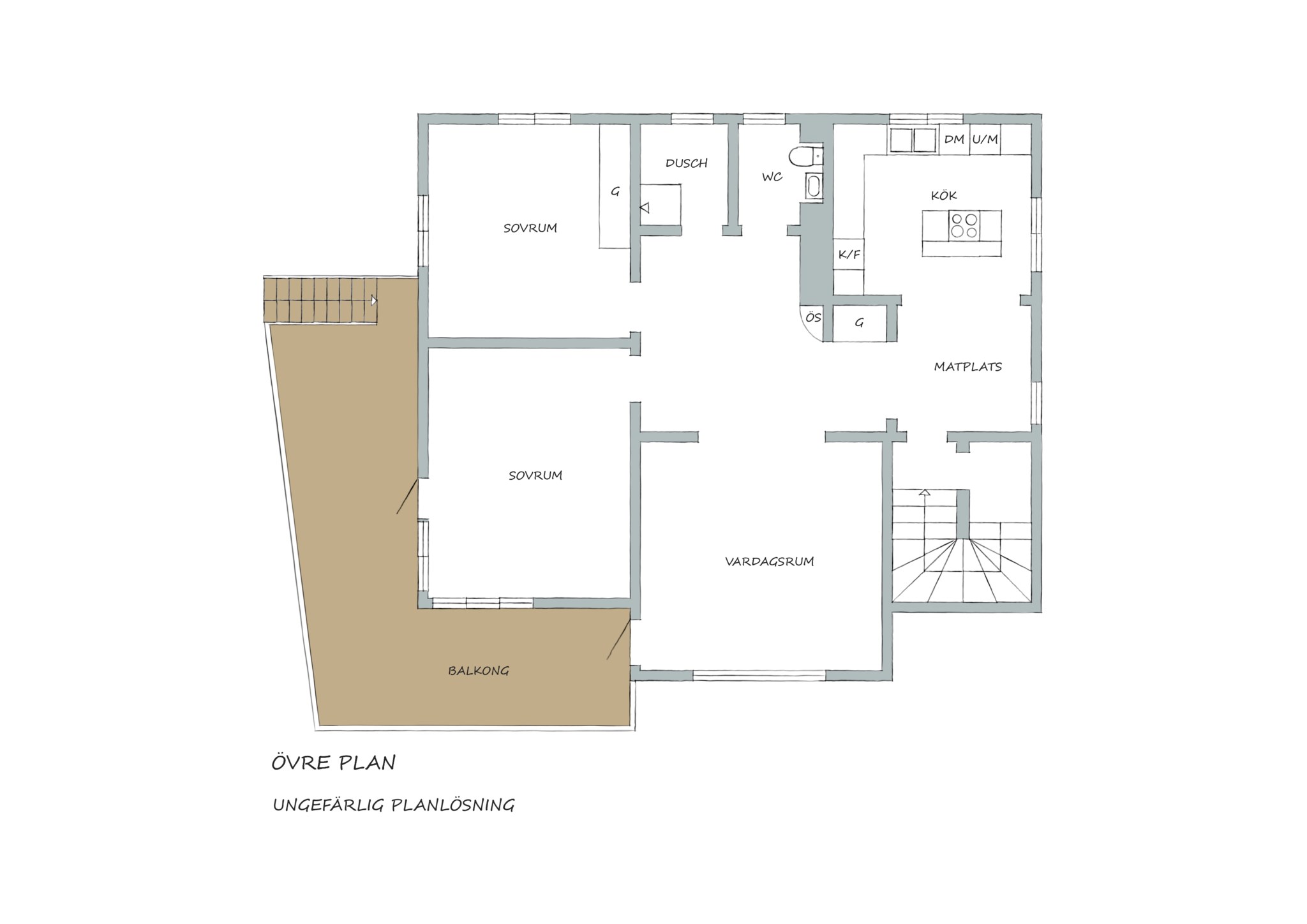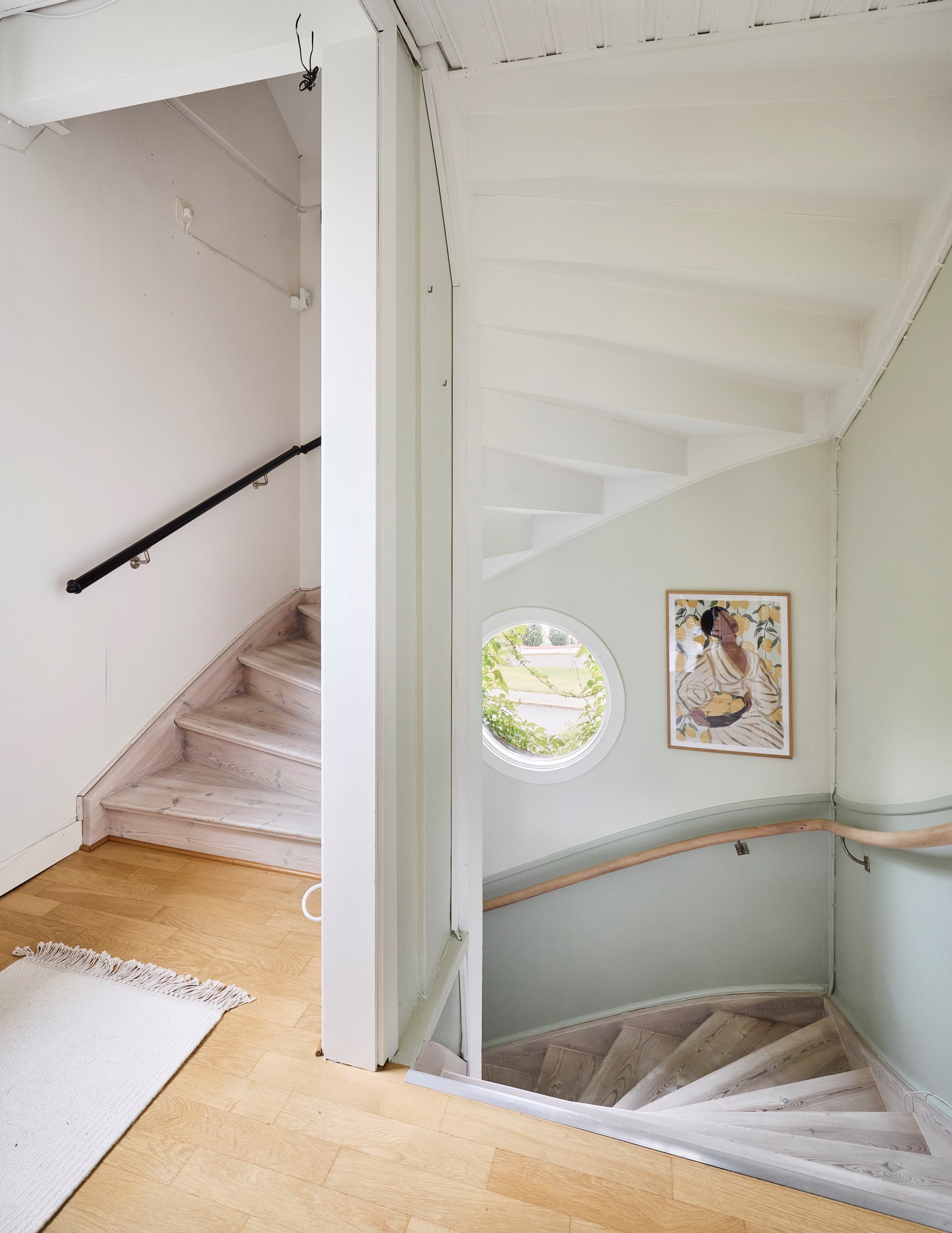 Huset disponeras alltså som tvåfamiljshus fortfarande med båda dörrarna bevarade, separata hallar, men gemensam källartrappa. Gamla trappan upp renoverad till finaste skick med vitbetsade steg och vagnstycken. Du kommer snart bli varse att även vindstrappan är lika fin. Du har även en hall när du kommer upp på det stora våningsplanet. Om någon redan tänt en brasa i kaminen kommer du märka av det. Och om någon redan börjat med maten så kommer det också kännas. Det är en relativt öppen planlösning du möts av här uppe, där rummen binds ihop på ett naturligt vis.