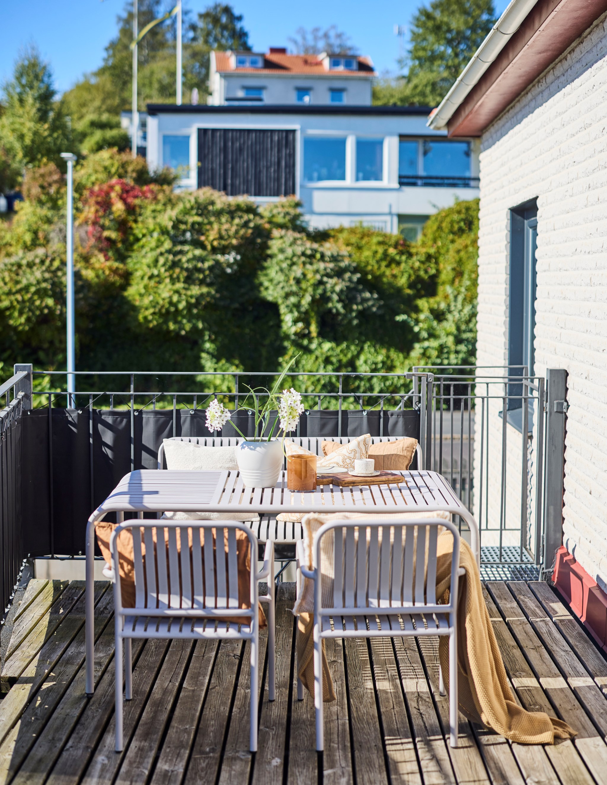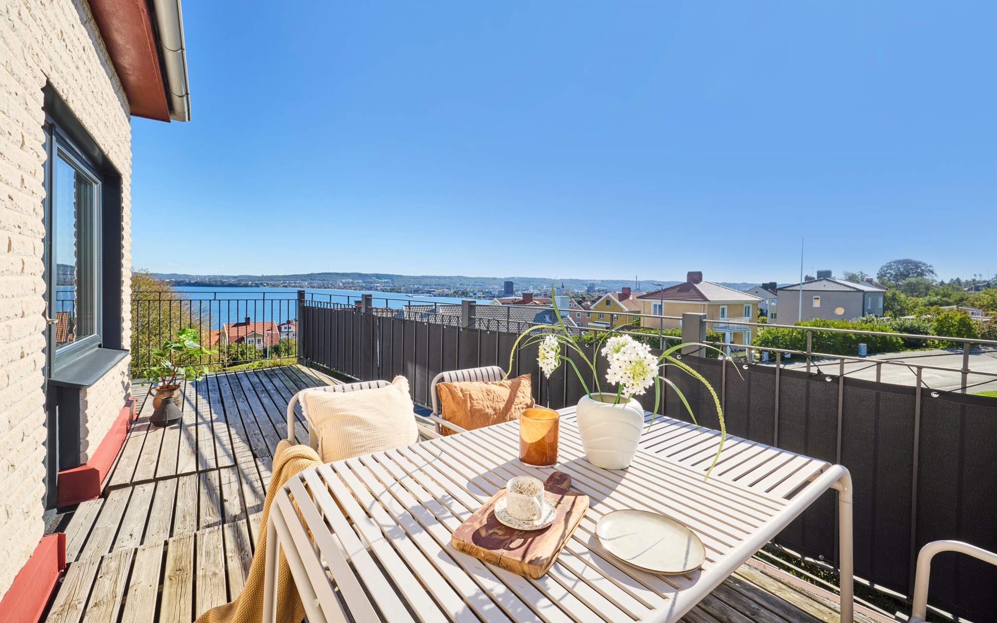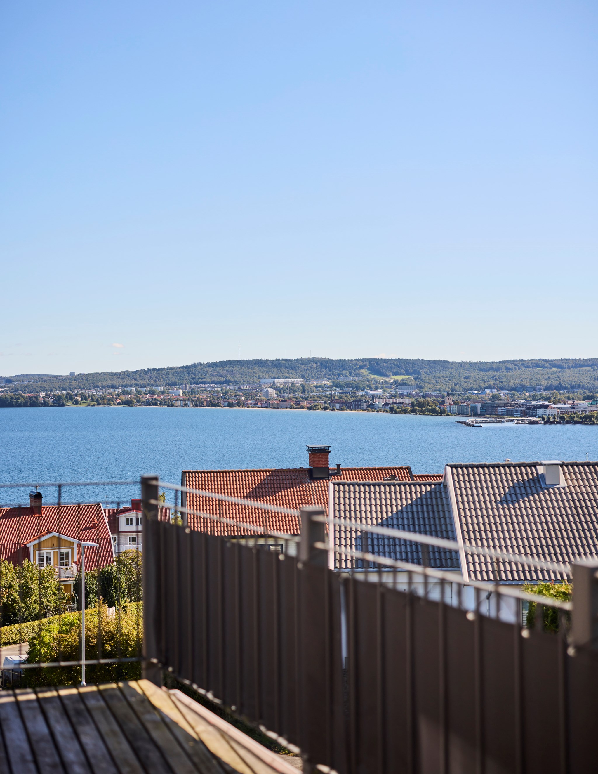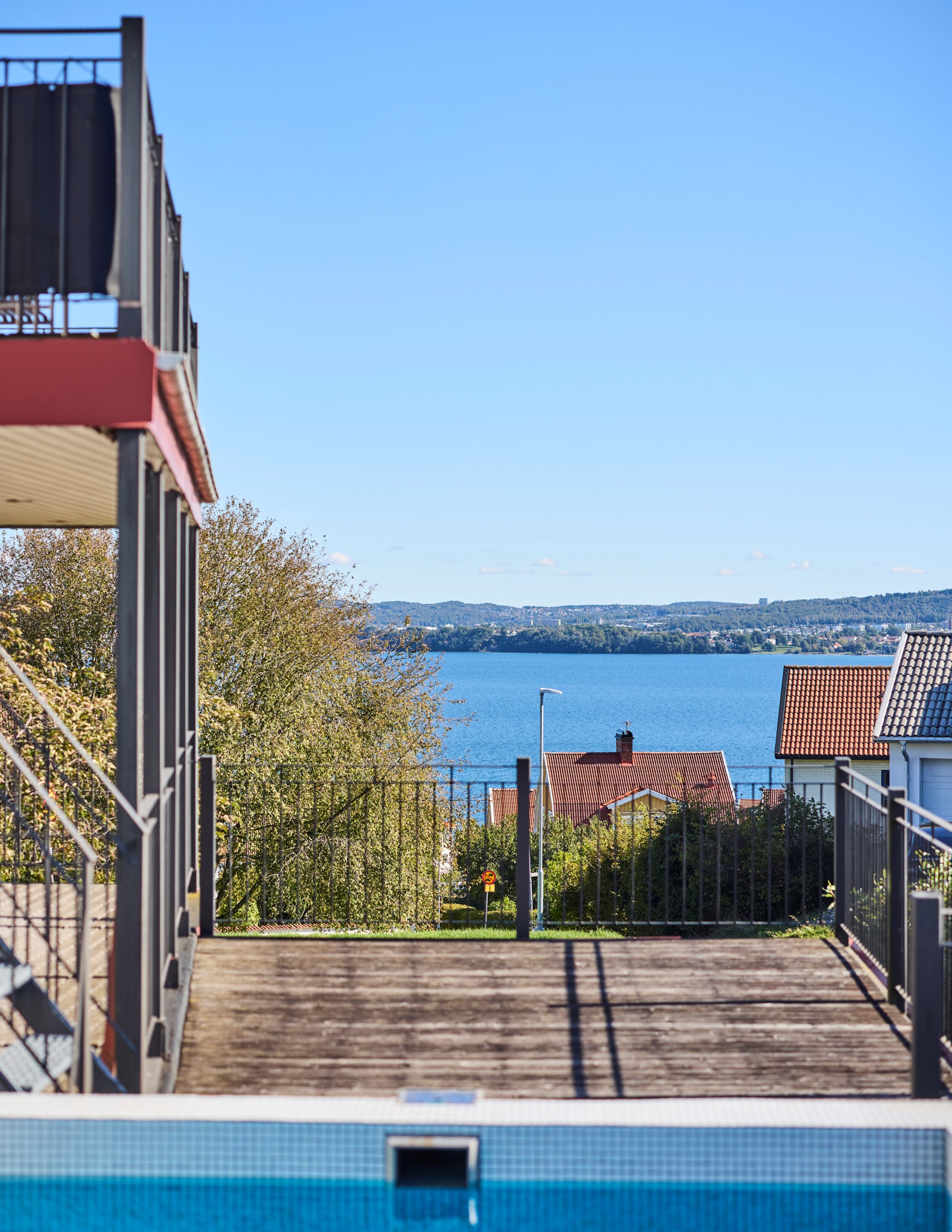 Husets mest spektakulära förnyelse är nog balkongerna både uppe och nere. Numera stor yta att möblera och den svängda L-formen gör att du både ser in över Jönköping och Vätterstranden, men också nästan rakt norrut mot Gränna och Visingsö, till och med Omberg vissa dagar om du vässar blicken. Balkongen uppe har en trappa ner till altanen och poolen som är tänkt att kunna användas gemensamt. Båda balkongerna i rejäl men luftig stålkonstruktion.