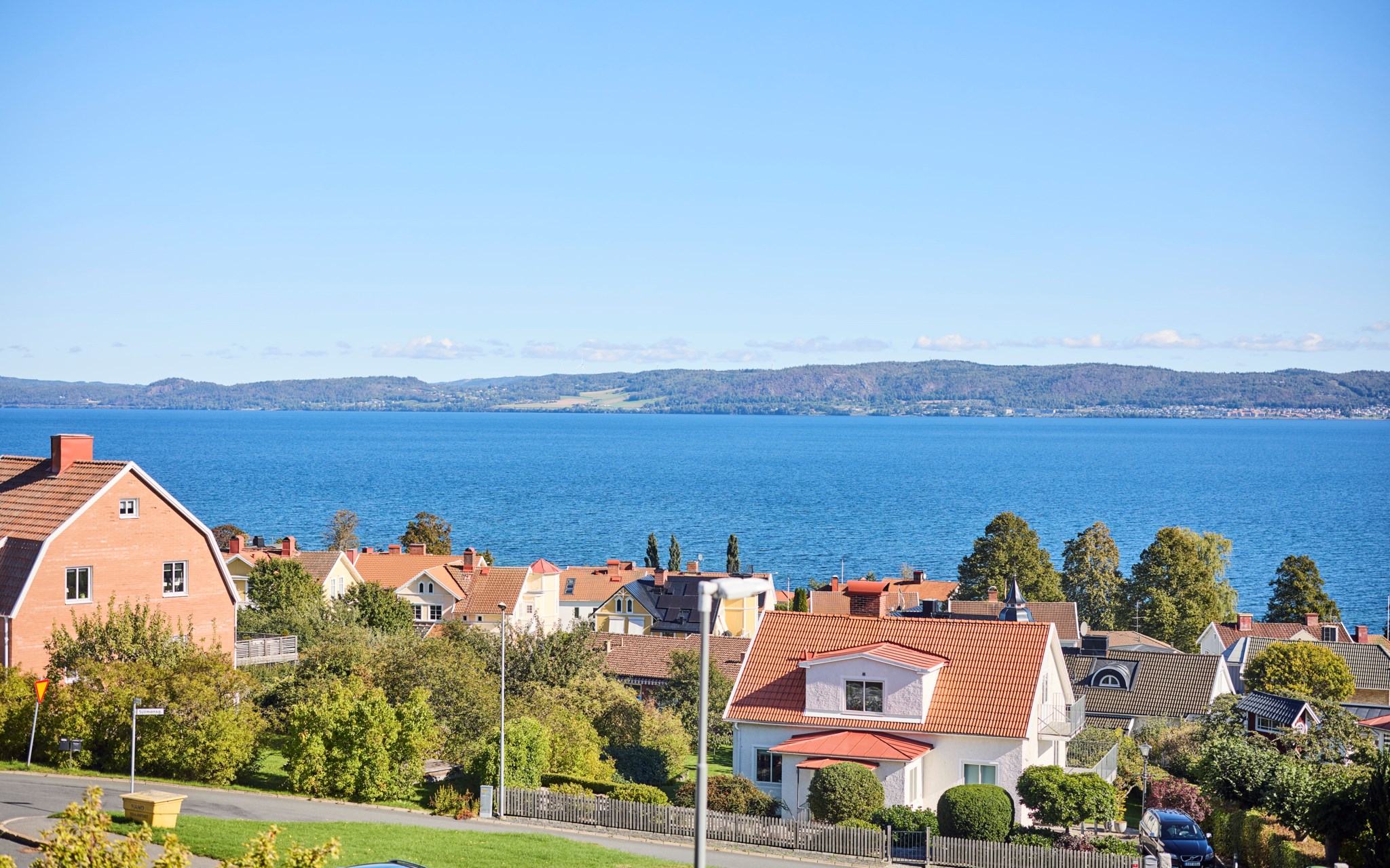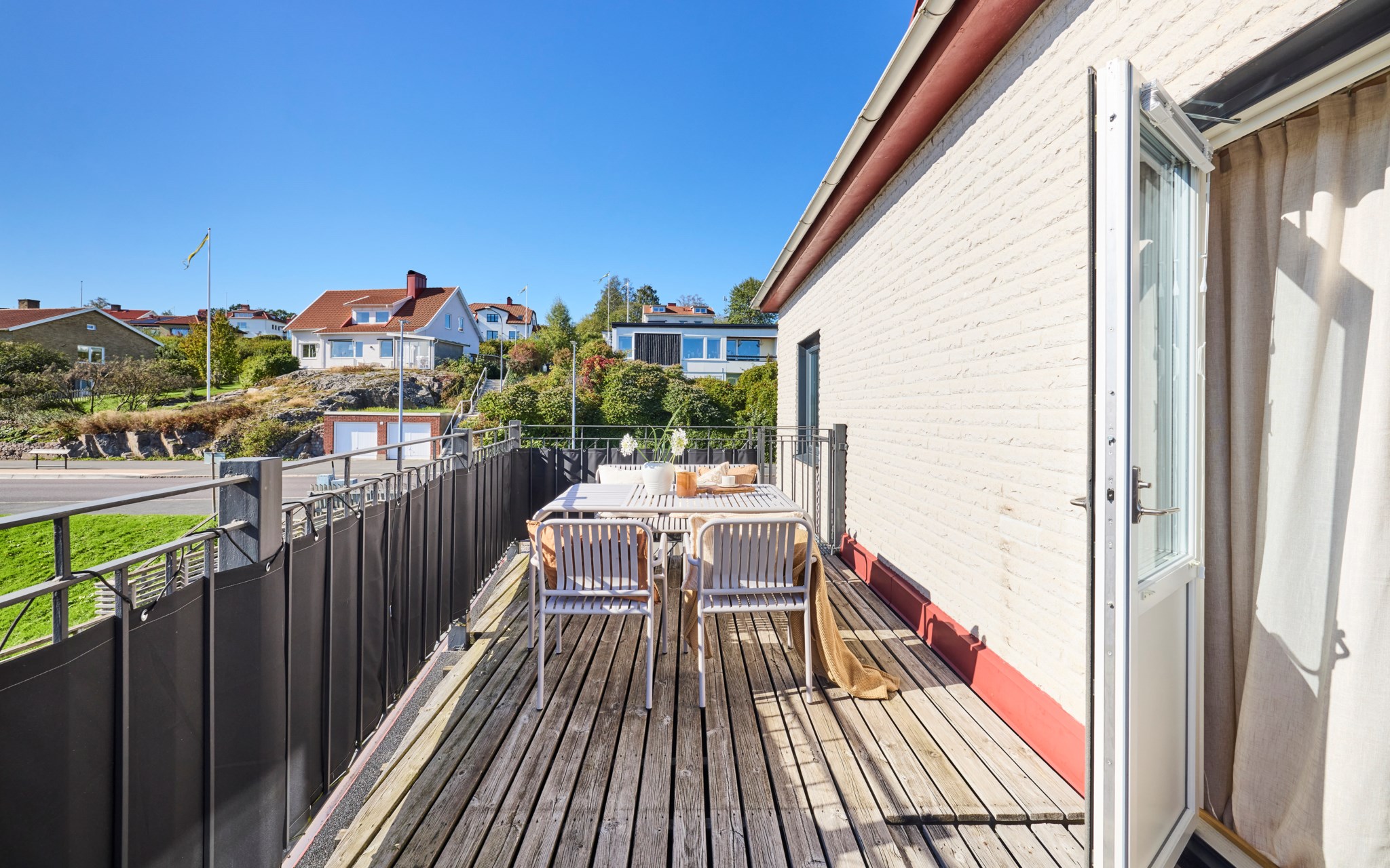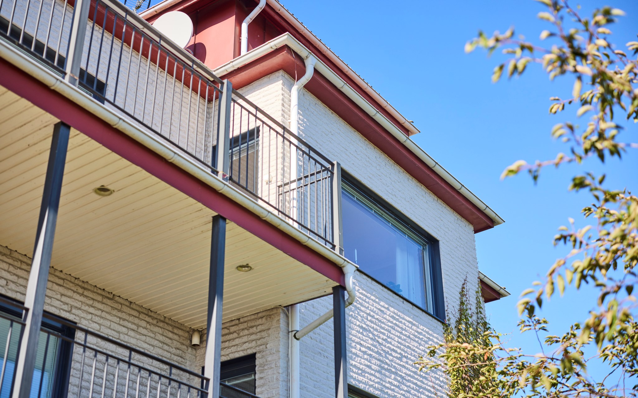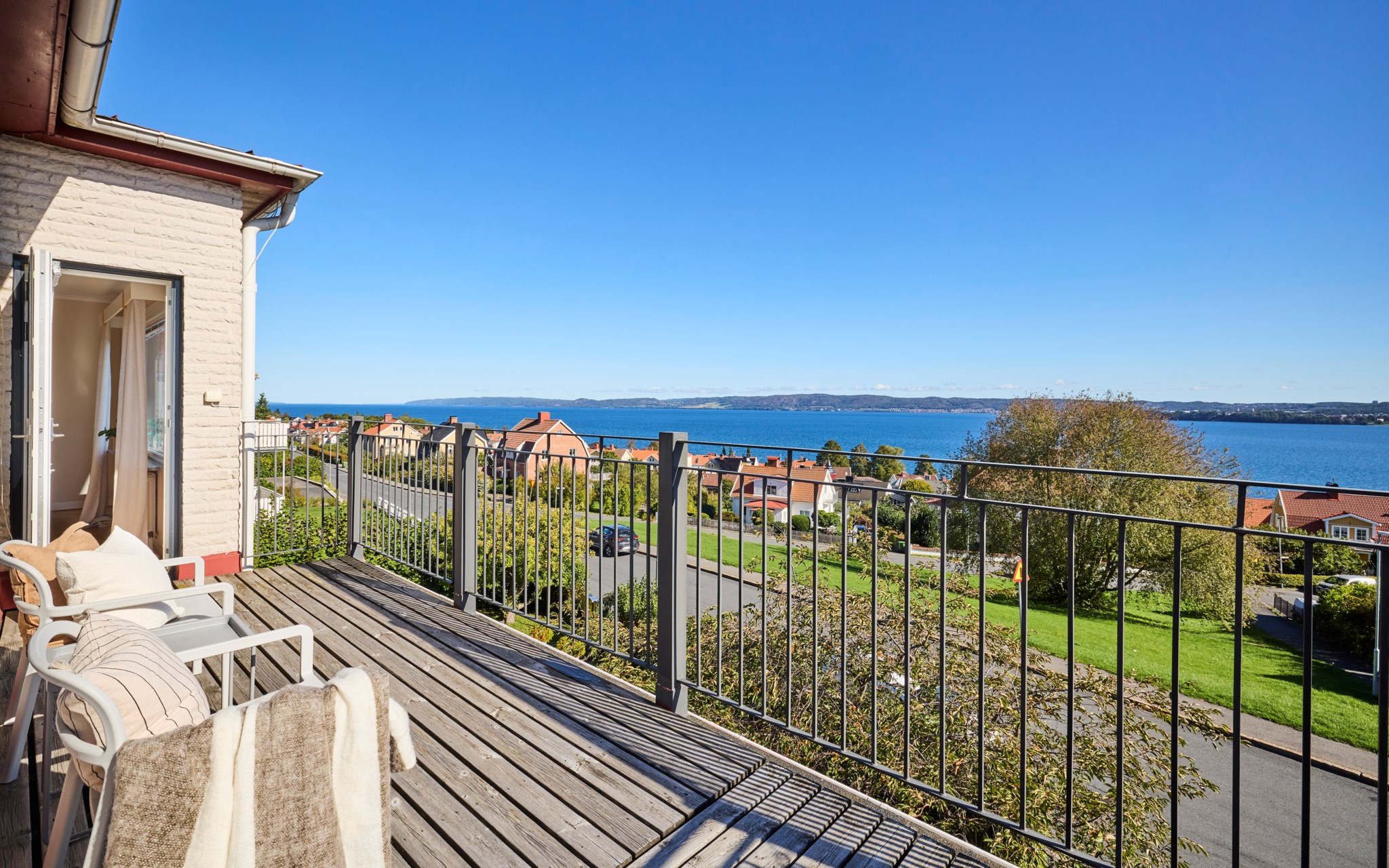 Husets mest spektakulära förnyelse är nog balkongerna både uppe och nere. Numera stor yta att möblera och den svängda L-formen gör att du både ser in över Jönköping och Vätterstranden, men också nästan rakt norrut mot Gränna och Visingsö, till och med Omberg vissa dagar om du vässar blicken. Balkongen uppe har en trappa ner till altanen och poolen som är tänkt att kunna användas gemensamt. Båda balkongerna i rejäl men luftig stålkonstruktion.