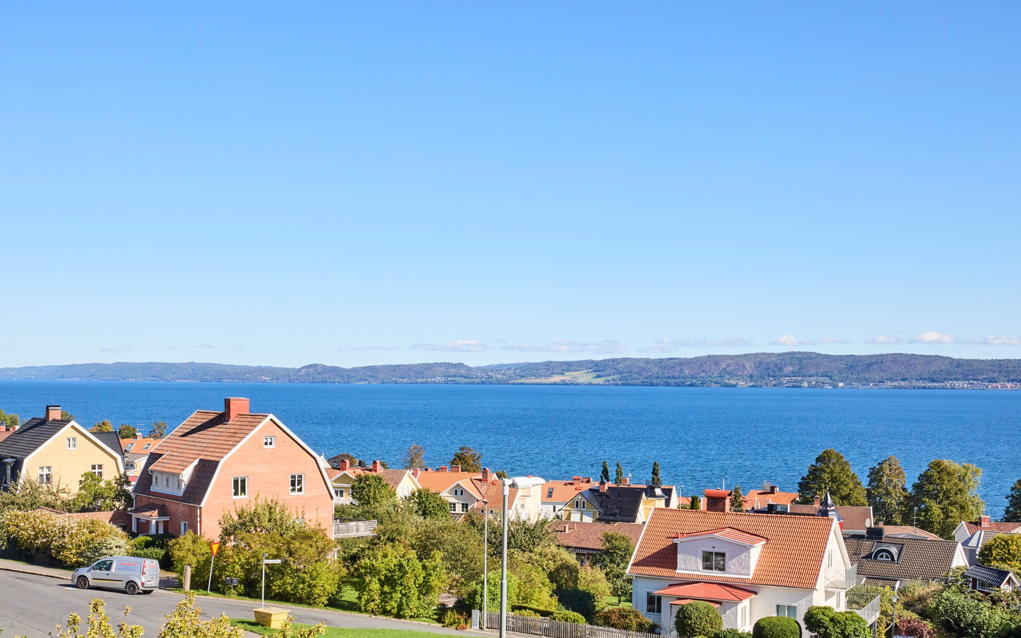 Stort hus har såklart en stor vind. Takfall i alla fyra väderstreck gör att det blir en fin kombination av vackert ljus och snedtak inne. De tre rundade mindre takkuporna är original, men mot utsikten har det byggts en större takkupa senare som gapar stort efter utsikten här högst upp i huset. Vinden inredd för att kunna bli ett eget boende om någon skulle vilja ha det så, men har disponerats tillsammans med stora lägenheten på våning två under lång tid. Även här uppe får du ett vackert vardagsrum med utsikt som tar andan ur dig. Glaspartiet i princip lika stort som på våningarna under.