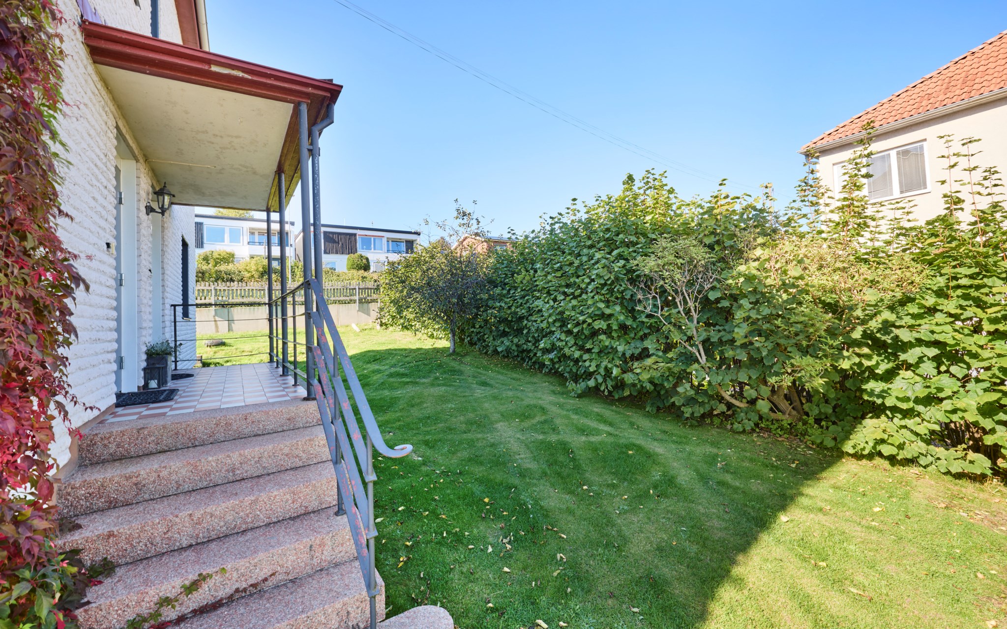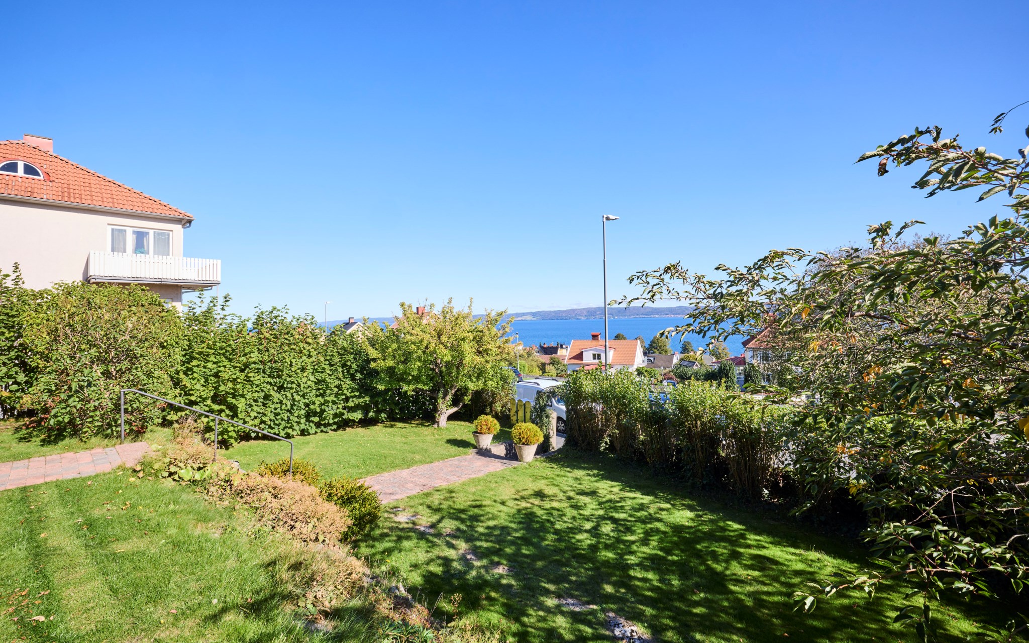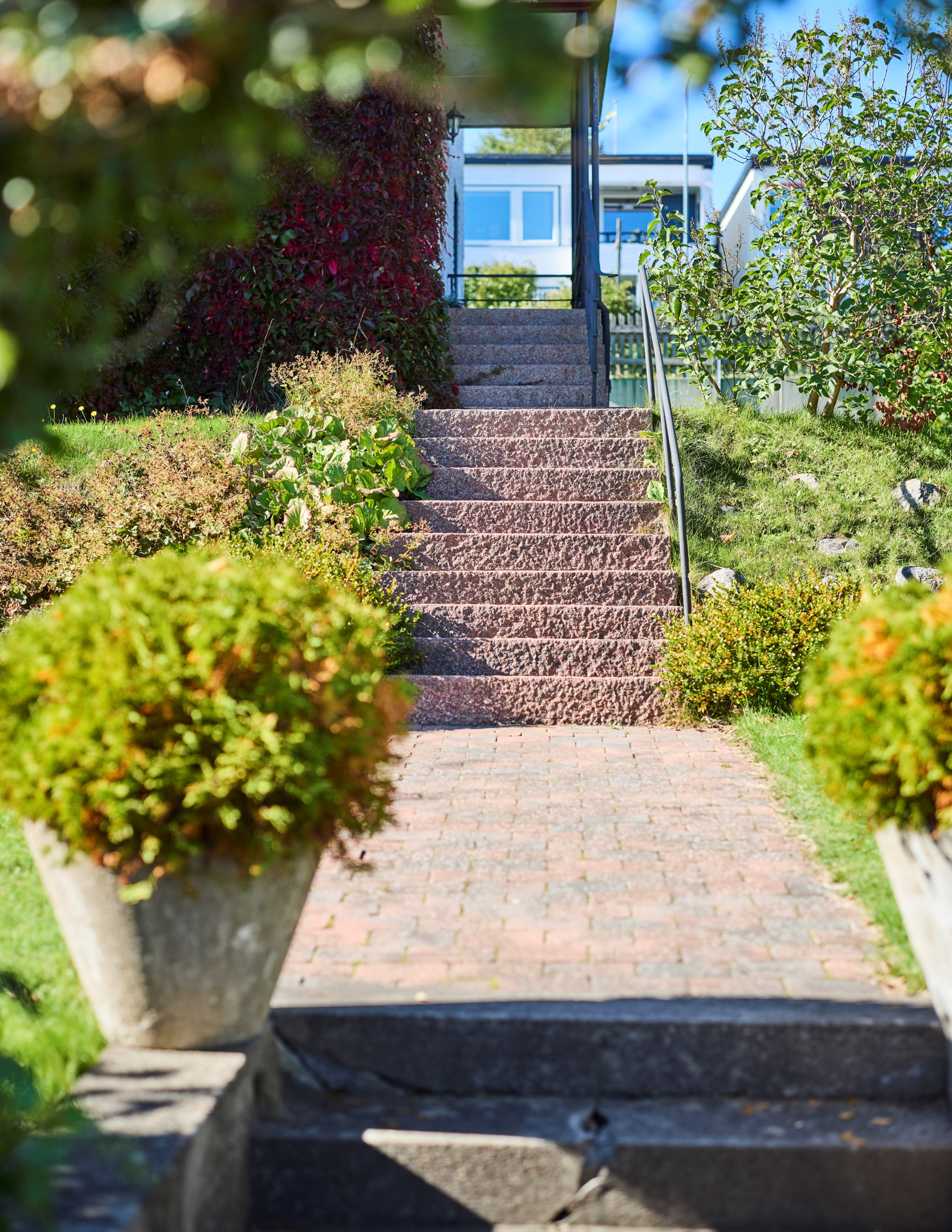 Trädgården nästan helt omgärdad av häckar – mot gatan, mot allmänningen på hörnet och mot grannen. Och innanför dessa hittar du både äppelträd och körsbärsträd, vildvin, fläder och syren. Och säkert en hel del annat dessutom. Altanen har fått bre ut sig stort och kan användas av alla i huset hur du än disponerar det. En pool finns också där allt det tekniska fungerar som det ska. Det som gör utsikten grandios redan i markplan är att det inte ligger något hus på andra sidan Narvavägen, för där öppnar sig en perfekt pulkabacke till vintern, som lockar kvarterets barn i stora skaror.