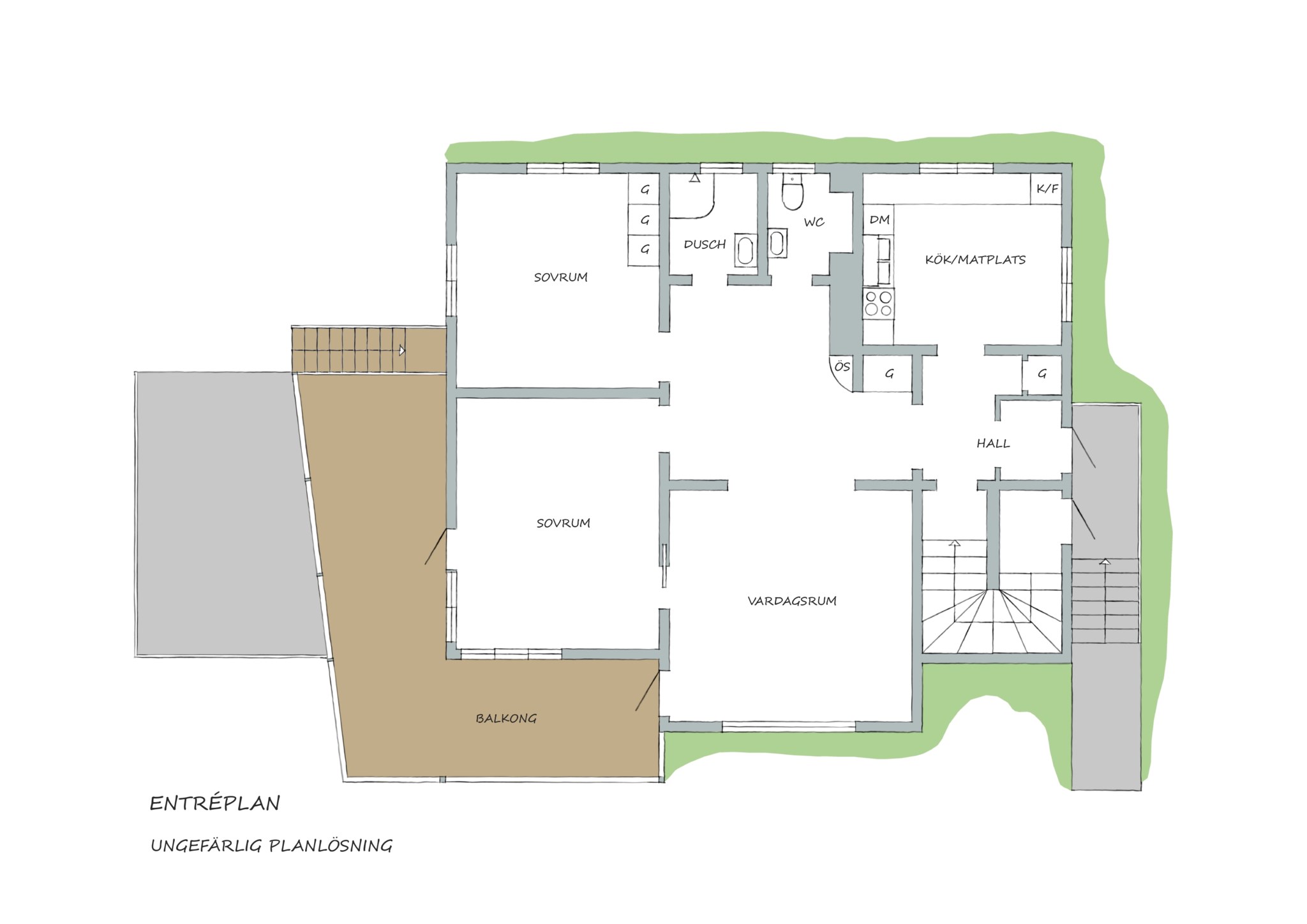 De två våningsplanen i huset är alltså i princip identiskt planerade och har kvar den ursprungliga planlösningen. Köket här nere är lite mer avdelat från hallen och med en lite större matplats, eftersom det inte finns någon köksö här nere. Vardagsrum och matsal med samma fina fiskbensparkett som uppe, med dubbla utgångar till balkongen. Köket basrenoverat ungefär samtidigt som köket renoverades uppe. Även här badrum och toalett separerade vilket är väldigt praktiskt tänkt. Balkongen ansluter med en grind till den allmänna uteplatsen, poolhänget och resten av trädgården.