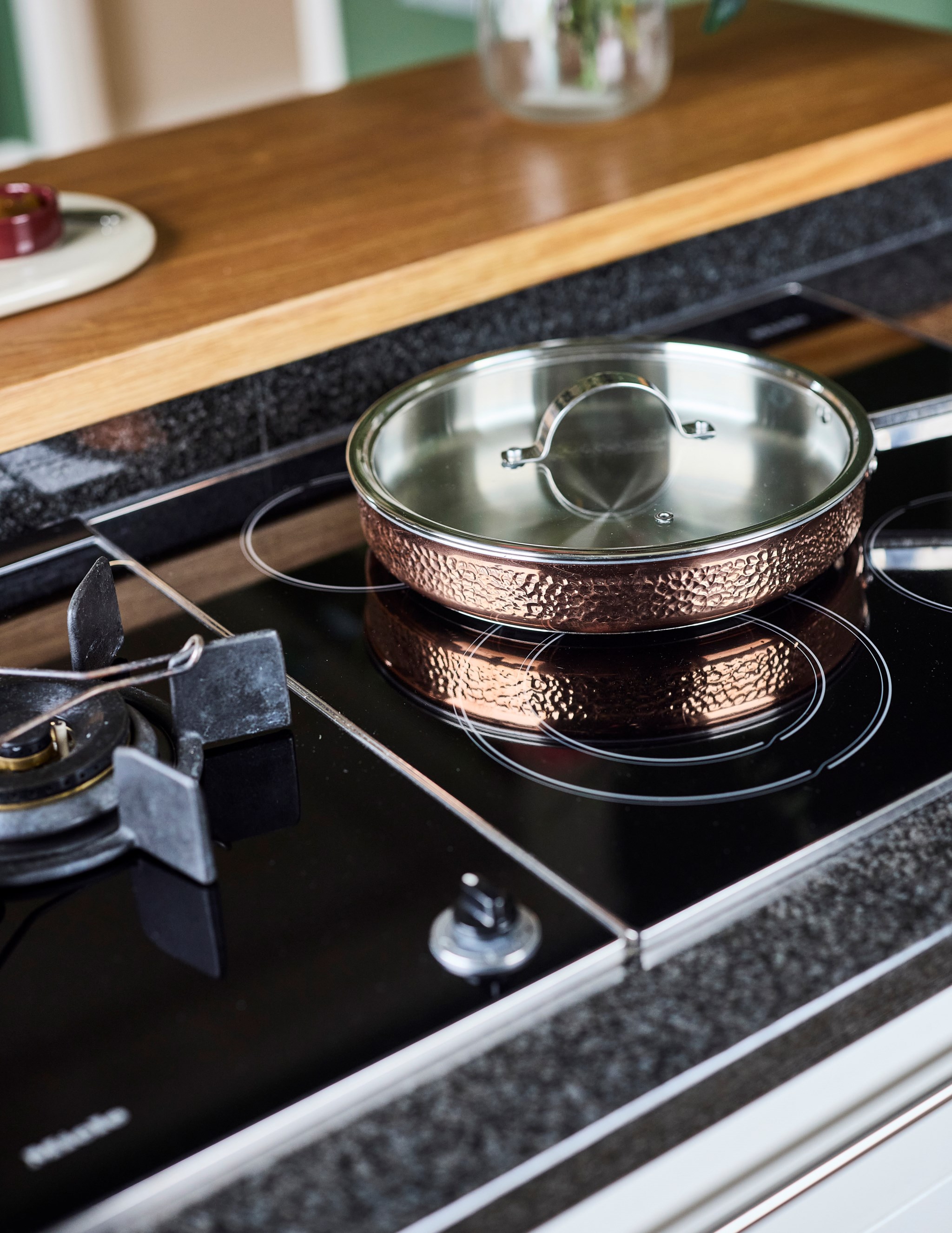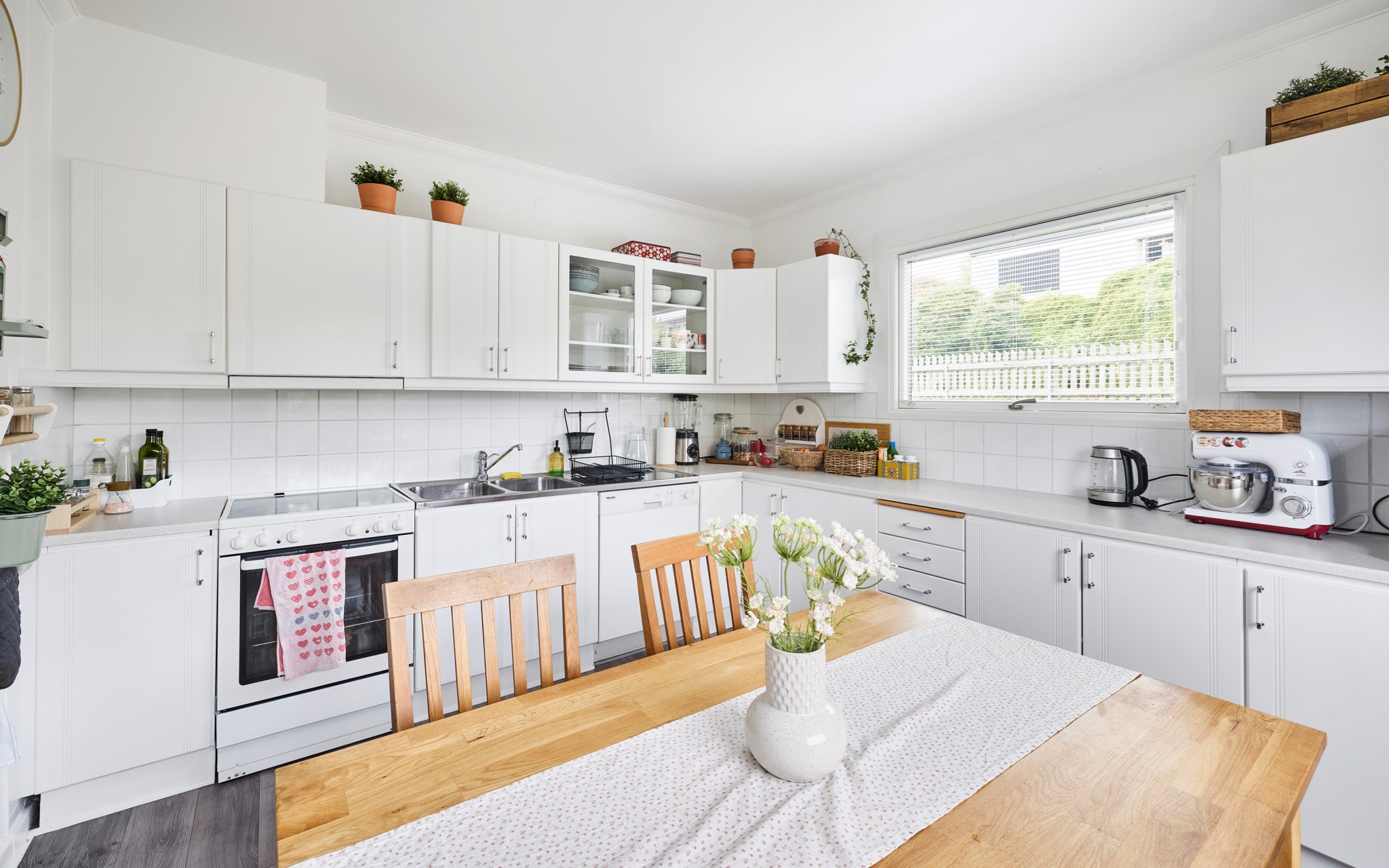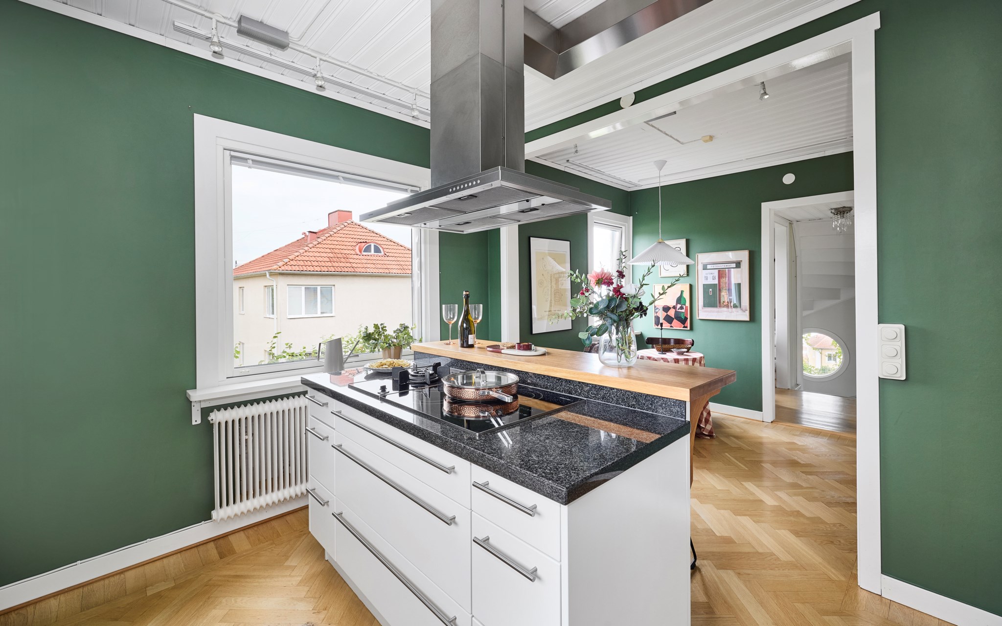 "Köket på andra plan är ombyggt och rätt påkostat även om det inte är helt nytt. Här finns både induktionshäll och gasspis."