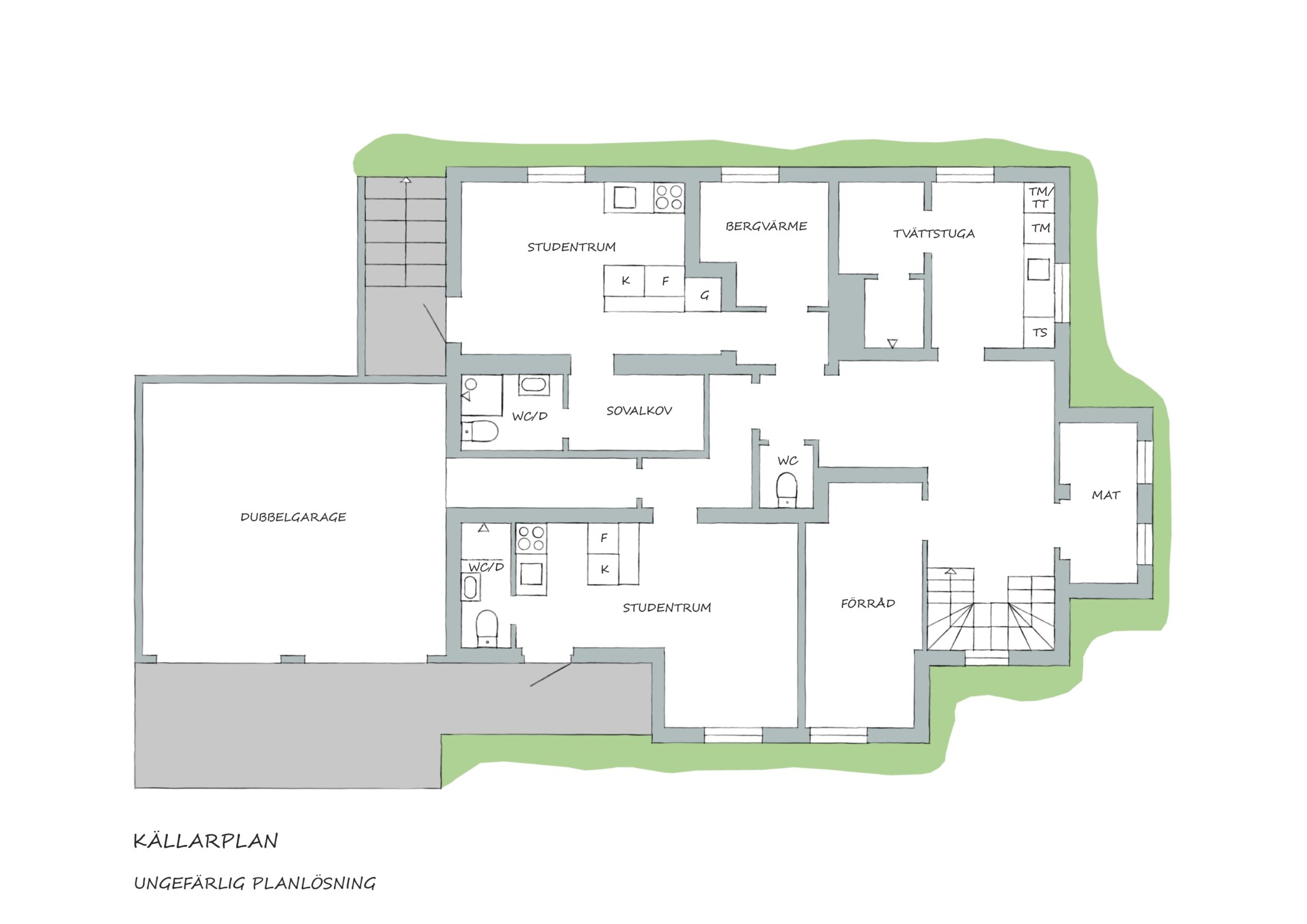Huset rymmer alltså två studentrum som kan hyras ut som inackorderingsrum, med tillgång till källarens tvättstuga och förrådsutrymmen. De båda rummen ligger med separata egna ingångar i källarplanet, med kaklade golv och vattenburen golvvärme i båda. Båda rummen har egna pentrykök och helkaklade badrum med wc, handfat och duschhörna. Uppskattade av många studenter under senare år, inte minst för att bussen går ofta och stannar så nära uppe på Hallmansvägen. Rummen bidrar såklart till husets fina totalekonomi för dig som ägare.