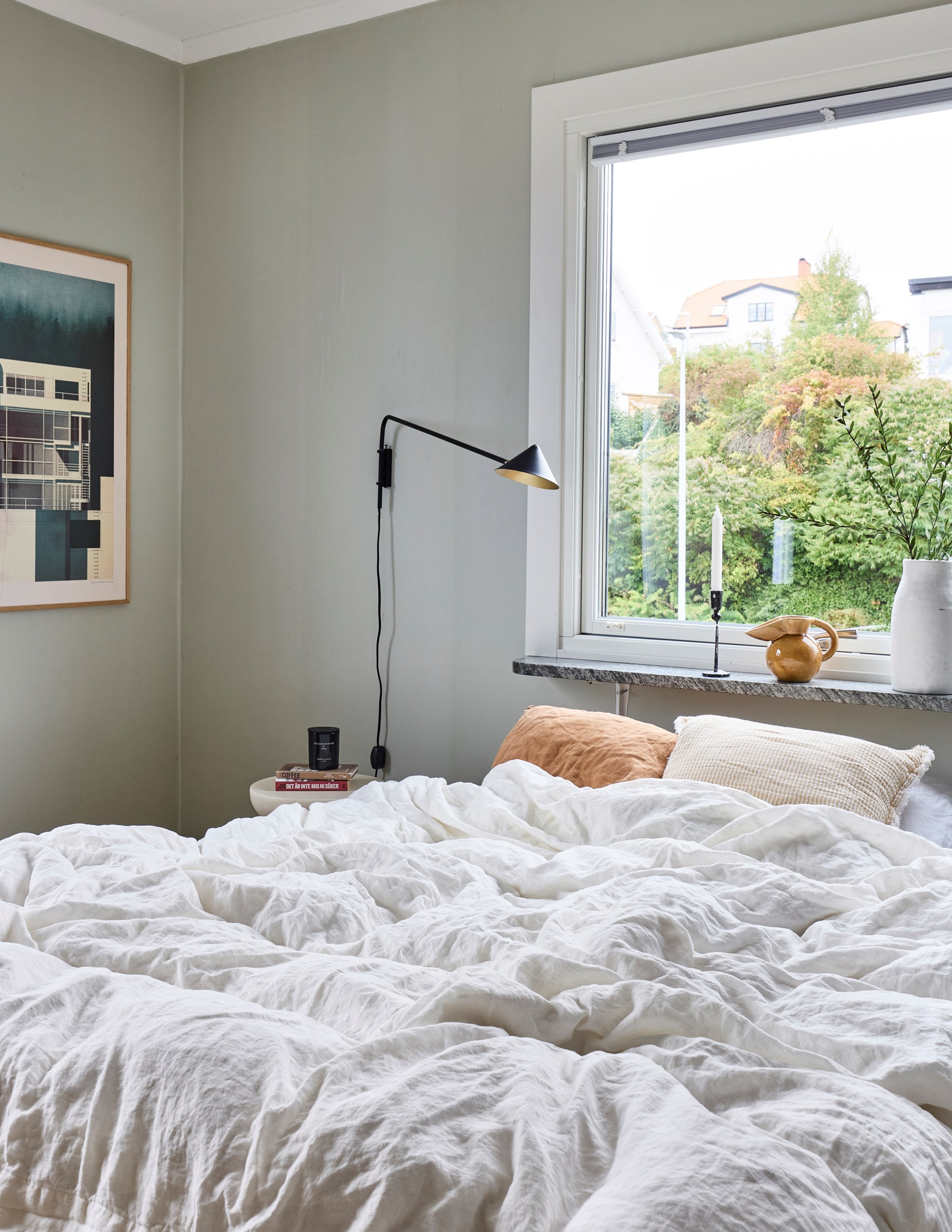 Sovrummet ligger med sin fina fönsterkupa mot söder. Snedtaket gör sig påmint, men eftersom golvytan är stor så blir det en väldigt fin känsla i rummet, och det finns många möjligheter att nyttja de lägsta delarna till förvaring. Eller skaffa en låg säng och få en fin inramning av taket. På golvet ligger det ett laminatgolv, både här inne och ute i allrummet, troligen hittar du gamla plank inunder.
