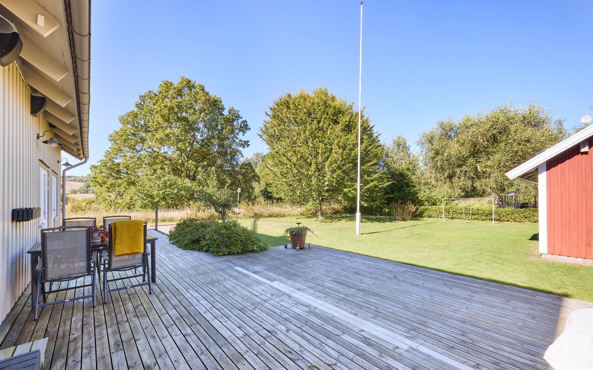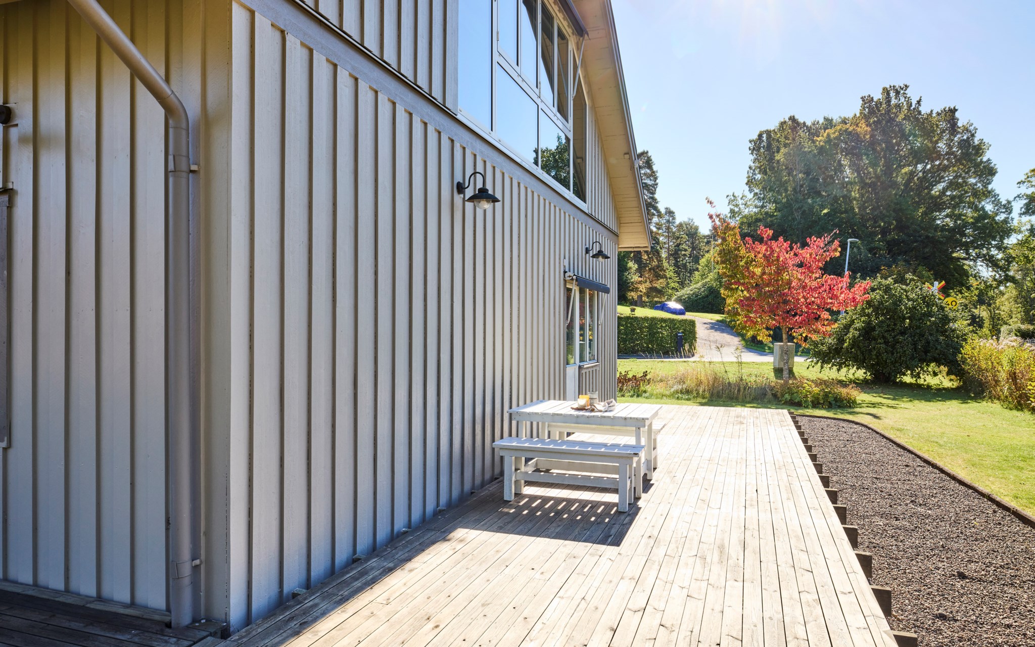 Detta är så lantligt det kan bli och ändå ligga i ett av stans mer centrala villakvarter. Granne med både Kättilstorps golfbana och de kullriga landskapet ut mot Bårarp. Från gatan ser du inte att huset optimerat utsikten till perfektion med ett heltäckande glasparti i gaveln som gör att du får hela landskapet i vidvinkel en trappa upp. Ett rum som dessutom är en enda stor volym från gavel till gavel och med högrest snedtak som inramning. Huset har alltså sina sovrum i entréplanet och den sociala kompetensen en trappa upp.