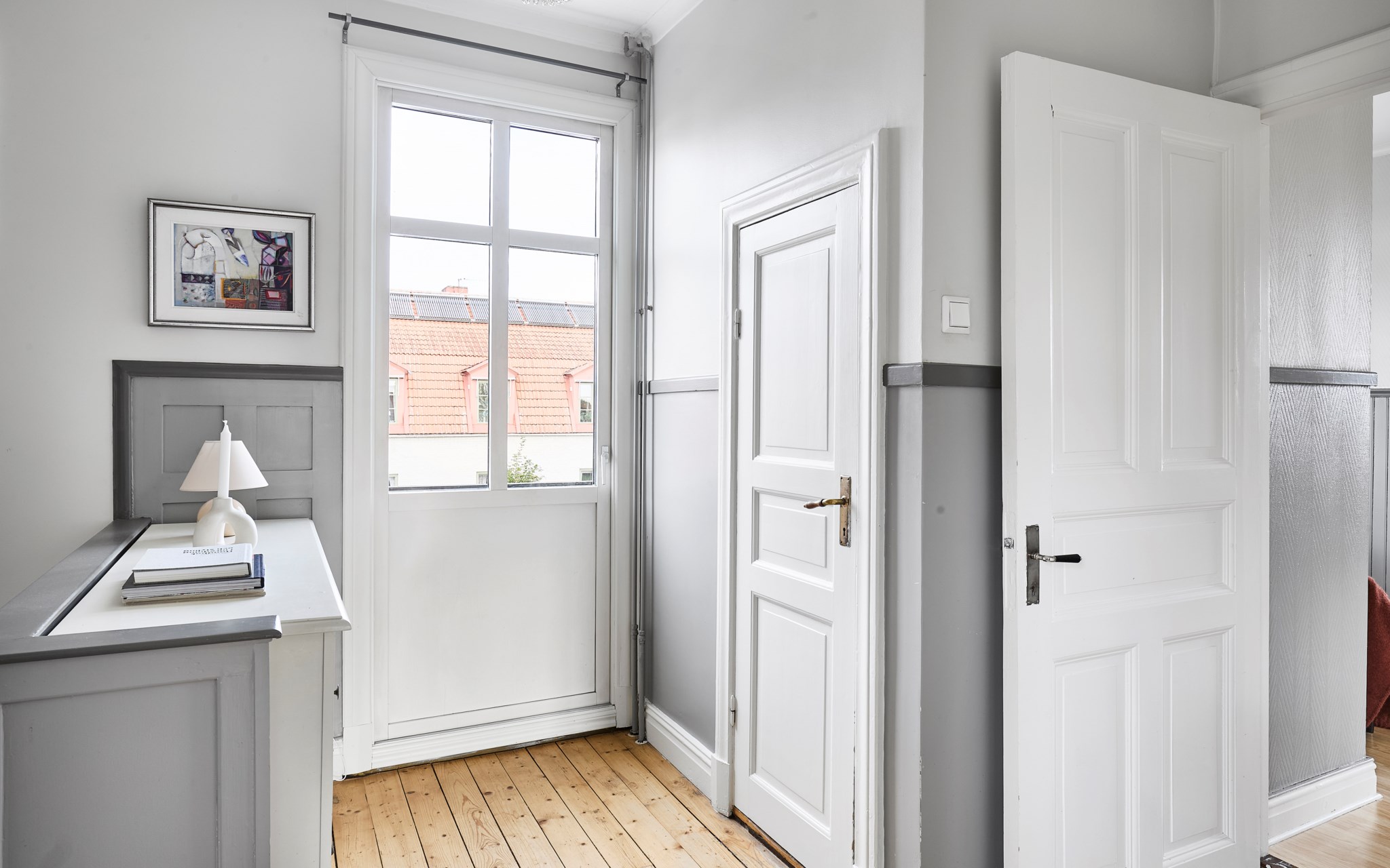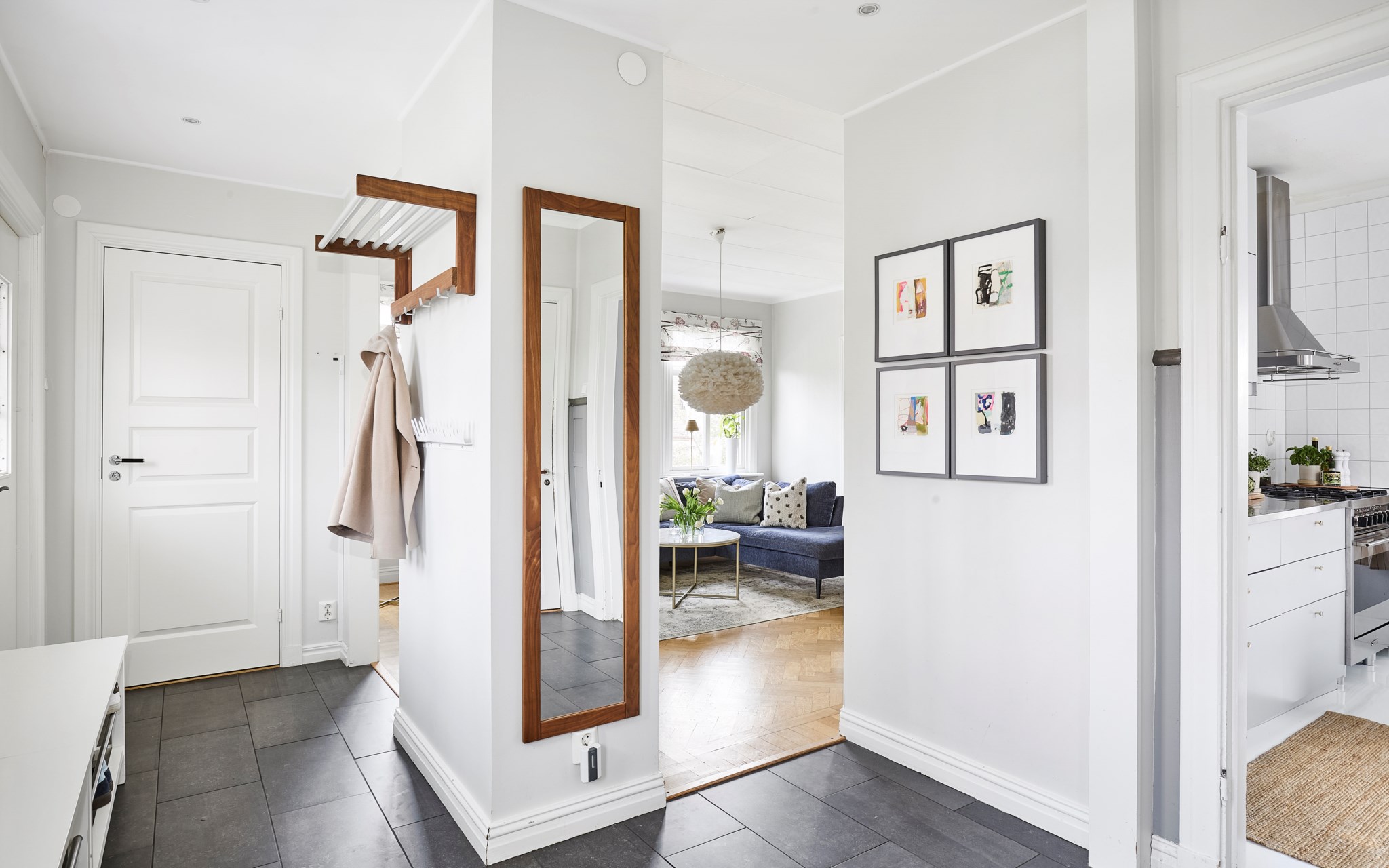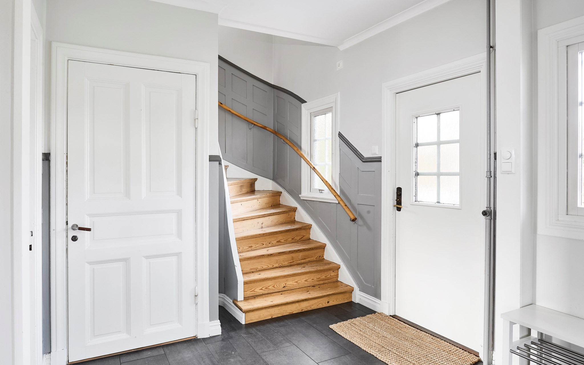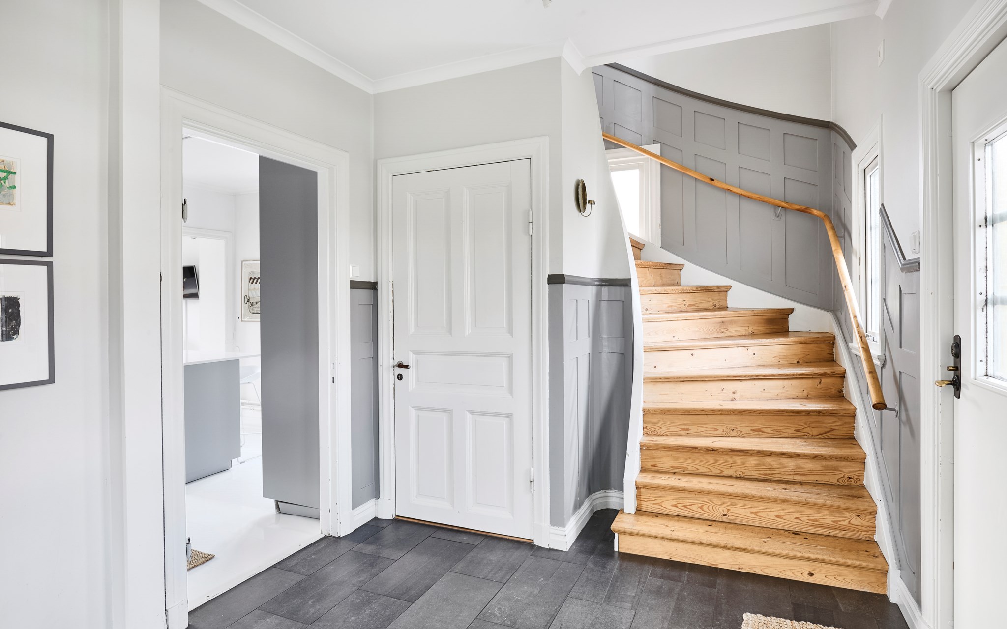 Den klassiska entréverandan sätter tonen på en gång, med de blå dörrarna under balkongen. Den högra används som ingång, välkommen! Inne möts du av en ljus hall med klinkergolv, vattenburen golvvärme och gott om svängrum. Köket rakt fram, vardagsrummet till vänster – du kliver i princip rakt in i husets sociala mitt. Gästwc och smart förvaring finns nära, gömt men lättillgängligt på samma gång.