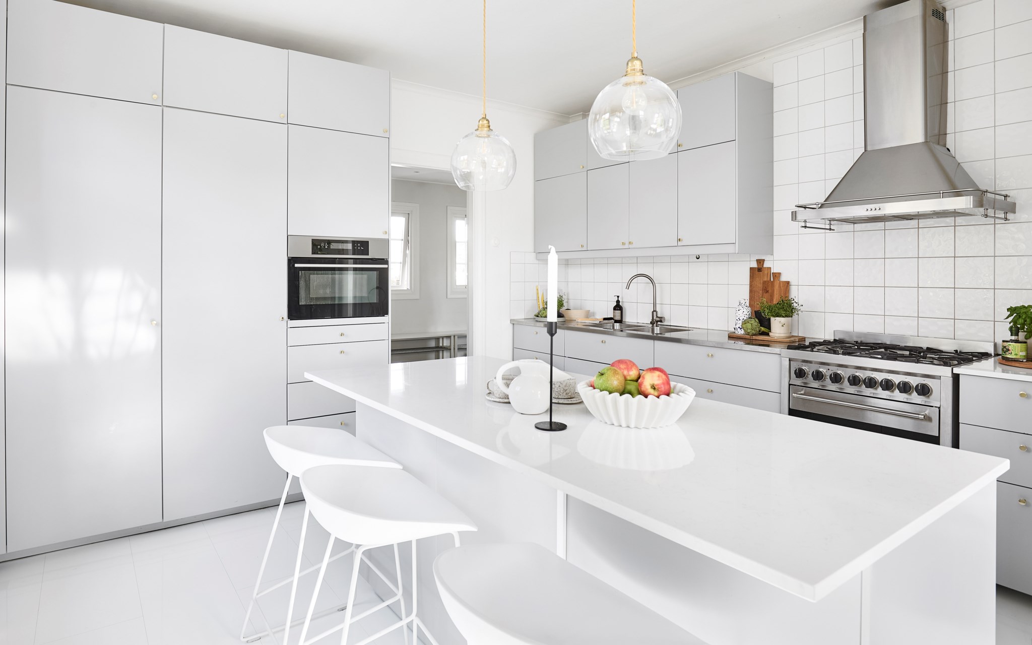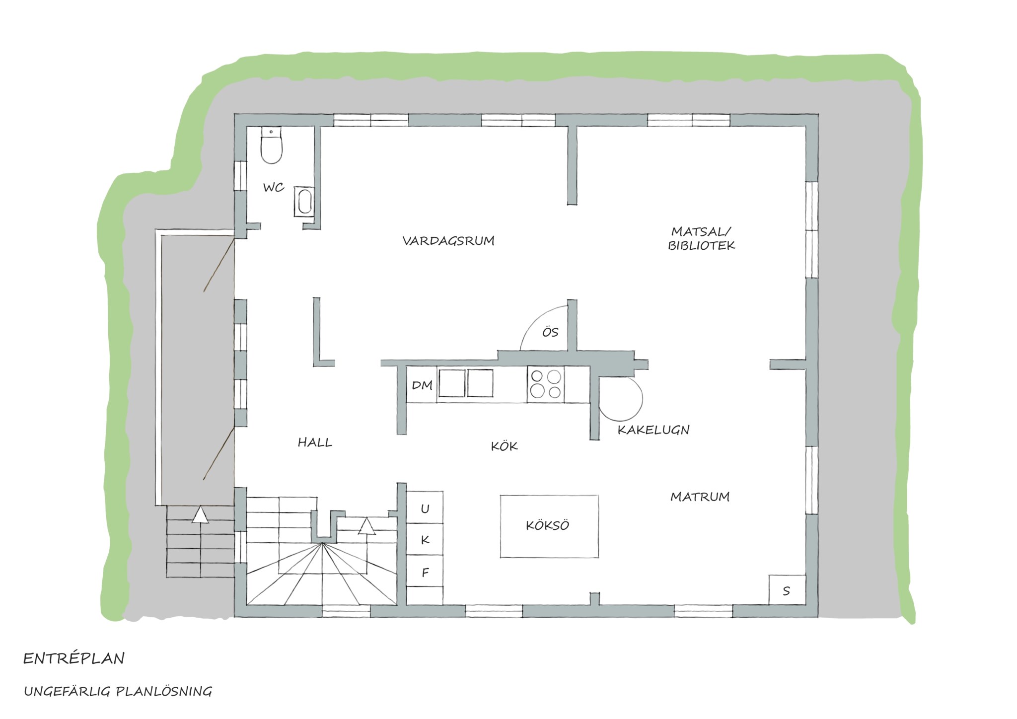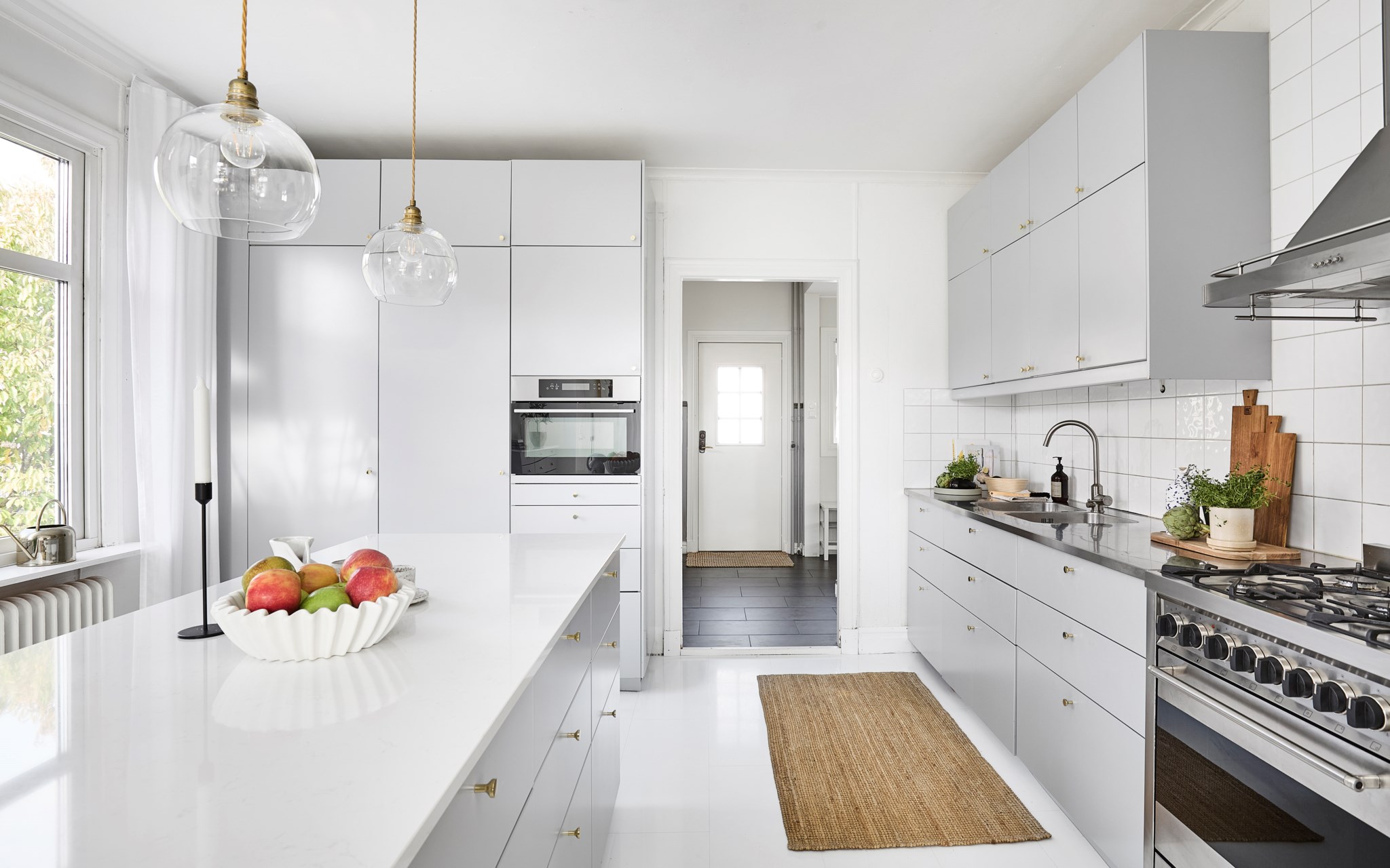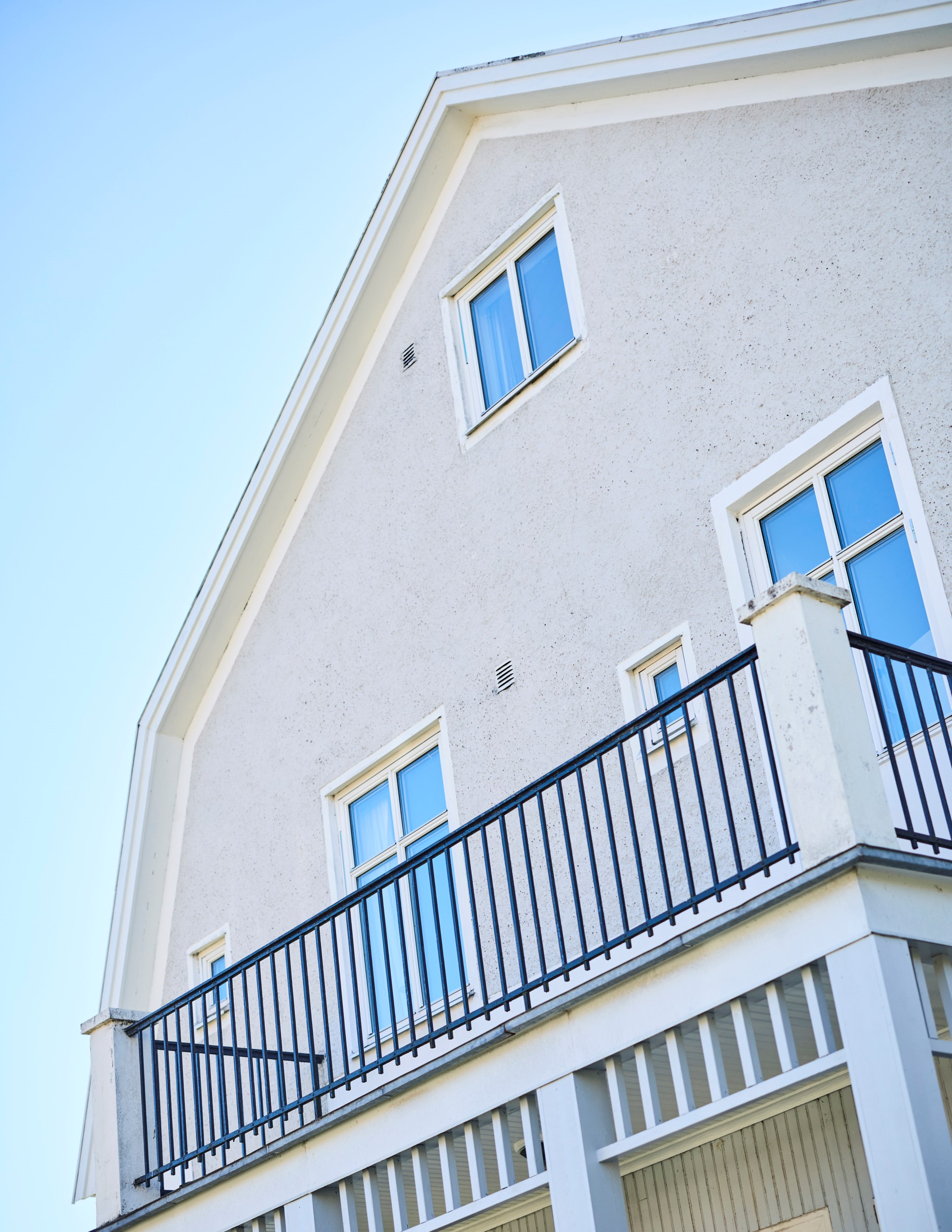 Den klassiska entréverandan sätter tonen på en gång, med de blå dörrarna under balkongen. Den högra används som ingång, välkommen! Inne möts du av en ljus hall med klinkergolv, vattenburen golvvärme och gott om svängrum. Köket rakt fram, vardagsrummet till vänster – du kliver i princip rakt in i husets sociala mitt. Gästwc och smart förvaring finns nära, gömt men lättillgängligt på samma gång.