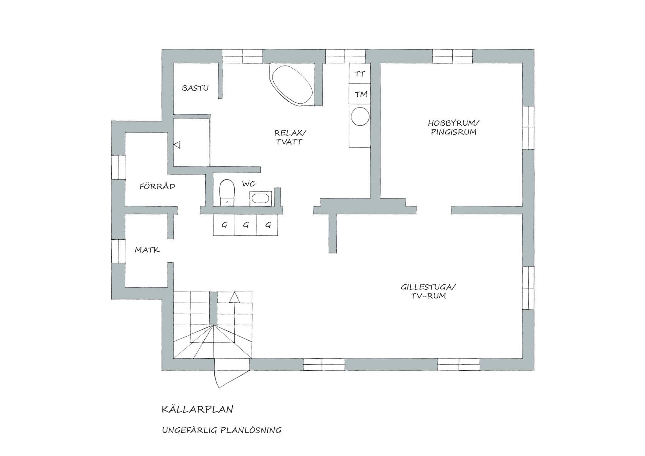 Direkt nedför trappan öppnar den stora gillestugan, lättmöblerad och med källarfönster åt två håll. Här ryms soffhörna, stor skärm eller projektor och förvaring utan att det känns trångt. Ställ fram pingisbordet när det vankas turnering eller bädda till gäster över helgen. Här är det alltid svalt sommartid och enkelt att hålla i ordning året om.