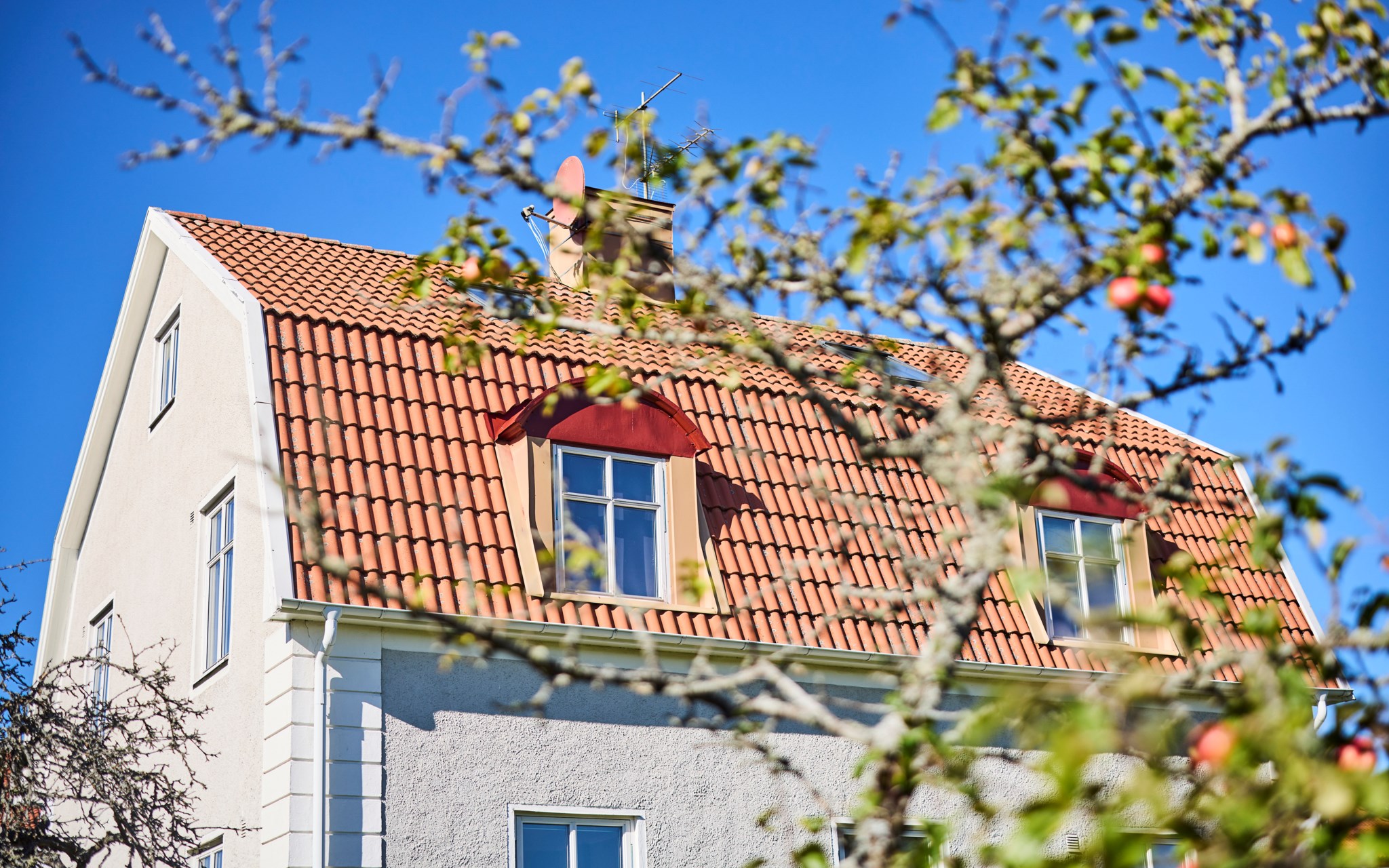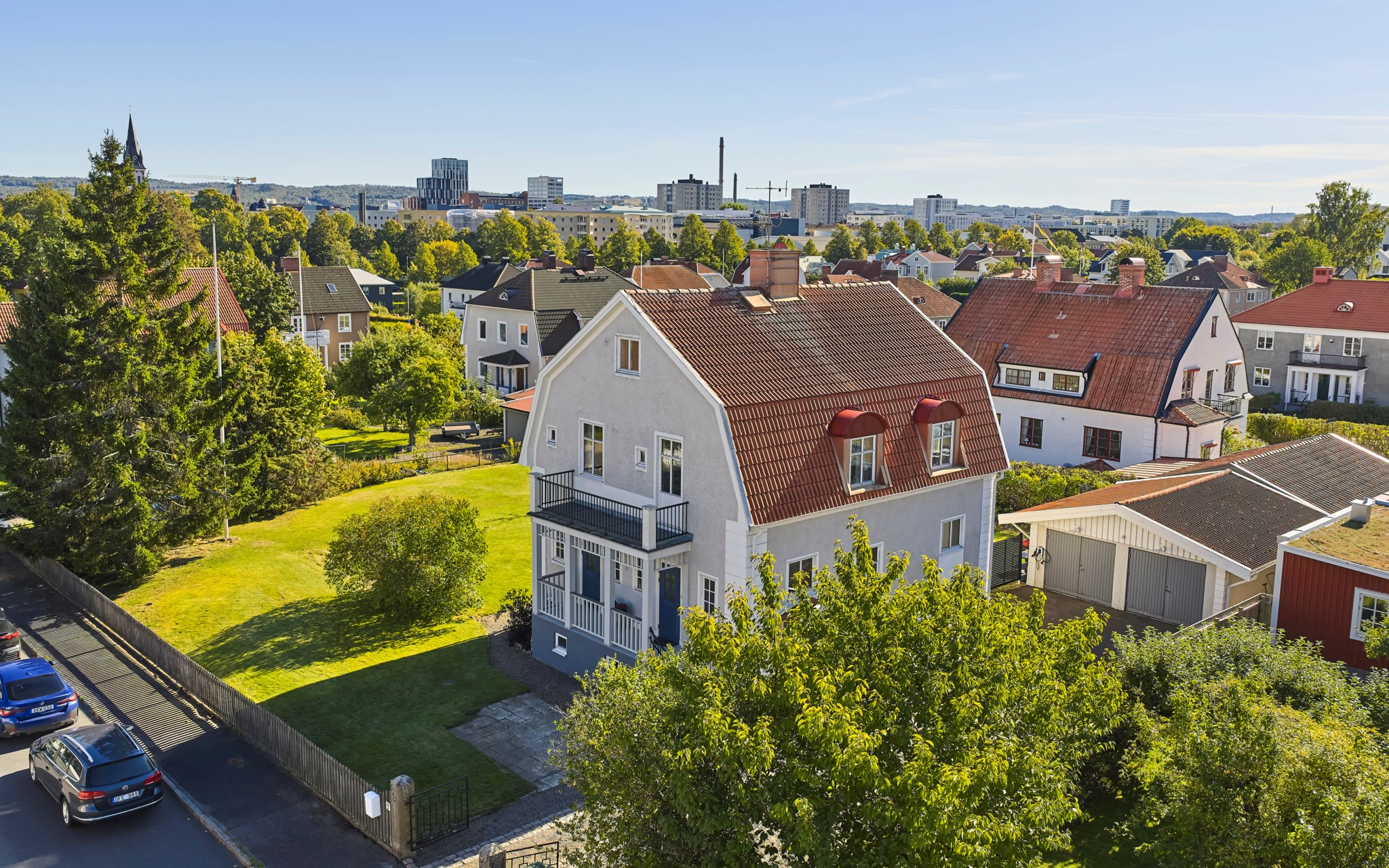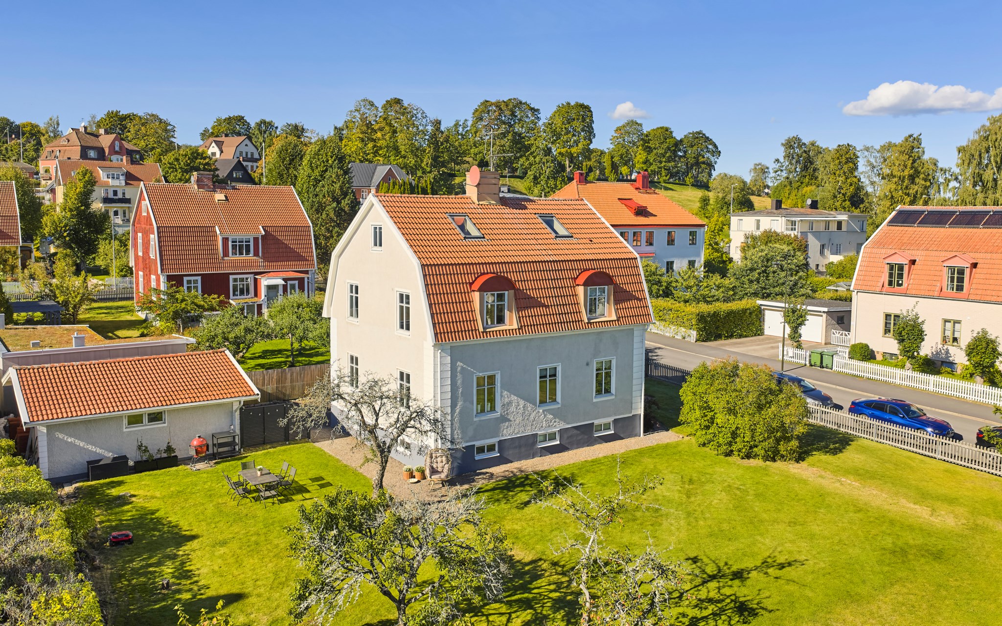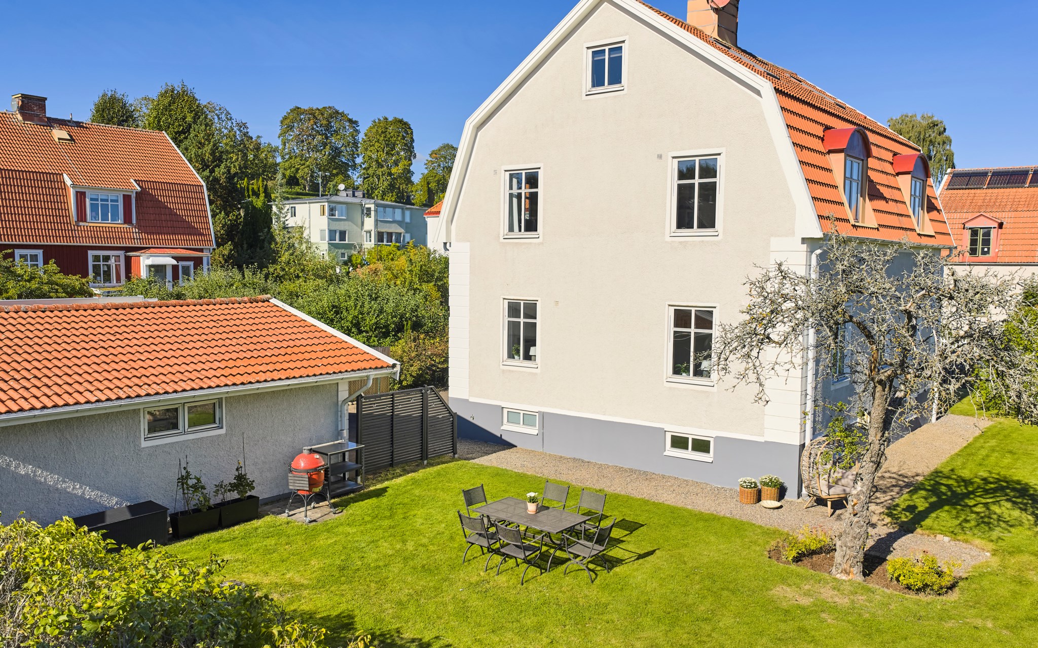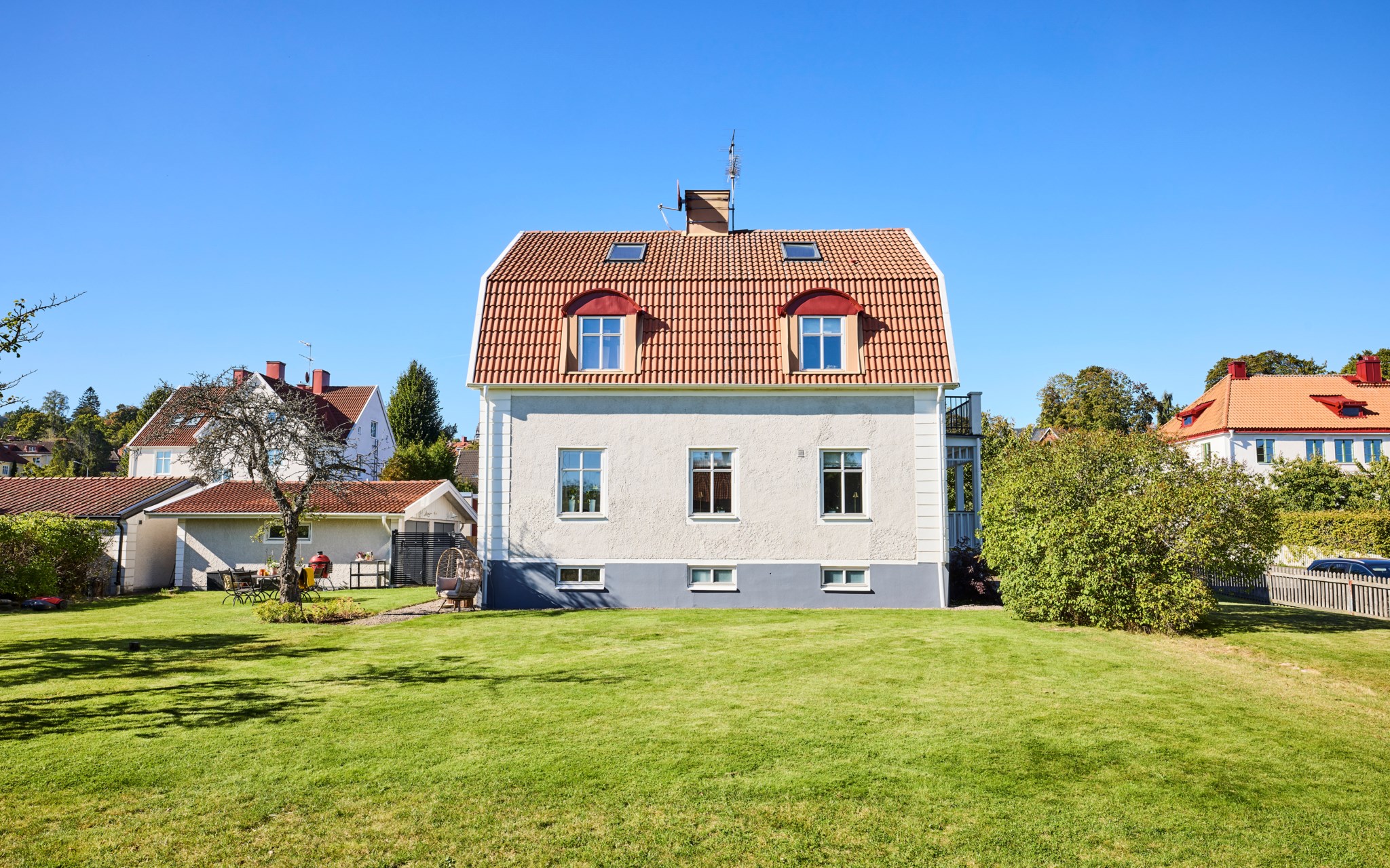 Det här är 20-tal när det är som mest vardagsvänligt. Putsad fasad i mjukt grått, rött tegeltak och en fin balkong och portik som möter dig vid trappan. Inne är våningsplanen lagom stora vart för sig: socialt nere, lugnare uppe, extra rum på vinden och praktiska bonusytor i källaren. Ett både mysigt och stort hus som känns lätt att leva i. Fint, eller hur?