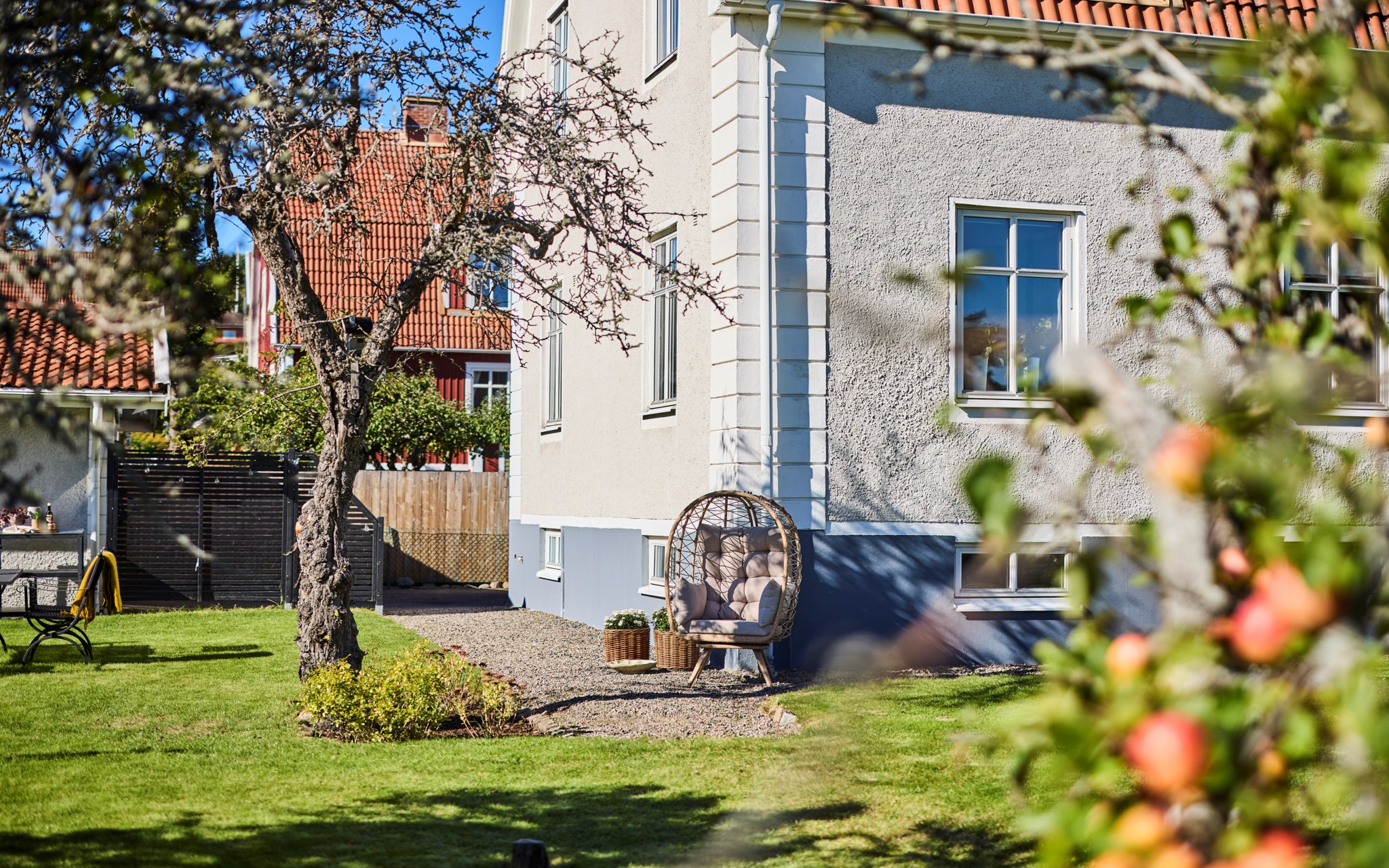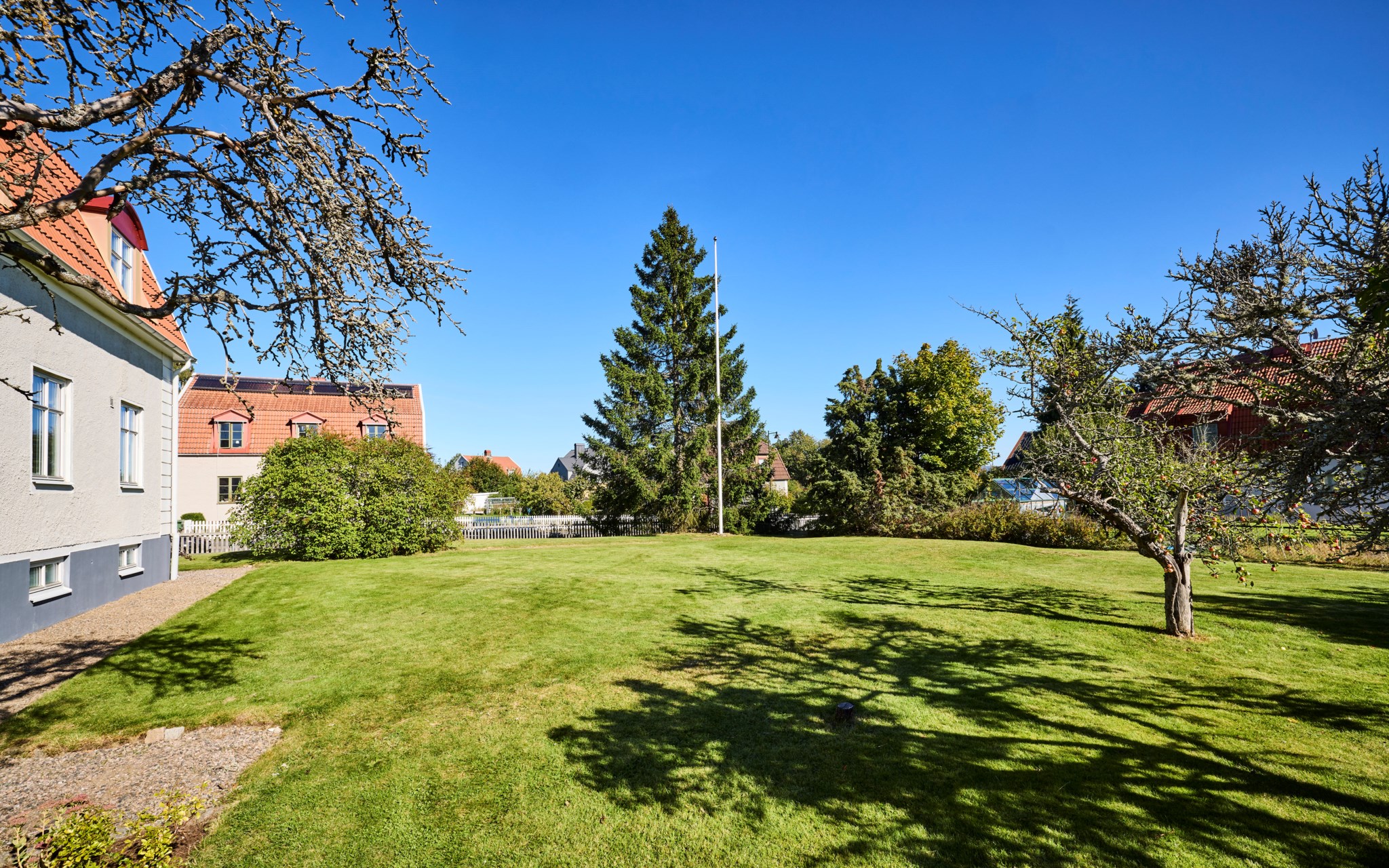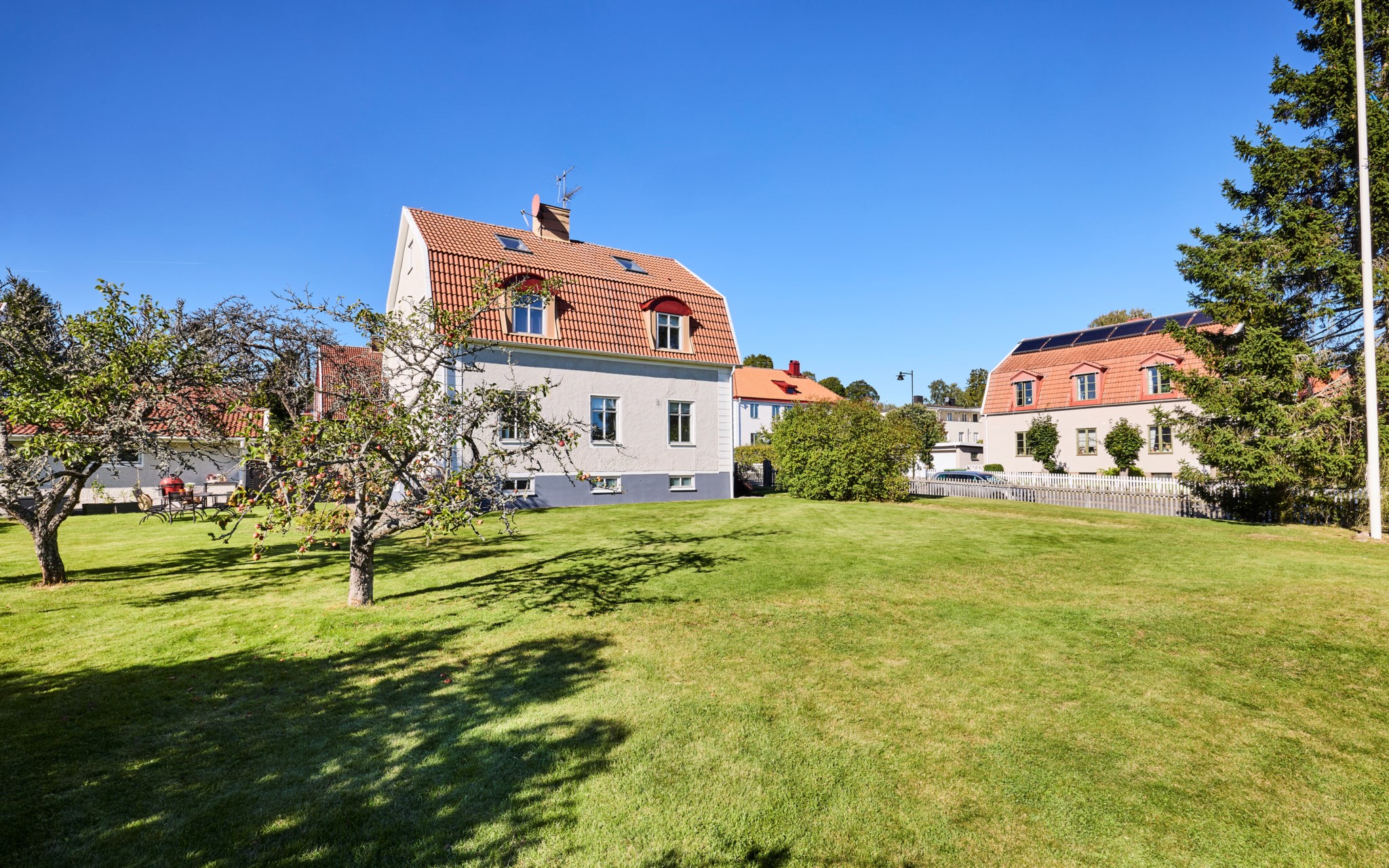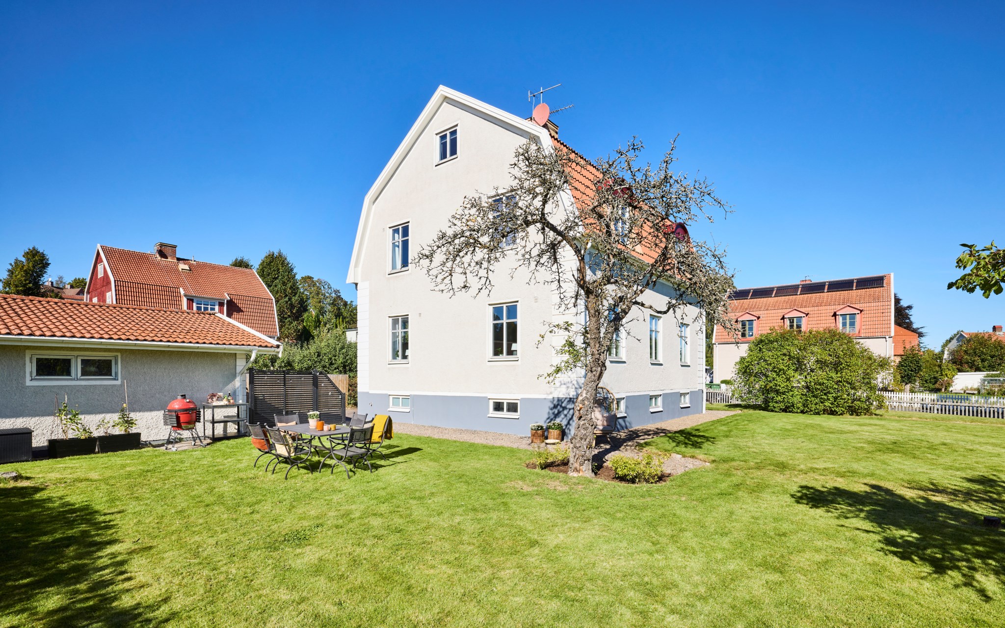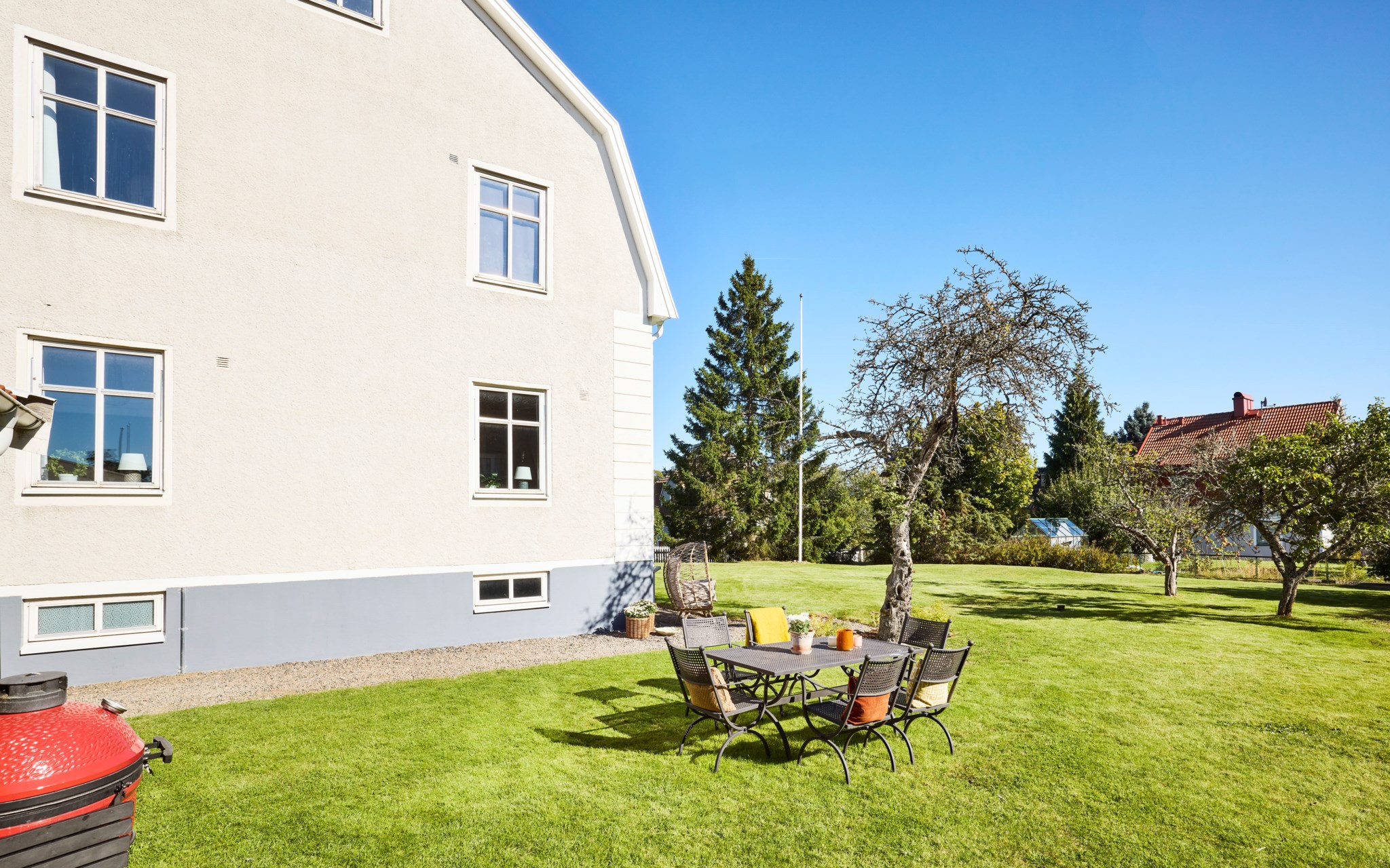 Den stora tomten är plan och ramar in huset med uppvuxen grönska och äldre fruktträd. Gräsmattan bjuder in till lek, långbord och kubb. Ytan räcker till och med för både stor altan från kökssidan och pool om du vill, utan att något behöver väljas bort. Du har morgonsol vid entrén, och eftermiddags- och lång kvällssol på baksidan. Placera sittgrupper där du trivs allra bäst. Tomten är lättskött som den är och full av möjligheter framåt.