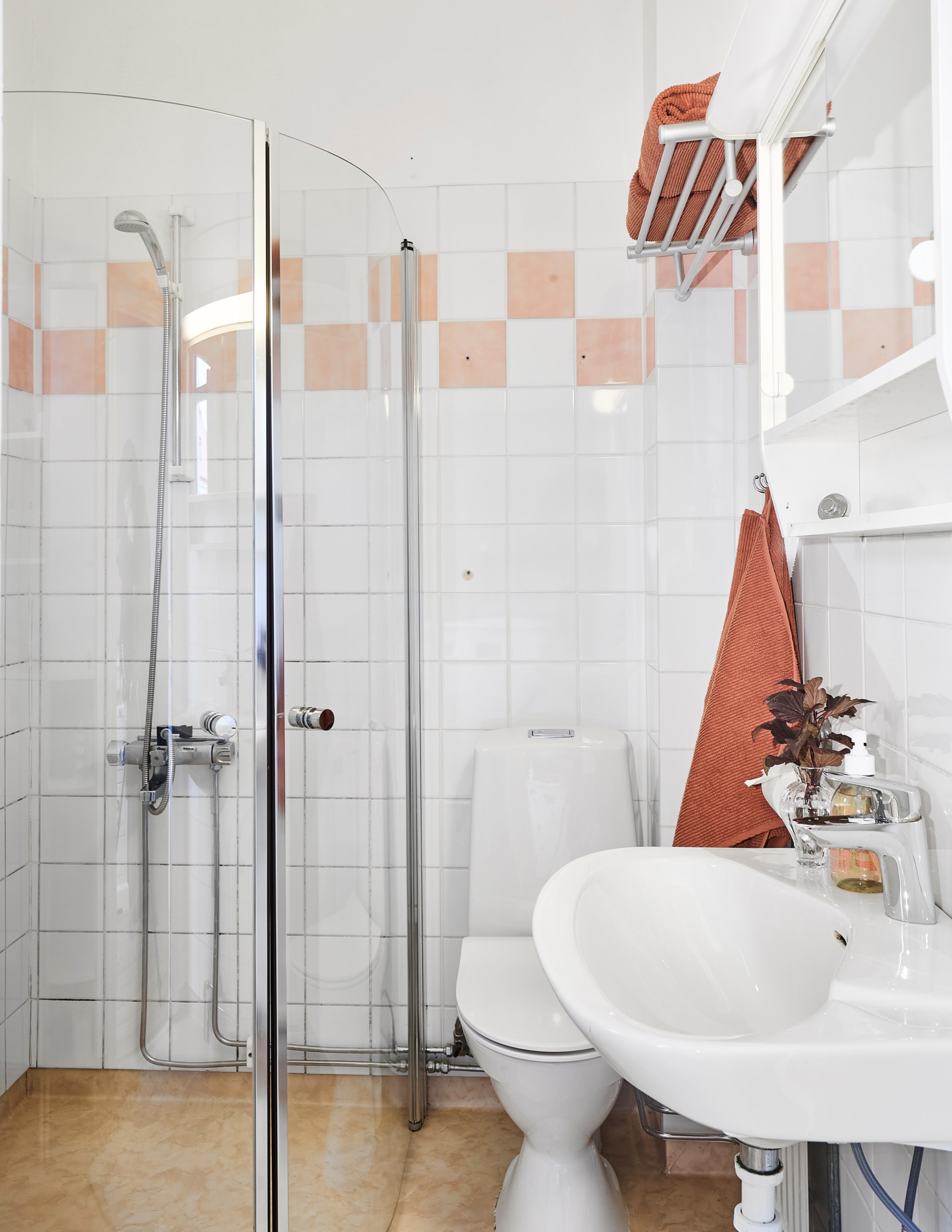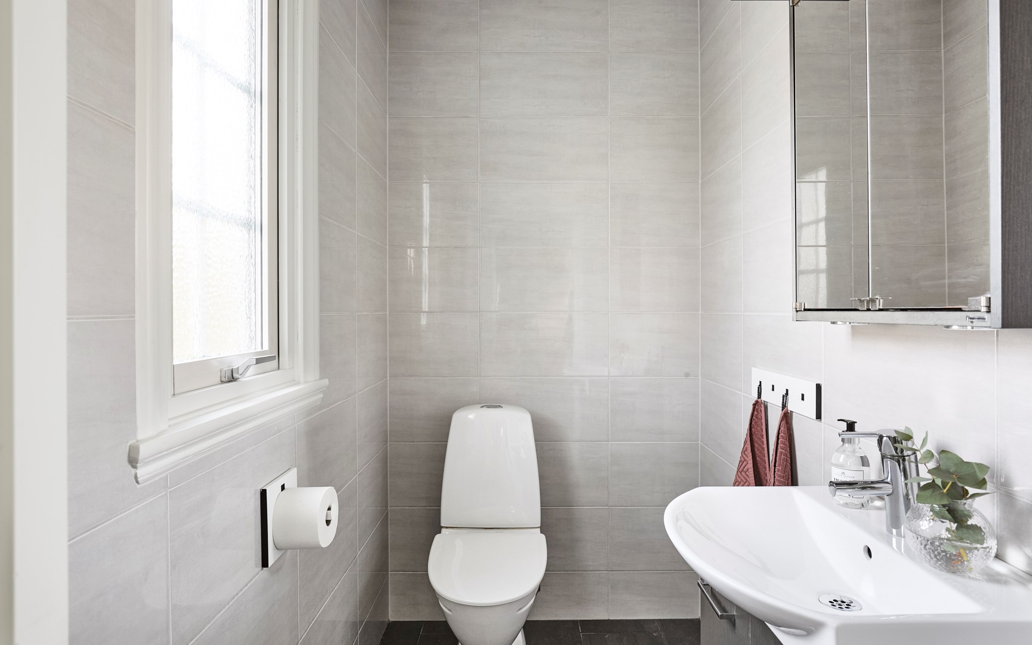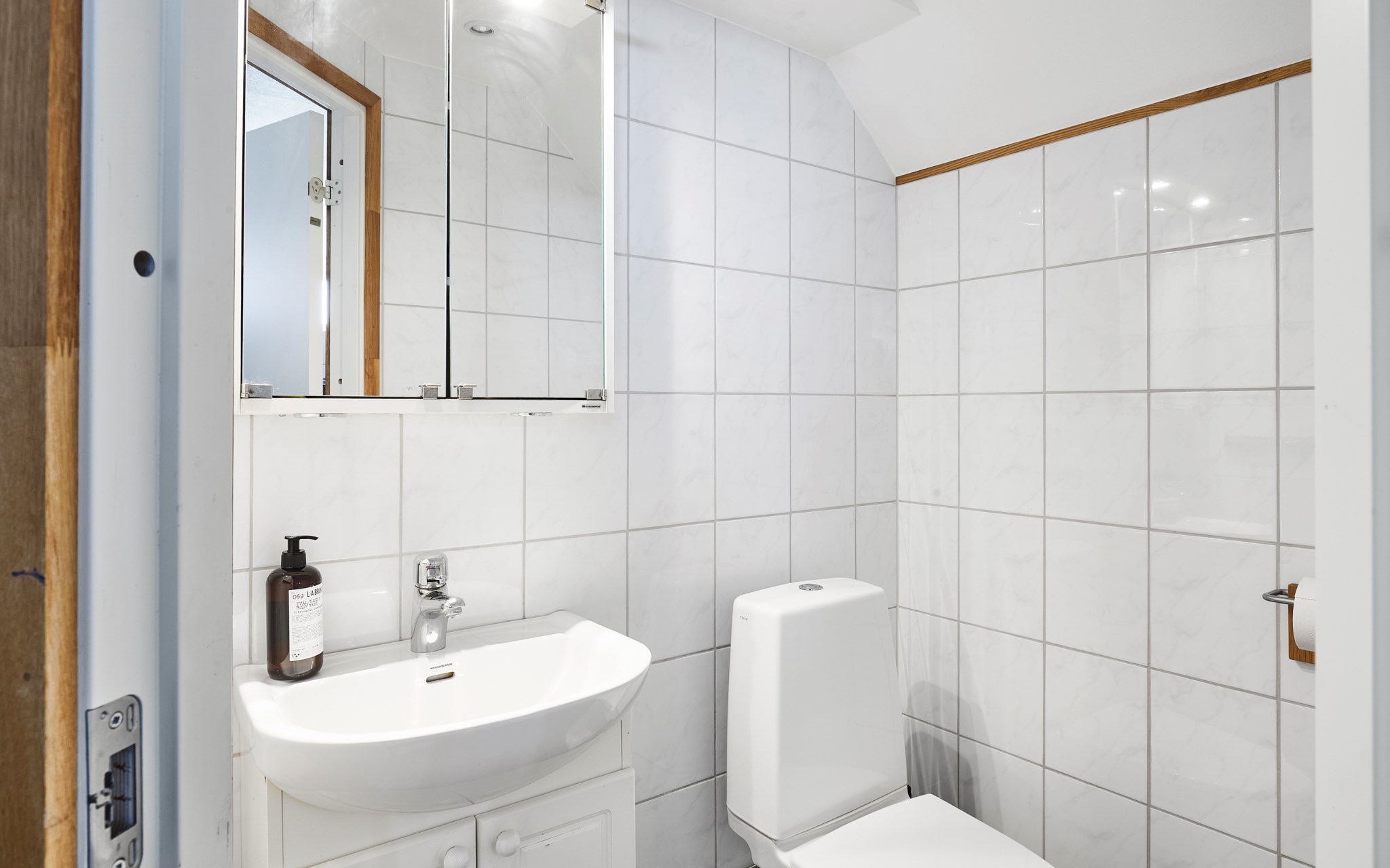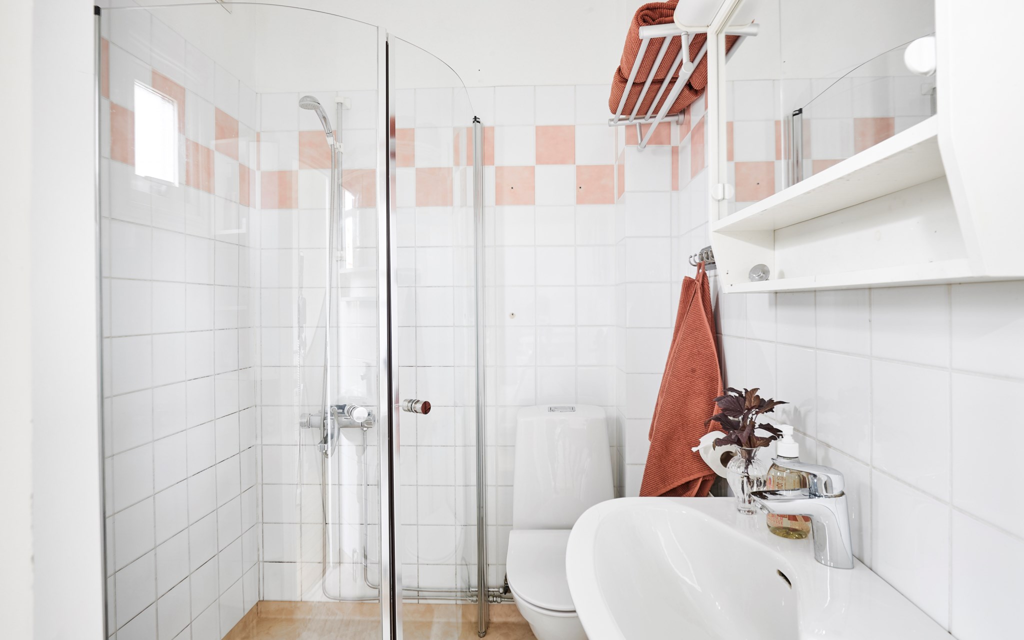 På andravåningen finns ett praktiskt duschrum med allt du behöver nära till hands: duschhörna med dörrar, wc och vägghängt tvättställ. Väggarna är kaklade med en varm bård högre upp och på golvet ligger våtrumsmatta – lätt att hålla efter i vardagen. Det lilla fönstret ger fint ljus och tänker du smart kan du få in en hel del förvaring. Ett badrum som funkar för familjelivet – och en tydlig bas om du vill sätta din egen stil framöver.