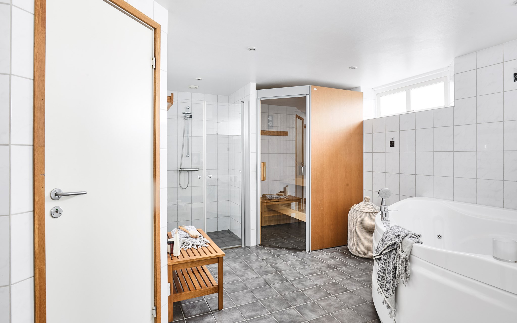 I källarens relax gör du kväll av dagen på bästa vis. Dimra ner, tänd några ljus, värm upp bastun och spola spabadet fullt med exakt rätt vattentemp enligt dina preferenser. Duschhörnan och avskild wc gör rummet komplett – enkelt efter löpturen eller när barnen kommer hem från träningen. Ett utrymme som redan känns fräscht och redo att användas från dag ett. Vattenburen golvvärme i hela denna avdelning.