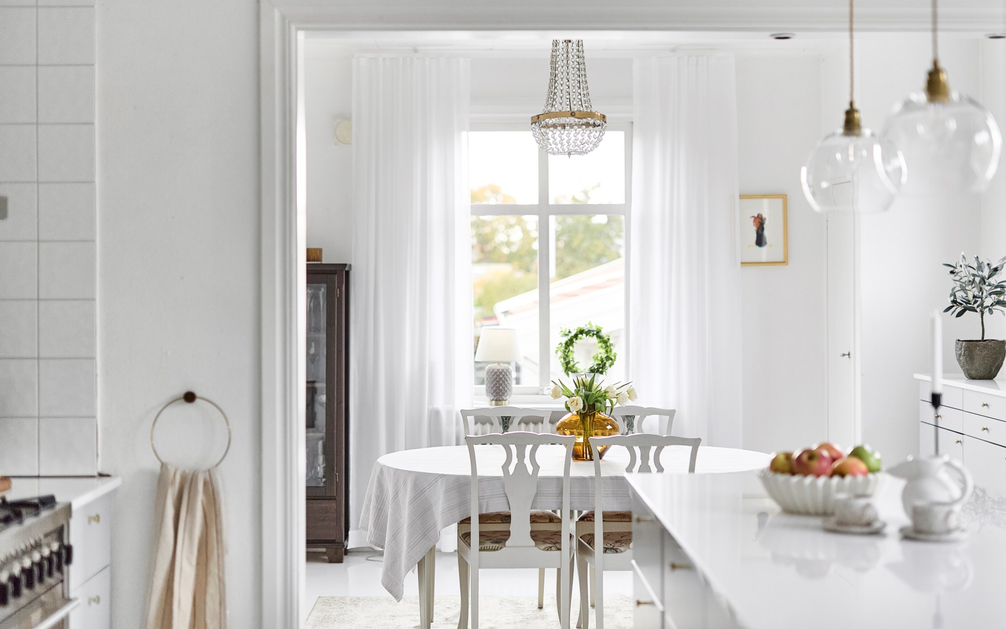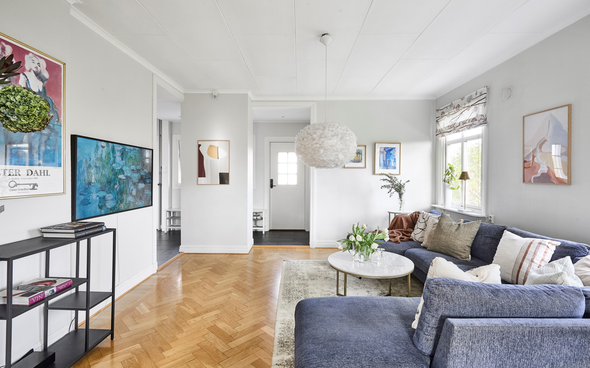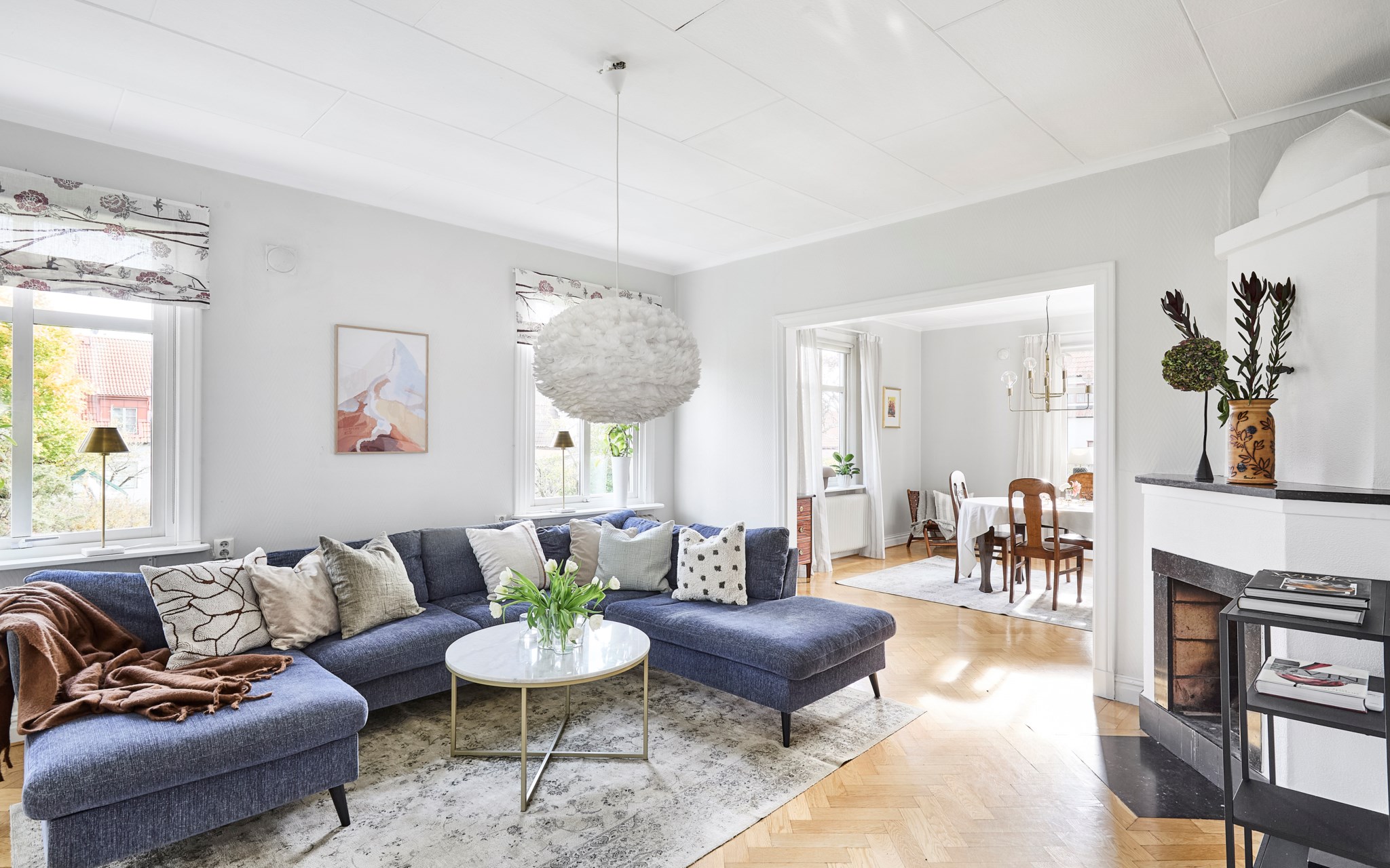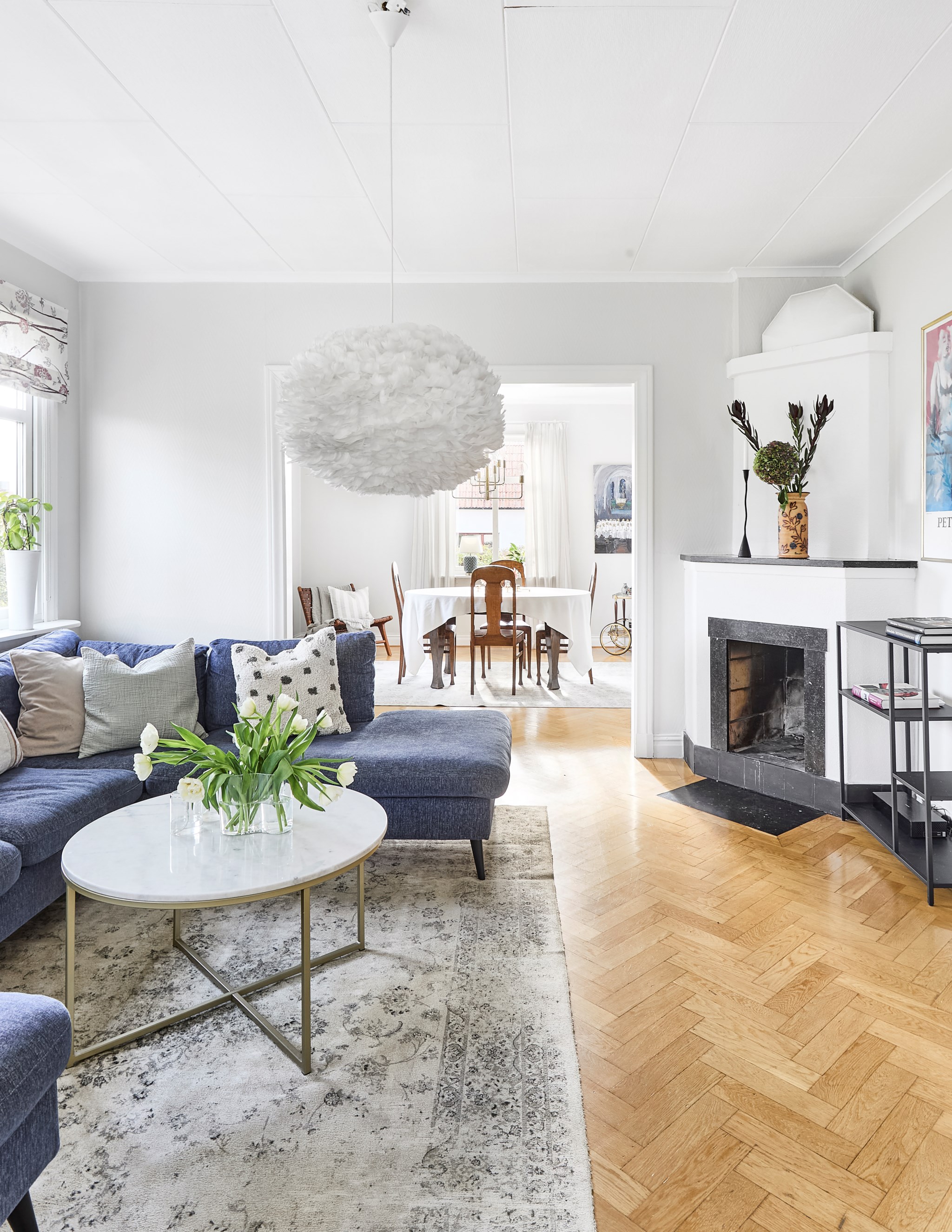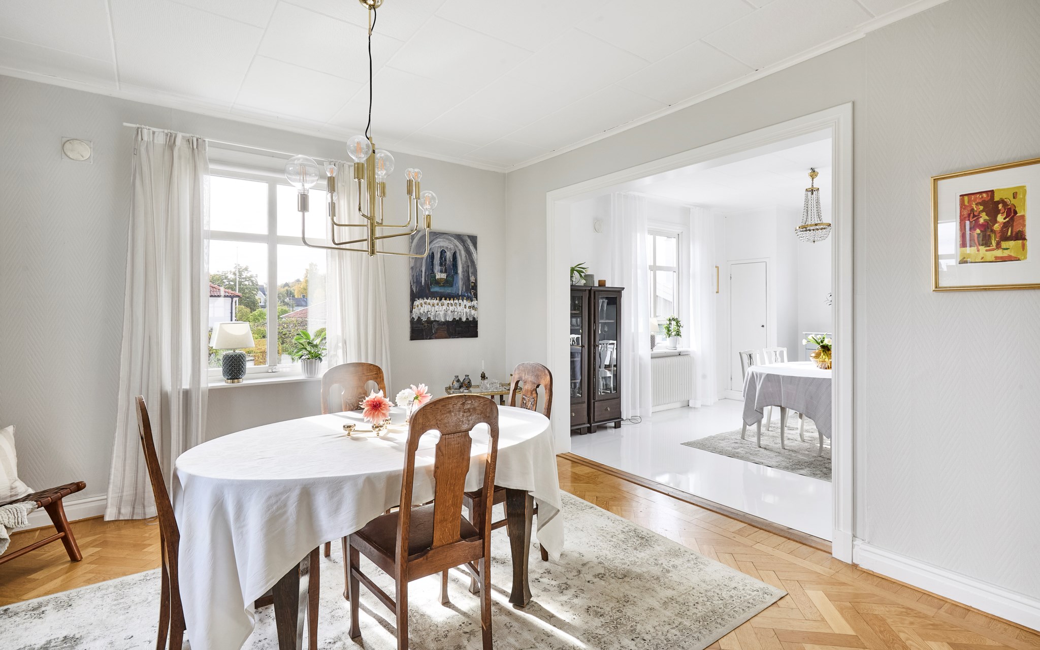 Vardagsrum och matsal ligger i fil med generös öppning emellan, vilket gör att ljuset hittar hela vägen runt. Fiskbensparketten knäpper mjukt under fötterna och i ett hörn väntar den fungerande öppna spisen när kvällen kommer. De två rummen är lika stora, så låt soffhörnan flytta runt tills ni hittat den perfekta placeringen för era kvällar. Från det bortre rummet har du nära kontakt med matplatsen i nästa rum, medan köket ligger lugnt utom synhåll. Möblera efter livet: dubbla vardagsrum, eller som idag med matsalsbord i rummet intill.