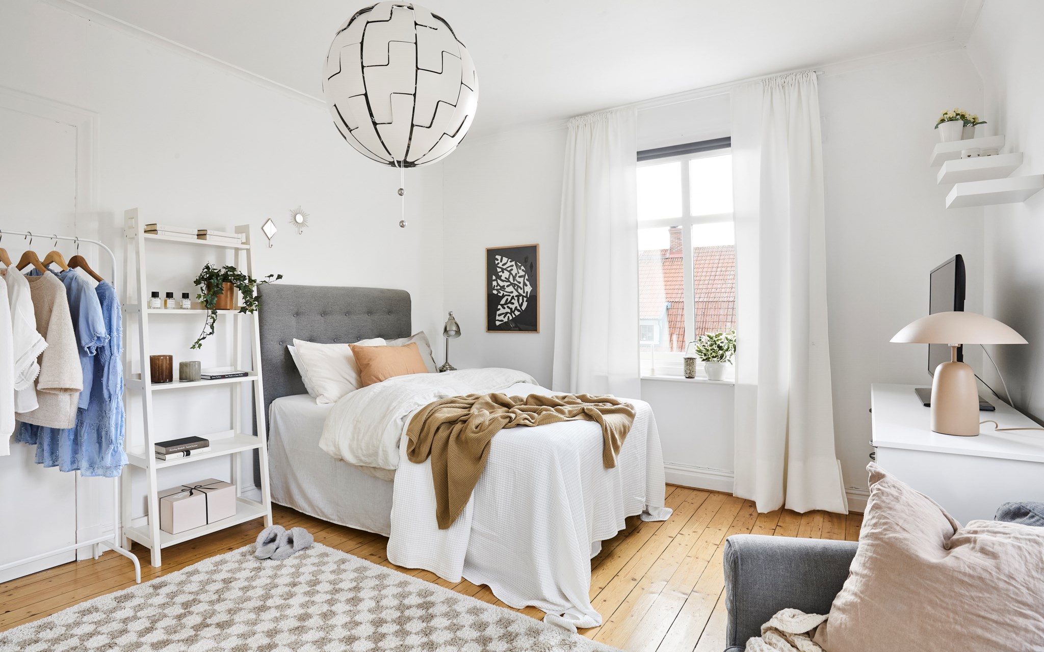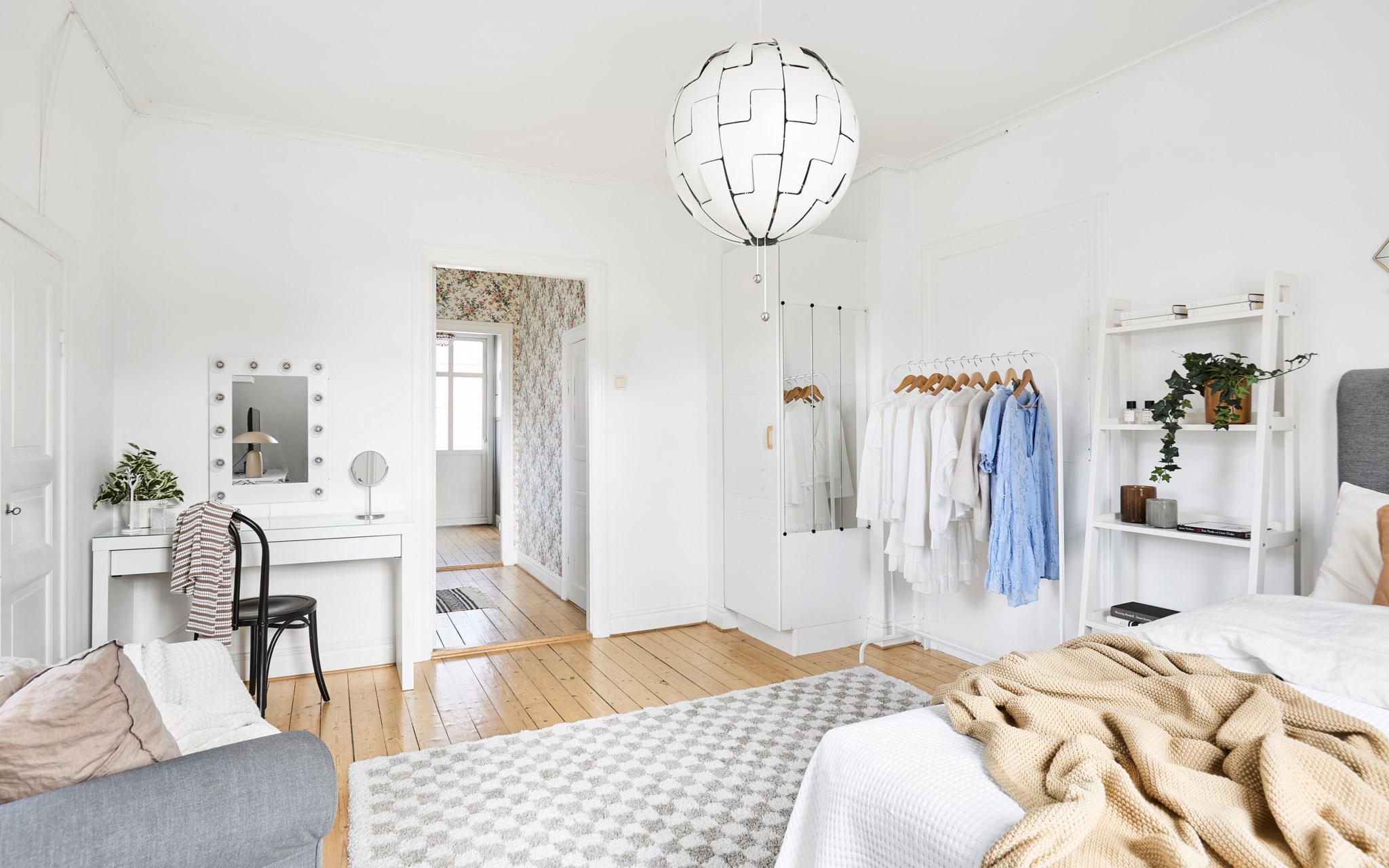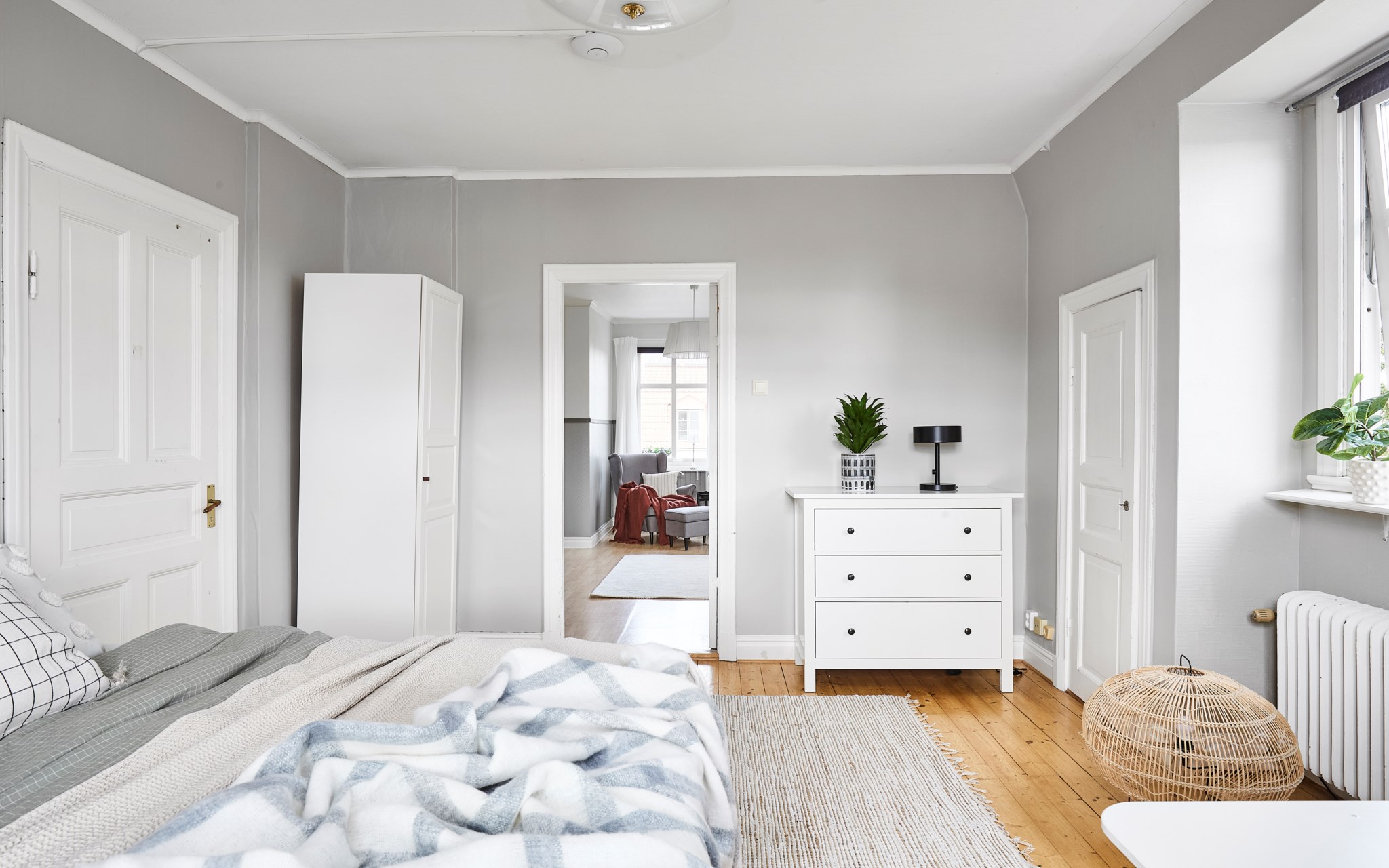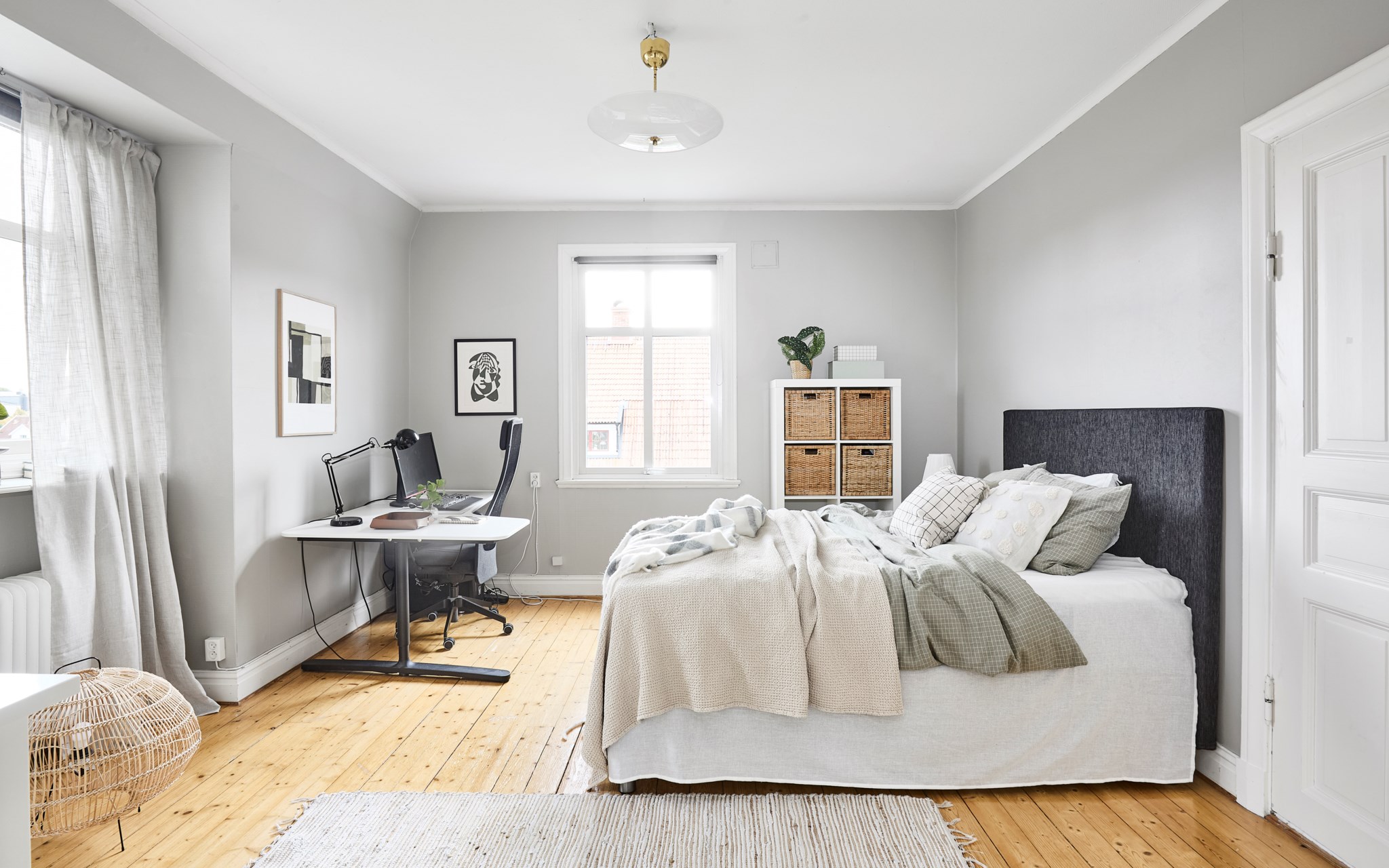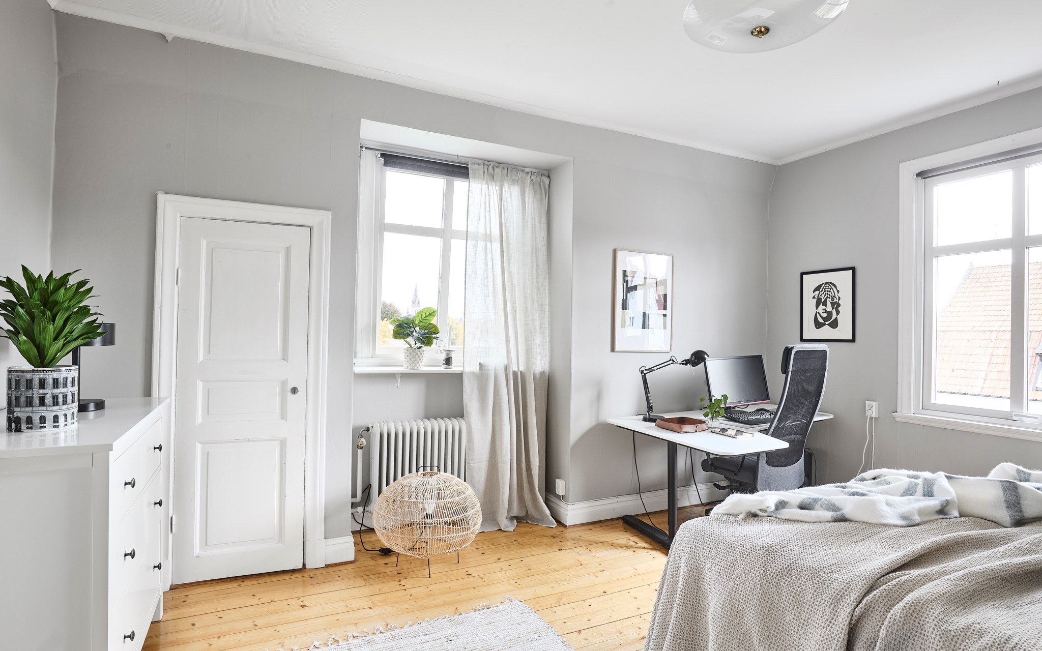 Två stora sovrum ligger sida vid sida på våning två, samma lugna känsla men med varsin personlighet. Det ena rummet har fönster i vinkel och gott om plats för både säng, skrivbord och extra förvaring. Det andra är extra luftigt med djupa fönsternischer och utrymme för en liten sittdel, nästan som en minisvit. Vill ni öppna upp emellan och göra en svit i fil? Möjligheten finns. Föräldrar här och barn där – eller tvärtom. Låt behoven få styra över tid.
