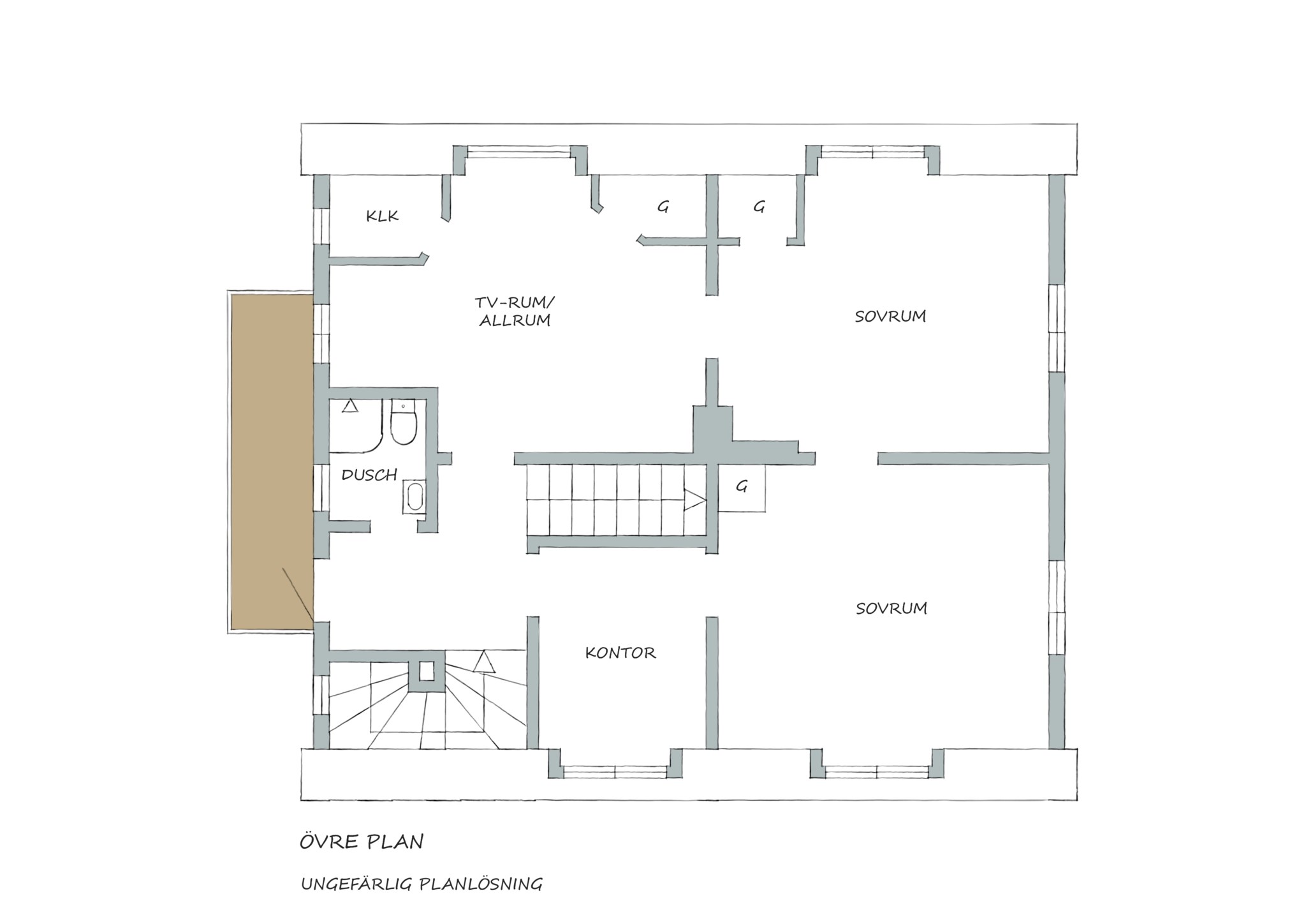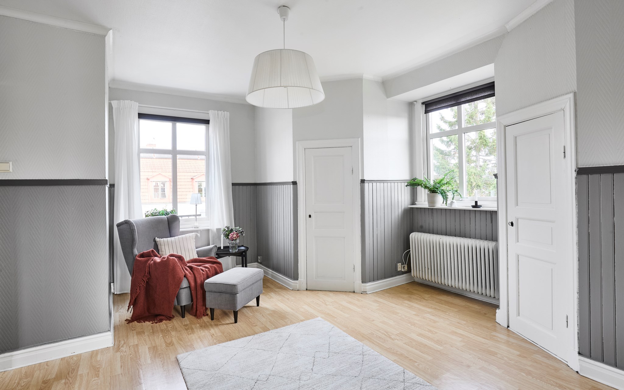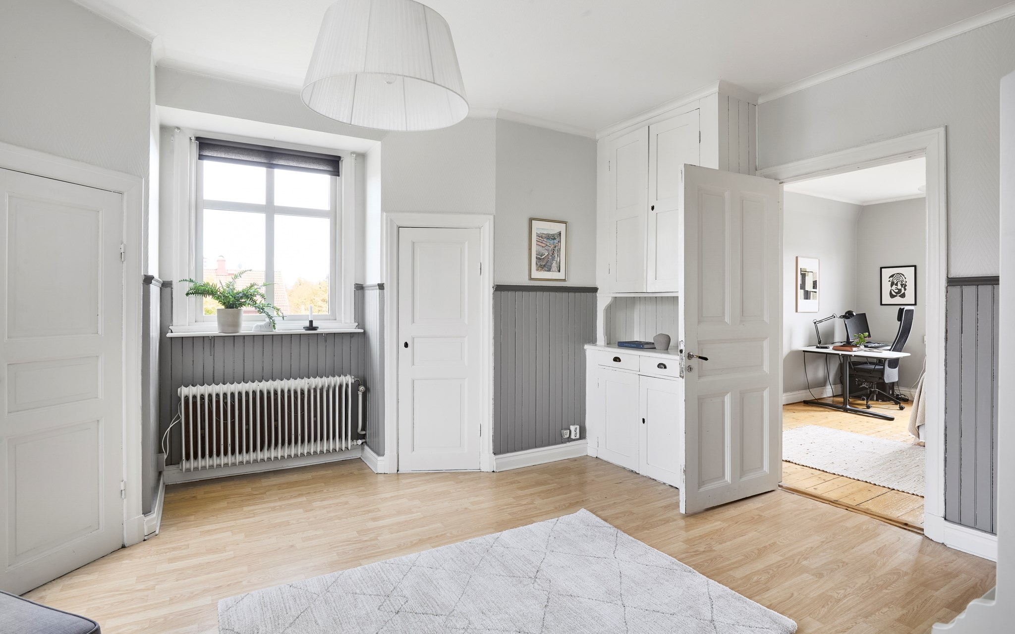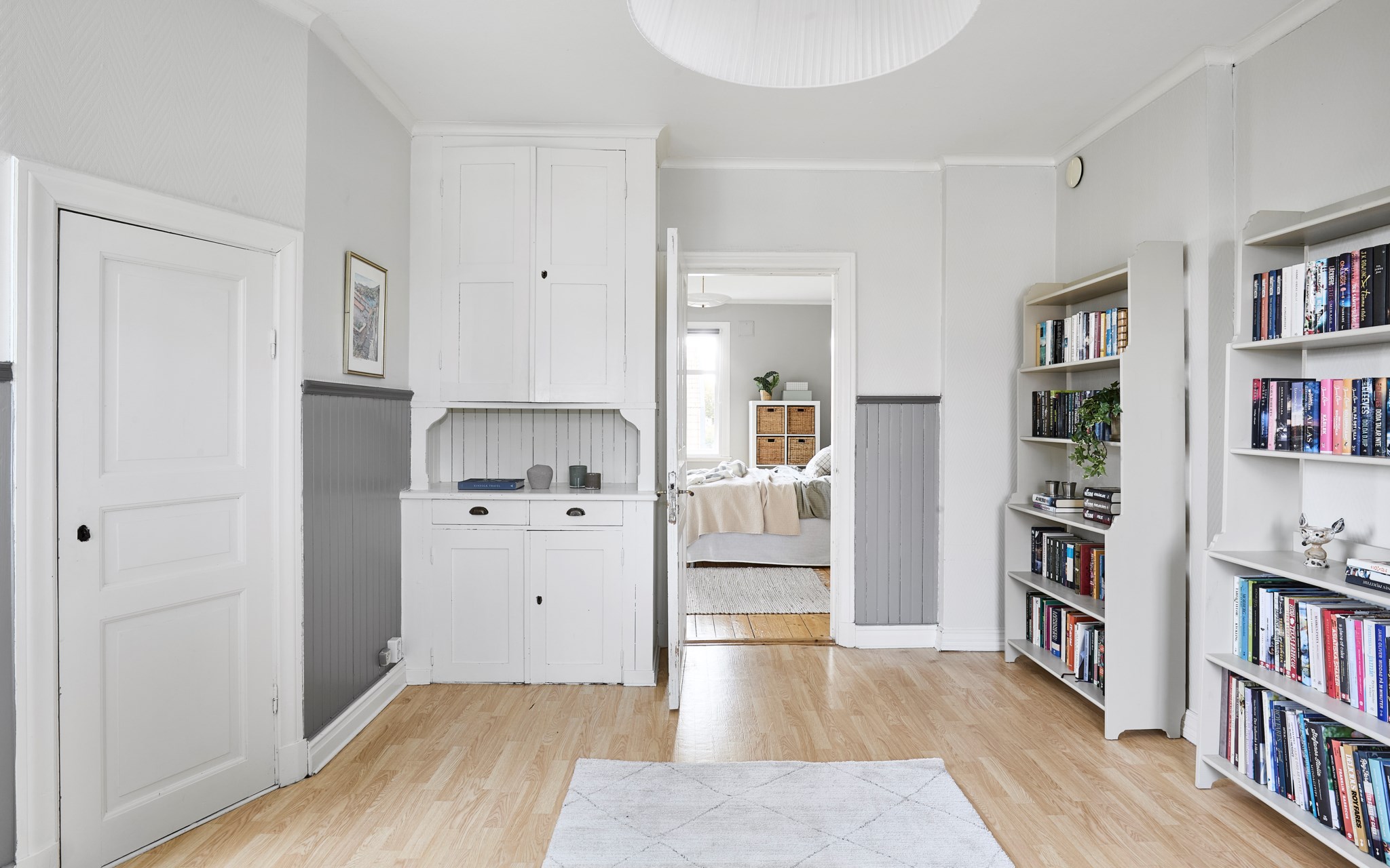 På andra våningen väntar ett ljust allrum med högre tak och pärlspont halvvägs upp på väggarna. Två inbyggda garderober och ett platsbyggt skåp gör rummet lätt att hålla i ordning, så soffan och bokhyllan får ta scenen. Tänk dig filmkvällar här uppe, läslampan i fönsternischen och dörren att stänga när resten av huset lever på. Det här rummet växlar gärna mellan tv-hörna, lekrum och arbetsro. Visst ser du möjligheterna?