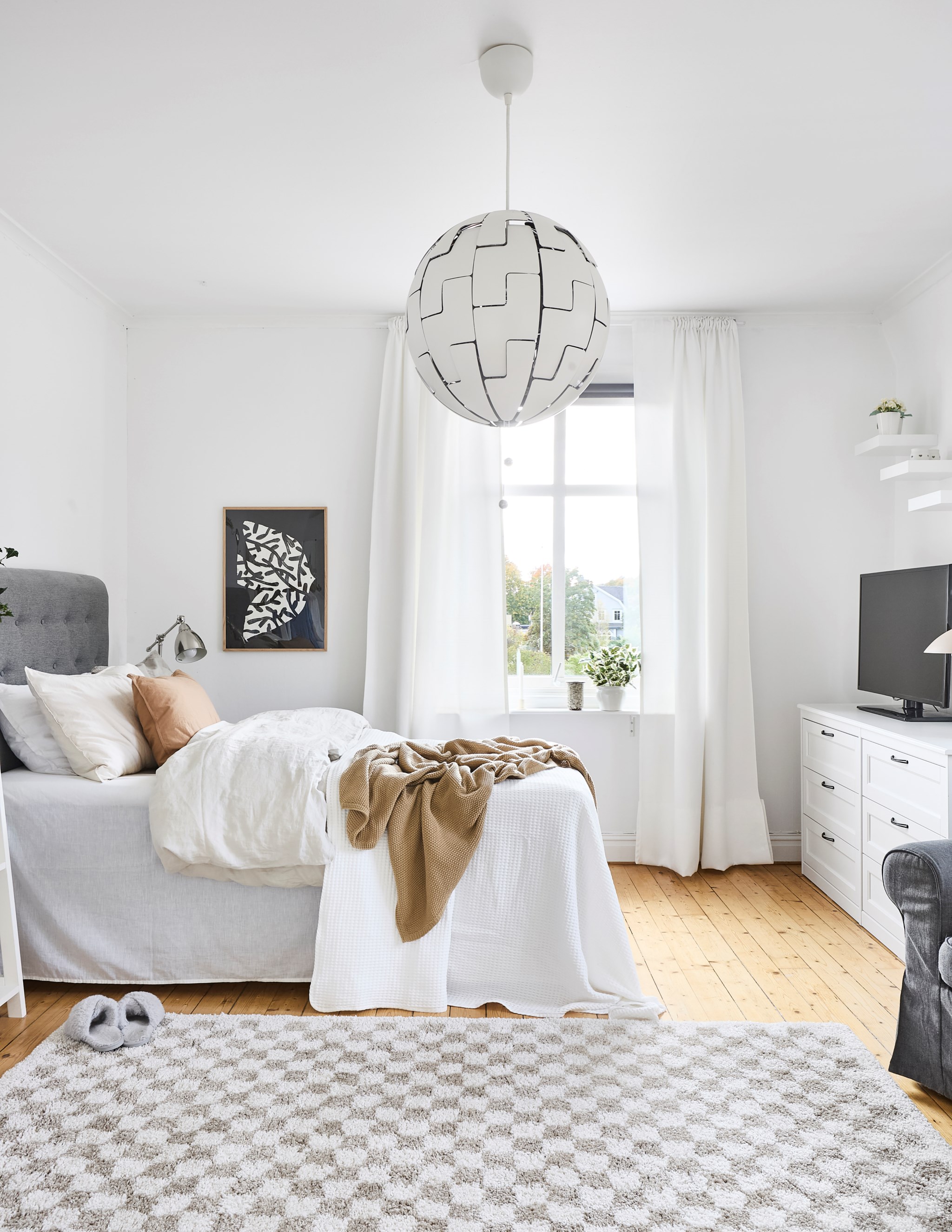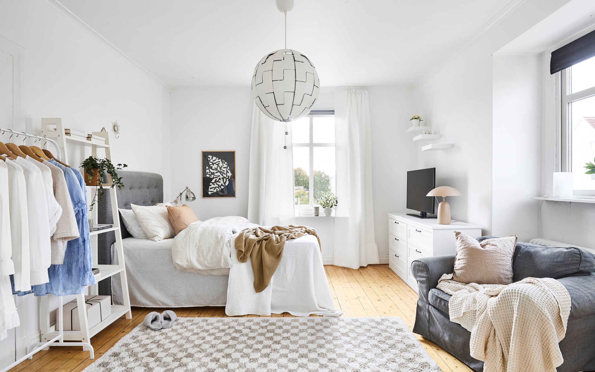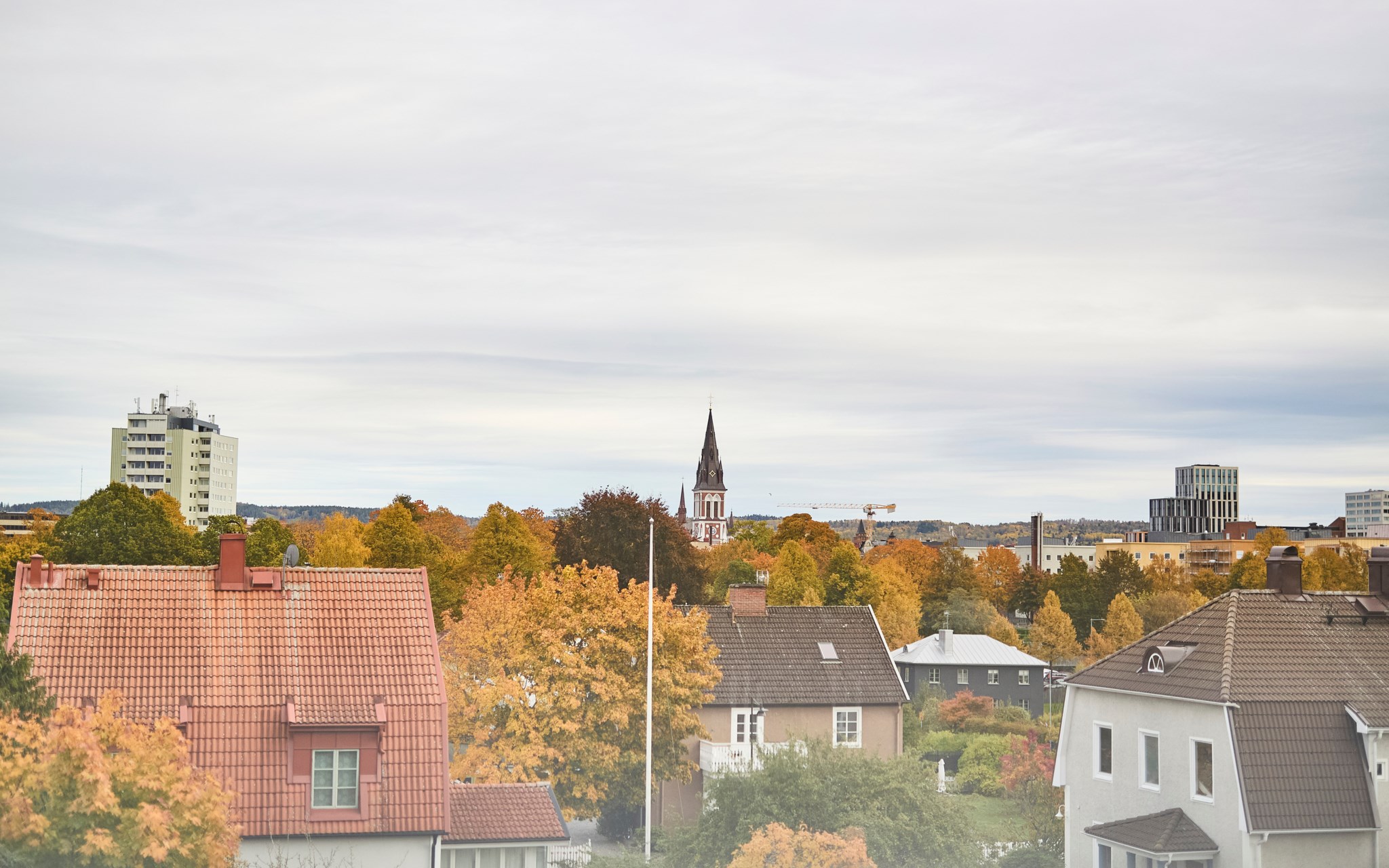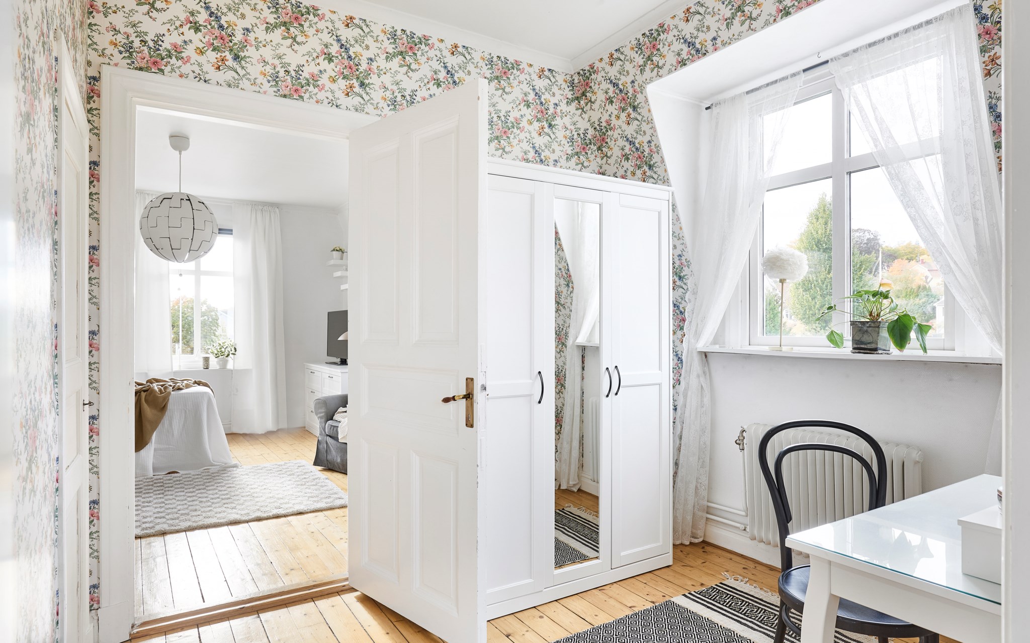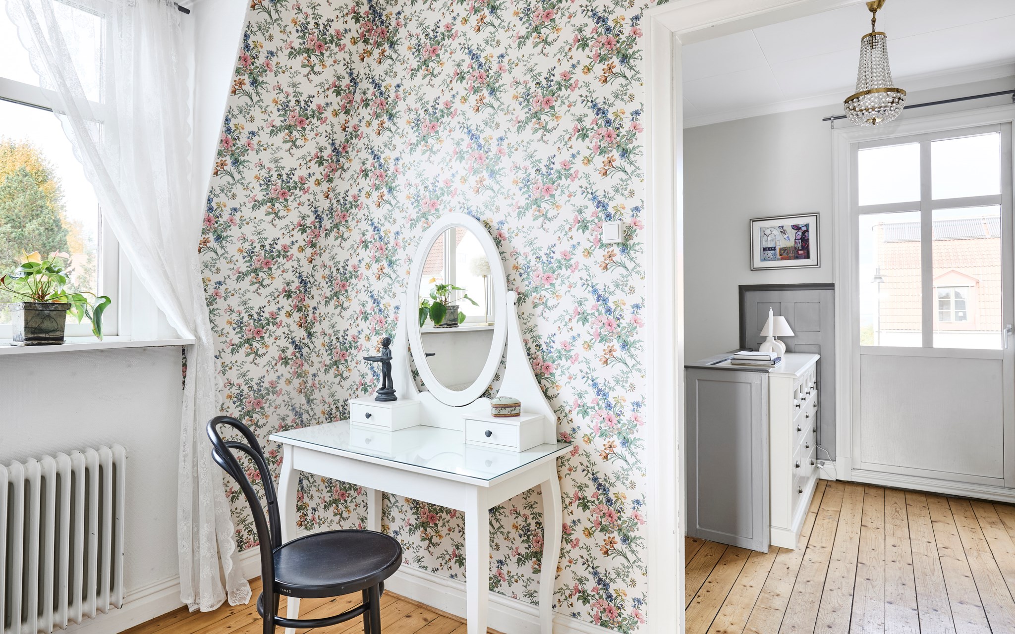 På andra våningen väntar ett ljust allrum med högre tak och pärlspont halvvägs upp på väggarna. Två inbyggda garderober och ett platsbyggt skåp gör rummet lätt att hålla i ordning, så soffan och bokhyllan får ta scenen. Tänk dig filmkvällar här uppe, läslampan i fönsternischen och dörren att stänga när resten av huset lever på. Det här rummet växlar gärna mellan tv-hörna, lekrum och arbetsro. Visst ser du möjligheterna?
