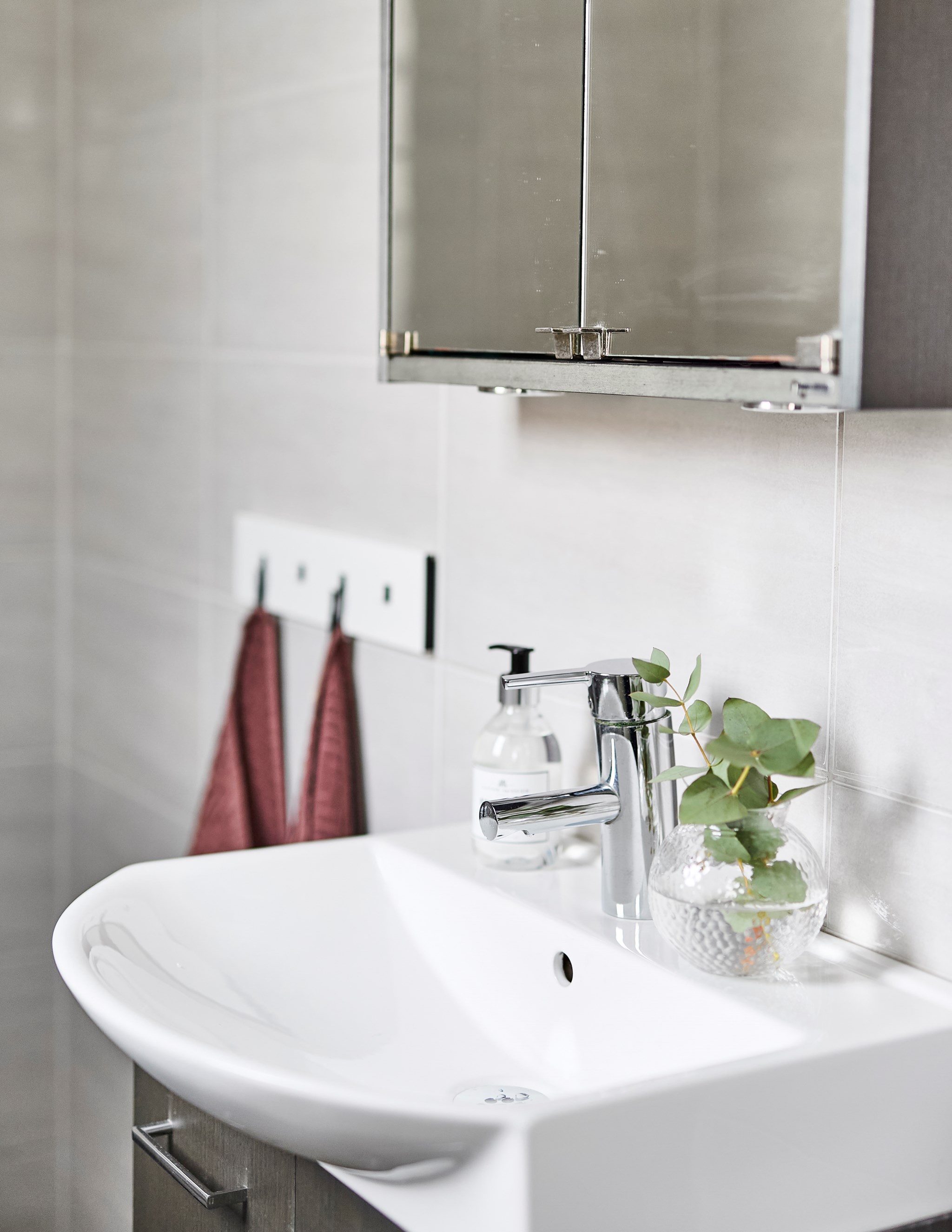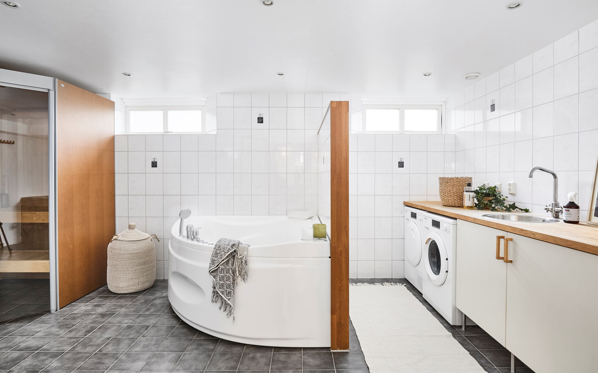 På andra sidan en halvvägg från relaxen ligger tvättstugan. Här jobbar maskinerna sida vid sida under en lång bänkskiva i trä med infälld ho – perfekt för vikning, fläckbehandling och allt det där vardagliga. Det högt placerade fönstret släpper in skönt dagsljus utan insyn och som en blinkning till husets historia står den gamla tvättgrytan kvar i hörnet. Mest som charm idag, men fin är den. Smutsiga träningskläder? Ner för trappan, i med en tvätt, klart.