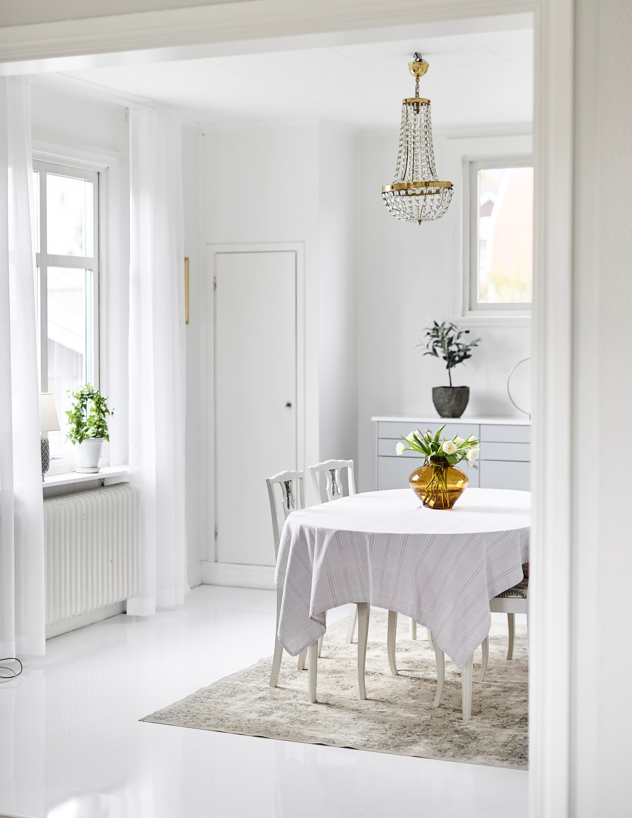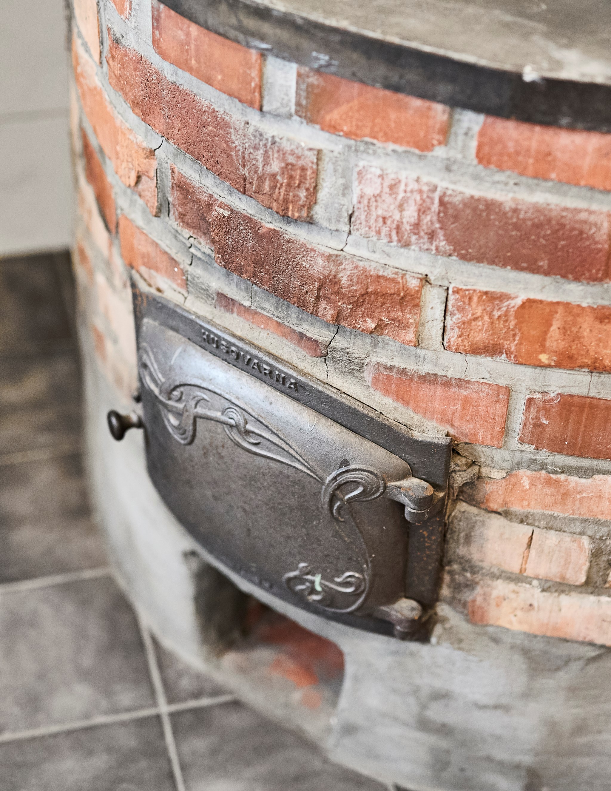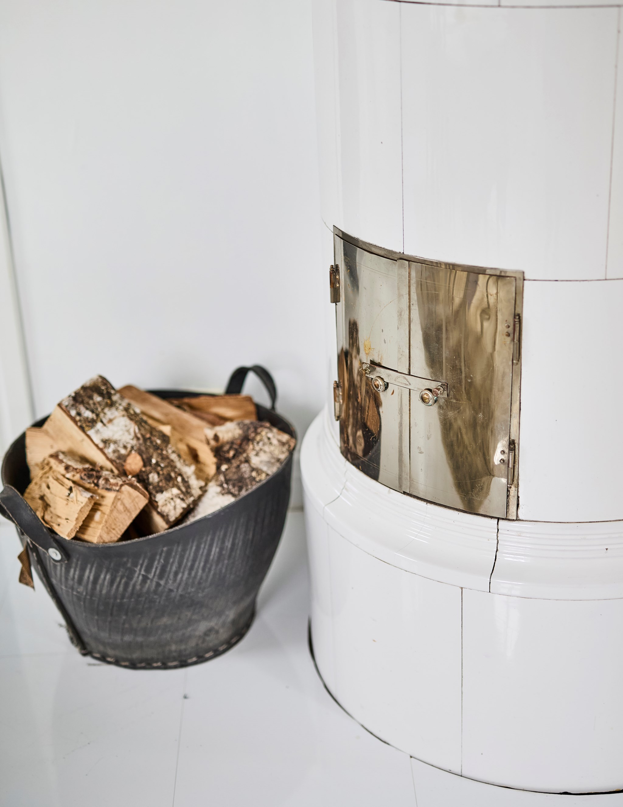 "Kakelugnen vid matrummet funkar fint att elda i, och under det vita golvet vi lade in 2017 finns det ett gammalt plankgolv kvar."