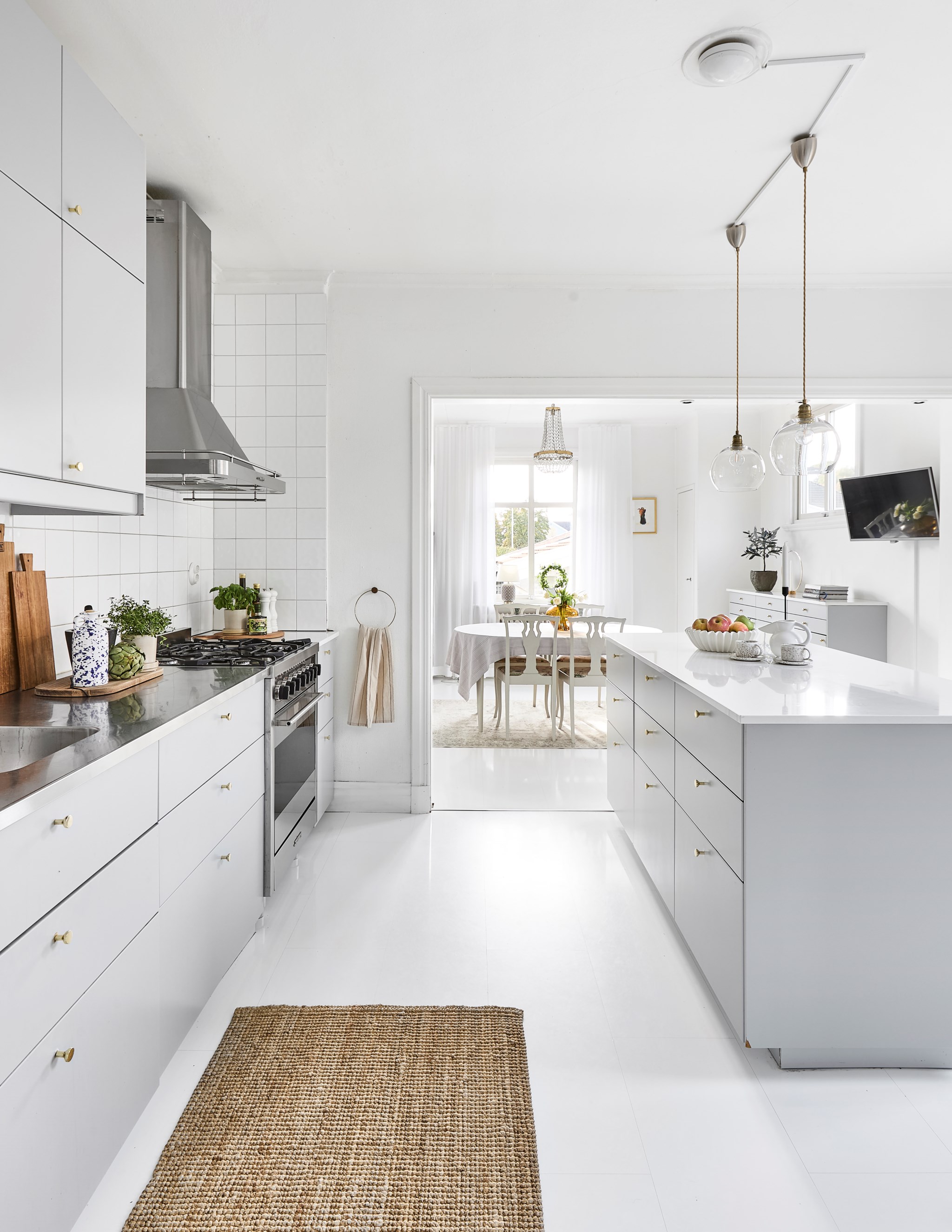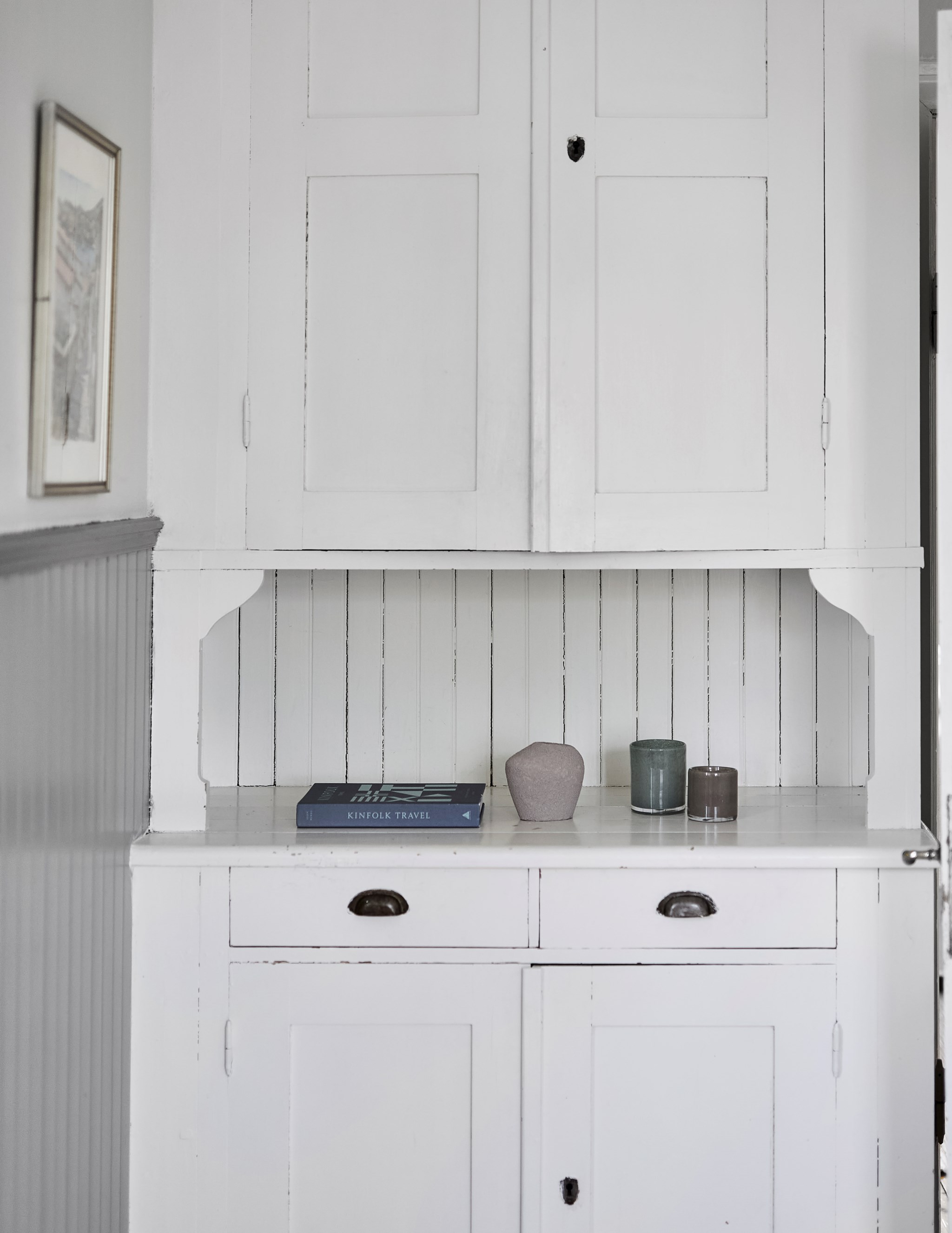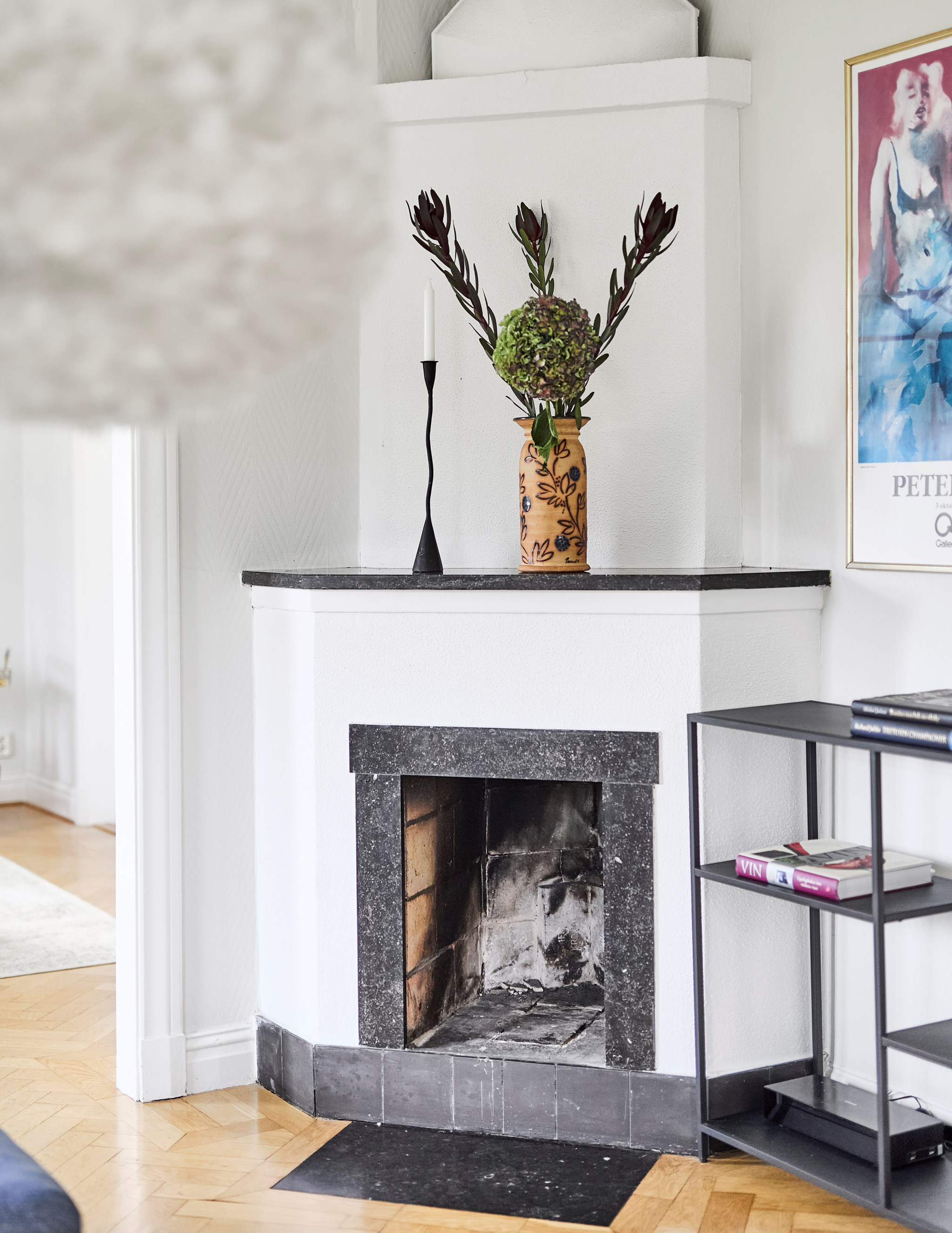 "Kakelugnen vid matrummet funkar fint att elda i, och under det vita golvet vi lade in 2017 finns det ett gammalt plankgolv kvar."
