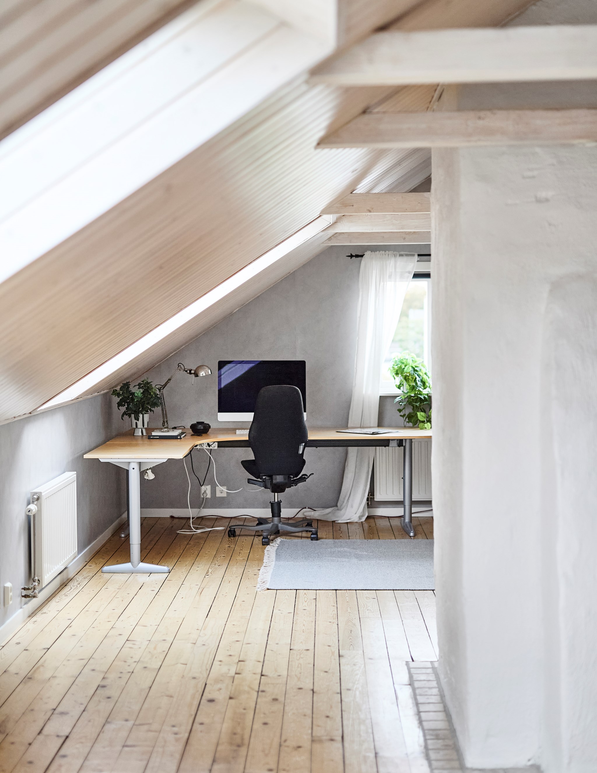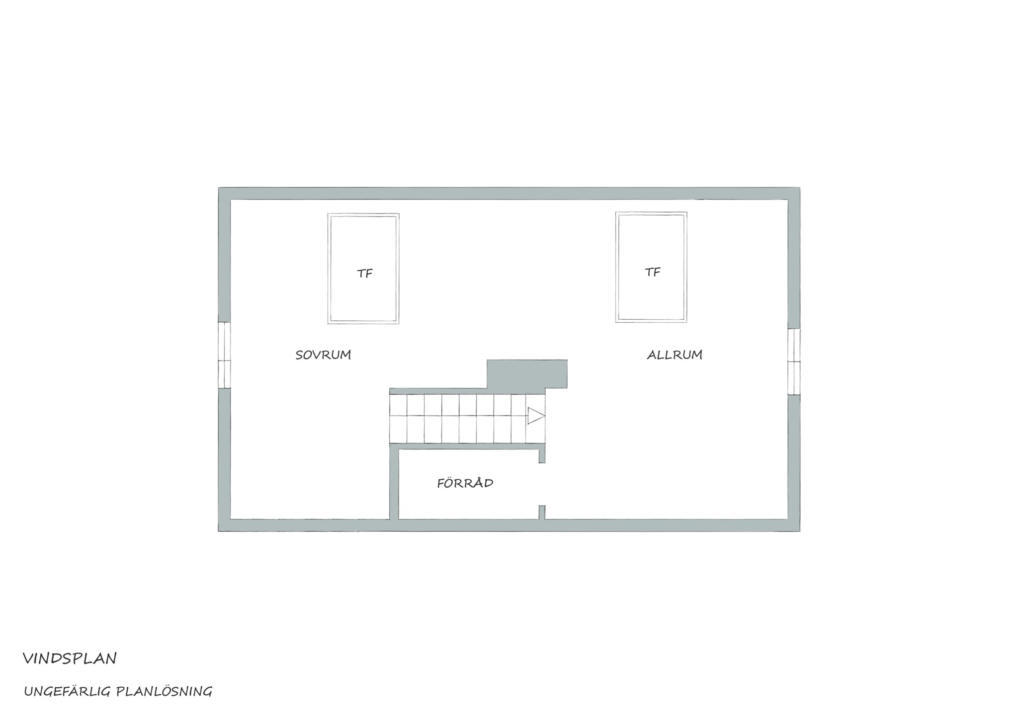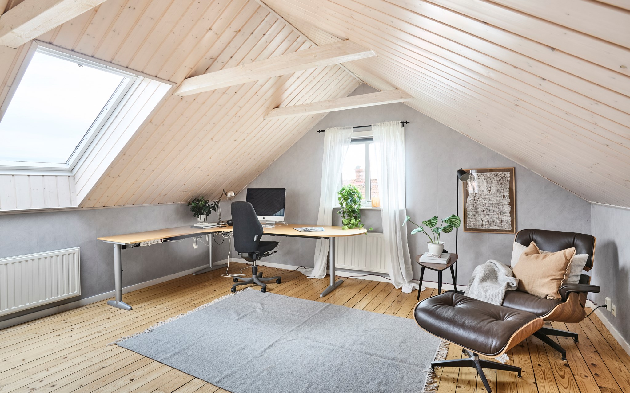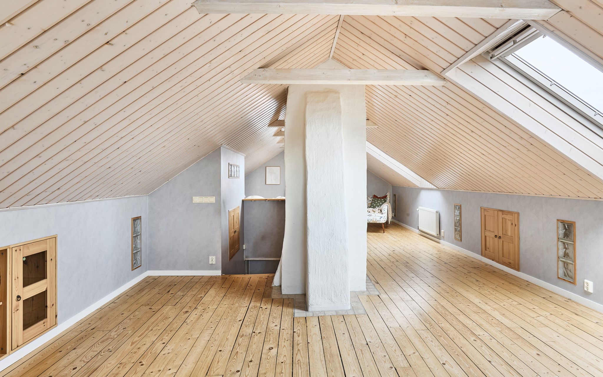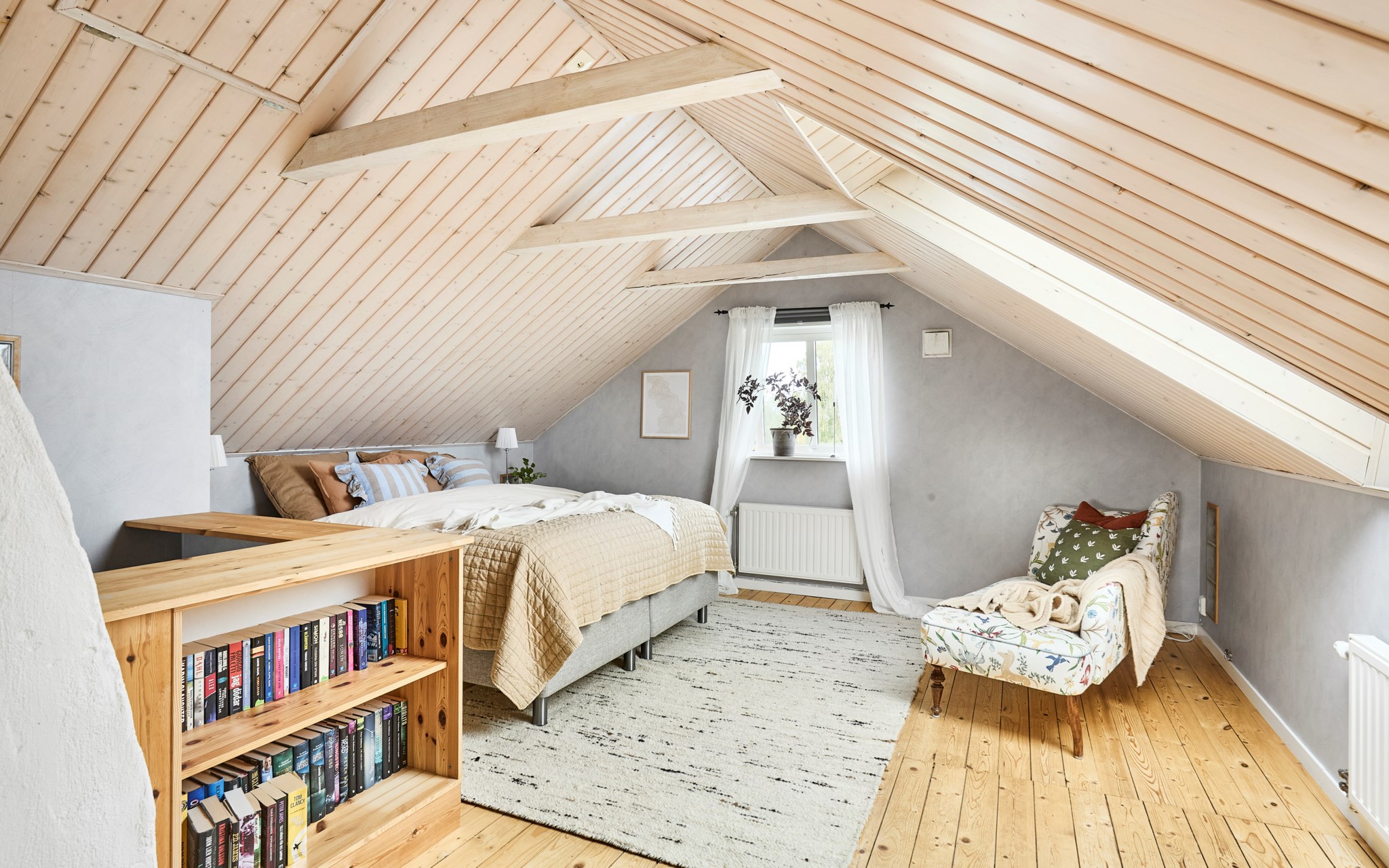 Egen våning med mysig trappa upp, och ett härligt långt rum under snedtak med synliga bjälkar. Vem vill bo här? Du får plats med både dubbelsäng, arbetsplats och en läshörna utan att behöva kompromissa. Takfönster och gavelfönster släpper in ljuset och murstocken i mitten ger fin karaktär. Runt trappöppningen finns en platsbyggd bokhylla och smarta små luckor för förvaring. Det är lätt att föreställa sig kvällsron här uppe, regn mot taket och en bok i fåtöljen. En flexibel våning för tonåring, gäster eller studio.