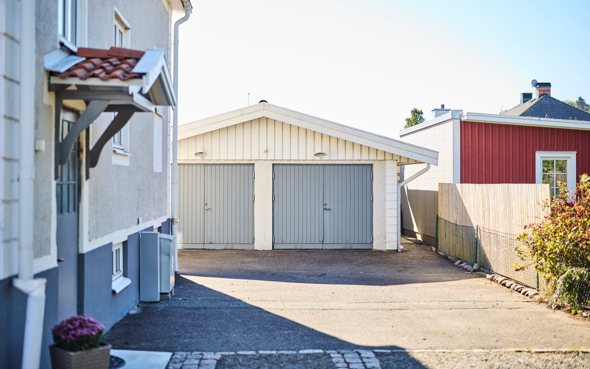 Längst in på tomten väntar ett rejält dubbelgarage, putsat och med rött tegeltak i samma stil som huset. Den långa, breda infarten med grus och kullersten gör det enkelt att parkera flera bilar utan trix. Inne finns bra arbetsbänk, el och gott om plats för däck, cyklar och hyllor. Här rullar vardagen smidigt, oavsett om du mekar lite eller bara vill lasta in i bilen torrskodd när regnet öser ner.