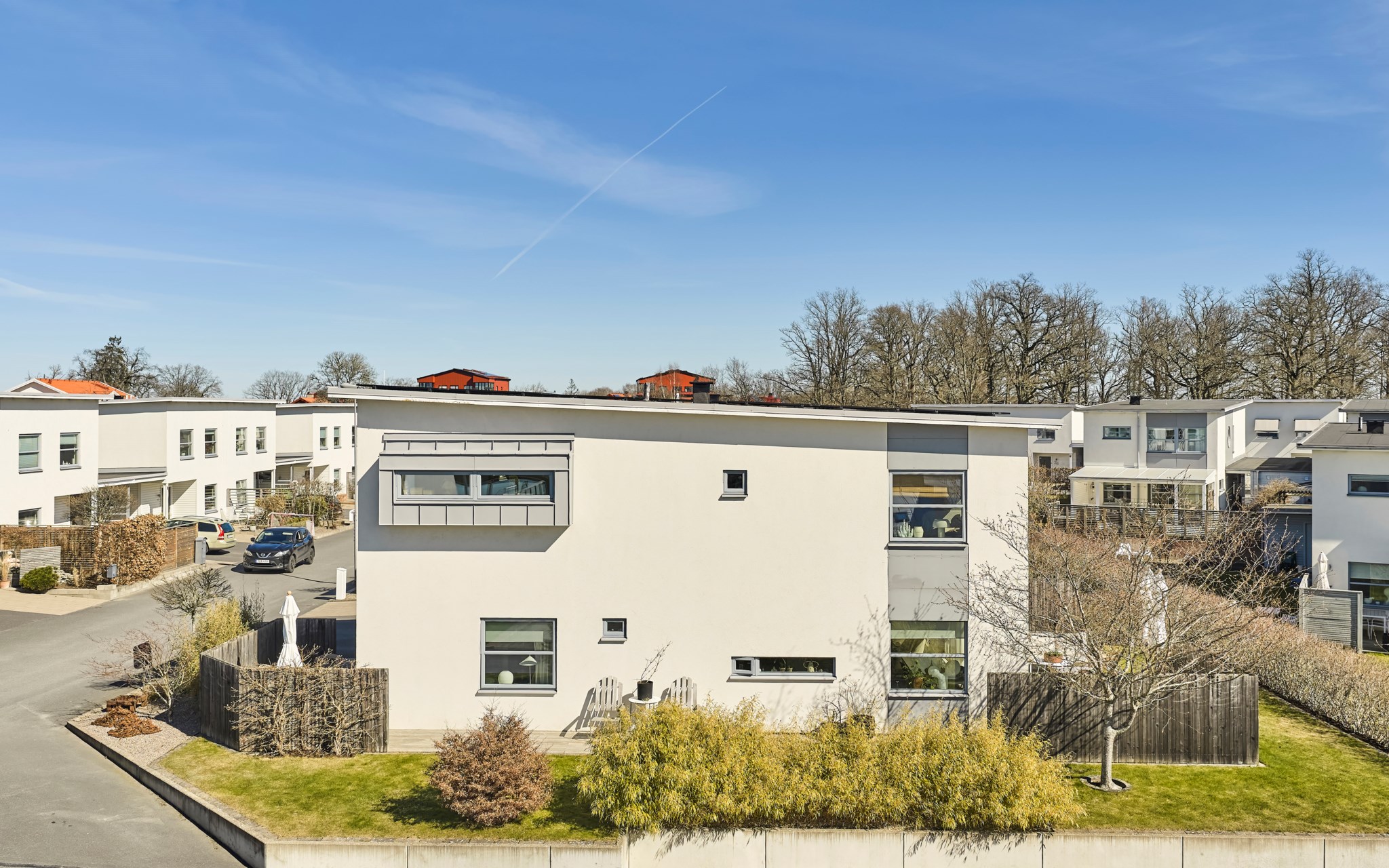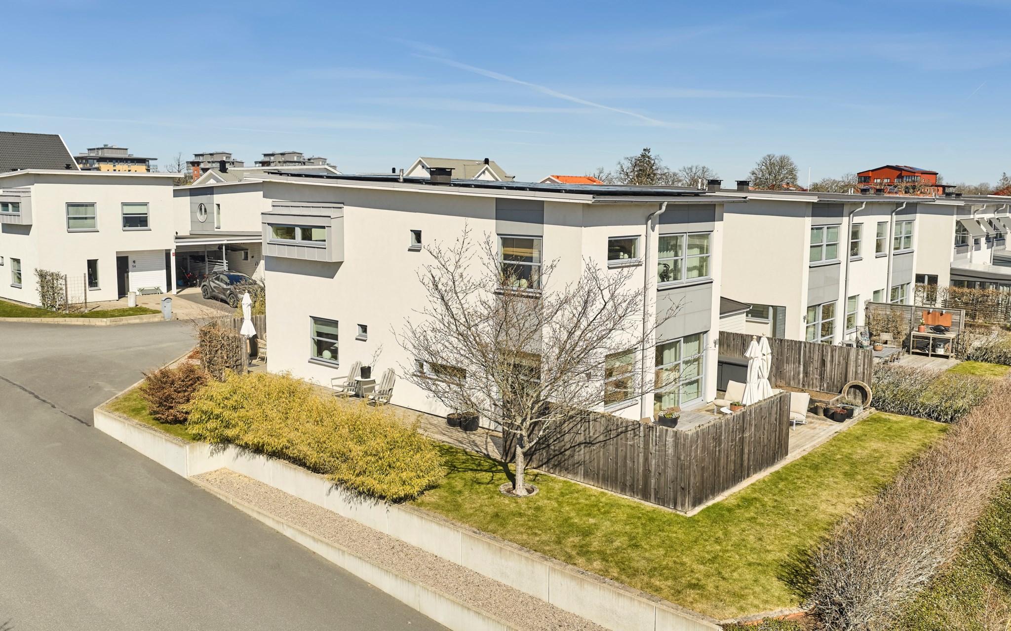 Husen här är byggda 2011 och hyllar den klassiska funkisformen och kunde lika gärna vara byggda på 50- eller 60-talet. Just detta på hörnet med den prassliga bambun är helt fristående med öppen carport och isolerat varmförråd. Ljus puts med skarpt markerade fönster och takkanter som skjuter ut minimalt. Spännande fönstersättning där hörnfönstren också är ett signum för funkisstilen. Den strama exteriören har sin motsats i ett varmt inre där nuvarande ägare bytt golv enhetligt till en ljusare ekparkett. Golvvärme i den gjutna plattan, radiatorer en trappa upp. Vattenburen värme via fjärrvärme.