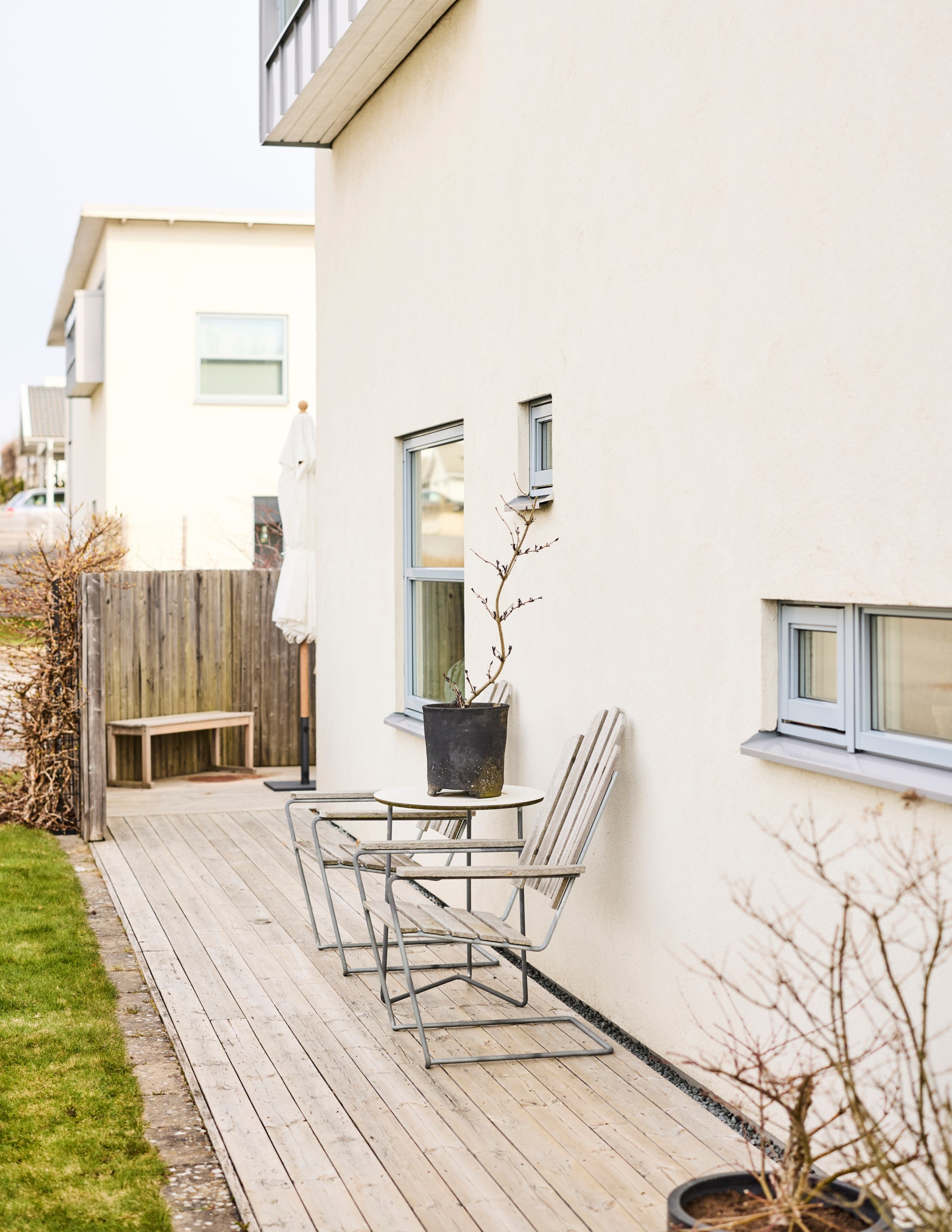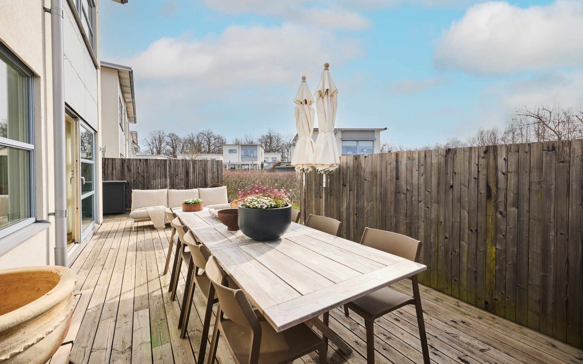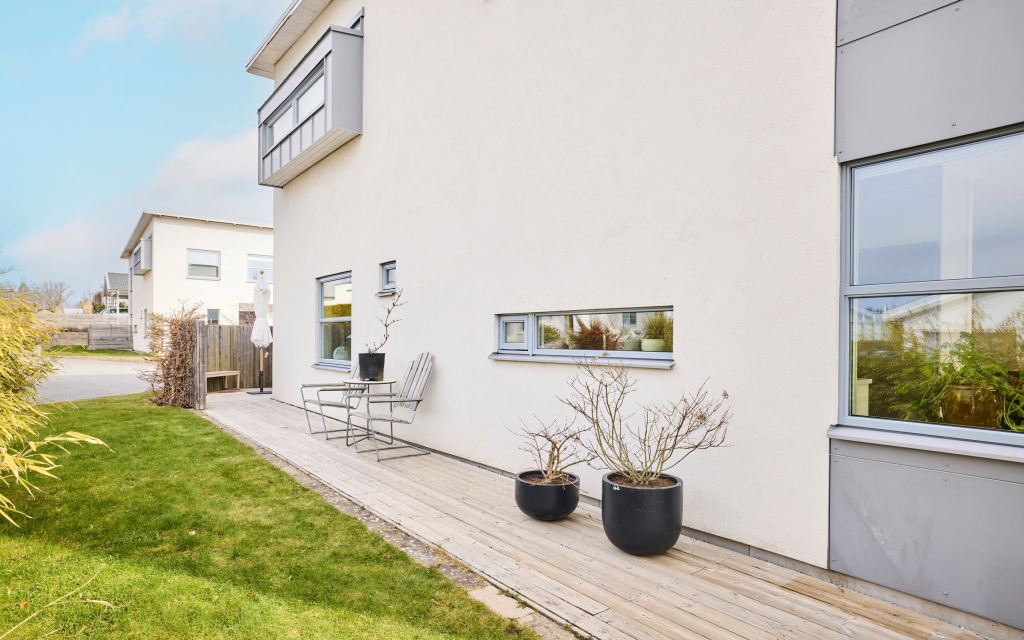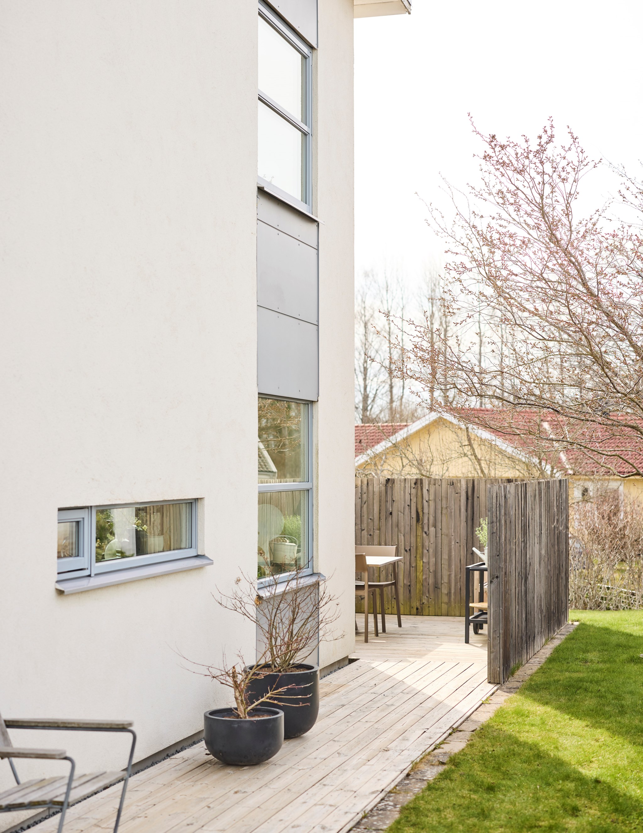 Vips, så har du en soffa till, ett matbord till och en spis som lagar maten. Bara att öppna det stora fönsterpartiet när blomstertiden kommer och njuta i fulla drag. Kanske redan i slutet av mars om du har tur. Trädäcket är tacksamt även för en badbalja för de minsta att svalka sig i, så slipper du gula fläcken ute på gräset. Bambu på rad och ett fint plank värnar din privata sfär ända in på kvällen. Det finns en uteplats på framsidan också om du fått smak på den allra sista kvällssolen.