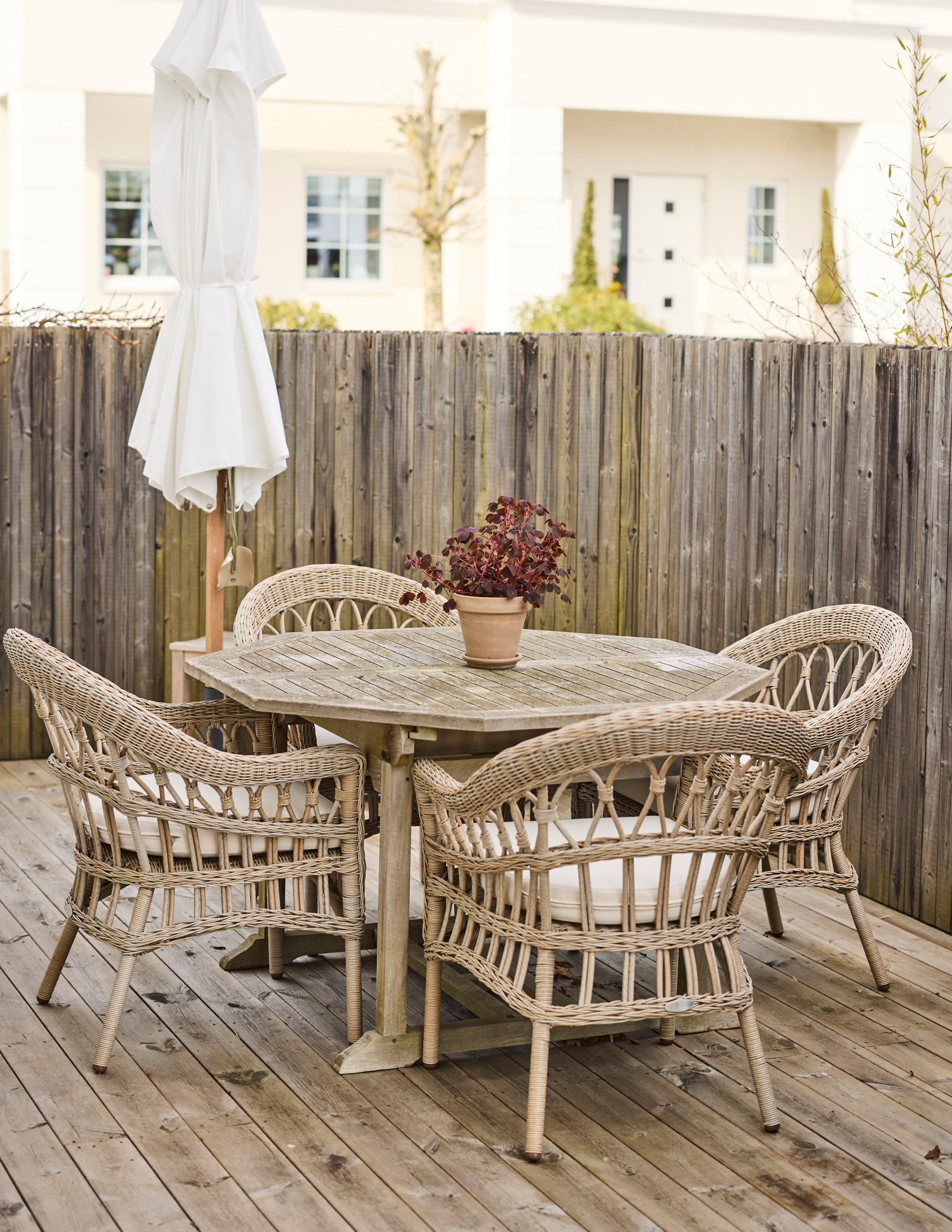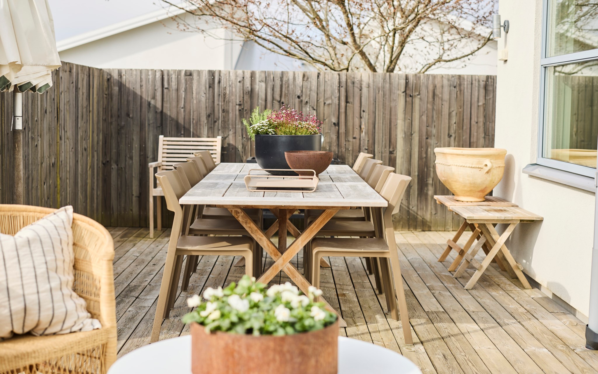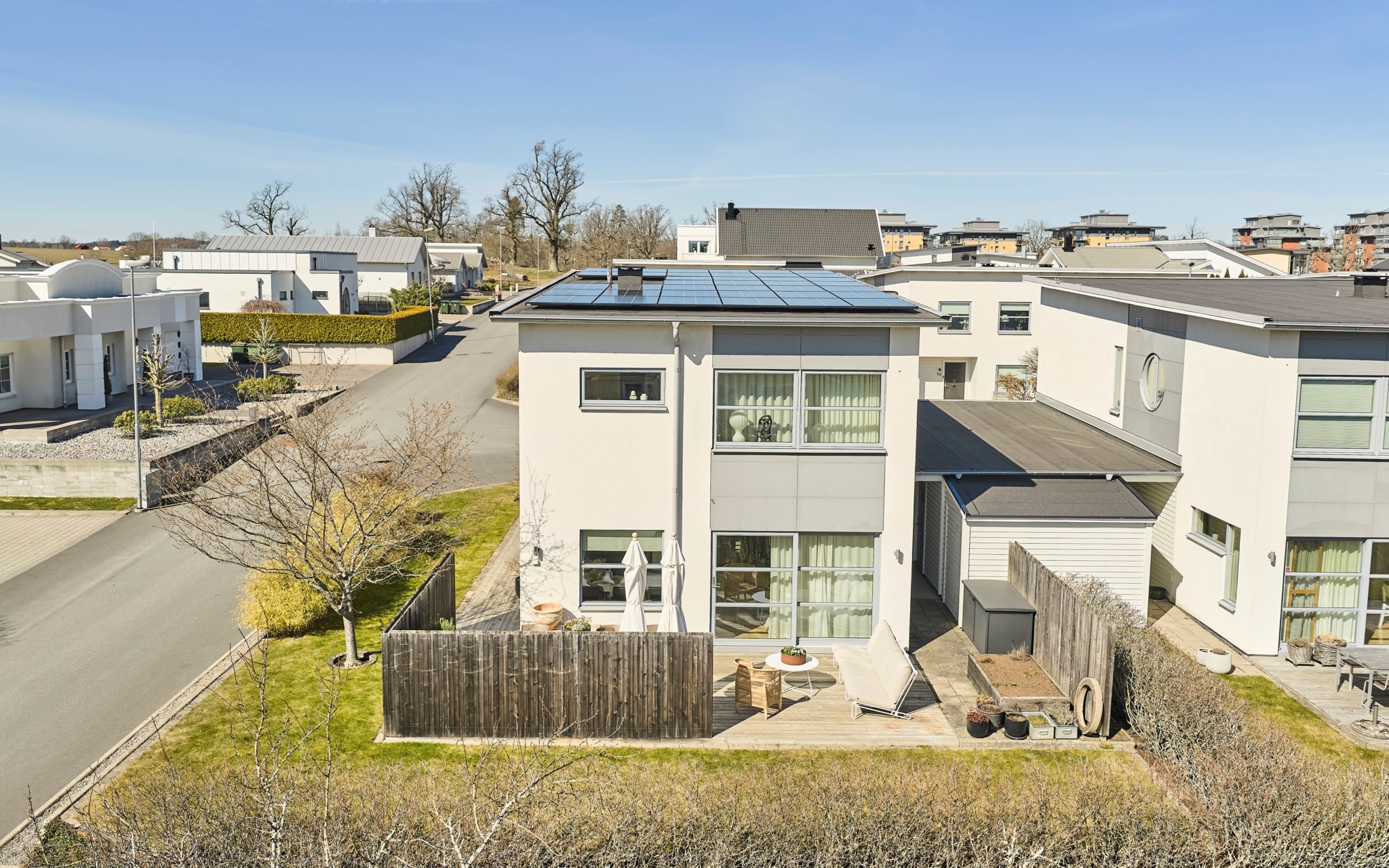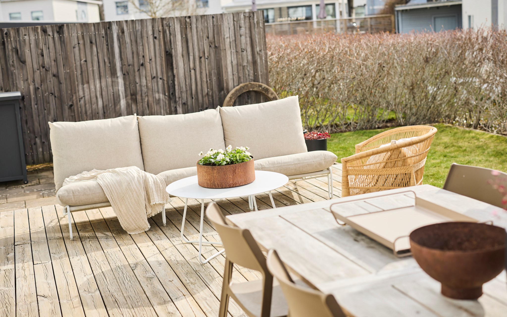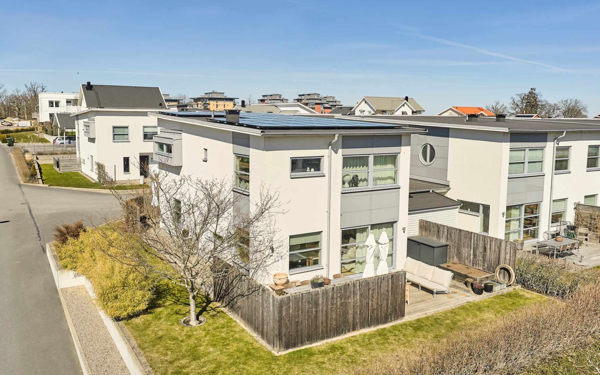 Vips, så har du en soffa till, ett matbord till och en spis som lagar maten. Bara att öppna det stora fönsterpartiet när blomstertiden kommer och njuta i fulla drag. Kanske redan i slutet av mars om du har tur. Trädäcket är tacksamt även för en badbalja för de minsta att svalka sig i, så slipper du gula fläcken ute på gräset. Bambu på rad och ett fint plank värnar din privata sfär ända in på kvällen. Det finns en uteplats på framsidan också om du fått smak på den allra sista kvällssolen.