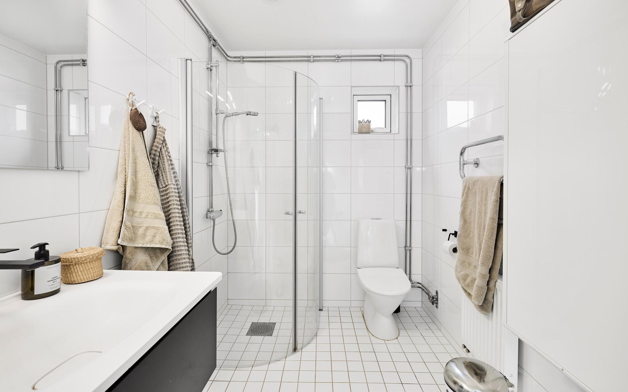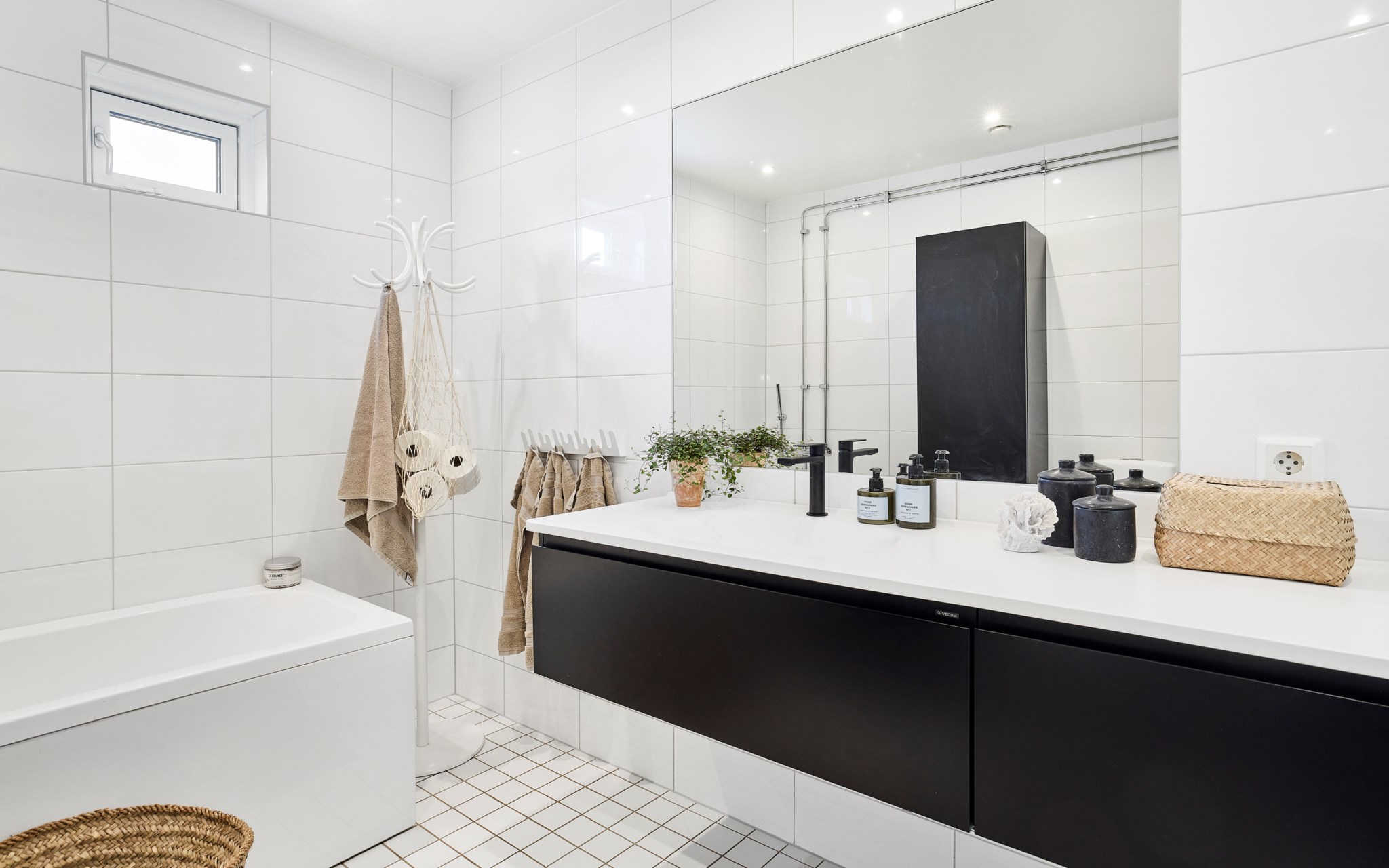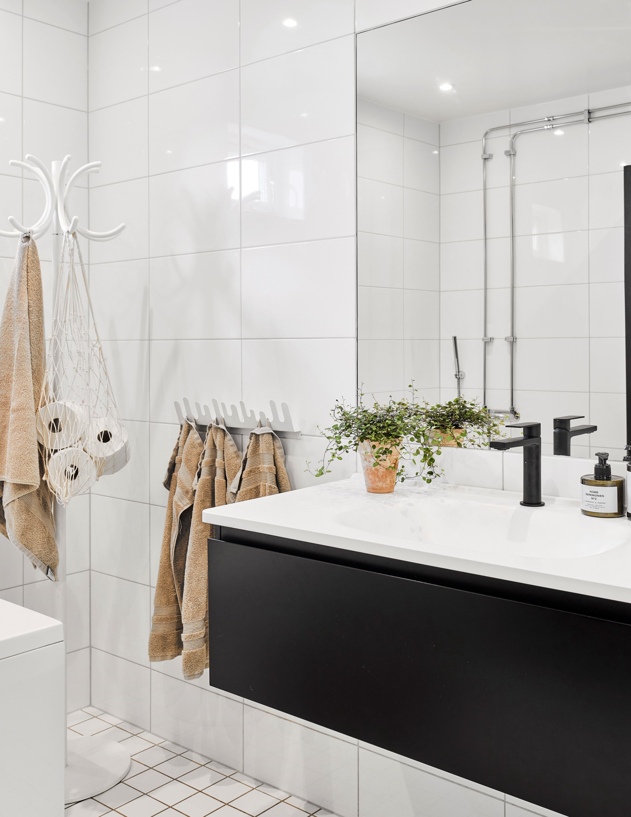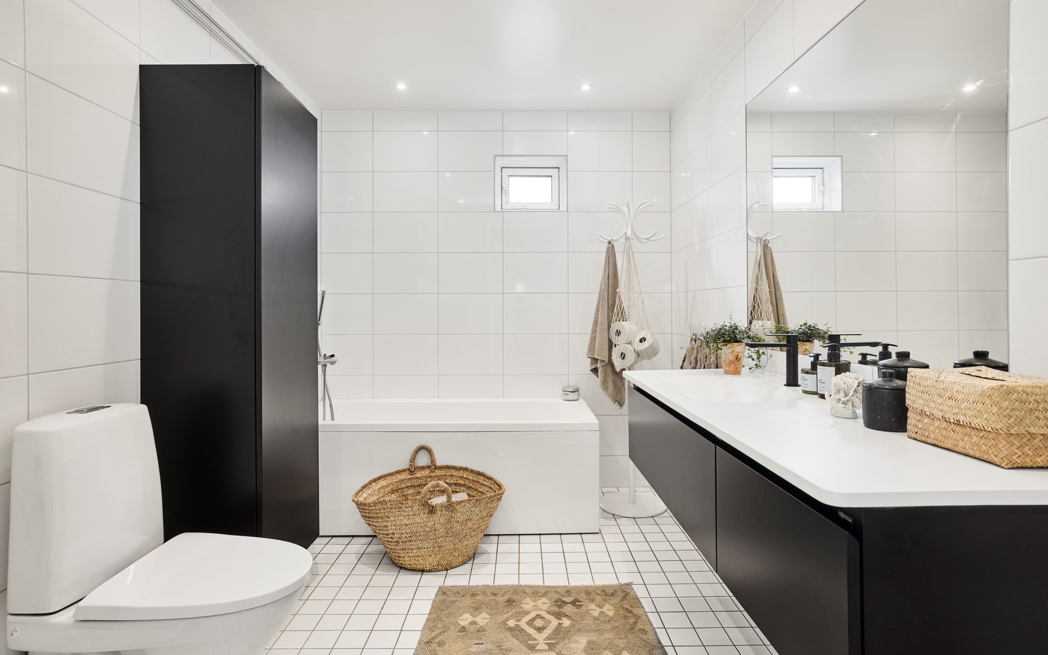 Samma stuk, samma ljus och samma minimalistiska finlir i båda badrummen. Ljuset står både kaklingen och fönstret för som är samma både uppe och nere. Nere hittar du badkar, uppe dusch, men det går såklart att duscha även i karet. Klinkern på golvet är samma vita i 10x10-format som även satt på väggen i köket. Sånna små kopplingar gör mycket för helhetskänslan i ett hem. Kommoderna relativt nya både uppe och nere, samma modell men extra brett där nere med massor av avlastningsyta på sidorna av handfatet, och massor av förvaring i lådorna under. Högskåpet är i samma serie. Längtar du efter mer färg är det bara att rulla ut den rosa mattan. Eller den skogsgröna. Golvvärme i båda badrummen.