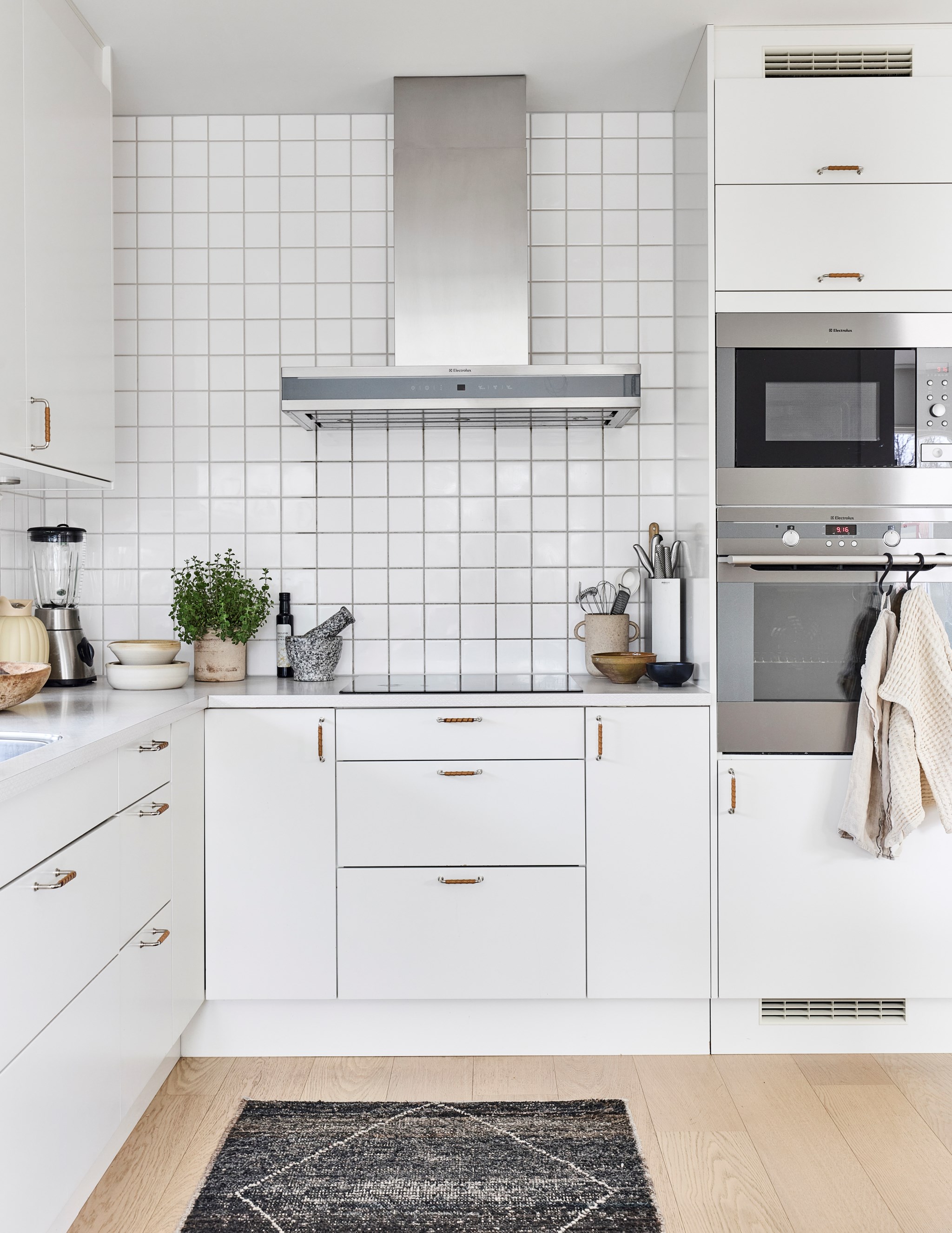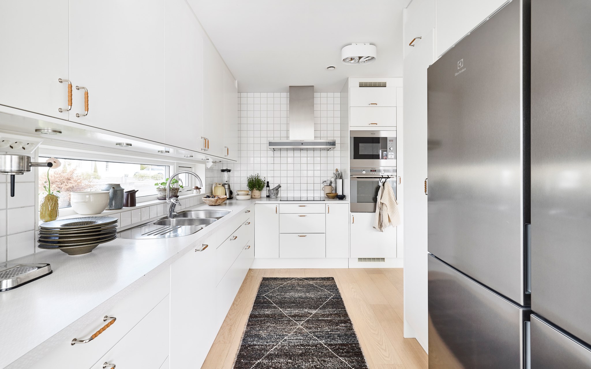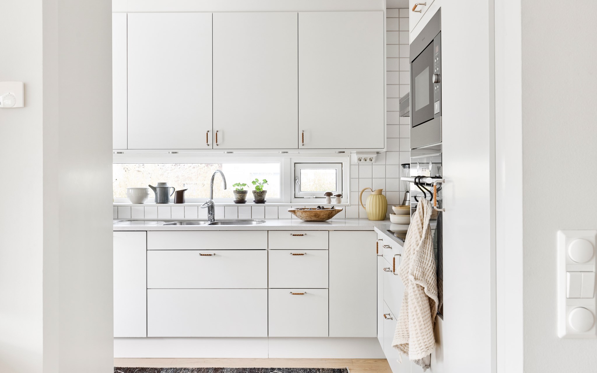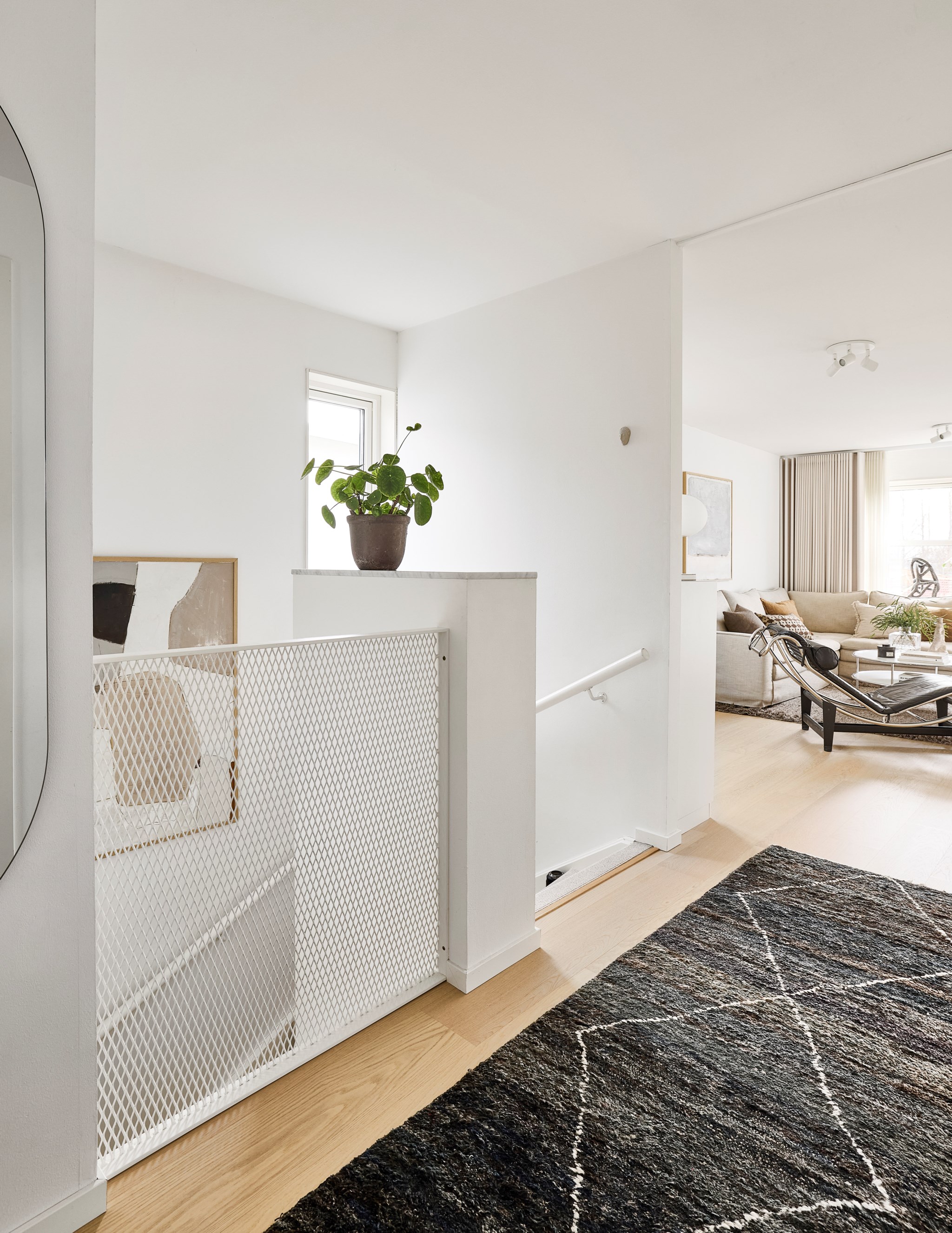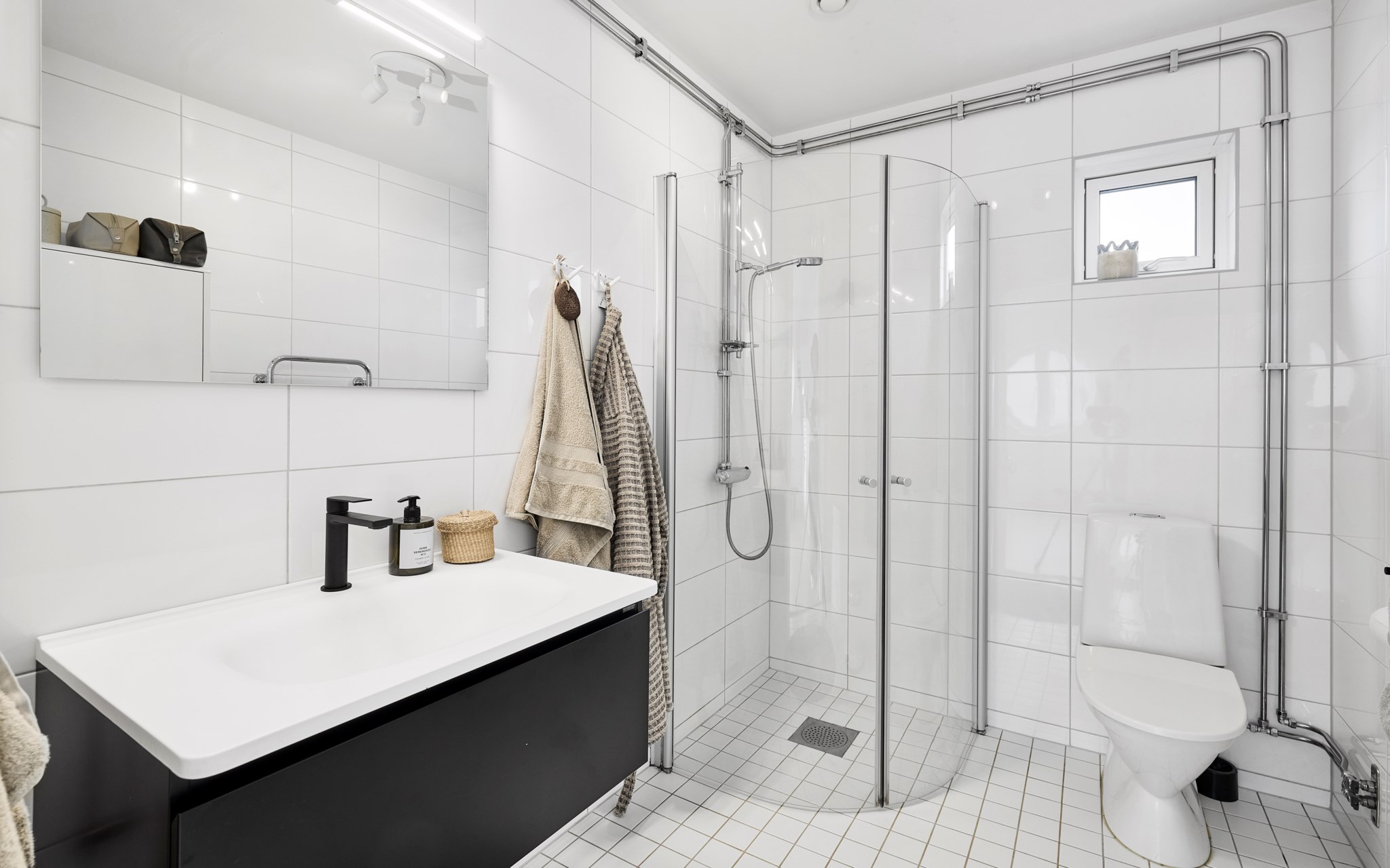 Samma stuk, samma ljus och samma minimalistiska finlir i båda badrummen. Ljuset står både kaklingen och fönstret för som är samma både uppe och nere. Nere hittar du badkar, uppe dusch, men det går såklart att duscha även i karet. Klinkern på golvet är samma vita i 10x10-format som även satt på väggen i köket. Sånna små kopplingar gör mycket för helhetskänslan i ett hem. Kommoderna relativt nya både uppe och nere, samma modell men extra brett där nere med massor av avlastningsyta på sidorna av handfatet, och massor av förvaring i lådorna under. Högskåpet är i samma serie. Längtar du efter mer färg är det bara att rulla ut den rosa mattan. Eller den skogsgröna. Golvvärme i båda badrummen.