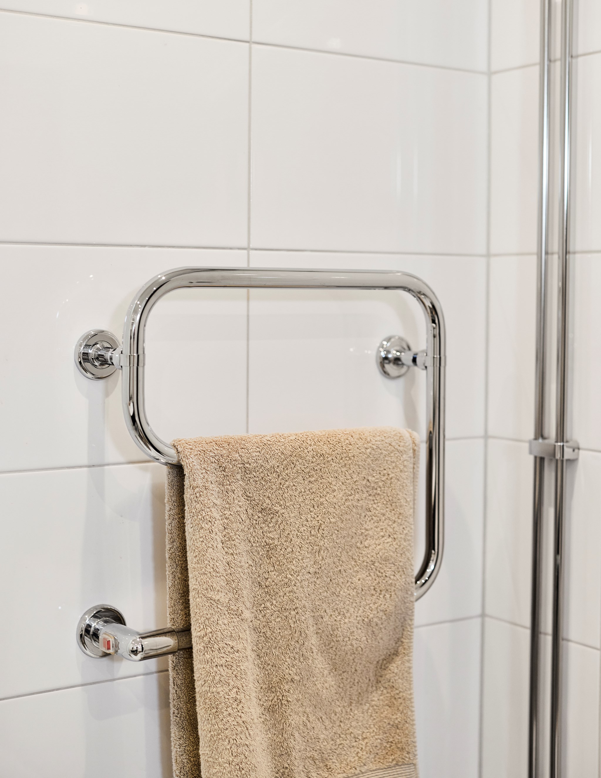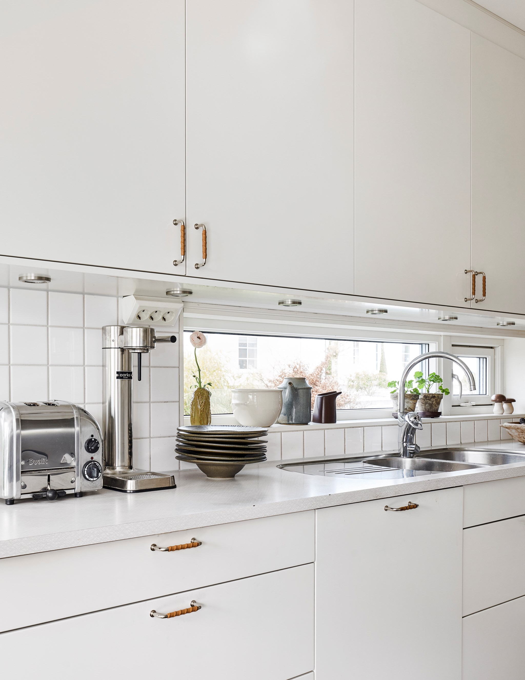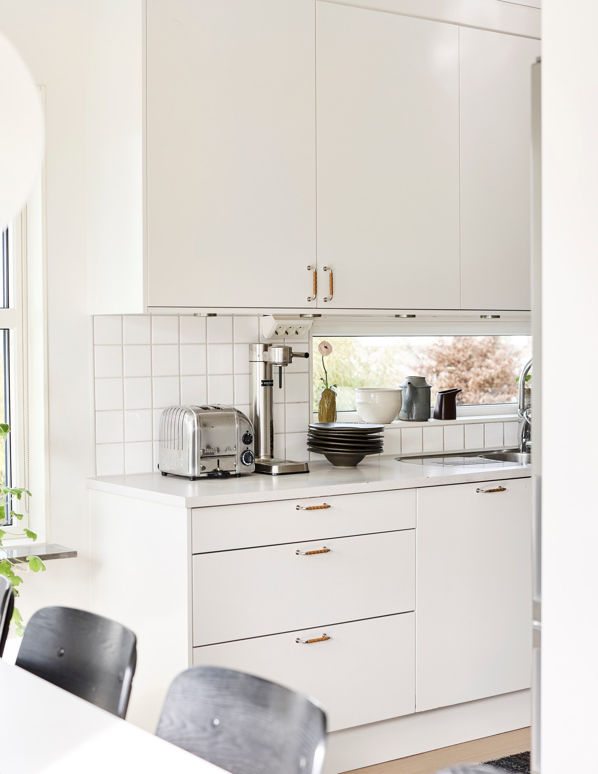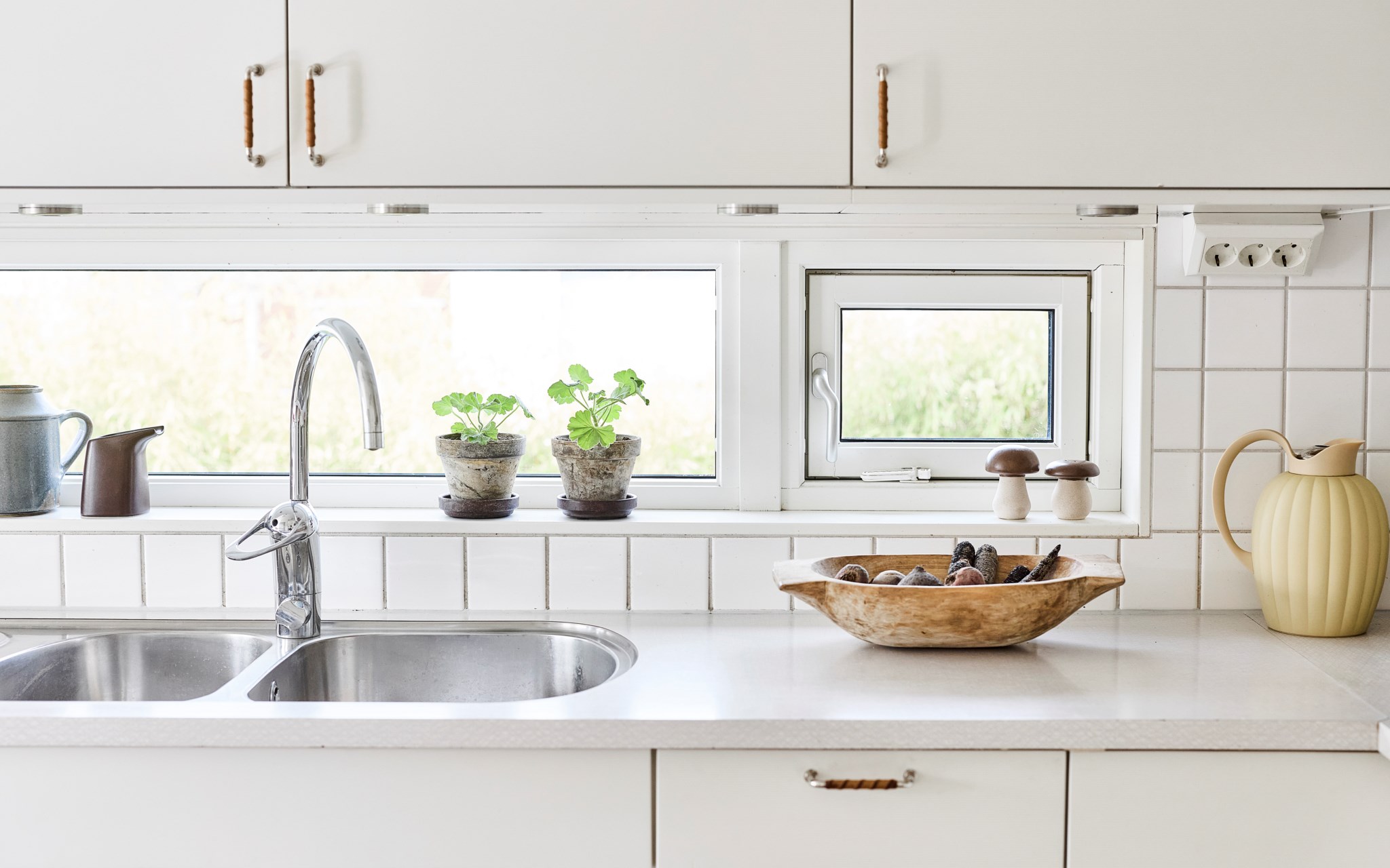 Samma stuk, samma ljus och samma minimalistiska finlir i båda badrummen. Ljuset står både kaklingen och fönstret för som är samma både uppe och nere. Nere hittar du badkar, uppe dusch, men det går såklart att duscha även i karet. Klinkern på golvet är samma vita i 10x10-format som även satt på väggen i köket. Sånna små kopplingar gör mycket för helhetskänslan i ett hem. Kommoderna relativt nya både uppe och nere, samma modell men extra brett där nere med massor av avlastningsyta på sidorna av handfatet, och massor av förvaring i lådorna under. Högskåpet är i samma serie. Längtar du efter mer färg är det bara att rulla ut den rosa mattan. Eller den skogsgröna. Golvvärme i båda badrummen.