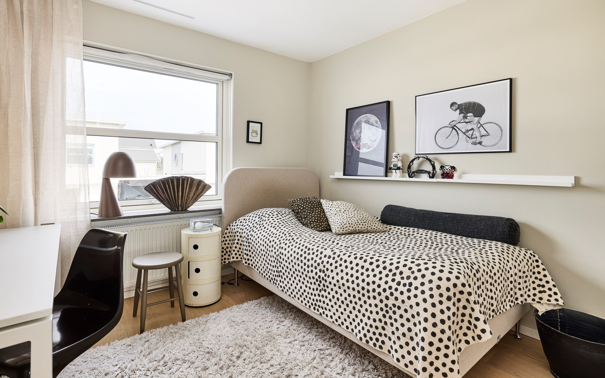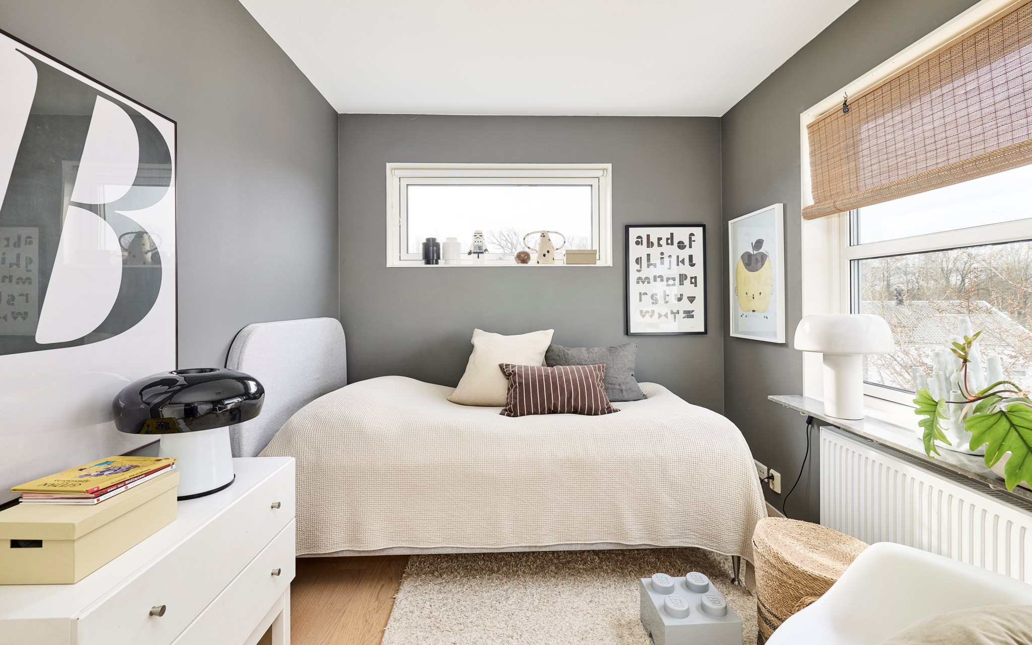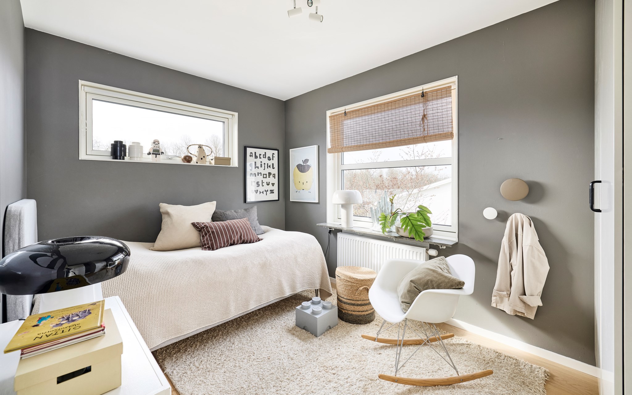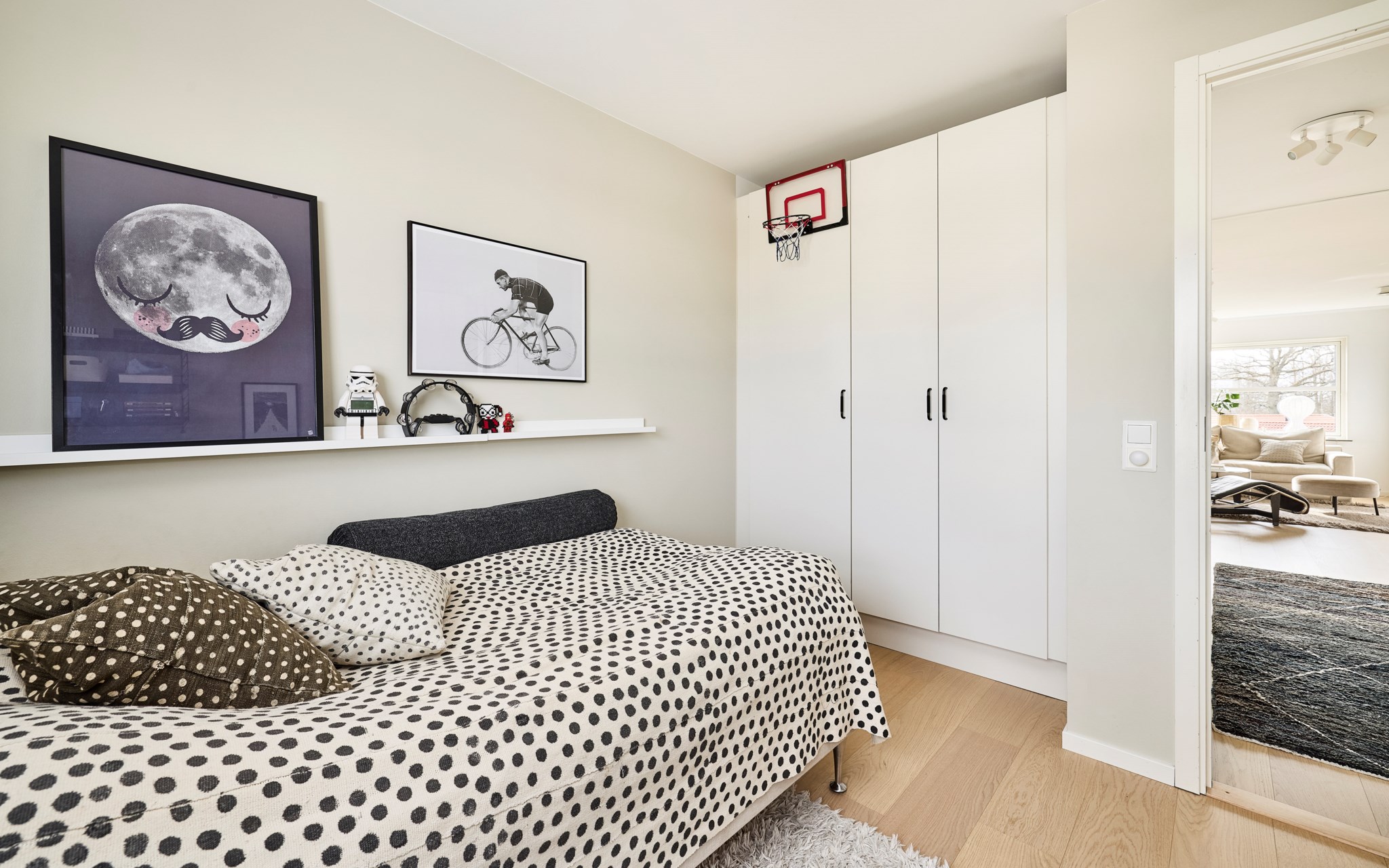 Du har två barnrum här uppe, båda har uppsikt mot gatan i lite olika vinkel för att se vad som är på gång ute på asfalten. Sängkammaren är såklart största sovrummet och har dubbla fönster – mot söder och väster. Söderfönstret sitter högt upp över huvudgärden med en hylldjup fönstersmyg som har blivit möjlig tack vare ”lådan" på väggen som du ser på utsidan. En kul detalj på fasaden som blir praktisk avlastning här inne. Stor skjutdörrsgarderob som gör ett bra jobb med att ta hand om dina skor och kläder som väntar på användning. Med minstingen sovandes vägg i vägg är det nära att byta säng hit och dit om nätterna.