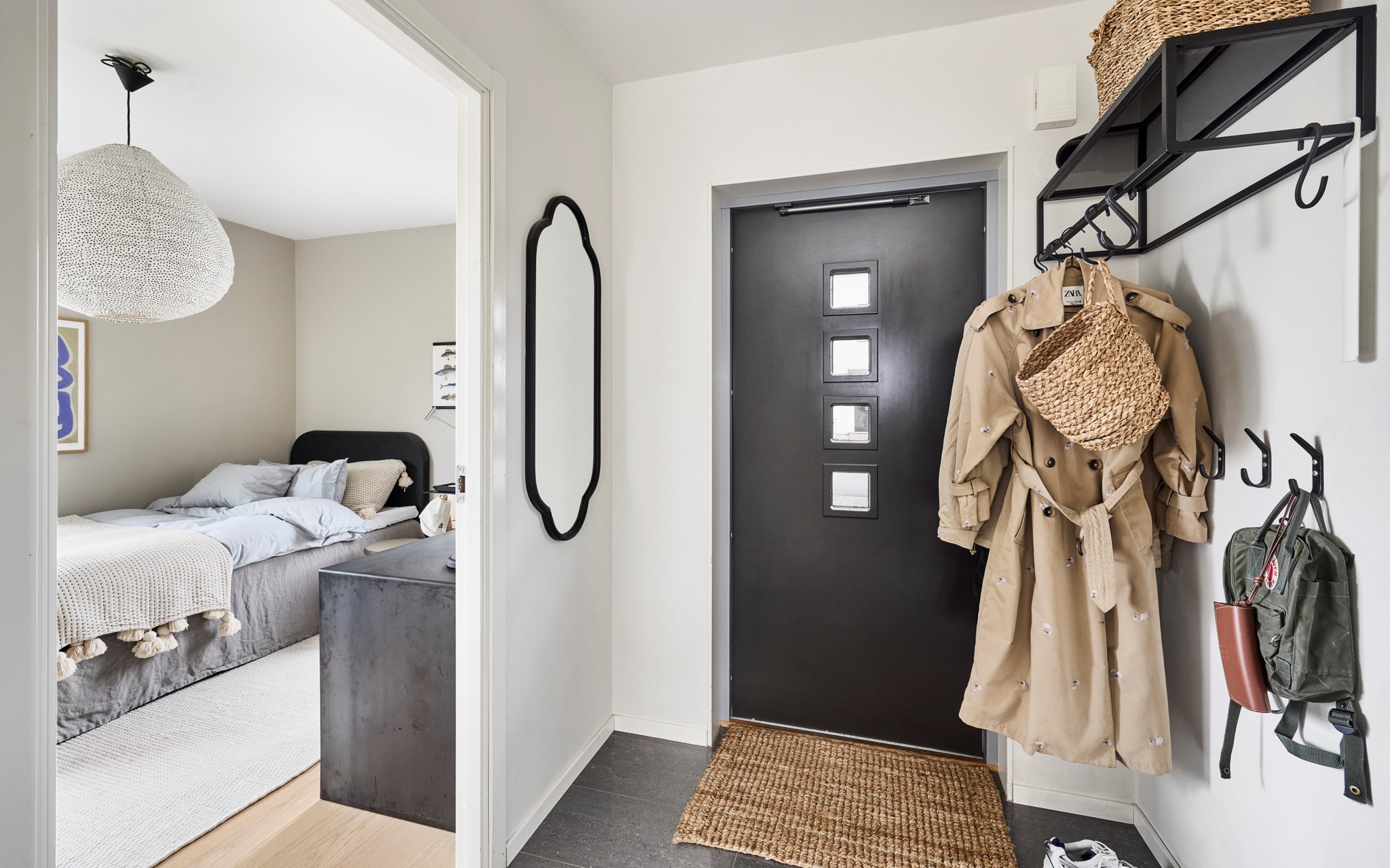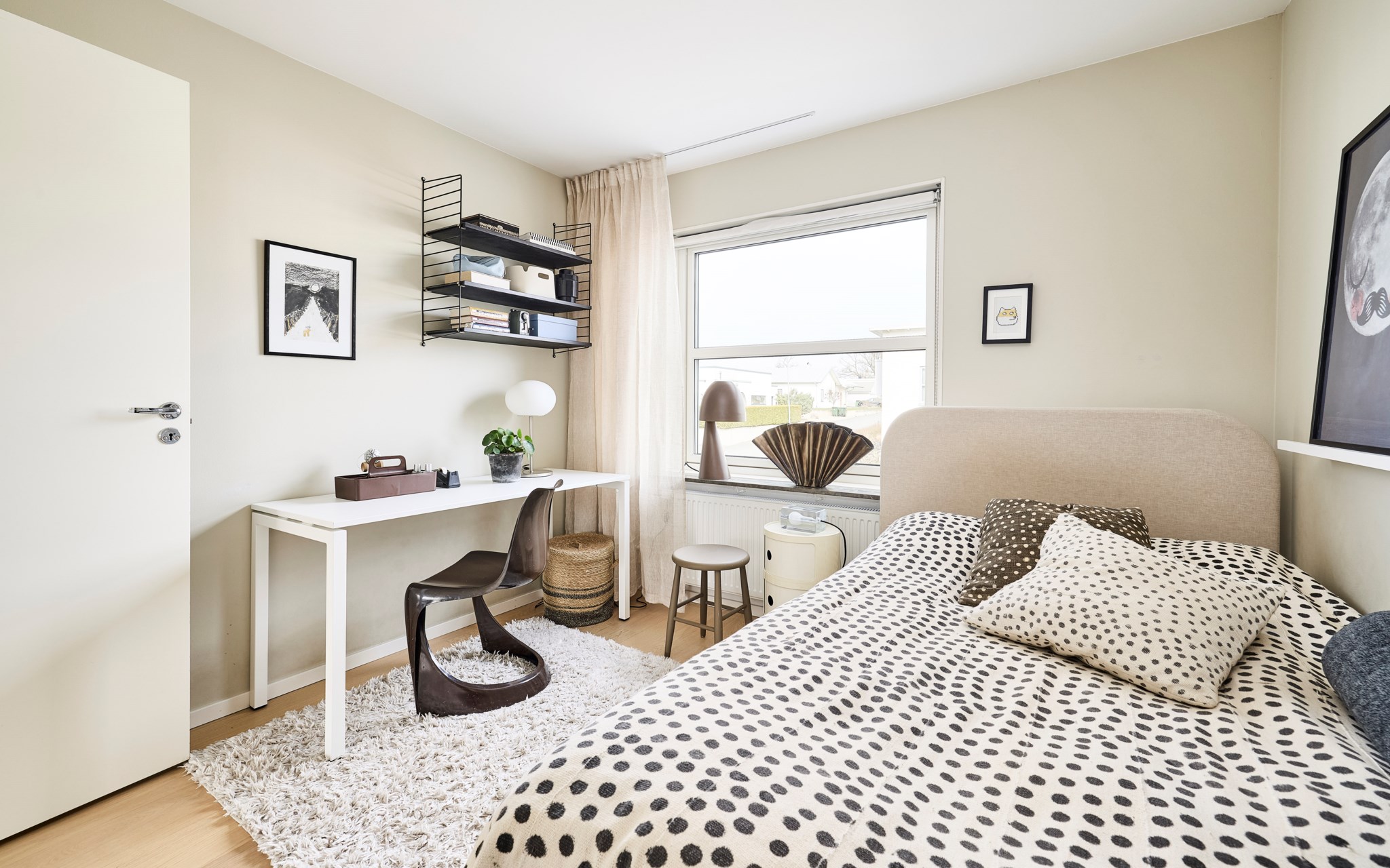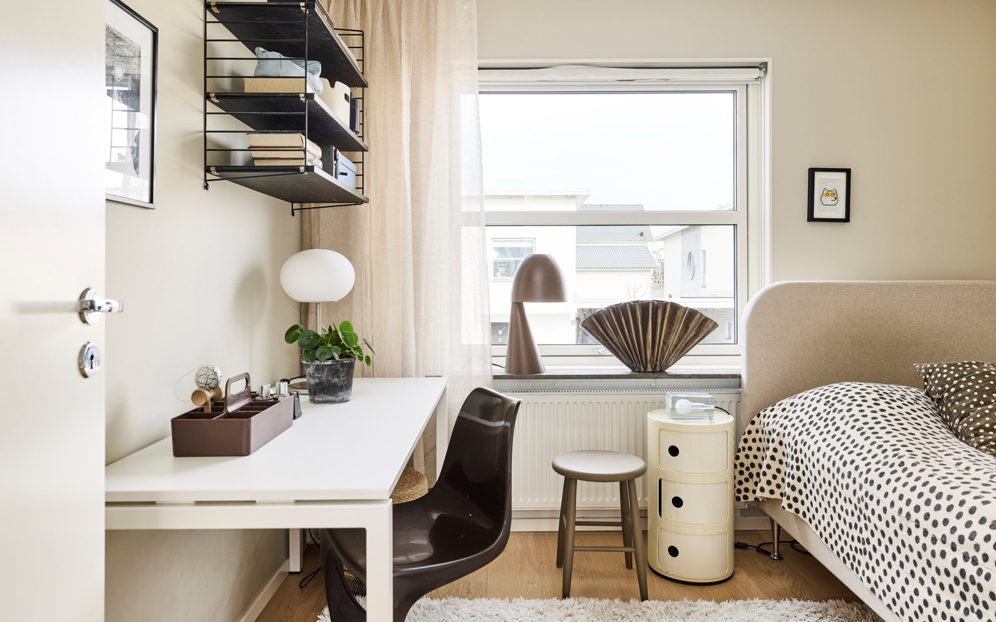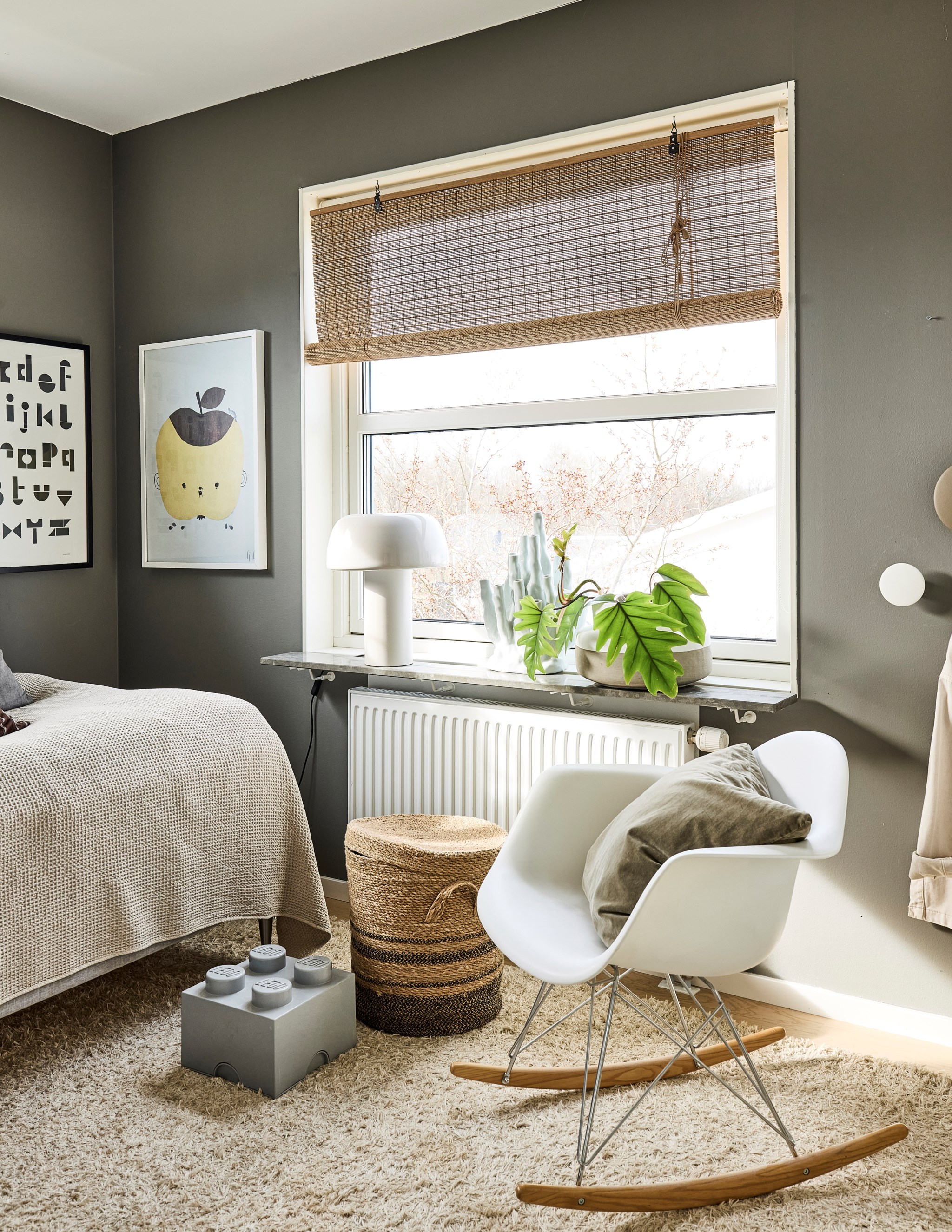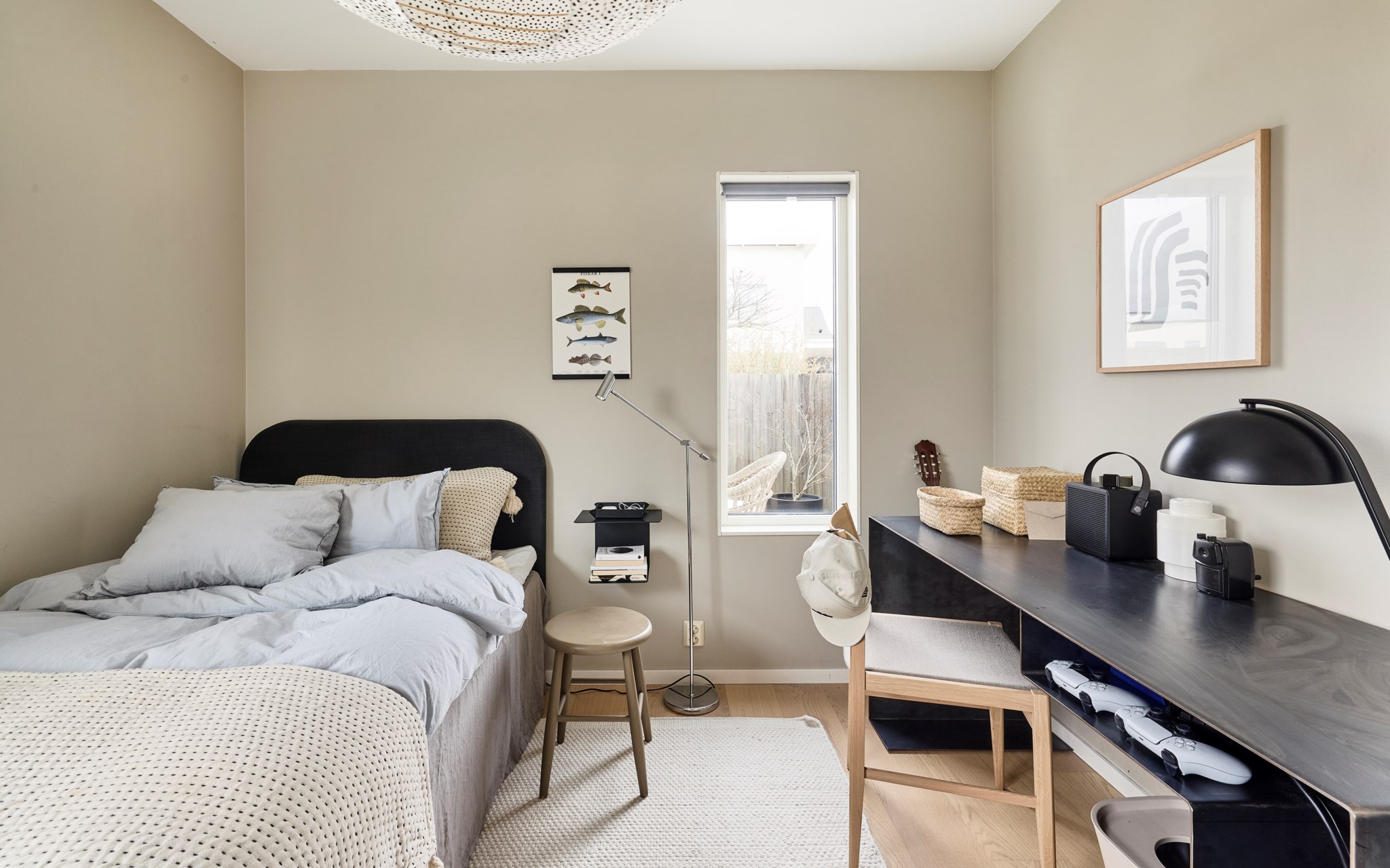 Du har två barnrum här uppe, båda har uppsikt mot gatan i lite olika vinkel för att se vad som är på gång ute på asfalten. Sängkammaren är såklart största sovrummet och har dubbla fönster – mot söder och väster. Söderfönstret sitter högt upp över huvudgärden med en hylldjup fönstersmyg som har blivit möjlig tack vare ”lådan" på väggen som du ser på utsidan. En kul detalj på fasaden som blir praktisk avlastning här inne. Stor skjutdörrsgarderob som gör ett bra jobb med att ta hand om dina skor och kläder som väntar på användning. Med minstingen sovandes vägg i vägg är det nära att byta säng hit och dit om nätterna.