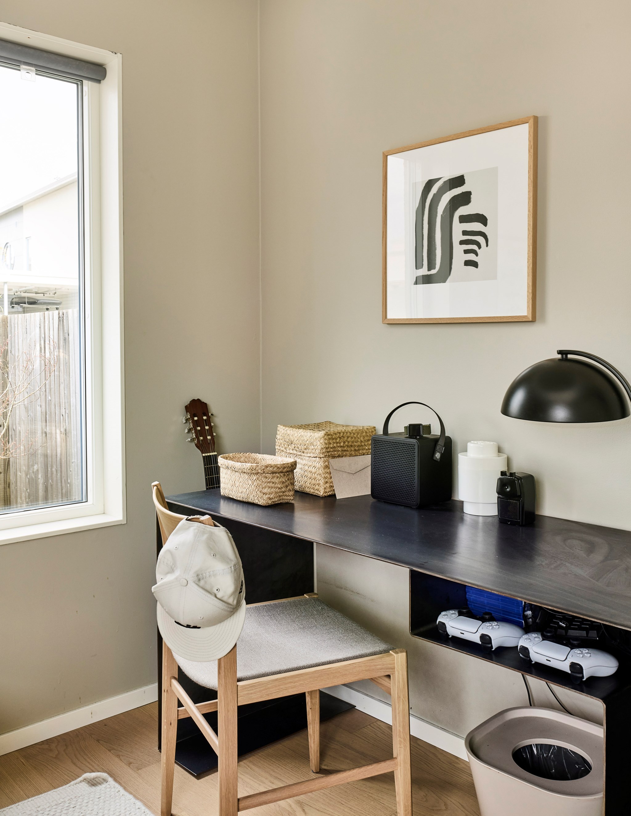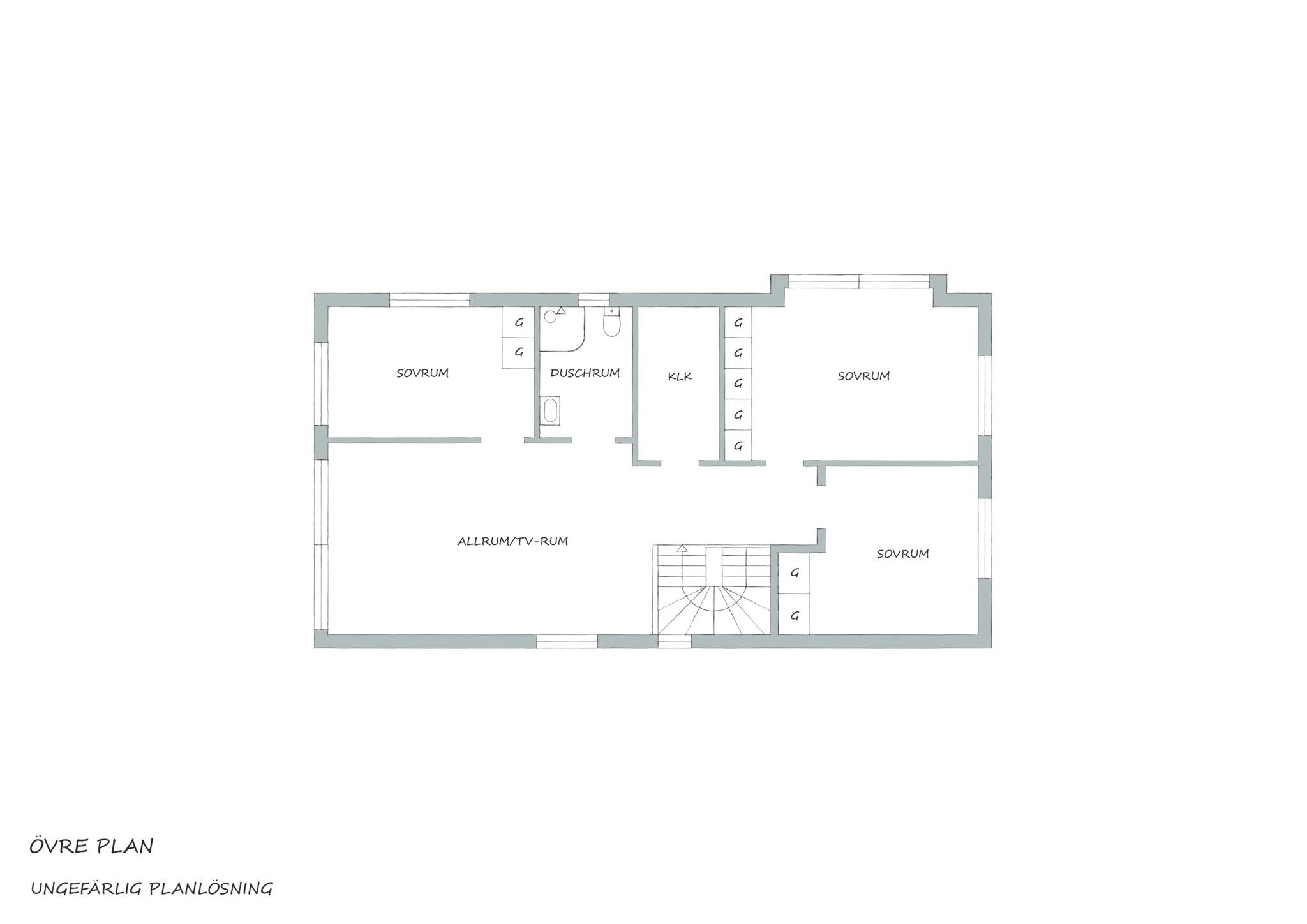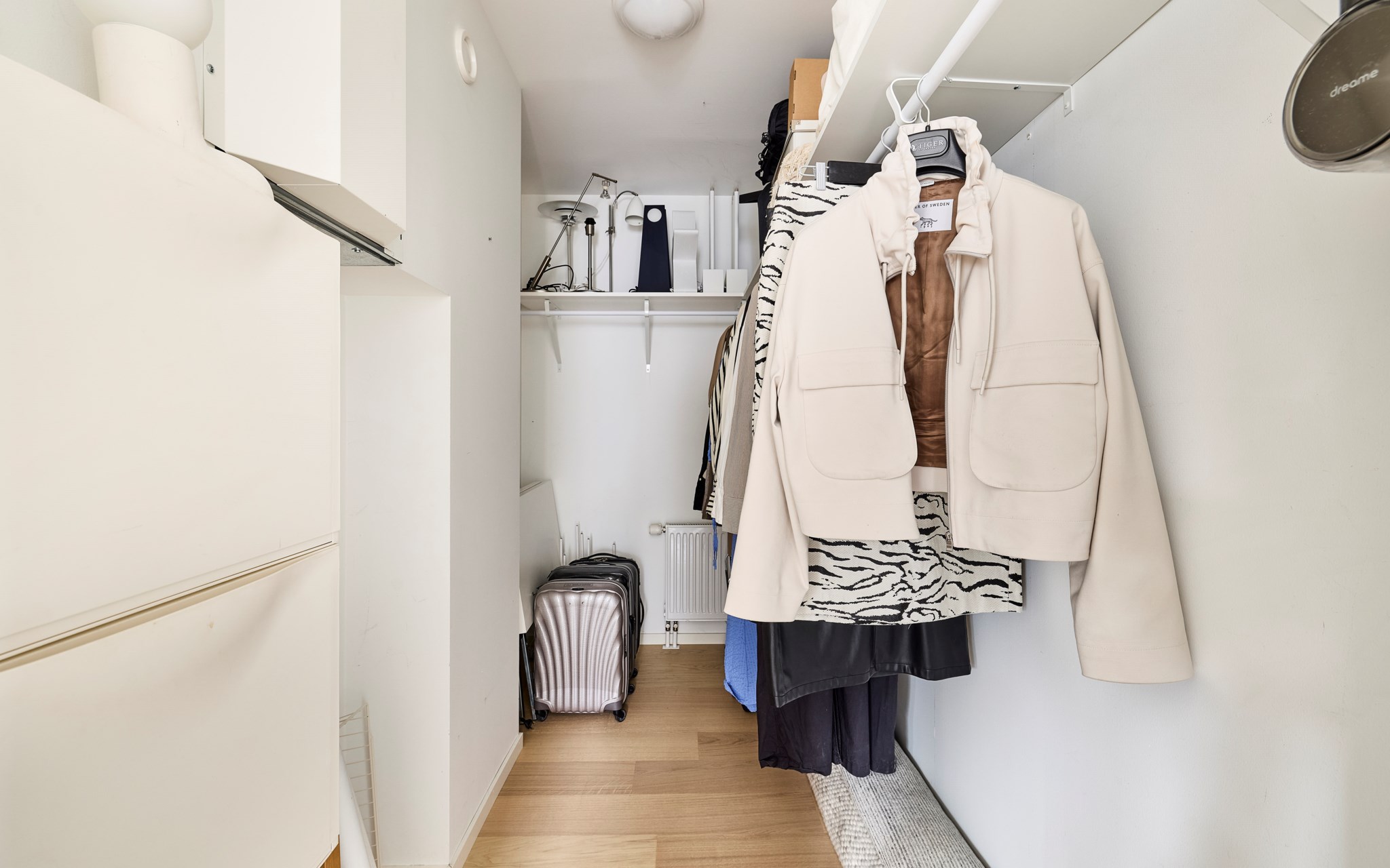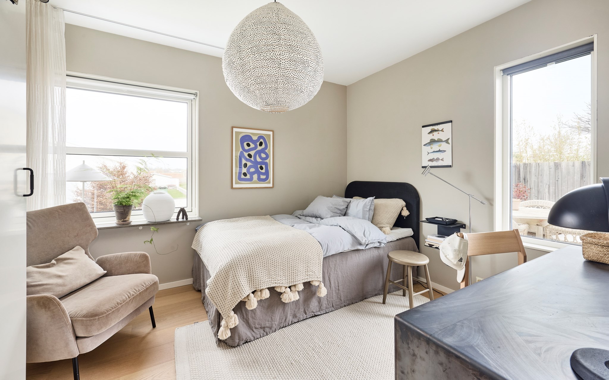 Du har två barnrum här uppe, båda har uppsikt mot gatan i lite olika vinkel för att se vad som är på gång ute på asfalten. Sängkammaren är såklart största sovrummet och har dubbla fönster – mot söder och väster. Söderfönstret sitter högt upp över huvudgärden med en hylldjup fönstersmyg som har blivit möjlig tack vare ”lådan" på väggen som du ser på utsidan. En kul detalj på fasaden som blir praktisk avlastning här inne. Stor skjutdörrsgarderob som gör ett bra jobb med att ta hand om dina skor och kläder som väntar på användning. Med minstingen sovandes vägg i vägg är det nära att byta säng hit och dit om nätterna.