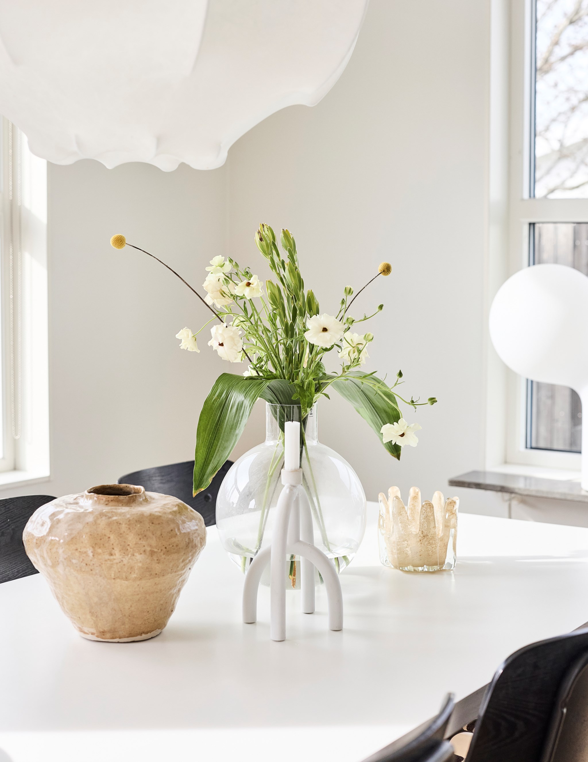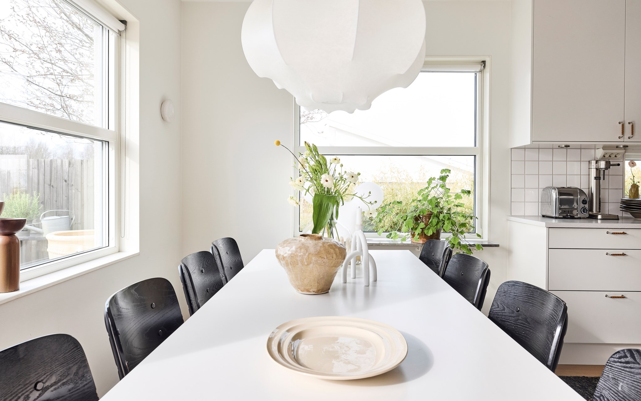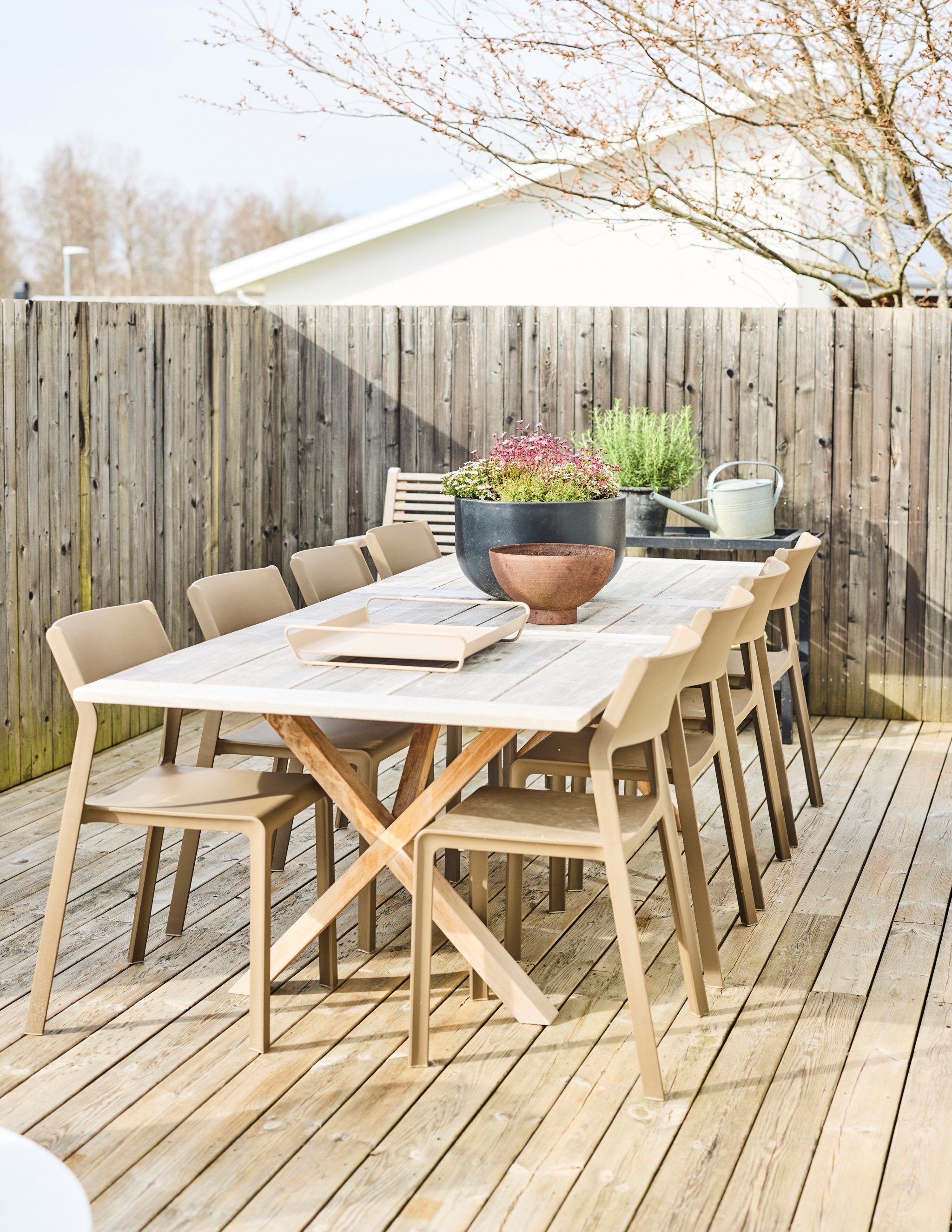 Här har trädgården fått lika mycket kärlek och uppmärksamhet som interiören. Och den stilistiska nivån minst lika ambitiös. Trädäcket tar fart runt huset från det stora skjutglaspartiet som öppnar från vardagsrummet på baksidan. Bara att följa med solen runt husknuten till eftermiddagen. Träd och buskar har redan fått fin höjd och volym. Den prassliga bambun och planket gör ett fint jobb att rama in och privatisera gavelläget. En klängig hortensia har tagit sig högt upp på det glesa staketet som skyddar uteplatsen på framsidan. Hörnet mot gatan med en fin komposition av ormbunkar, högt gräs, gröna blad och en rödflikig lönn. Här finns en del att upptäcka som vi på Västanhem kanske missade så här tidigt in på trädgårdssäsongen.