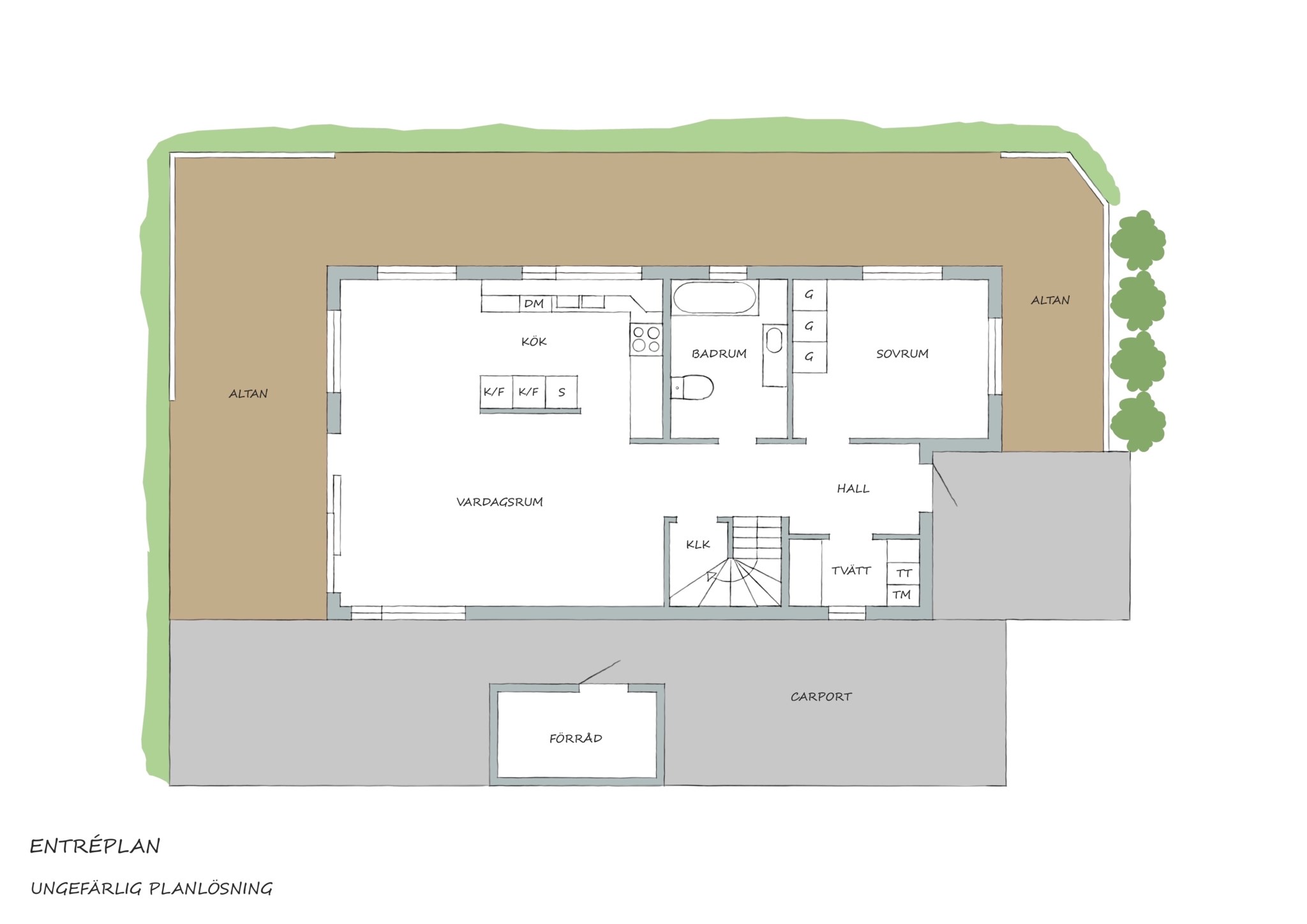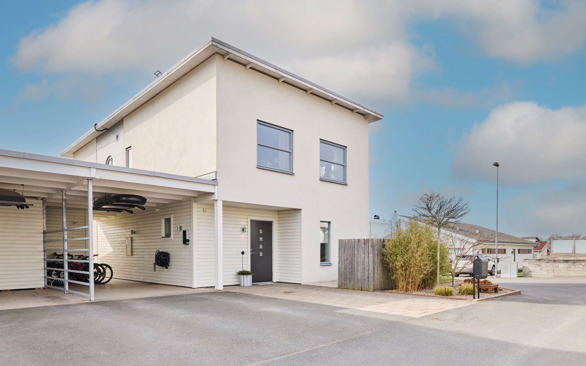 Skönt att åtminstone en av bilarna får stå utan att få frost på framrutan. Och då får även några cyklar plats också. I taket går det att bli av med en del prylar också. Öppen carport kräver lite ordningssinne för att hållas snyggt, men du har ett isolerat varmförråd också där du kan göra lite som du vill. Dina gröna soptunnor kan du dessutom gömma bakom förrådet om du vill slippa se dem varje dag du svänger in bilen.