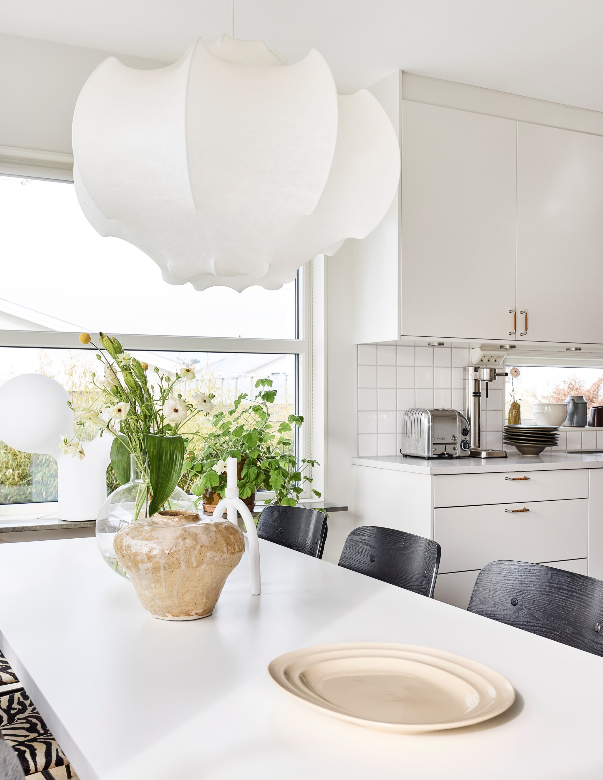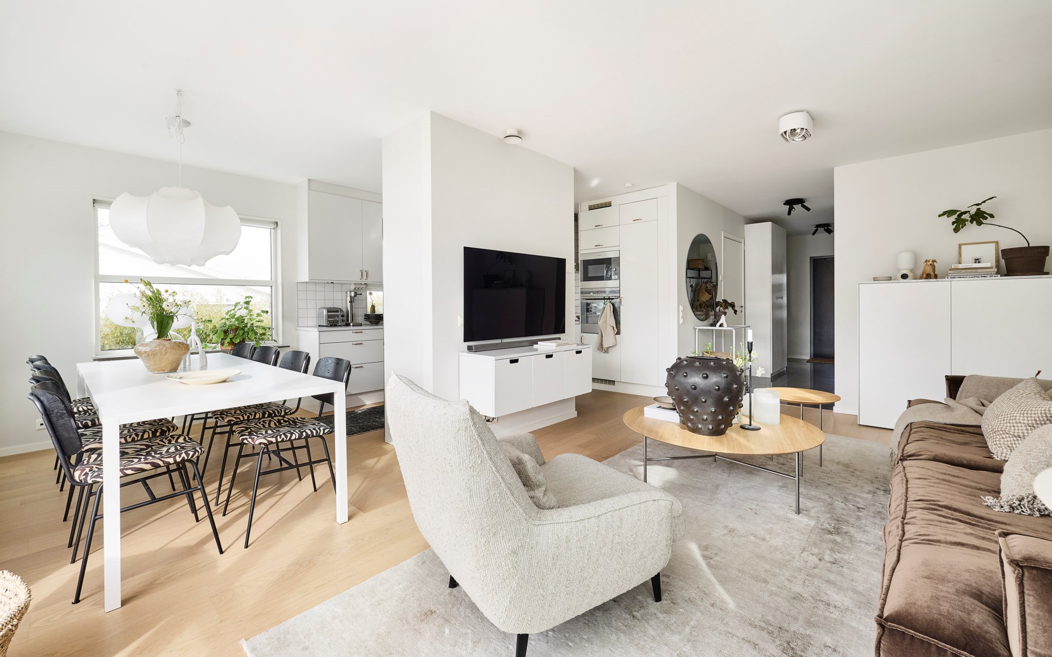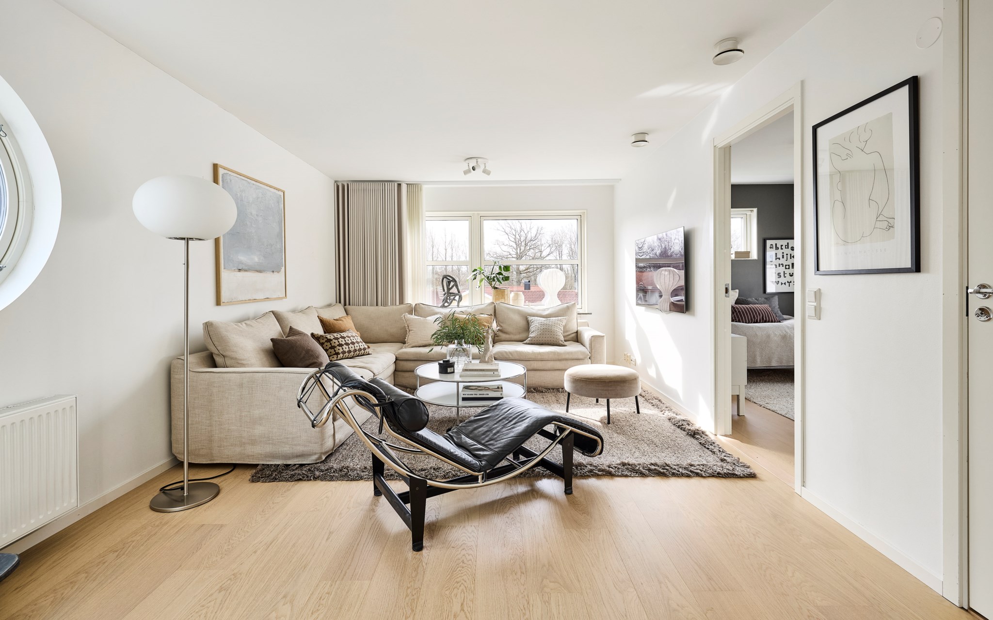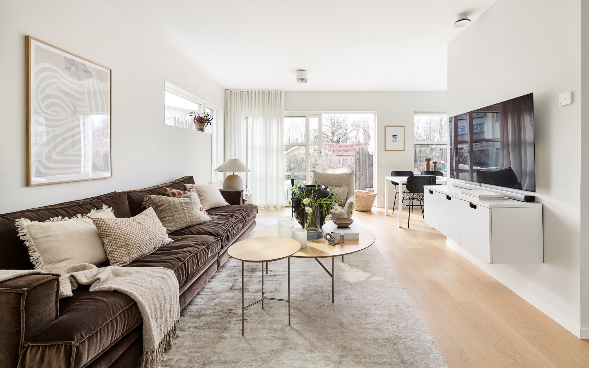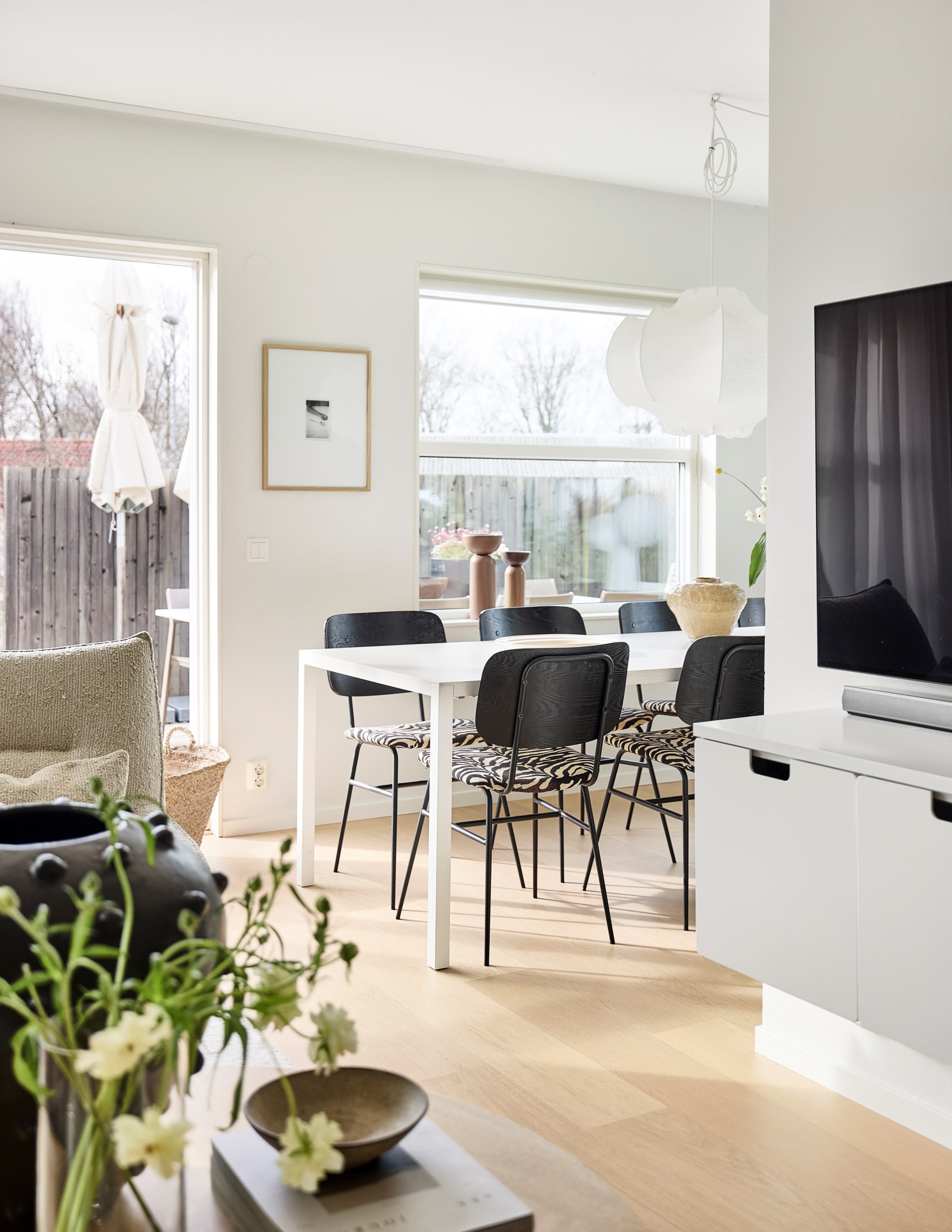Skjut undan det stora glaspartiet för att göra ute till inne sekundsnabbt. Men även vintertid är det pluspoäng att ha ett ljusintag stort som ett skyltfönster. Eller kanske just då, när du behöver så mycket ljus du kan för att få fart på hormonerna. Stora XL-soffan får plats om du vill, men du kan också slösa mer med golvytan om du vill och spara den stora slappe-soffan till ovanvåningen, där du har ett lika stort vardagsrum som här. Snyggt med de lite olika stora och höga fönstren, där morgonsolen kommer allra först. Hur du väljer att möblera detta utrymme är inte självklart, nuvarande ägare har riggat en tv-hörna här. Ett alternativ vore ett maxa matbordet för både läxläsning och lasagneätning. Fortsatt samma ljusa golv.