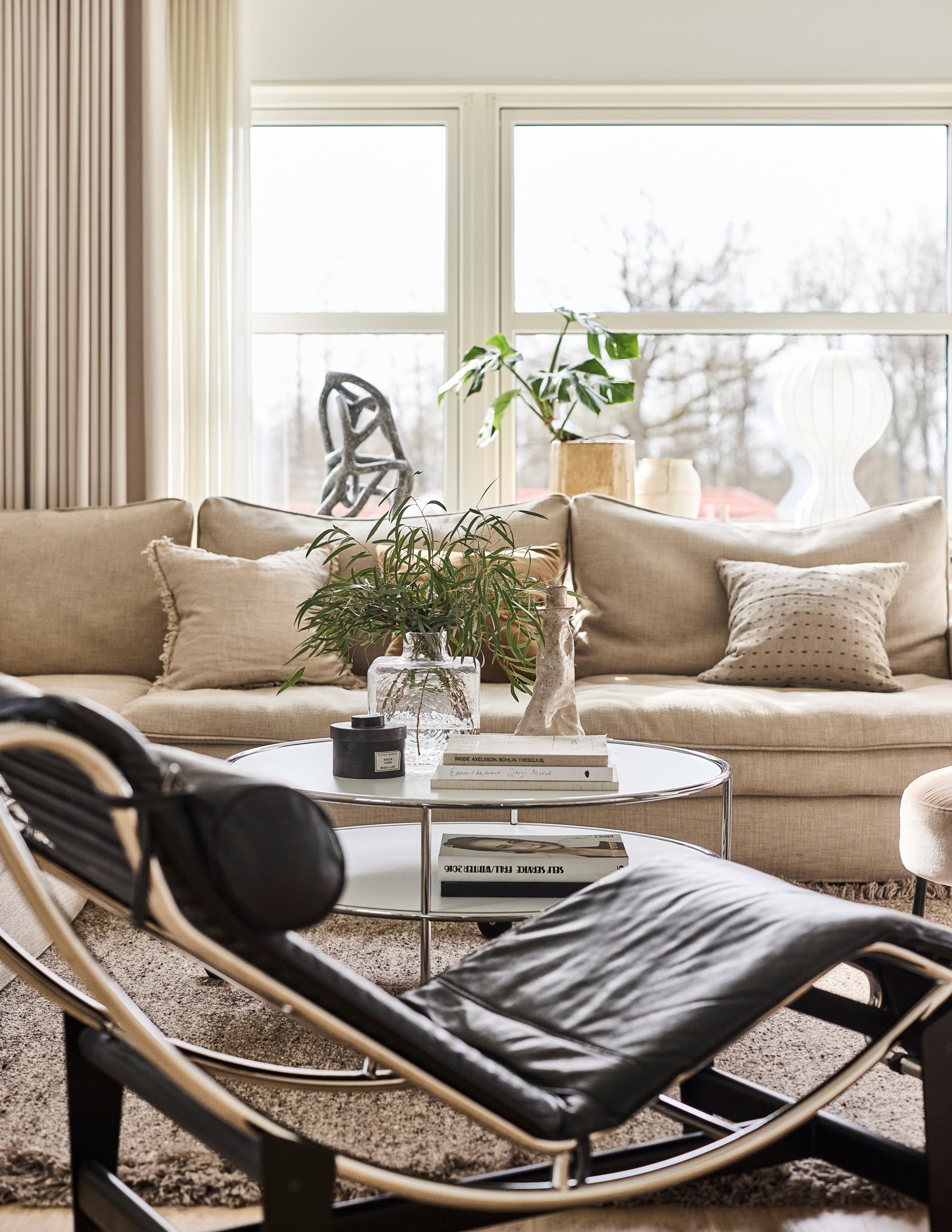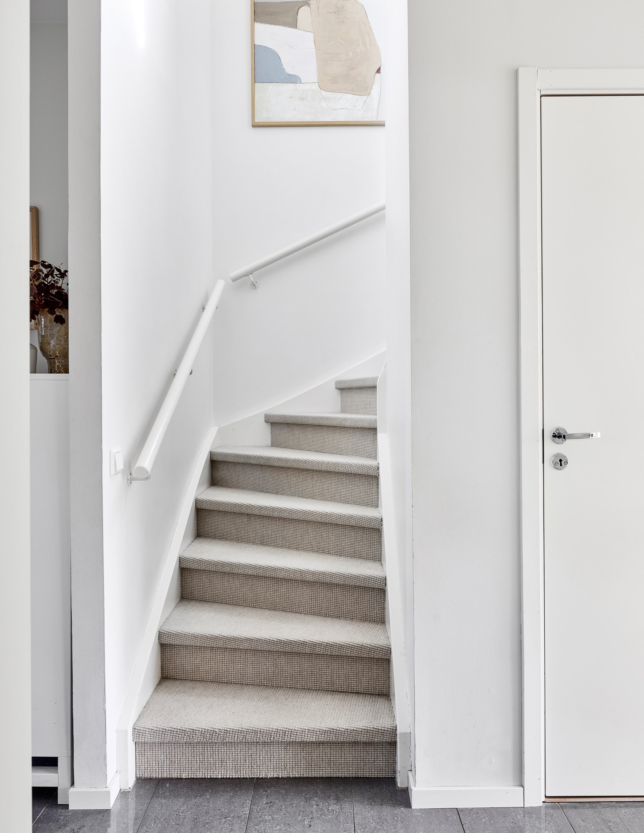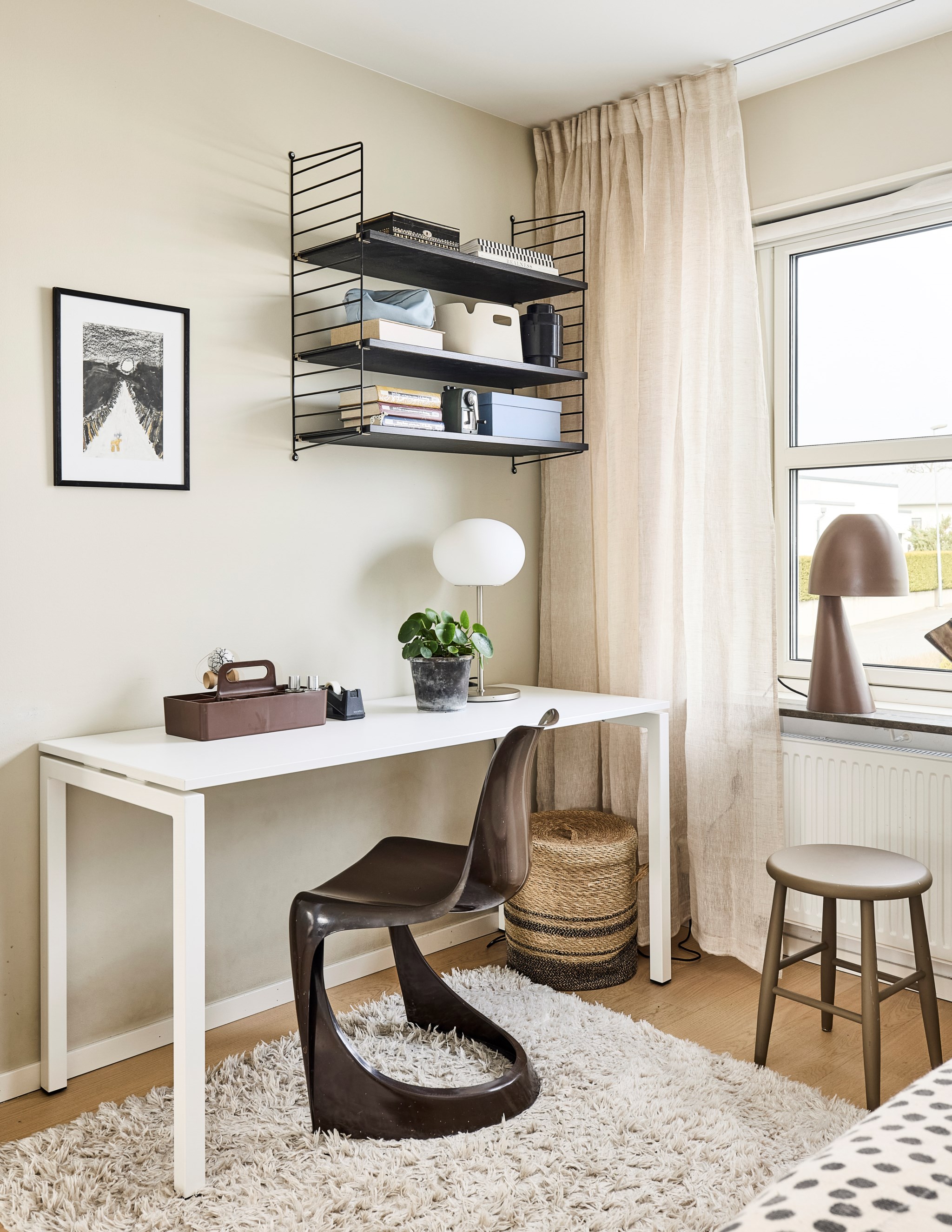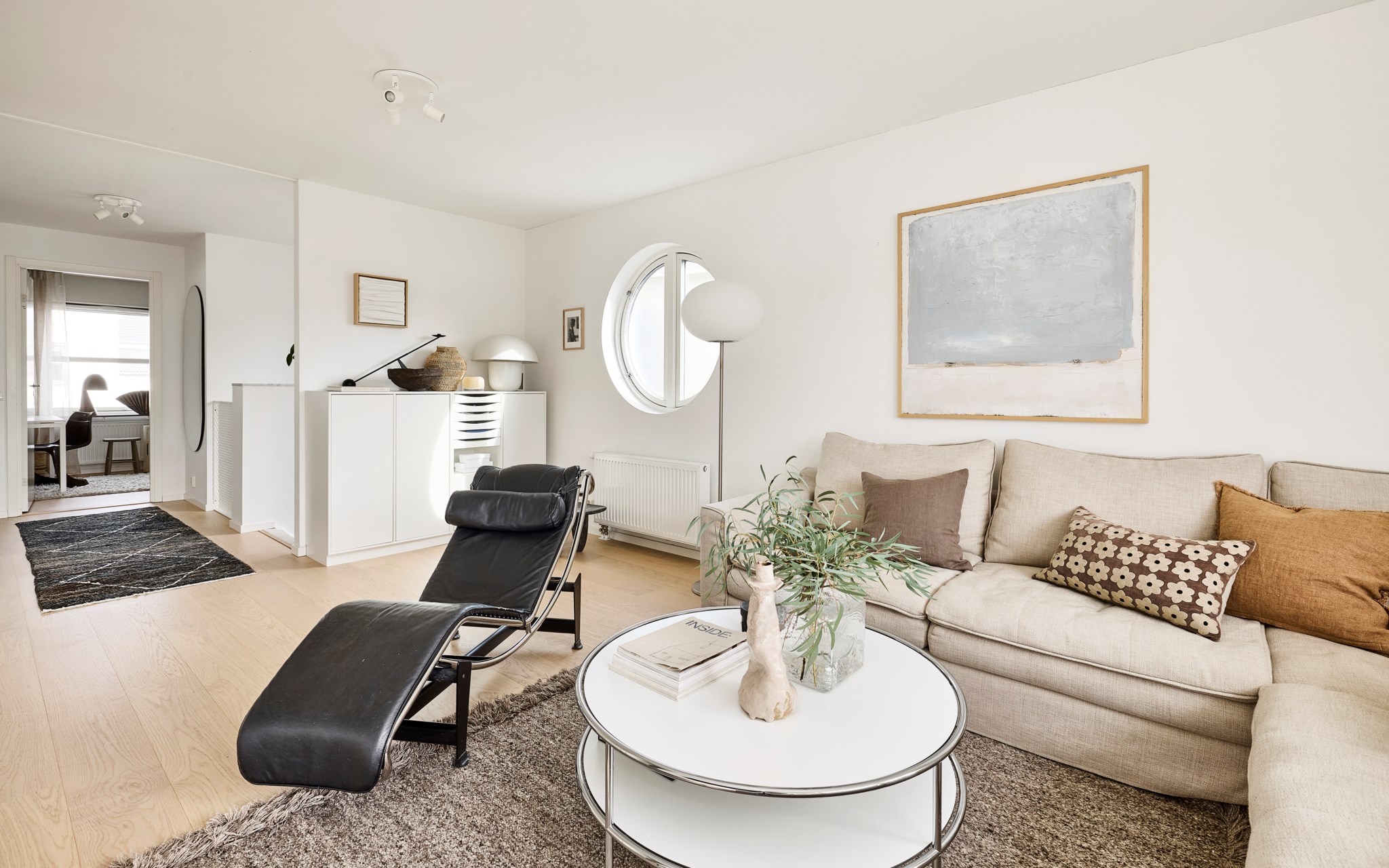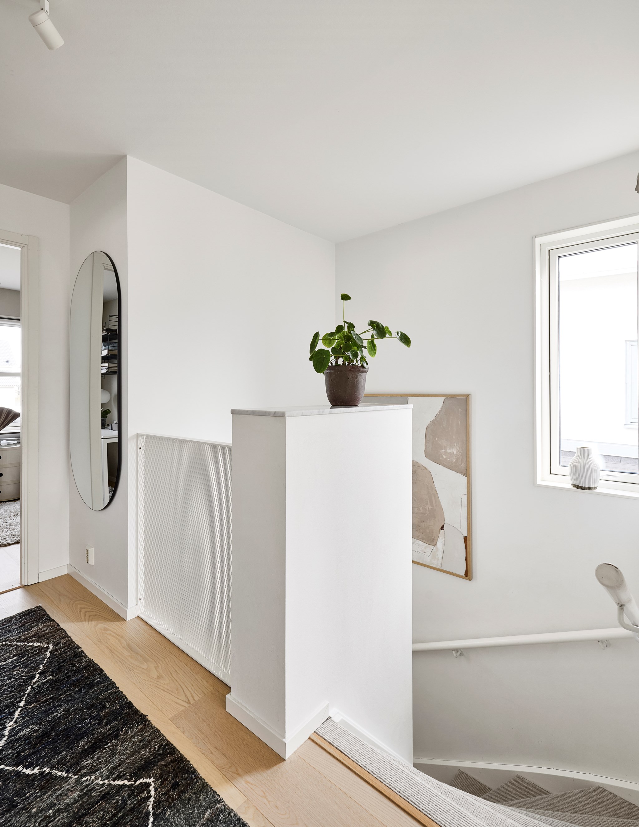 Trappan upp är ett bländverk i vitt, knappt en skråma i väggarna trots tre barns växtkraft de senaste åren. Snyggt med fönster även i trappan som toppas av en ljus marmorskiva. Uppe hamnar vi nästan i en kopia av vardagsrummet nere. Soffa, tv, läsfåtöljer, bäddsoffa – inred som du vill och behöver. Skulle det behövas ytterligare ett sovrum är det här du delar av. Det finns plats för ett hemmakontor ändå vid det runda fönstret som överraskar både på insidan och ute på den strama fasaden. Arkitekten Susanne Tolbo fick som hon ville.