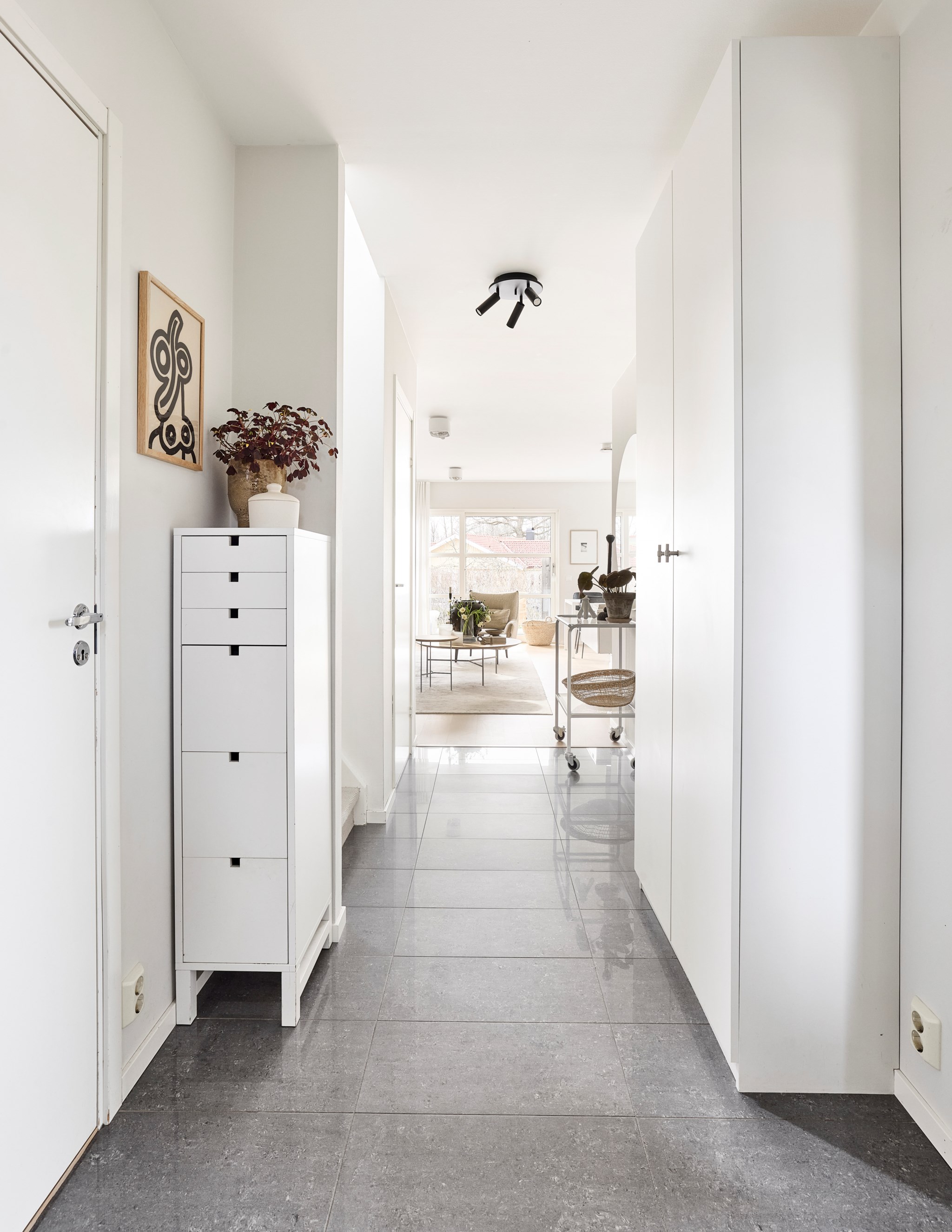 Här har du knappt kommit in förrän blicken letar sig ut rätt igenom huset på andra sidan. Golvvärme på hela bottenvåningen är skönt för fötterna, och för blicken som slipper element. Ett arbetsrum till höger och liten tvättstuga till vänster. Under trappan har du dessutom ett praktiskt utrymme som ägarna förädlat för att hantera husets skobestånd och hel del annat som tre barn behöver. Slitstarkt klinker långt in på golvet mot köket. Sen är det nyare ljus ekparkett som gäller i hela huset.