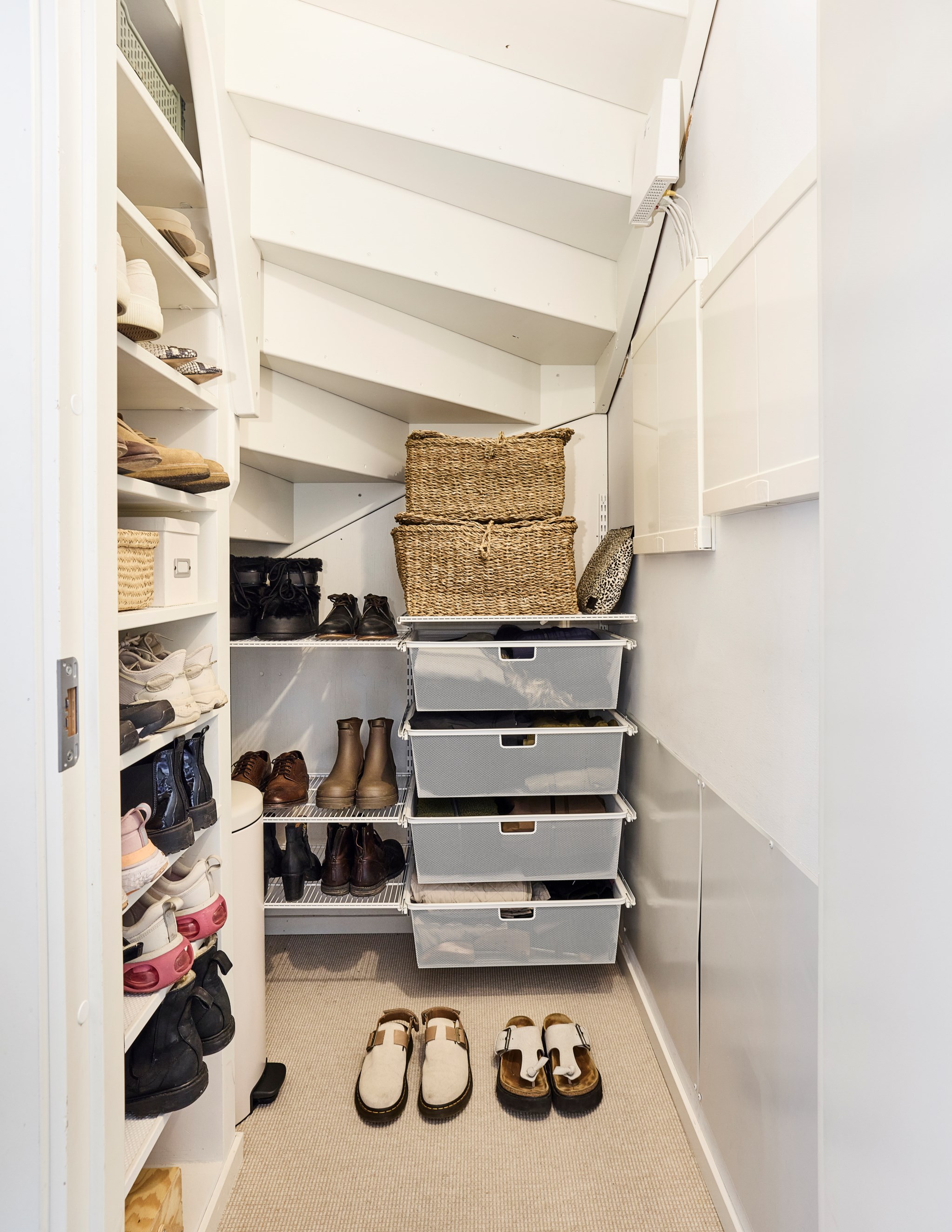 Bara att lasta och stuva in tills dörren bågnar, men sen får det nog bli några lass till Erikshjälpen. Att hålla pedantisk ordning som i de glassiga inredningstidningarna är kanske utopiskt, men man kan ju göra ett försök så länge det bara finns ett barn. Tänk på att du har ett rymligt varmförråd bakom carporten också, där du kan ha lite grövre prylar som du inte behöver varje dag.
