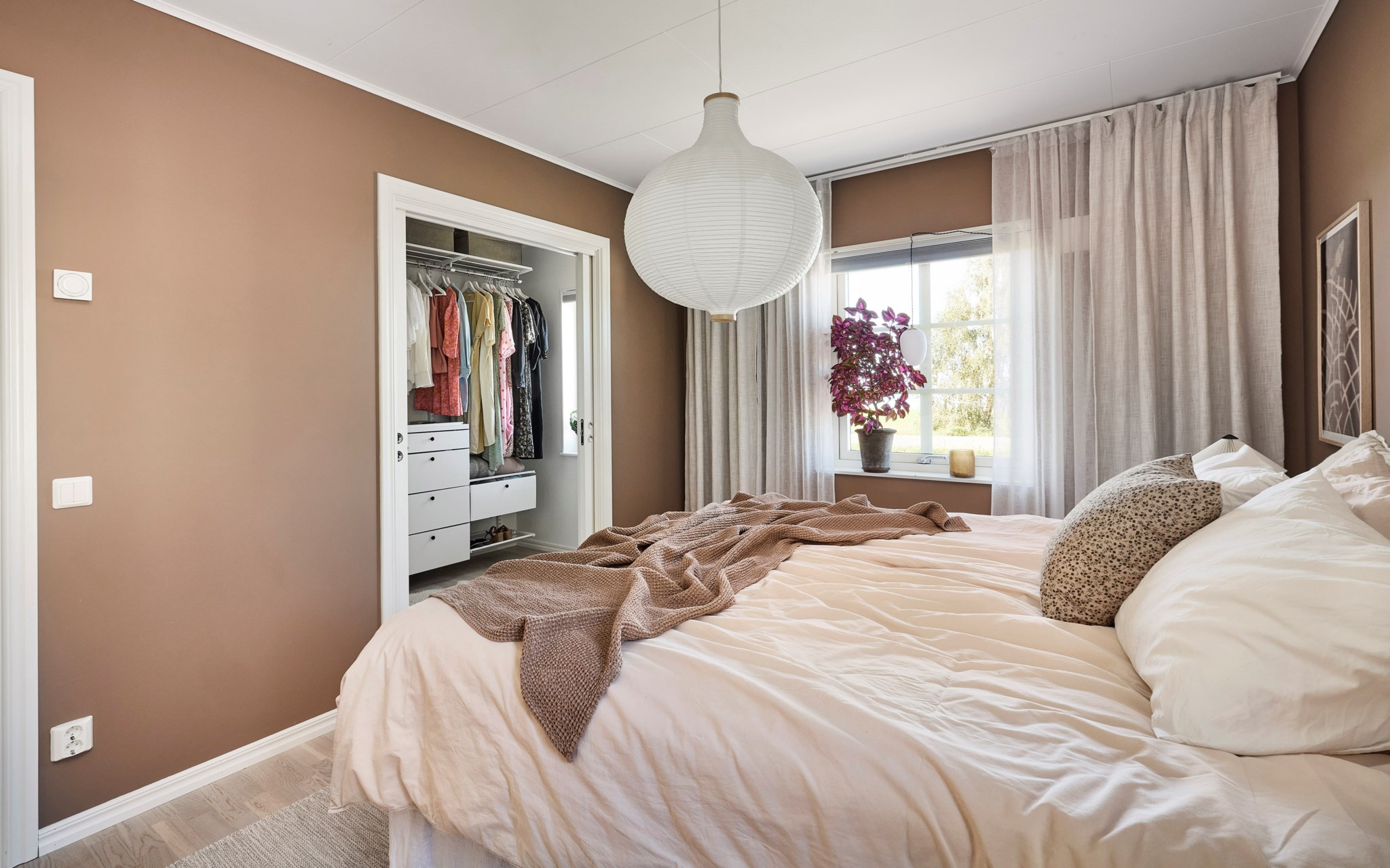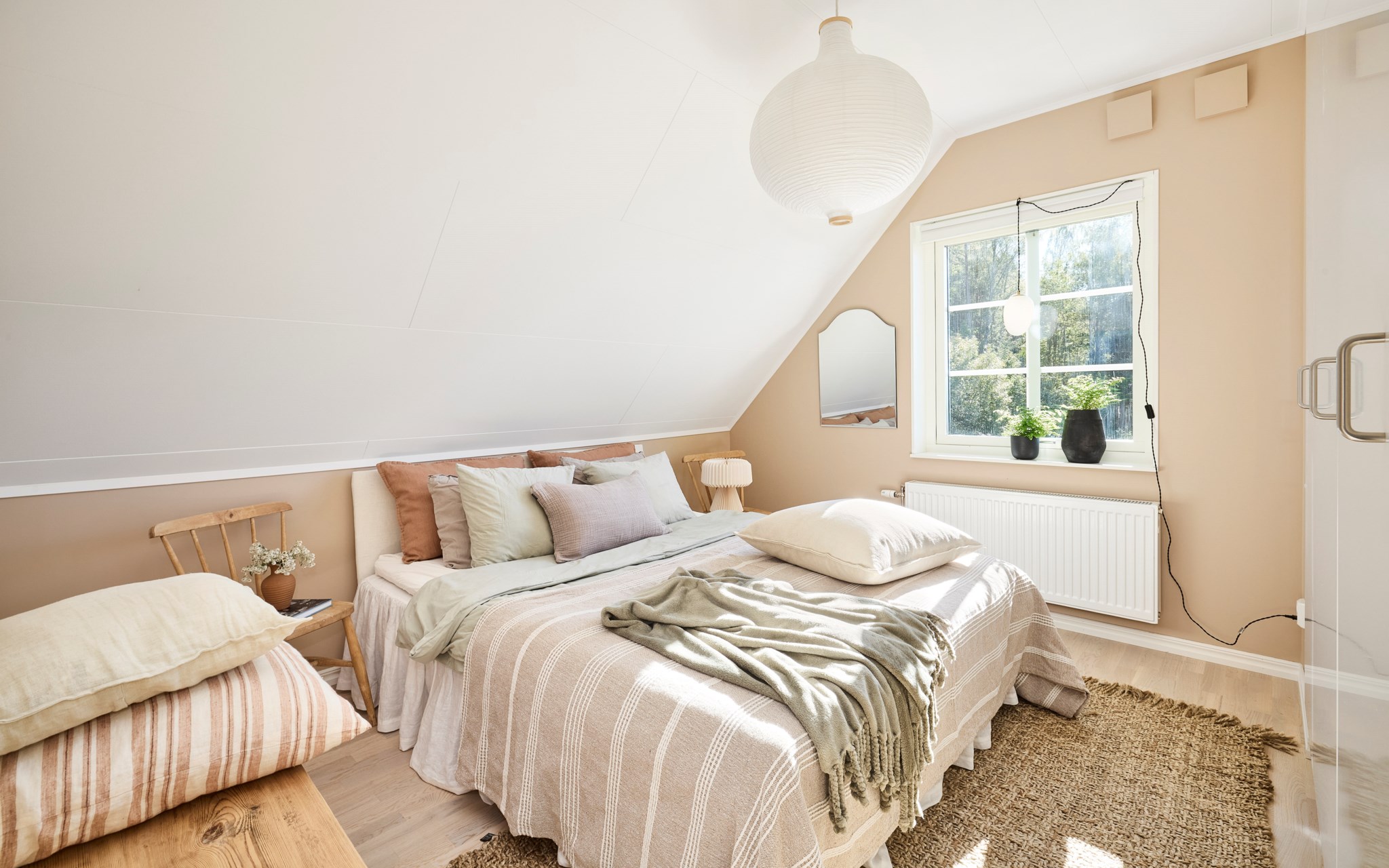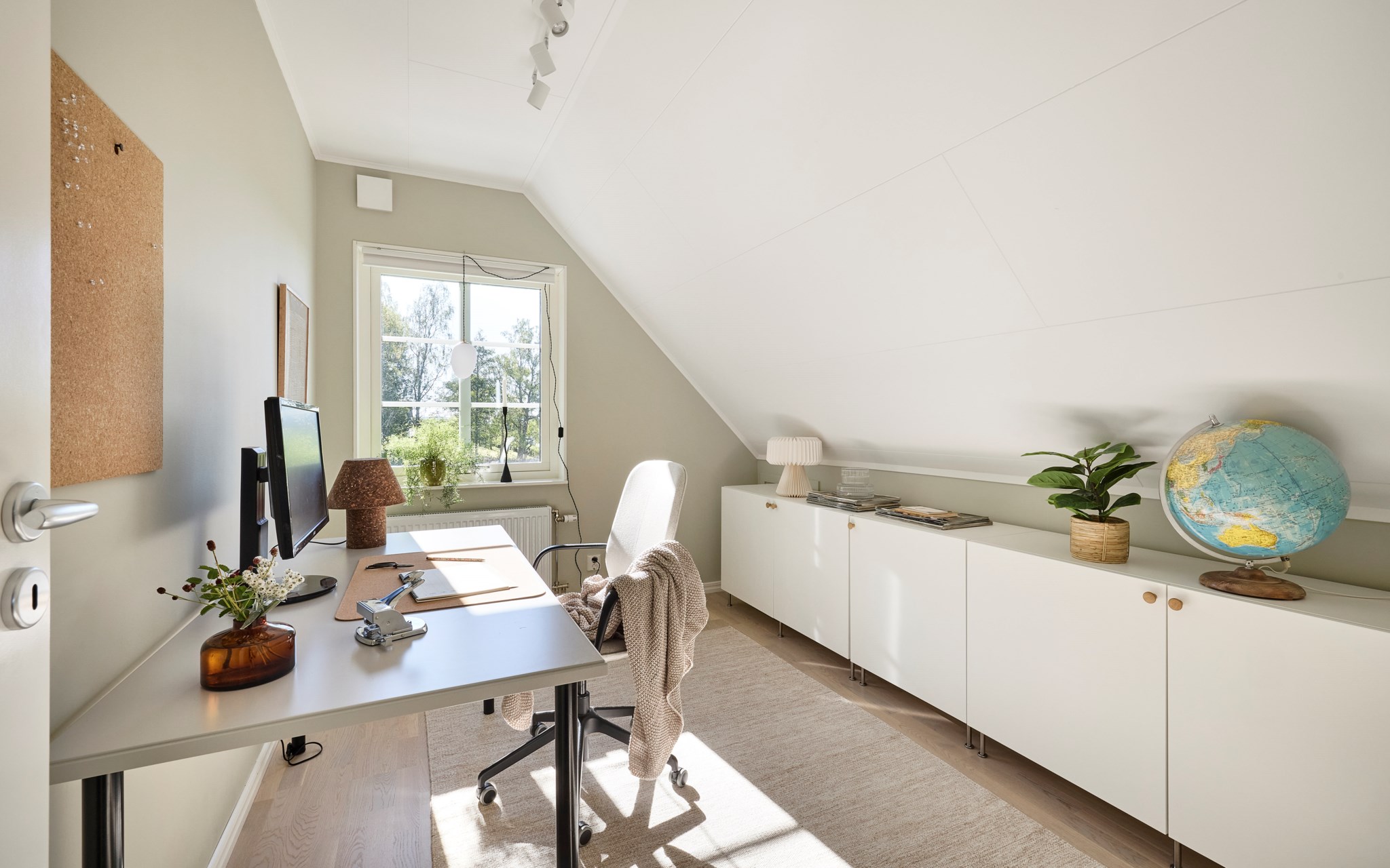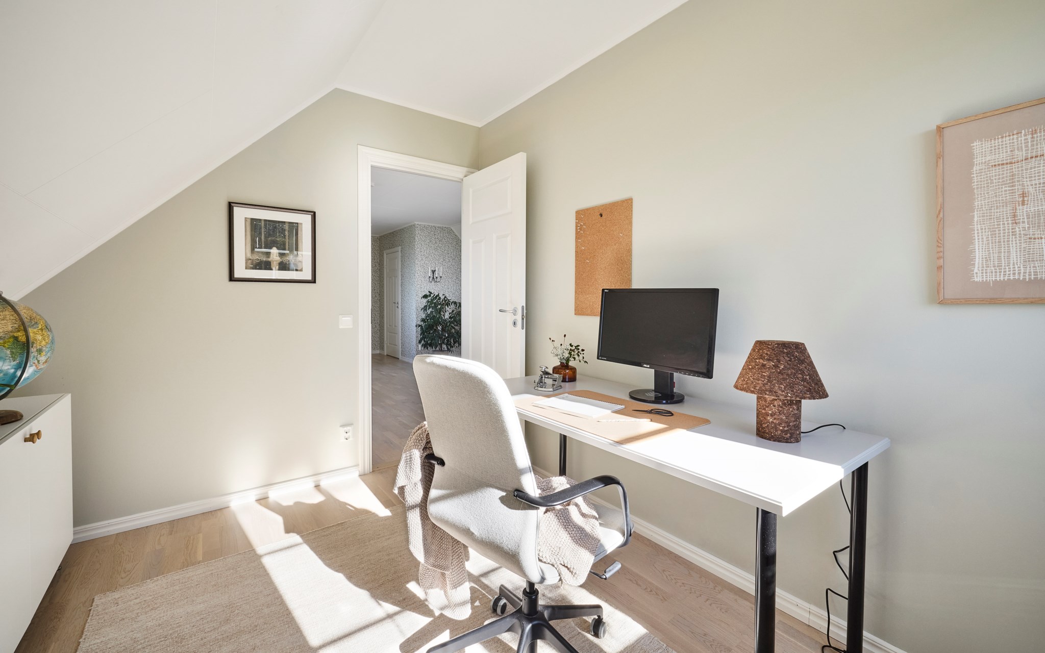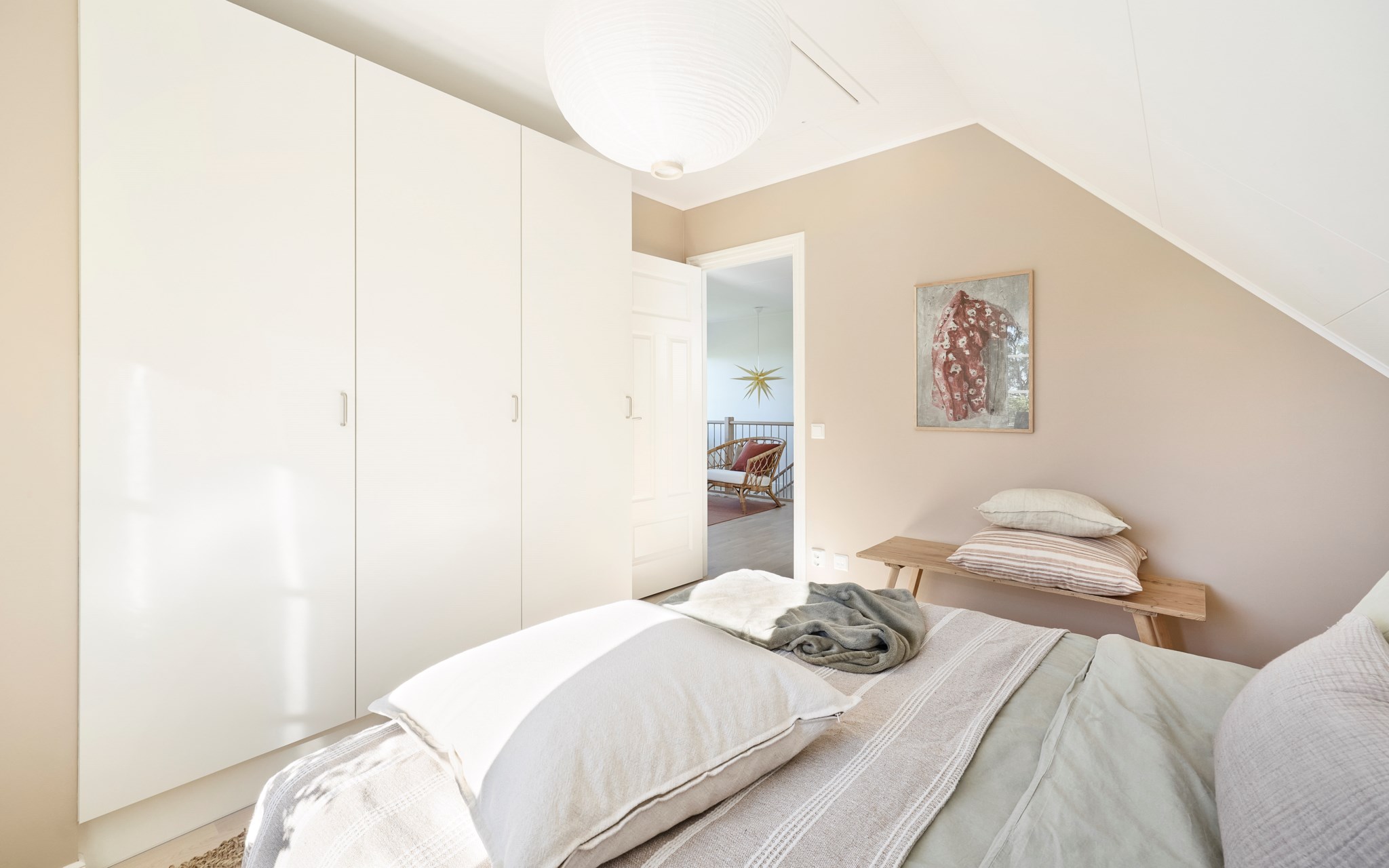 Fyra sovrum totalt i huset, tre uppe och ett stort nere med egen snofsig walk in closet. Här får du fönster i två väderstreck, ett stort och två små, det ena har du i siktlinjen redan från vardagsrummet. Sovrummen uppe drar full nytta av att huset är byggt med förhöjt väggliv, vilket innebär att snedtaket i dessa tre sovrum inte stjäl mycket av golvytan. Smidigt att ställa sängen på ena eller andra ledden in i den lägre delen. Två rum mot söder där det ena är lite större än det andra, samt ett sovrum mot norr. Samma ljusa kvistfria ekgolv uppe som i resten av huset.