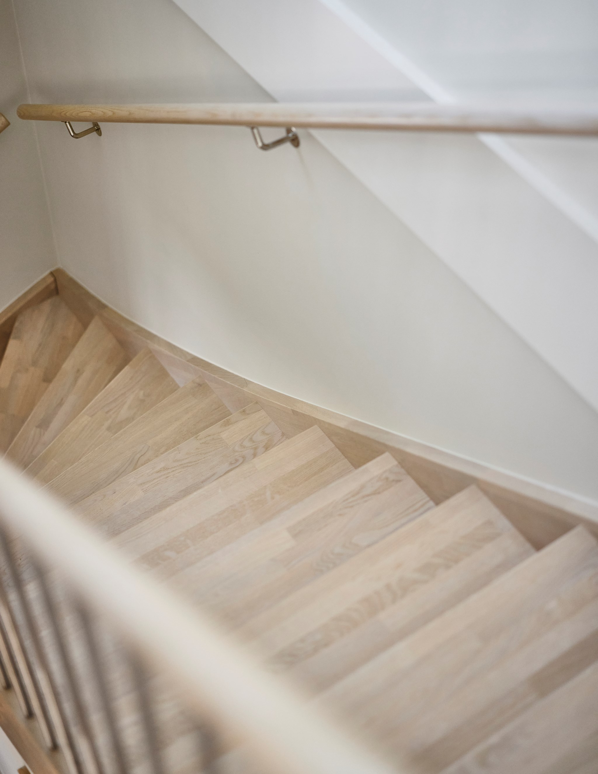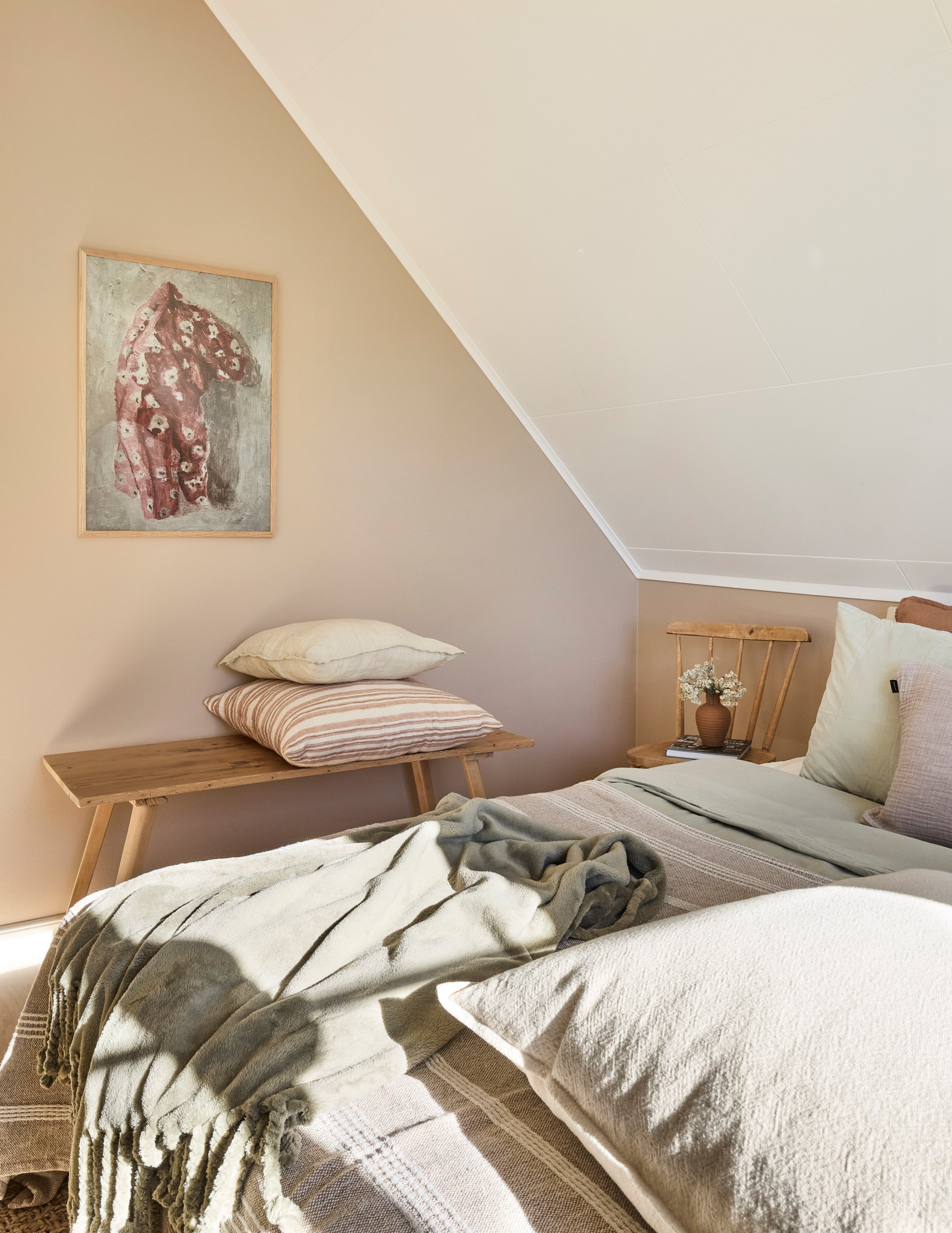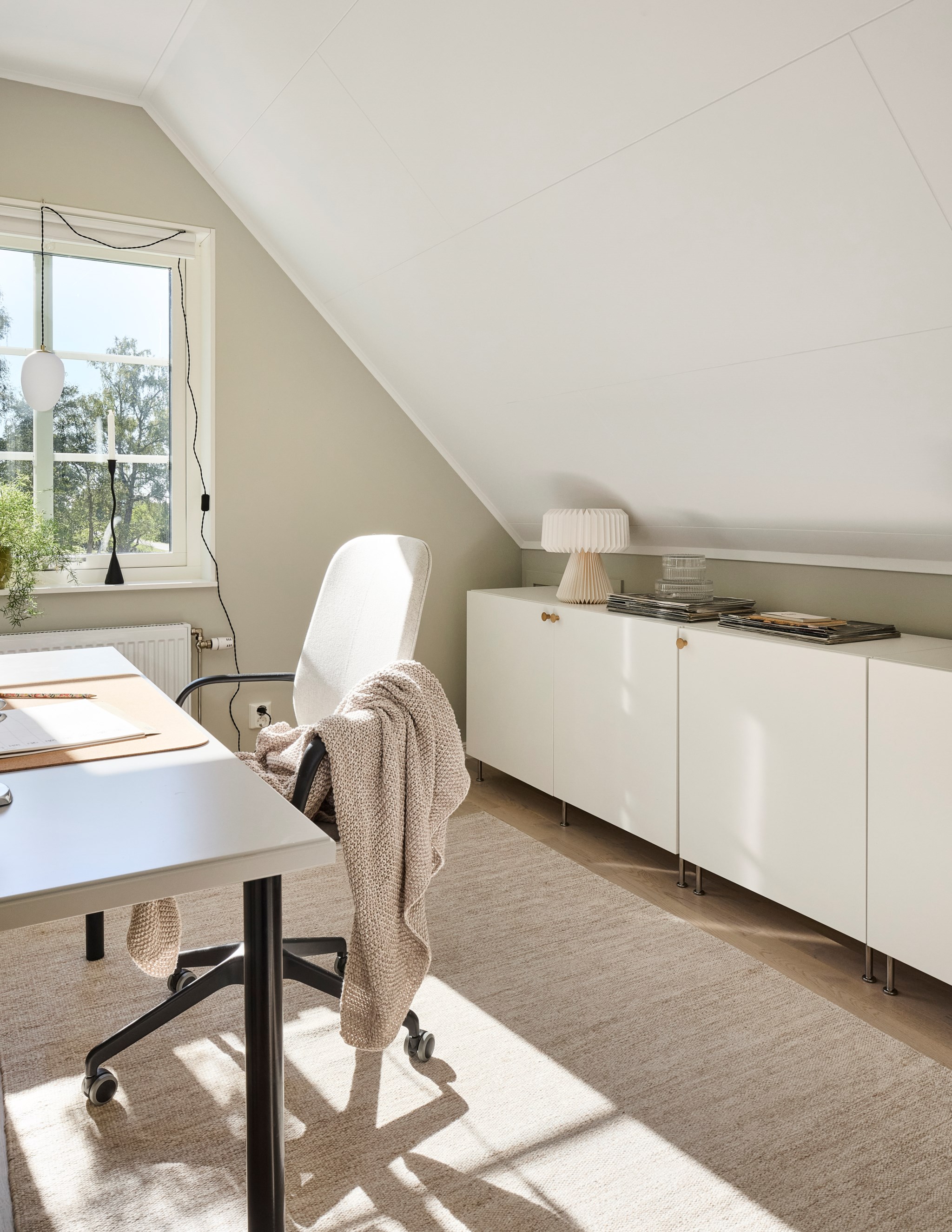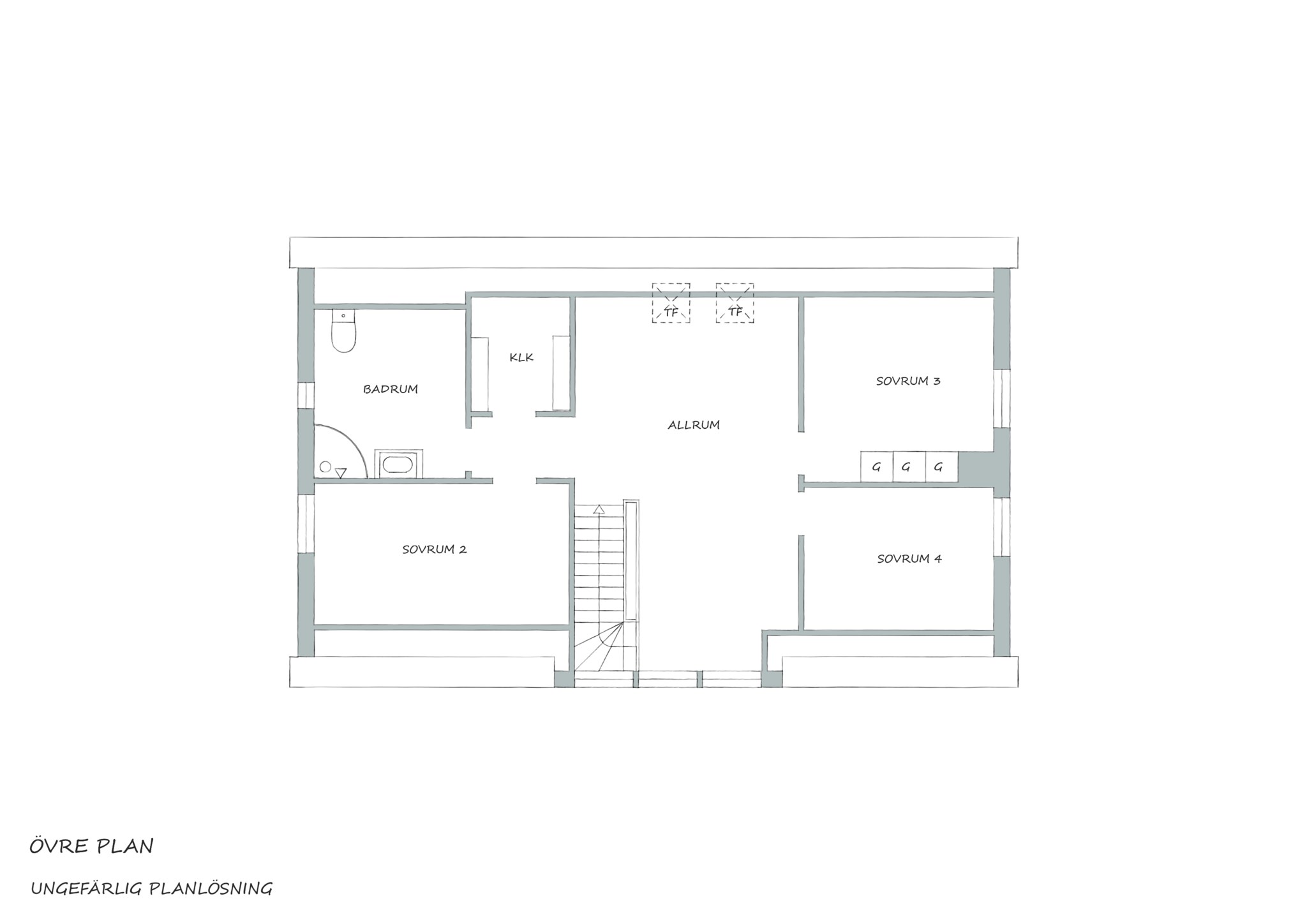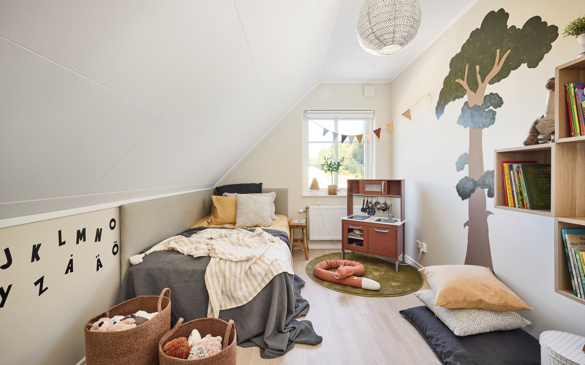 Fyra sovrum totalt i huset, tre uppe och ett stort nere med egen snofsig walk in closet. Här får du fönster i två väderstreck, ett stort och två små, det ena har du i siktlinjen redan från vardagsrummet. Sovrummen uppe drar full nytta av att huset är byggt med förhöjt väggliv, vilket innebär att snedtaket i dessa tre sovrum inte stjäl mycket av golvytan. Smidigt att ställa sängen på ena eller andra ledden in i den lägre delen. Två rum mot söder där det ena är lite större än det andra, samt ett sovrum mot norr. Samma ljusa kvistfria ekgolv uppe som i resten av huset.