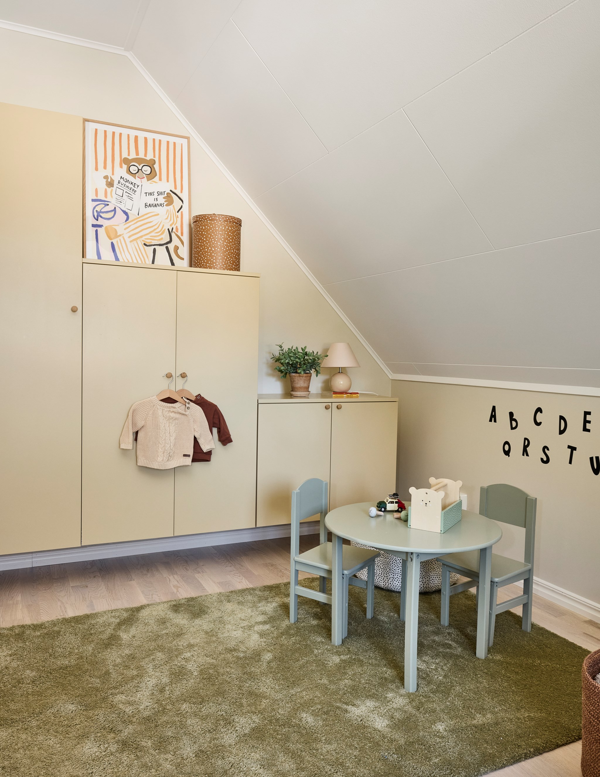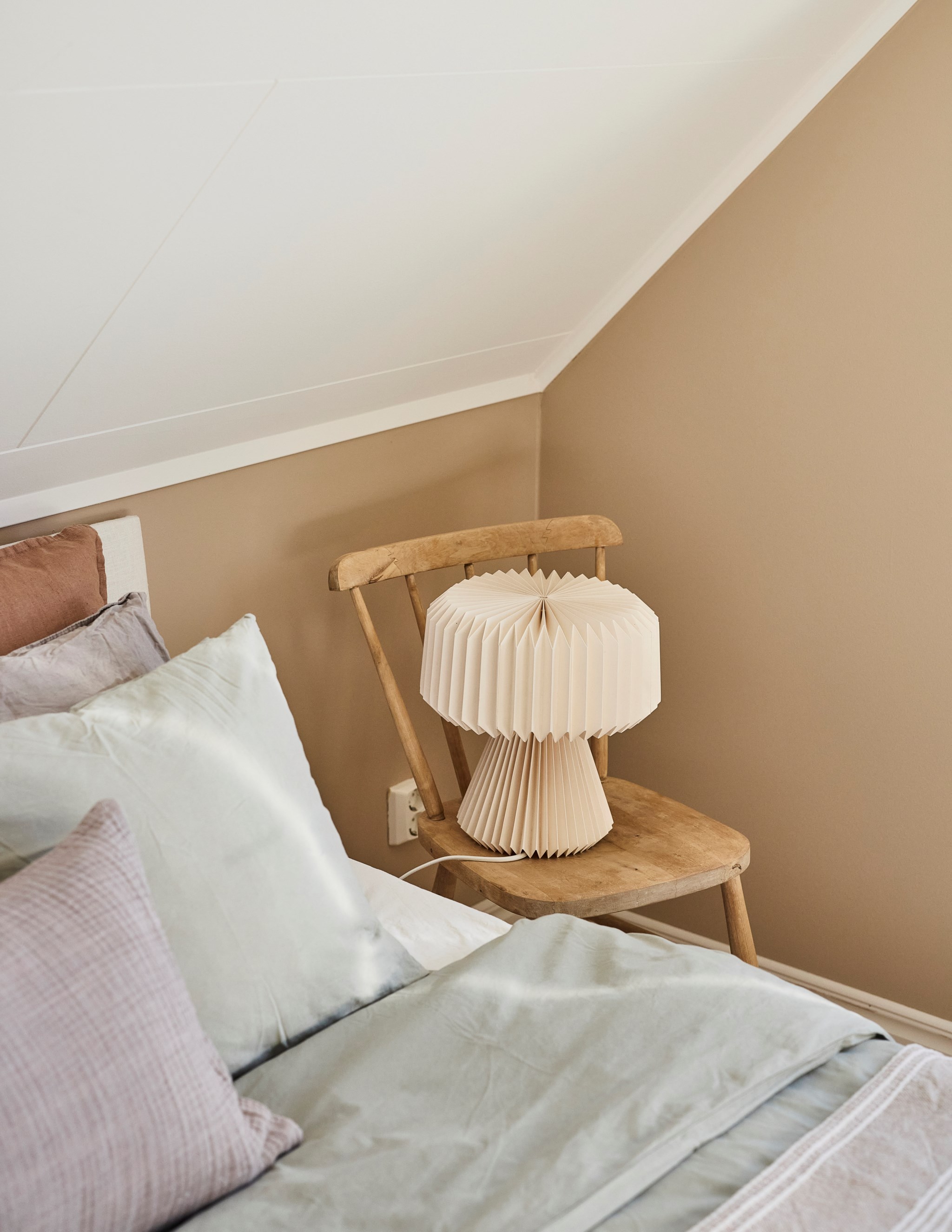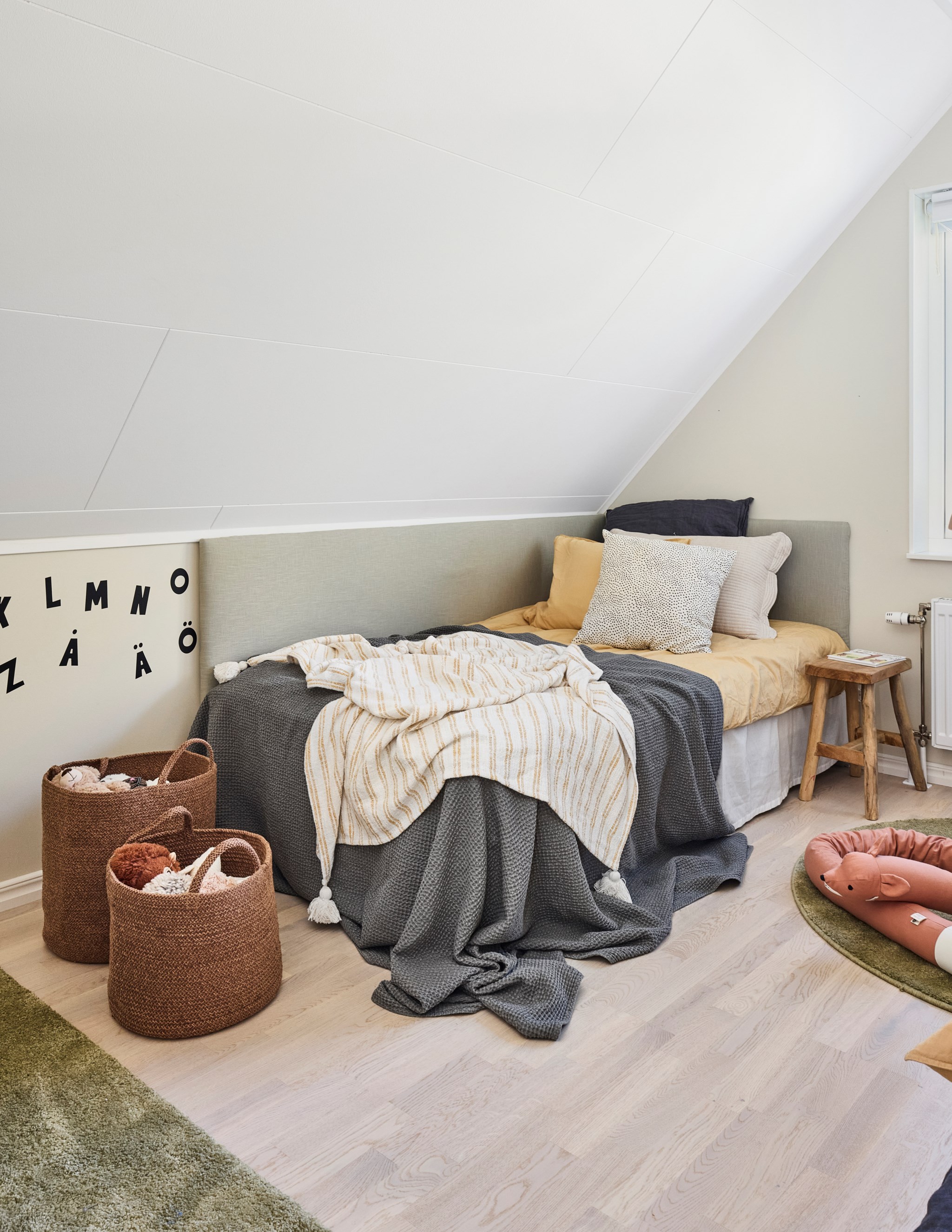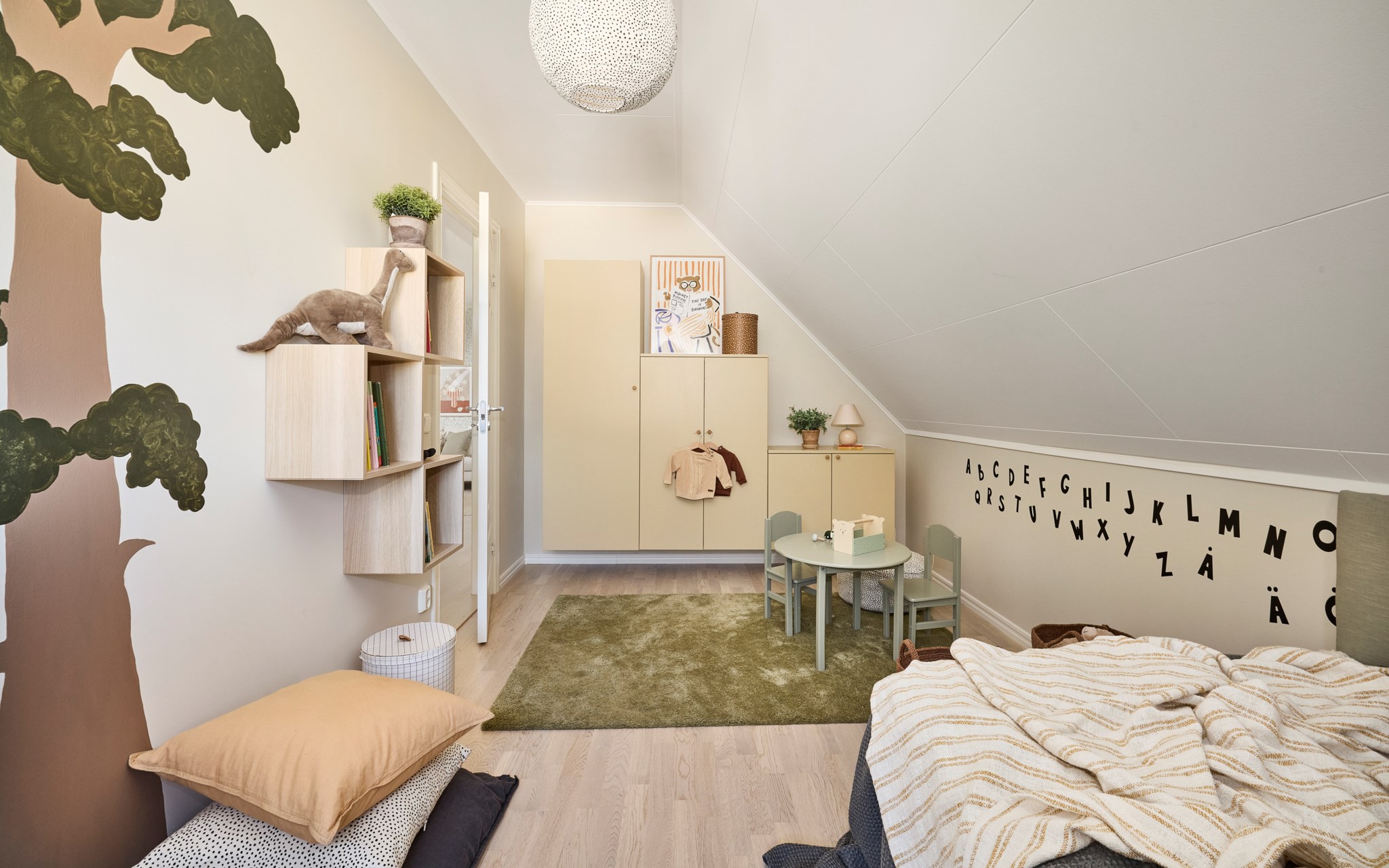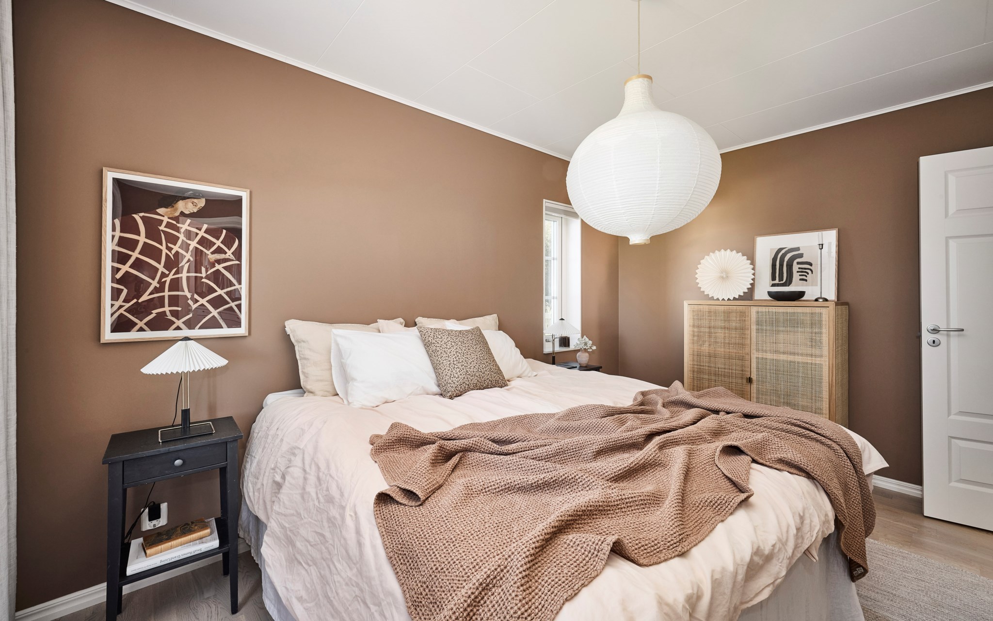Fyra sovrum totalt i huset, tre uppe och ett stort nere med egen snofsig walk in closet. Här får du fönster i två väderstreck, ett stort och två små, det ena har du i siktlinjen redan från vardagsrummet. Sovrummen uppe drar full nytta av att huset är byggt med förhöjt väggliv, vilket innebär att snedtaket i dessa tre sovrum inte stjäl mycket av golvytan. Smidigt att ställa sängen på ena eller andra ledden in i den lägre delen. Två rum mot söder där det ena är lite större än det andra, samt ett sovrum mot norr. Samma ljusa kvistfria ekgolv uppe som i resten av huset.