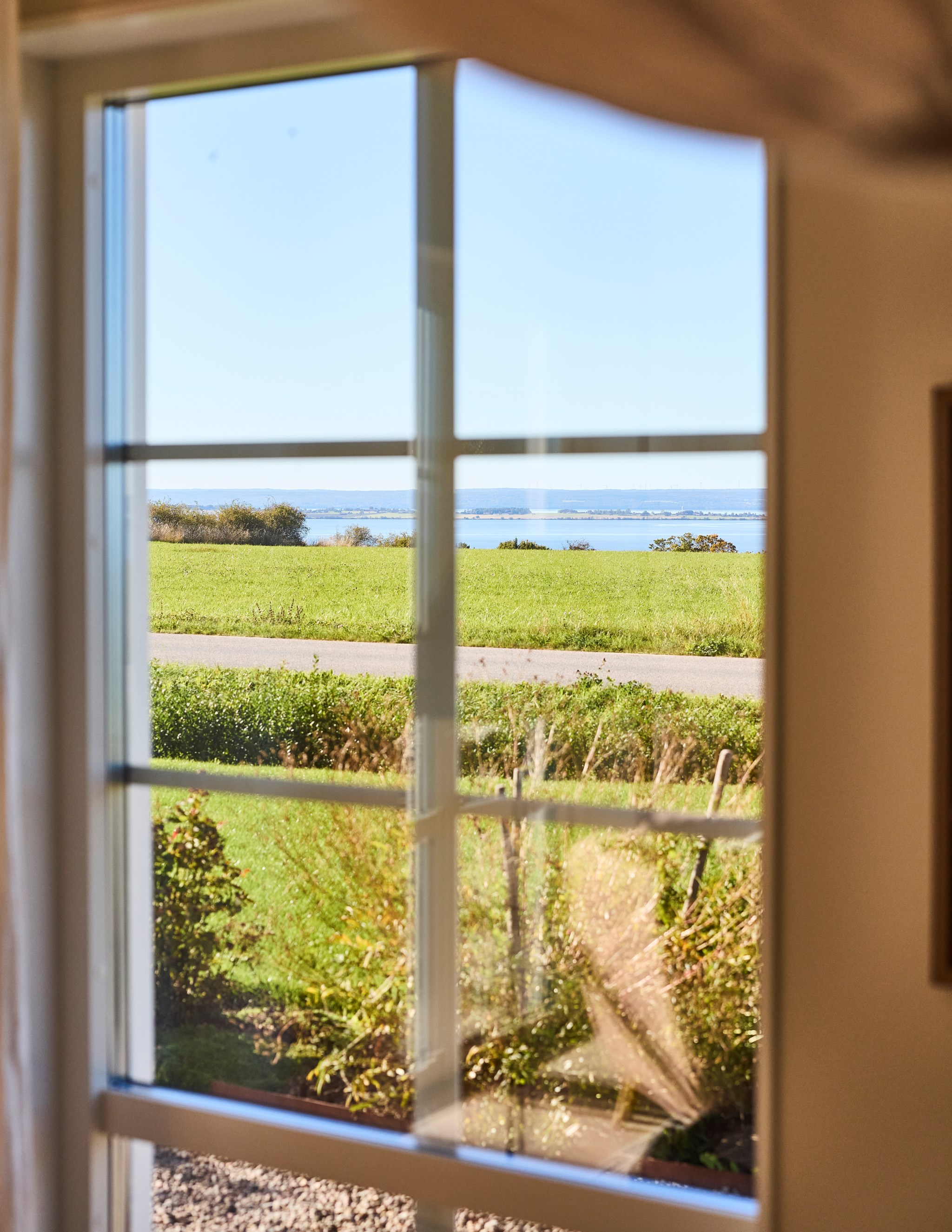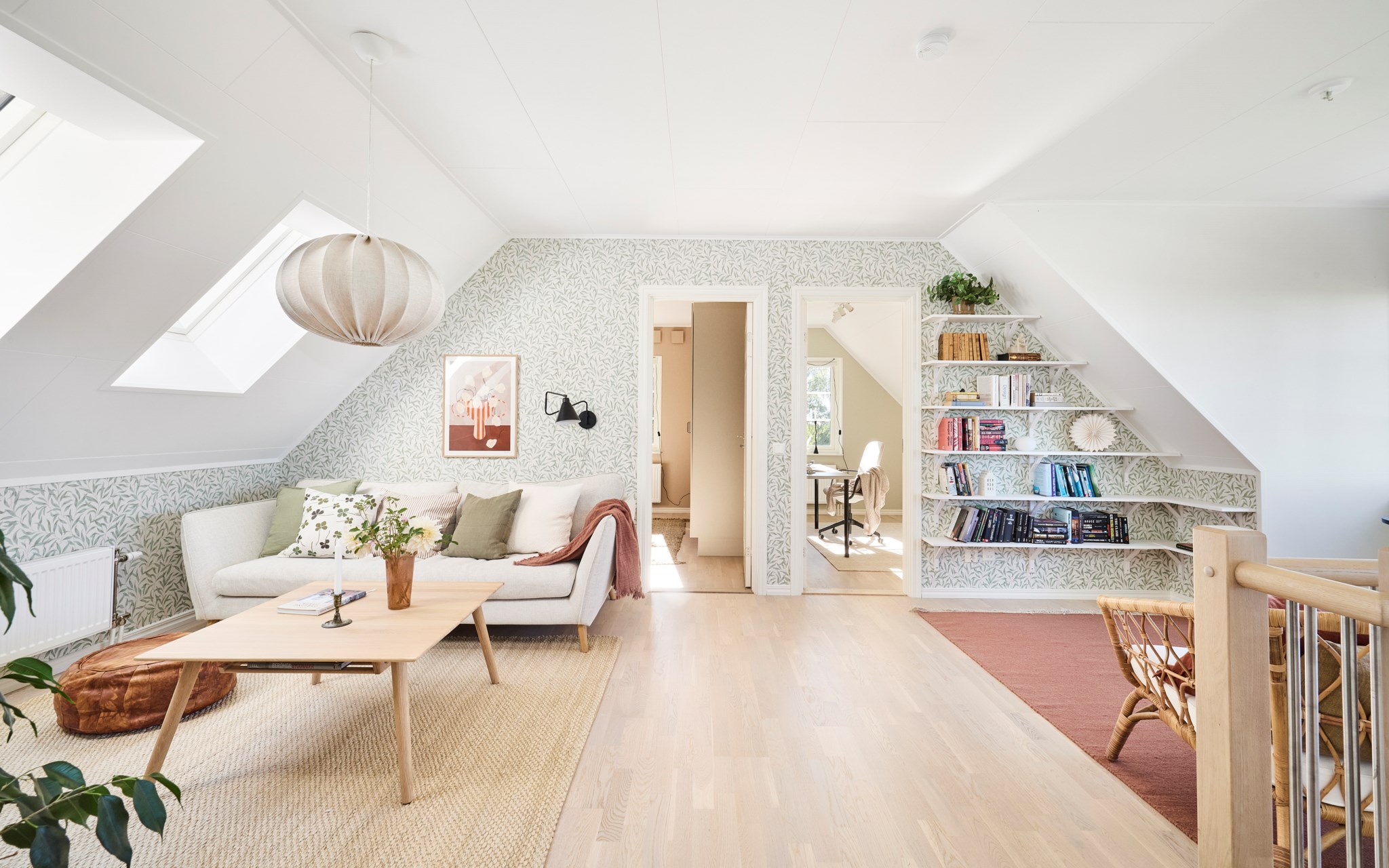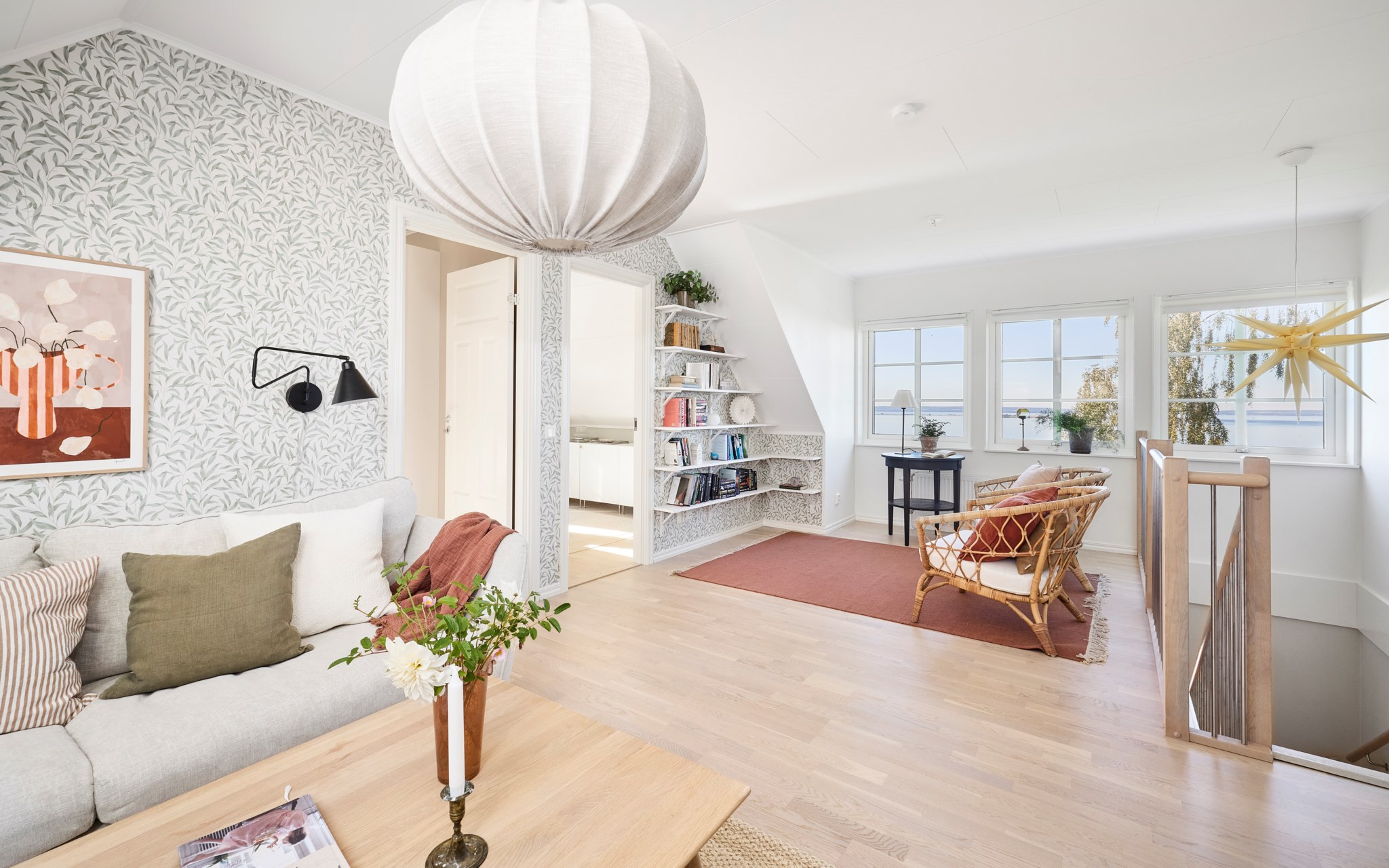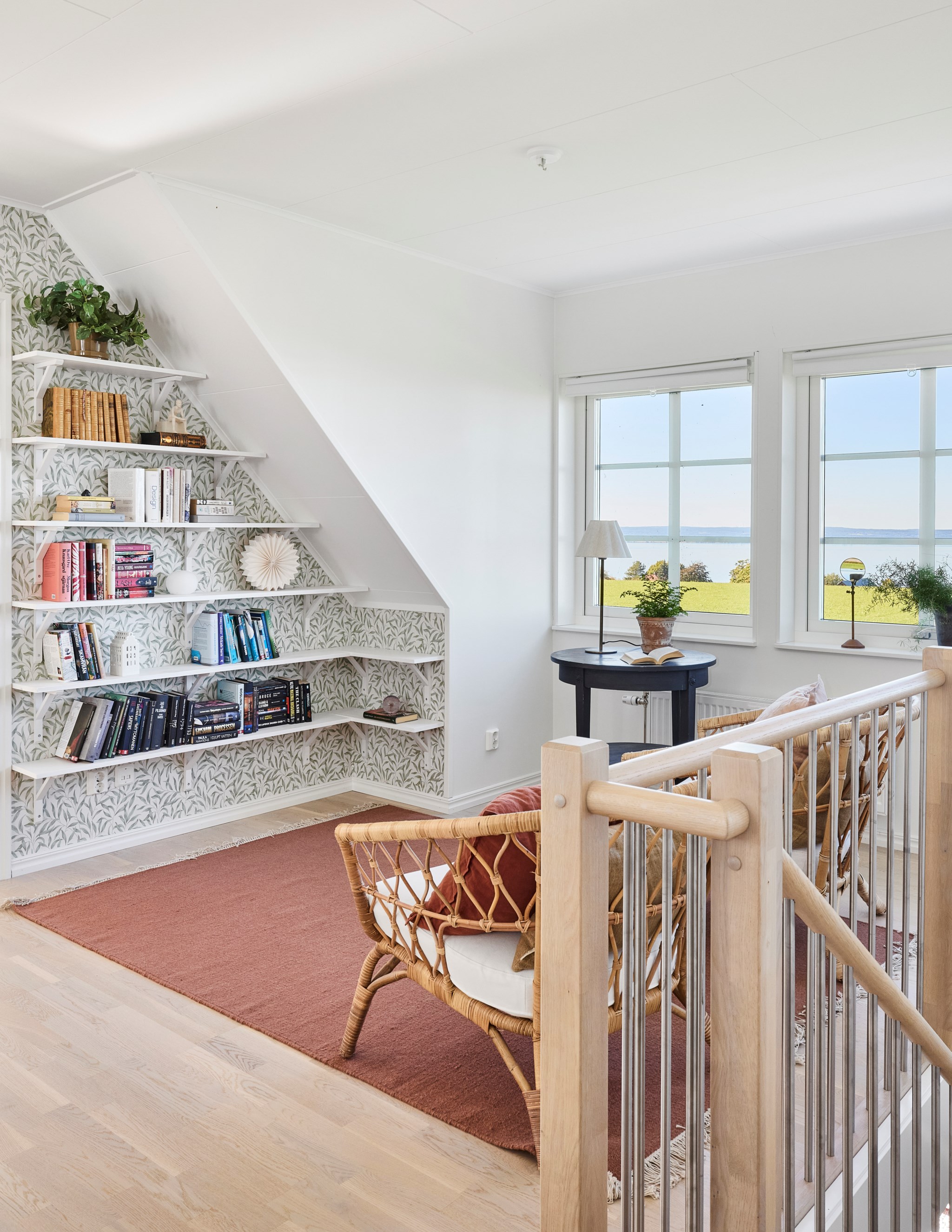 Trappan svänger upp som en rabatt mot ljuset. Och ja, allrummet uppe är som ett växthus. Tre stora fönster i kupan som bryter upp det redan höga snedtaket. Öppet upp i nock vilket borde innebära en bit över tre meter. Upp mot berget istället två höga öppningsbara takfönster där du kan se rätt upp i det blå och upp i den stjärnbeströdda vinternatten. Samma ljusa golv här, samma väl valda innerdörrar som i resten av huset. Vi behöver inte orda så mycket mer om utsikten nu, du har fattat.