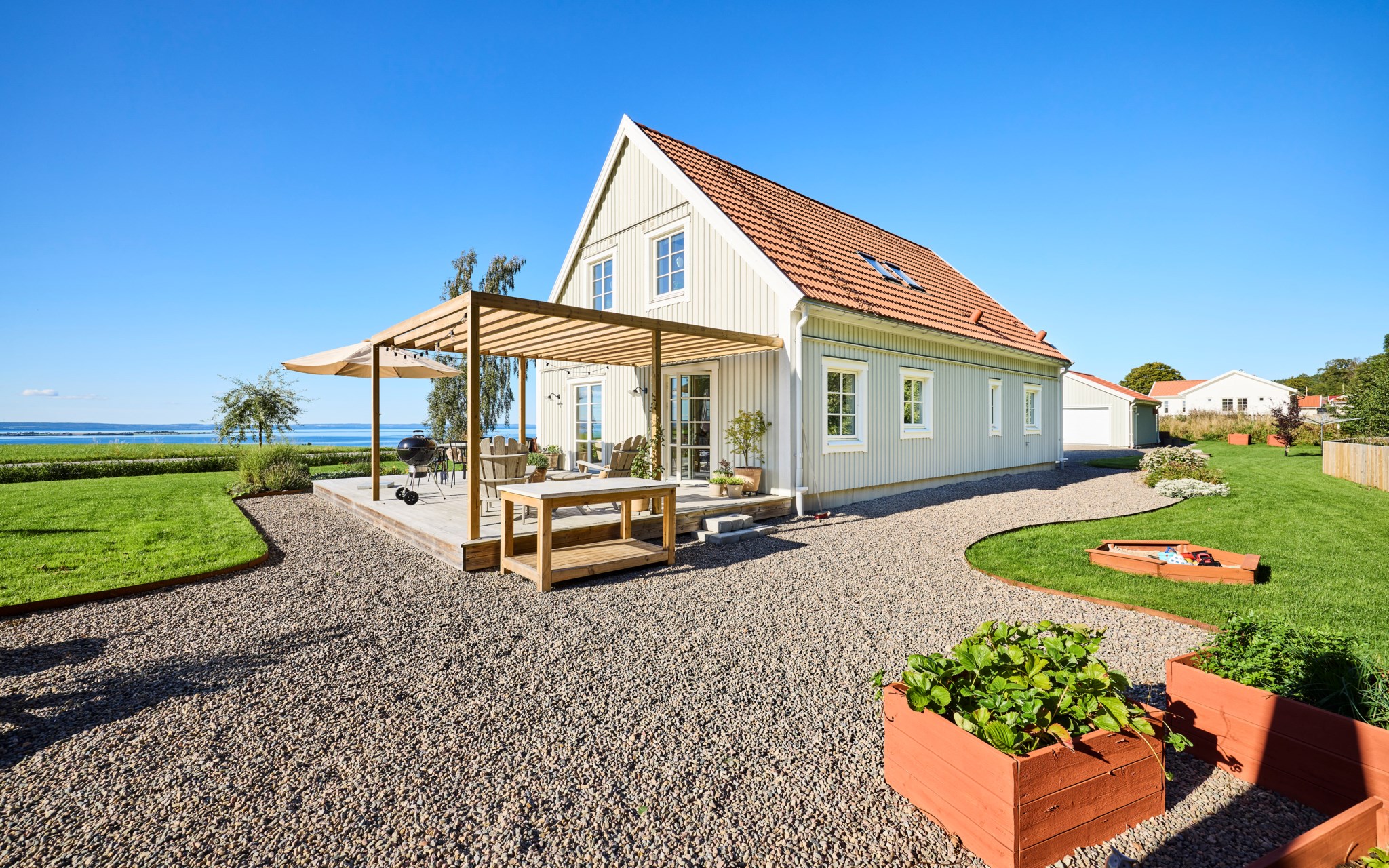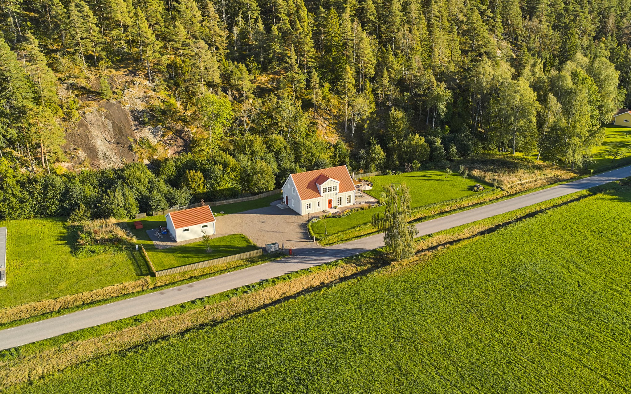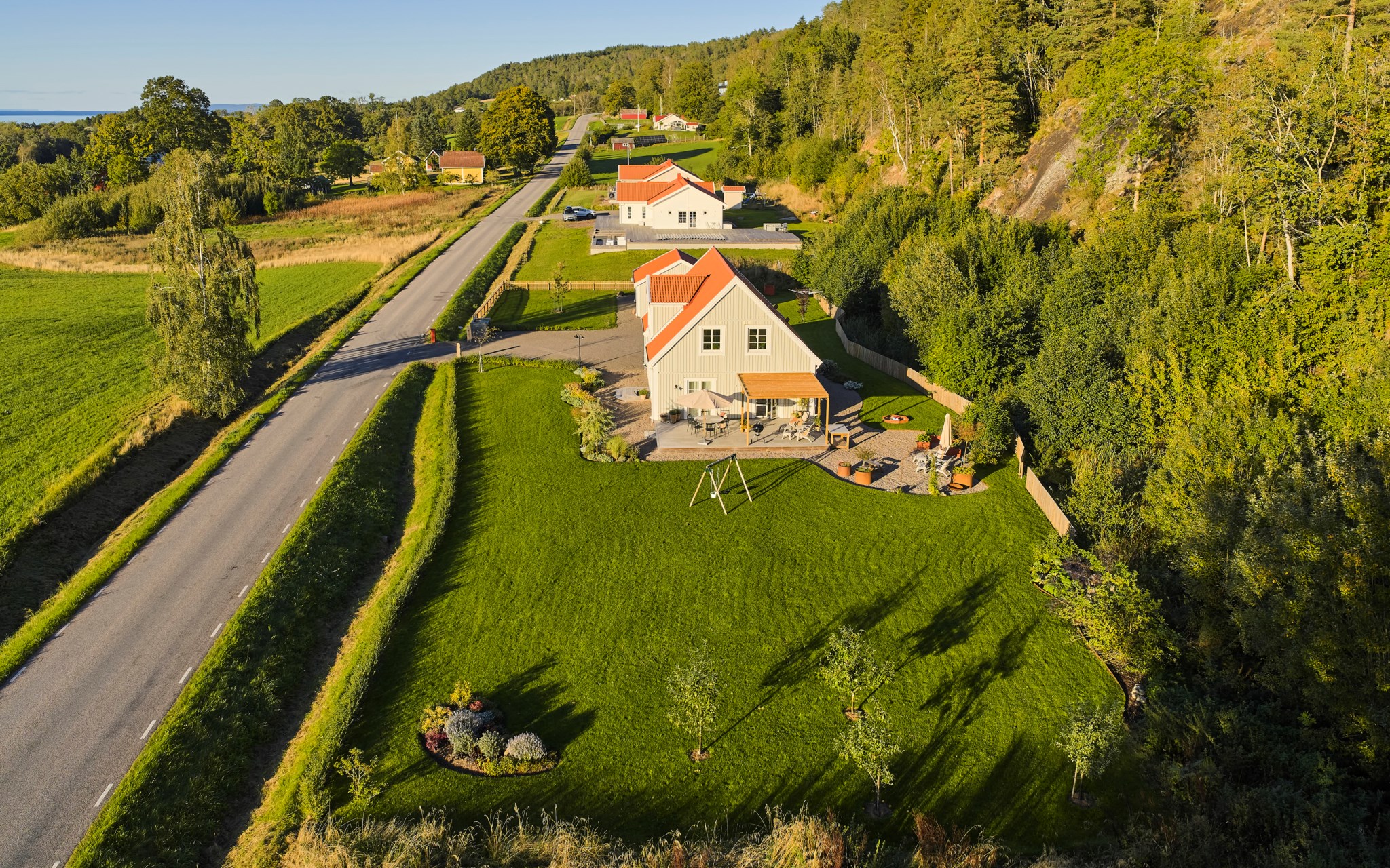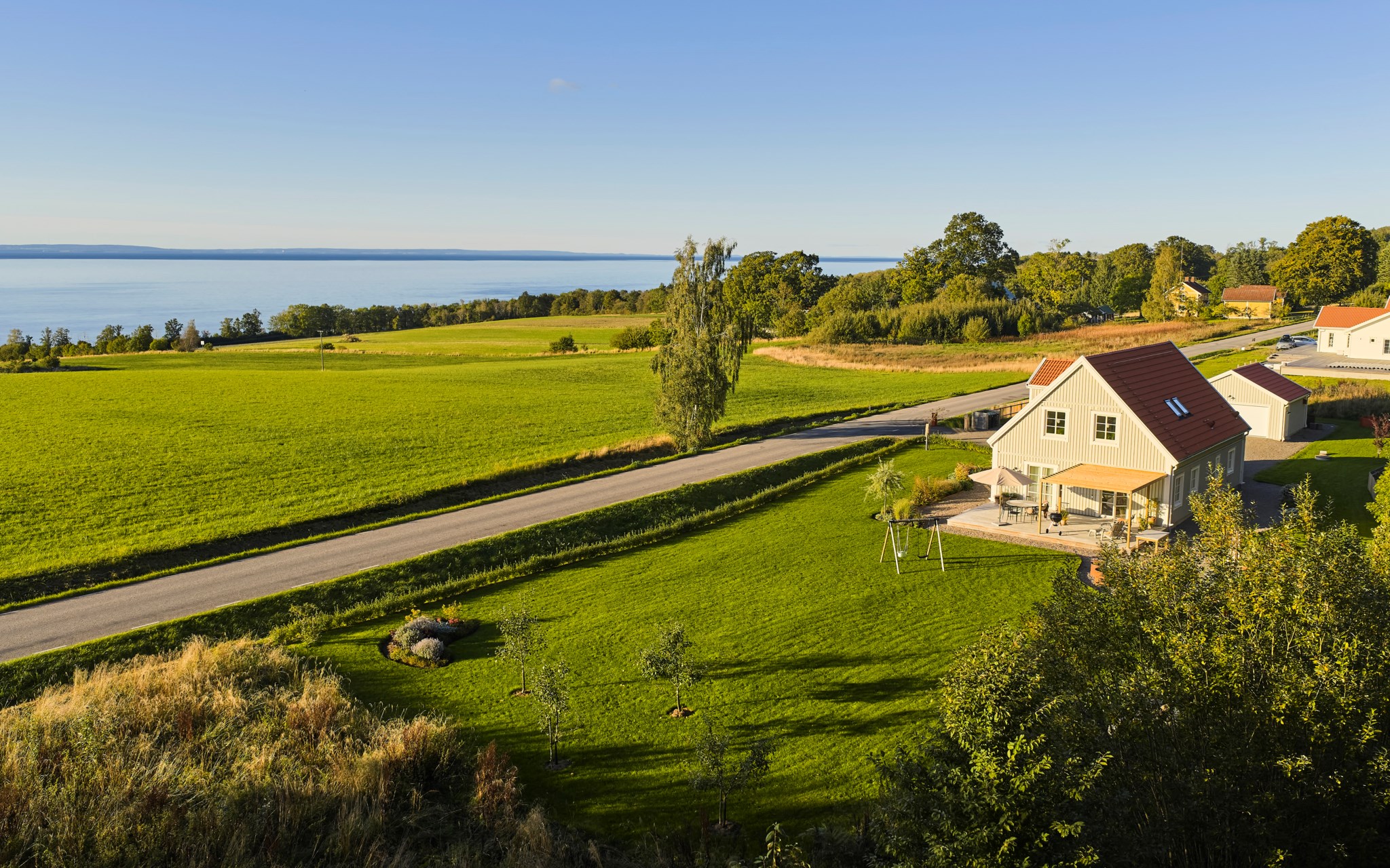 Villan stod klar på denna maffiga tomt så sent som 2020. Men inte bara utsikten som är maffig utan vi snackar om cirka 3000 kvadrat tomt dessutom. Huset byggt på gjuten platta med vattenburen golvvärme och med radiatorer en trappa upp. Huset byggt och levererat av Myresjöhus och modellen heter Smart. Nuvarande ägare har gjort en hel del förändringar i interiören utifrån grundplanen, bland annat en större samlad tvättstuga och groventré från norrsidan. Golven valda med omsorg – ljus kvistfri ek i alla rum, och samma klinker i såväl hall som våtutrymmen. Huset värms med luft-vattenvärmepump, och delar brunn och avlopp med grannhusen som är ungefär lika gamla.