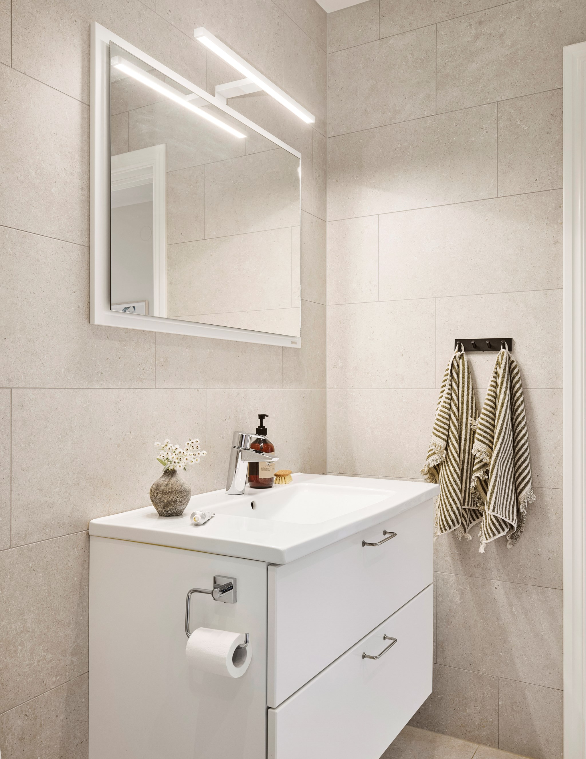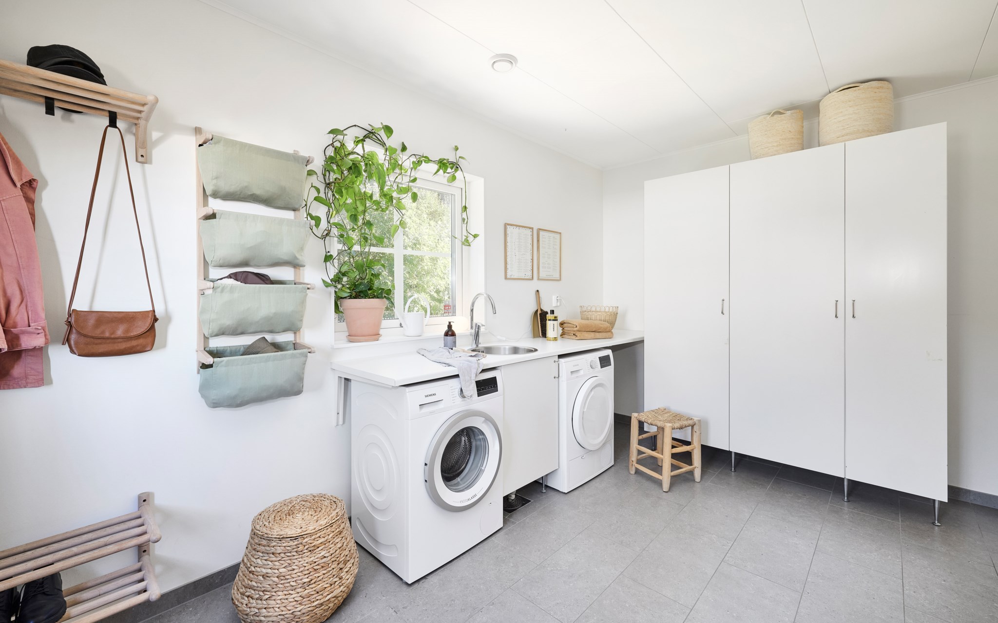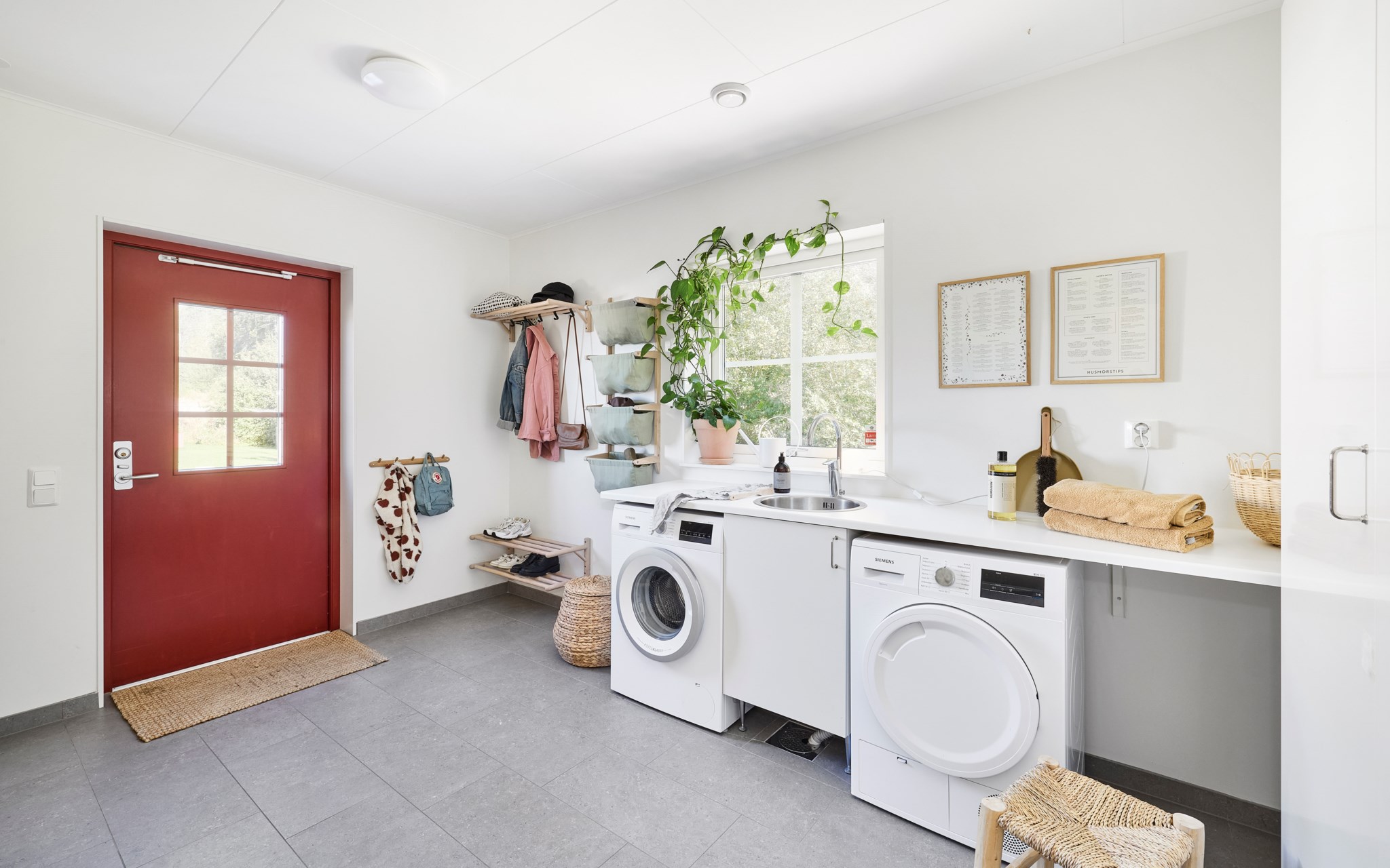 Nuvarande ägare gjorde en del bra ändringar i Myresjöhus tänkta planlösning. Den stora groventrén med tvättstugan och massor bra förvaring är en sån. Bor man på landet kommer det bli lite blötare, lite snöigare och lite gräsigare. Det här blir din ingång till vardags, med hundar och barn, matkassar och träningsväskor. Såklart samma klinker här som i finhallen och i badrummet nere – enhetligt är alltid bäst och snyggast.